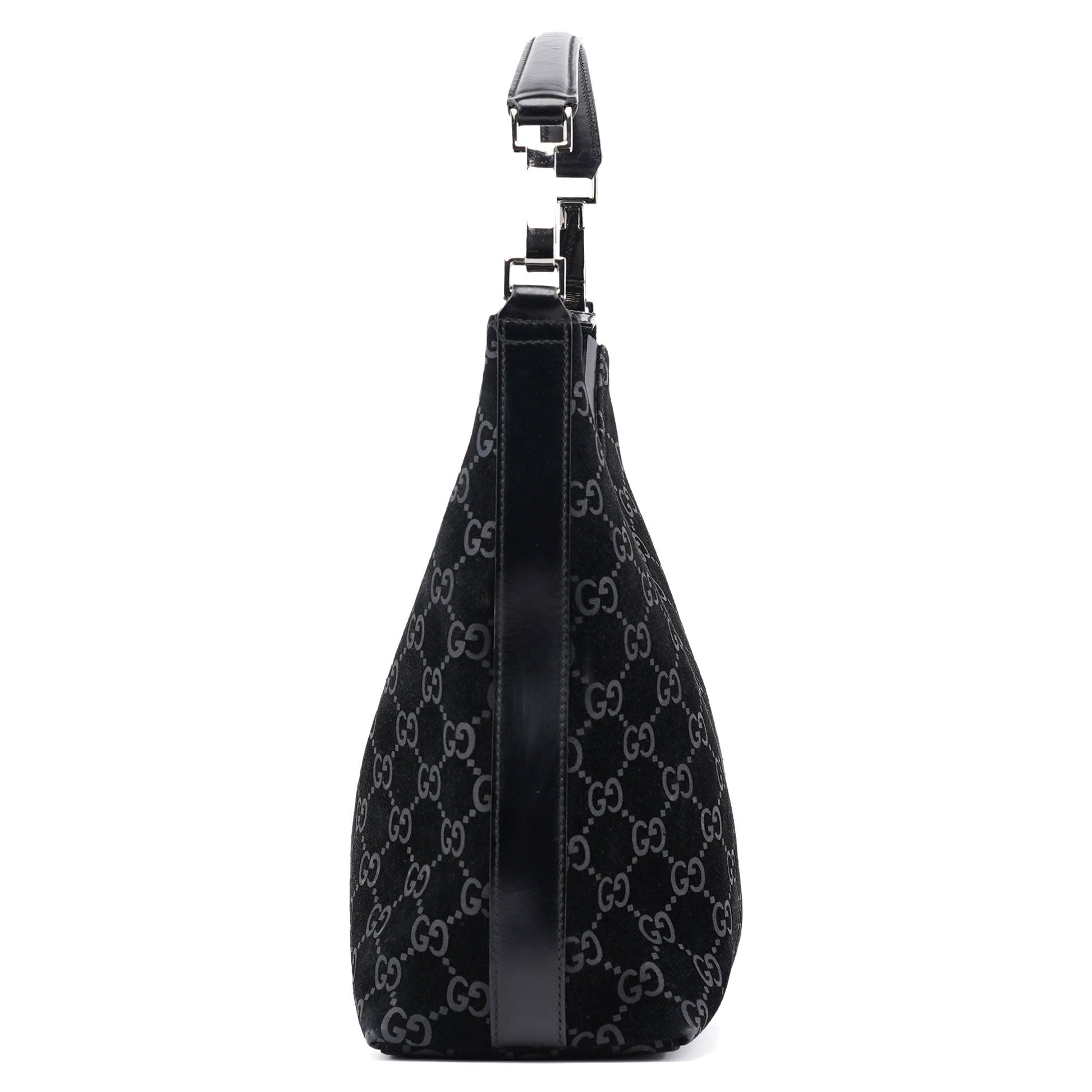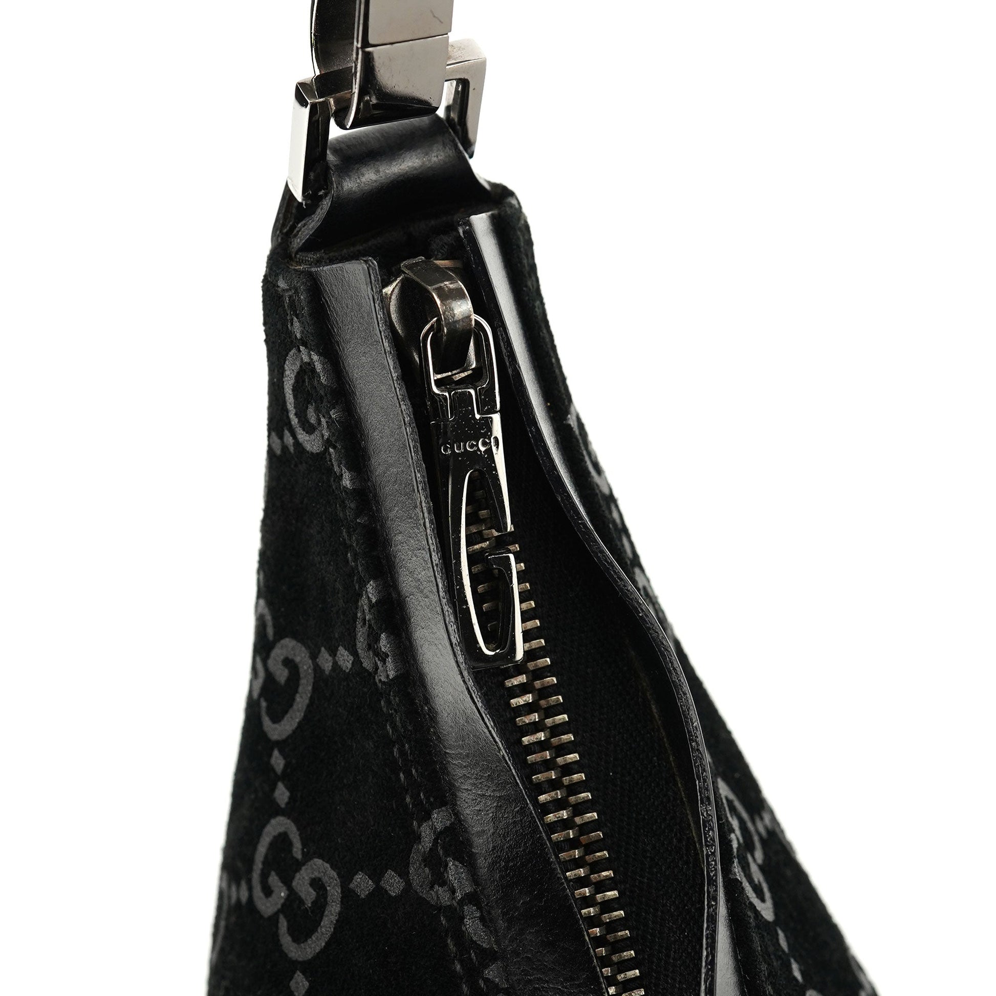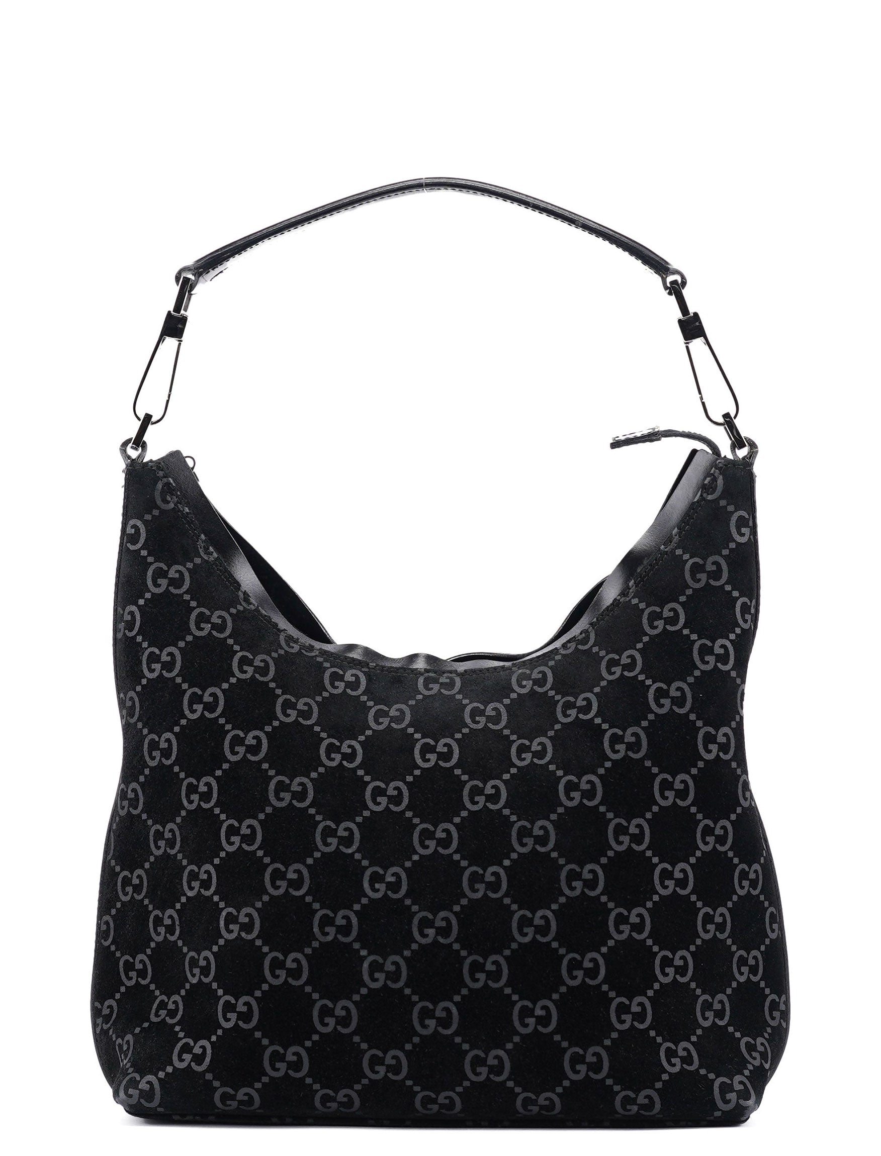 Designed by Tom Ford in 1997, the Gucci GG suede shoulder bag embodies luxurious sophistication. Featuring black GG monogram suede complemented by black calfskin leather trim and silver-tone hardware engraved with the Gucci logo, this piece exudes timeless elegance. A zipper closure secures the satin-lined interior, blending style with practicality.