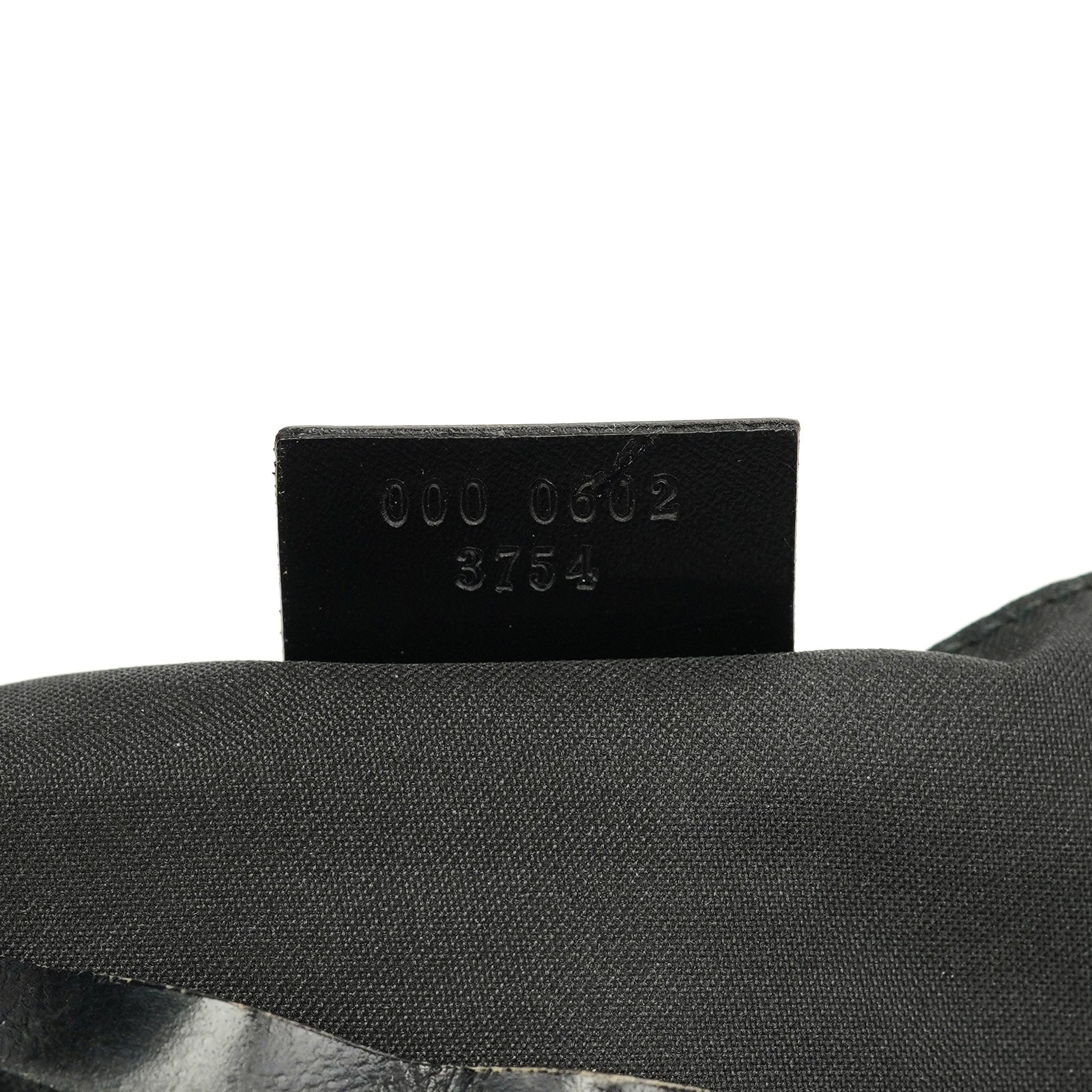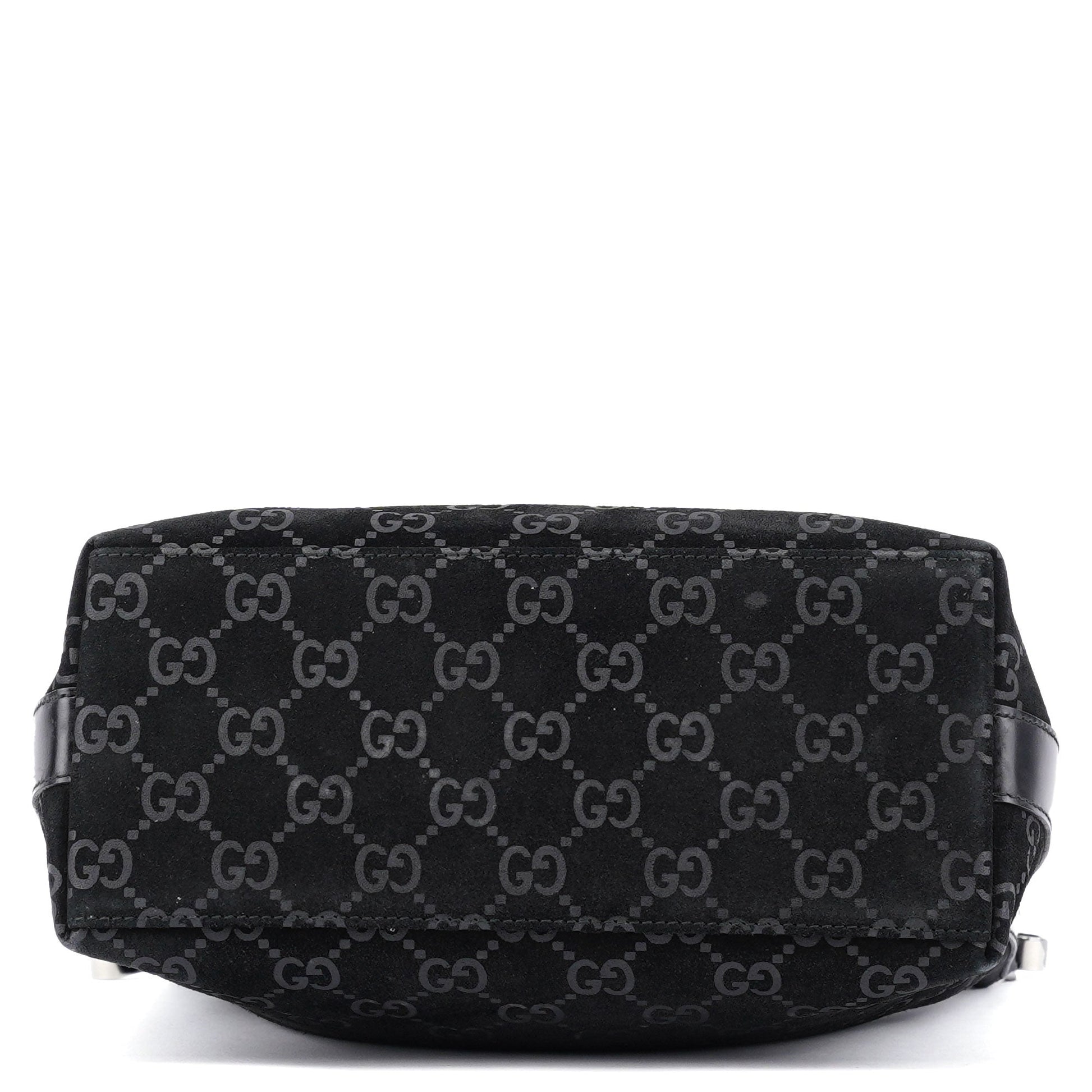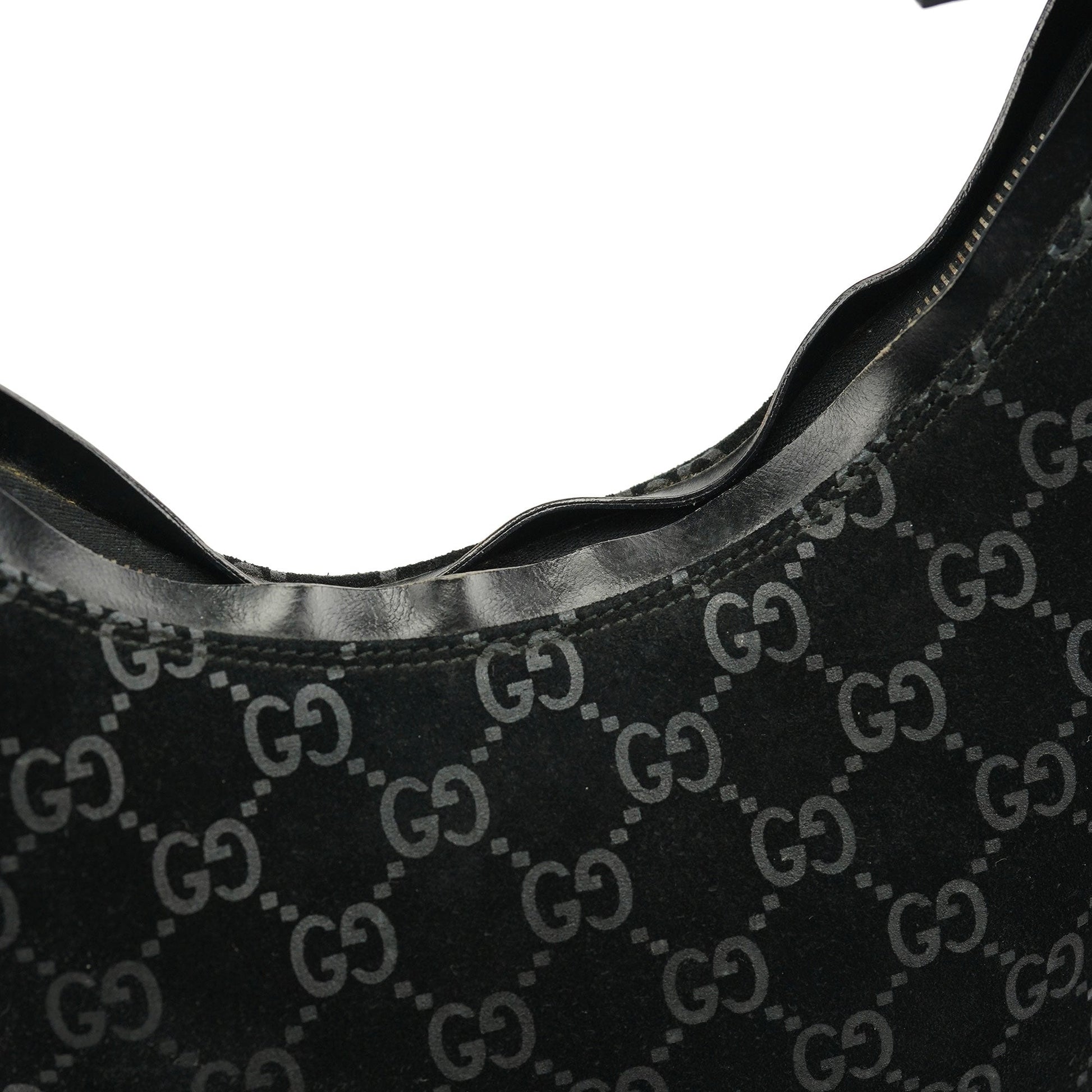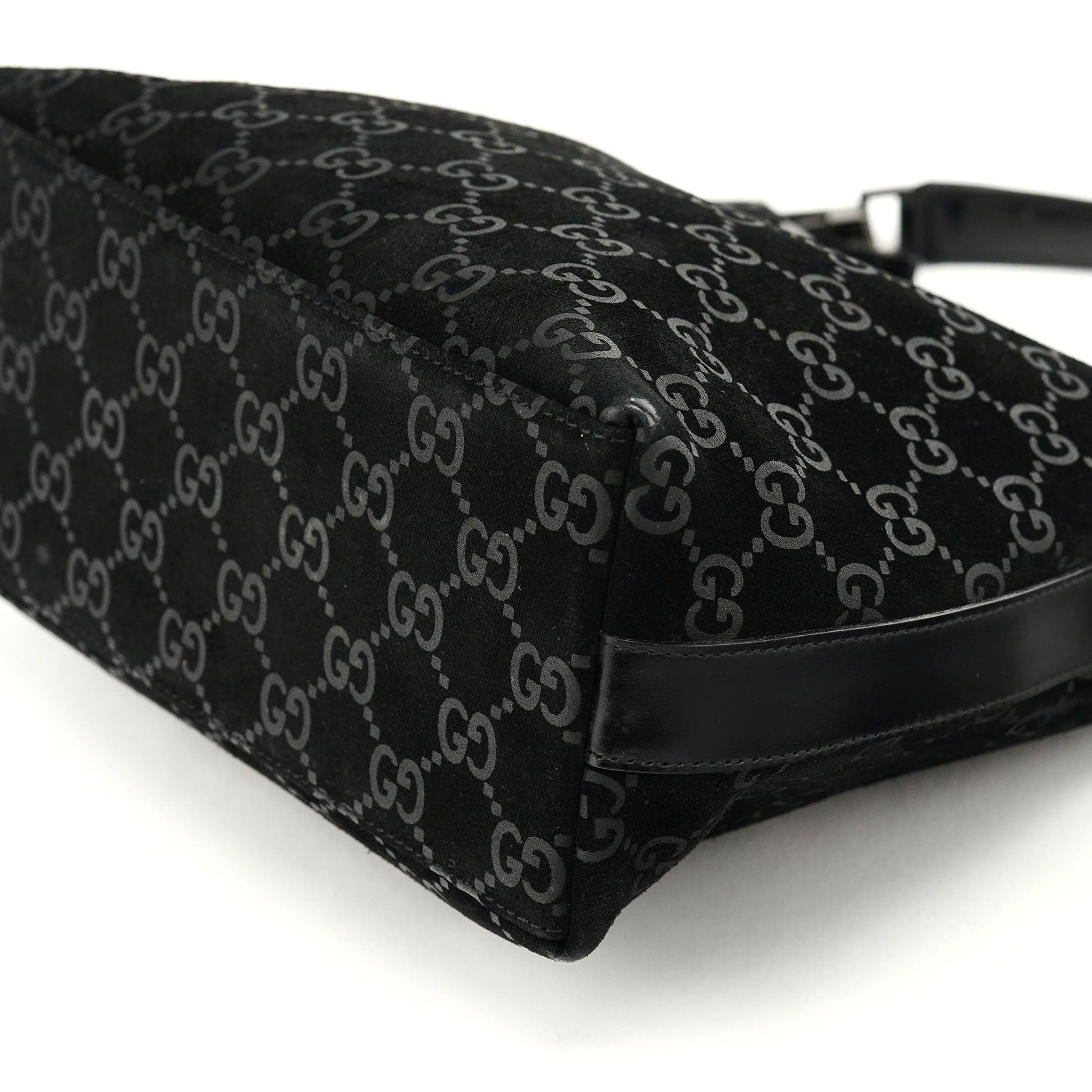 Designed by Tom Ford in 1997, the Gucci GG suede shoulder bag embodies luxurious sophistication. Featuring black GG monogram suede complemented by black calfskin leather trim and silver-tone hardware engraved with the Gucci logo, this piece exudes timeless elegance. A zipper closure secures the satin-lined interior, blending style with practicality.