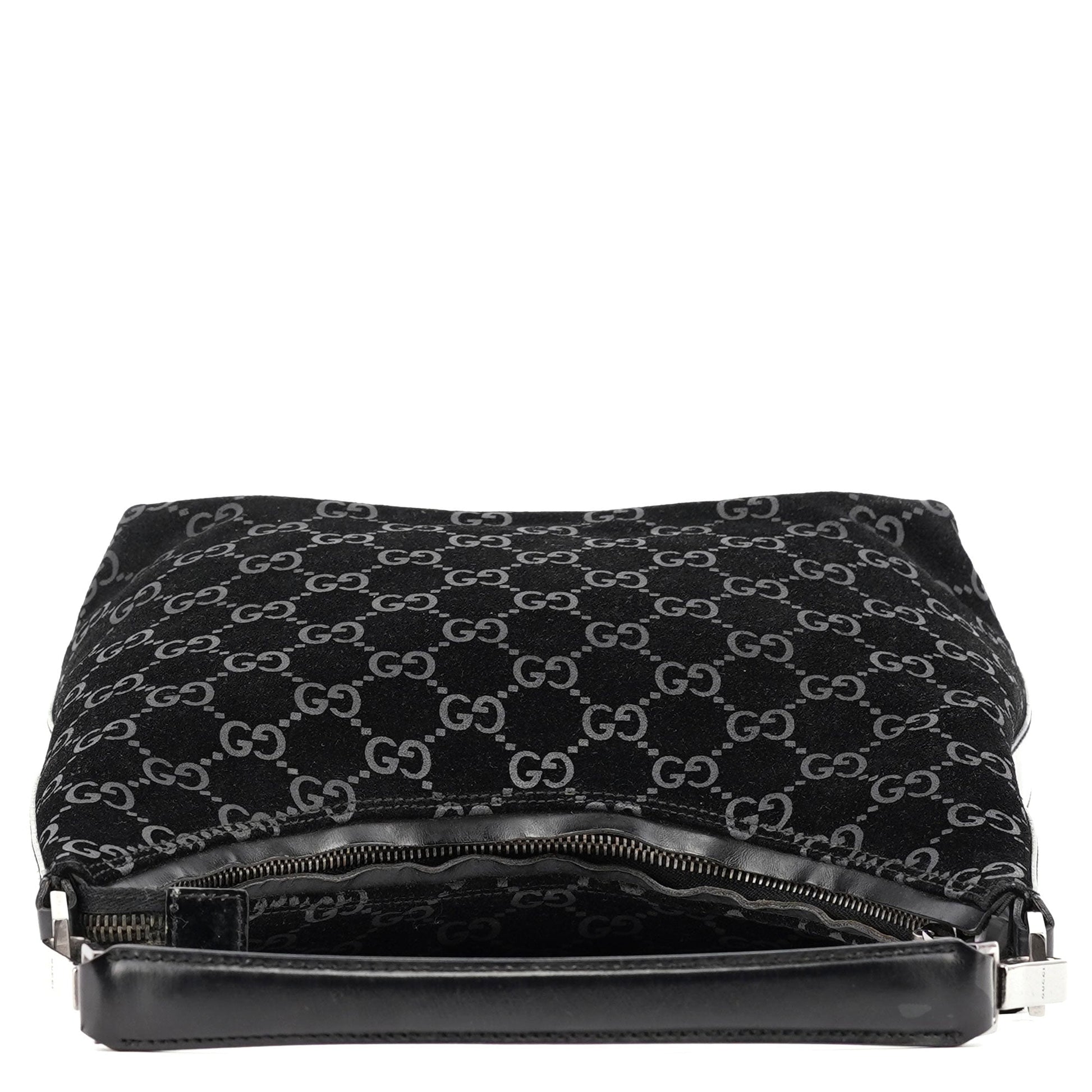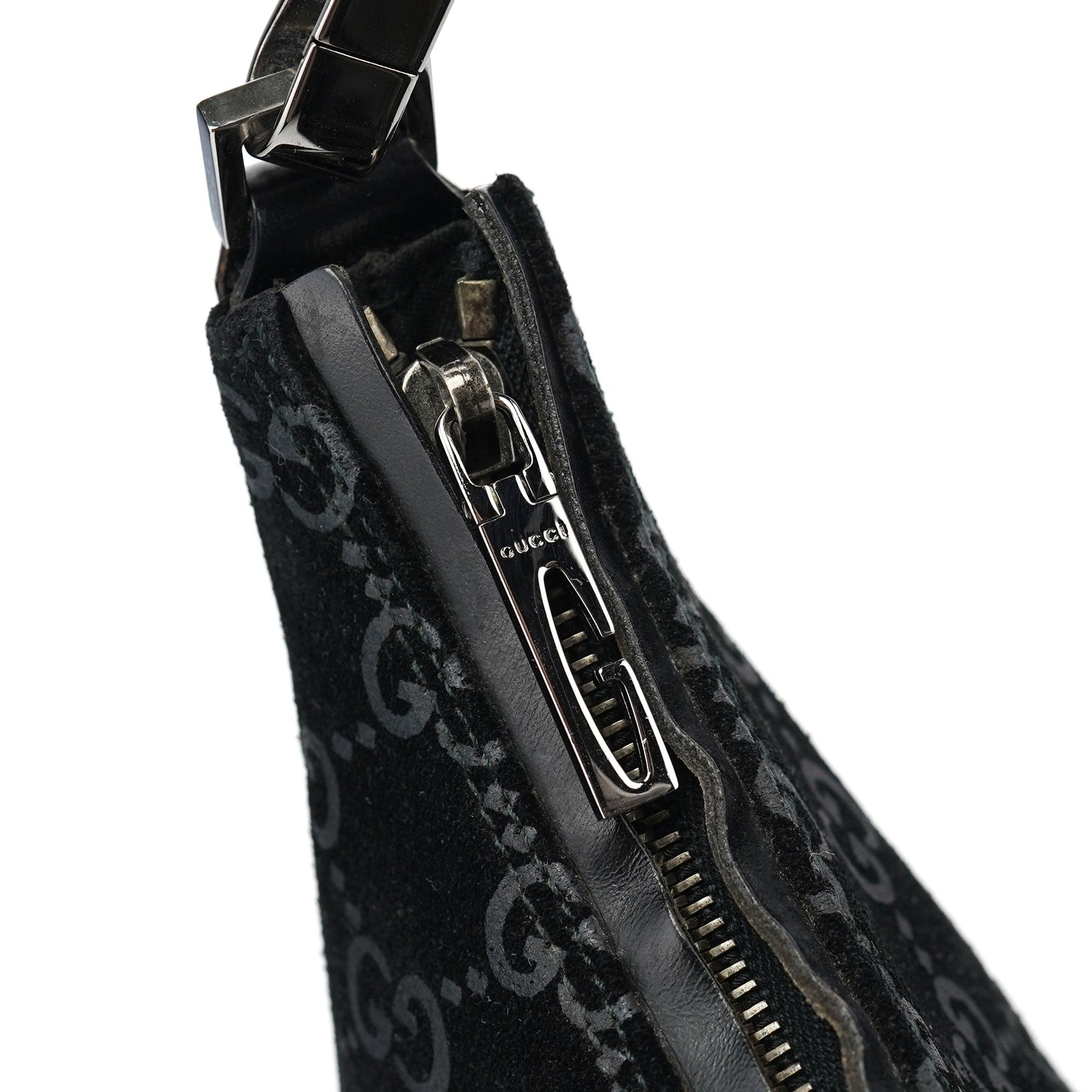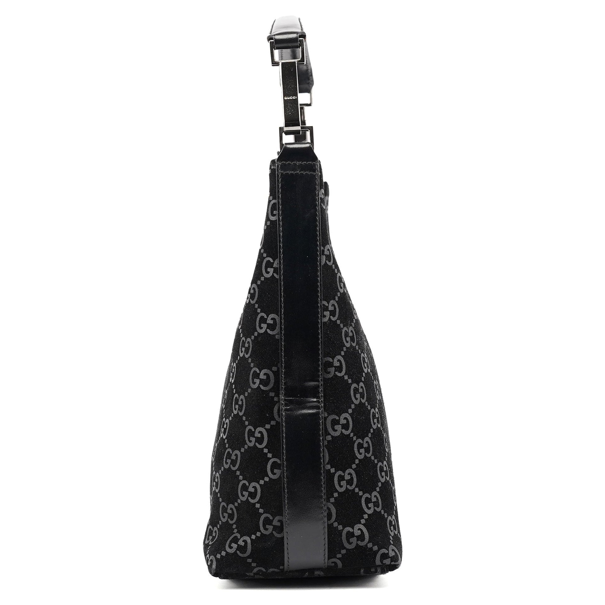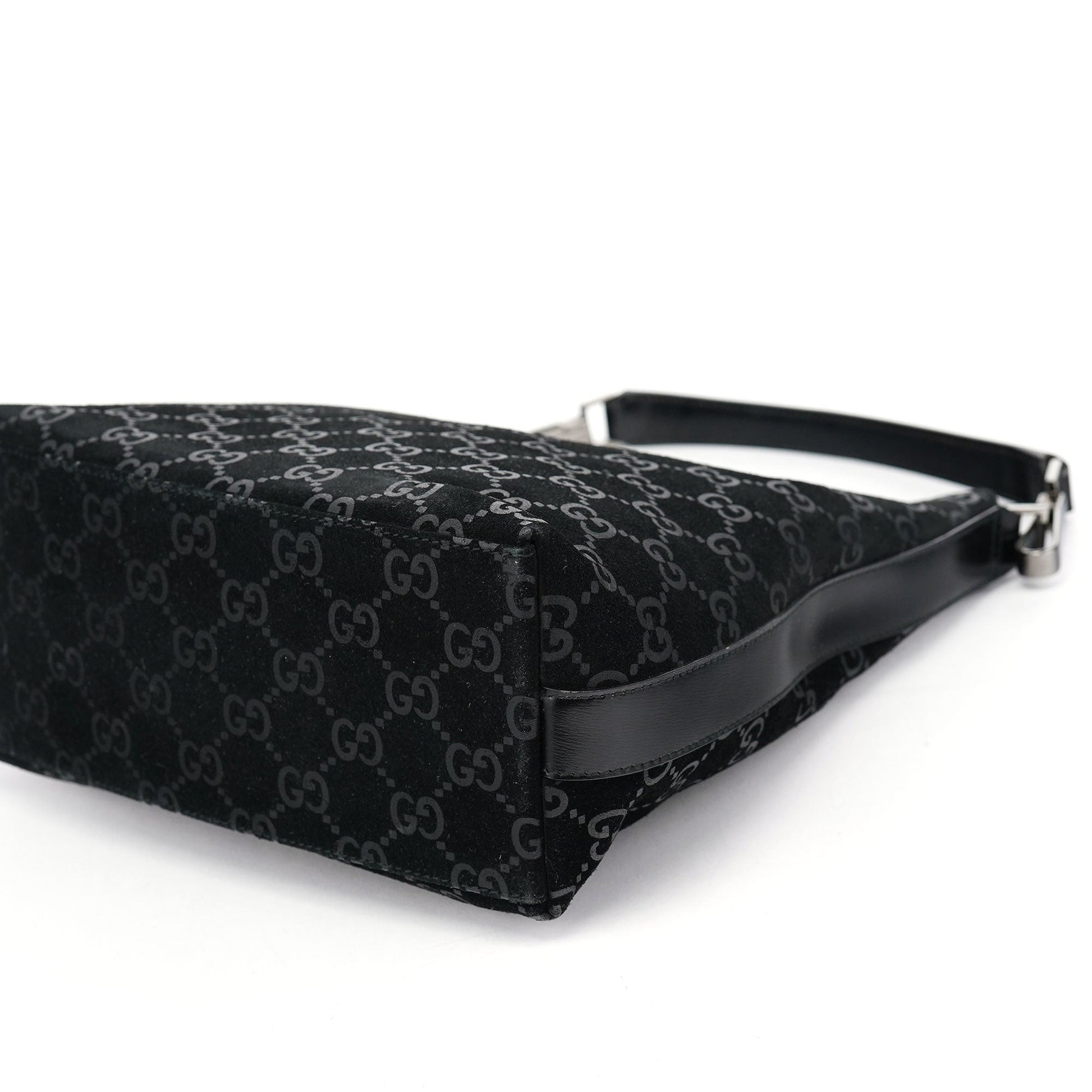 Designed by Tom Ford in 1997, the Gucci GG suede shoulder bag embodies luxurious sophistication. Featuring black GG monogram suede complemented by black calfskin leather trim and silver-tone hardware engraved with the Gucci logo, this piece exudes timeless elegance. A zipper closure secures the satin-lined interior, blending style with practicality.