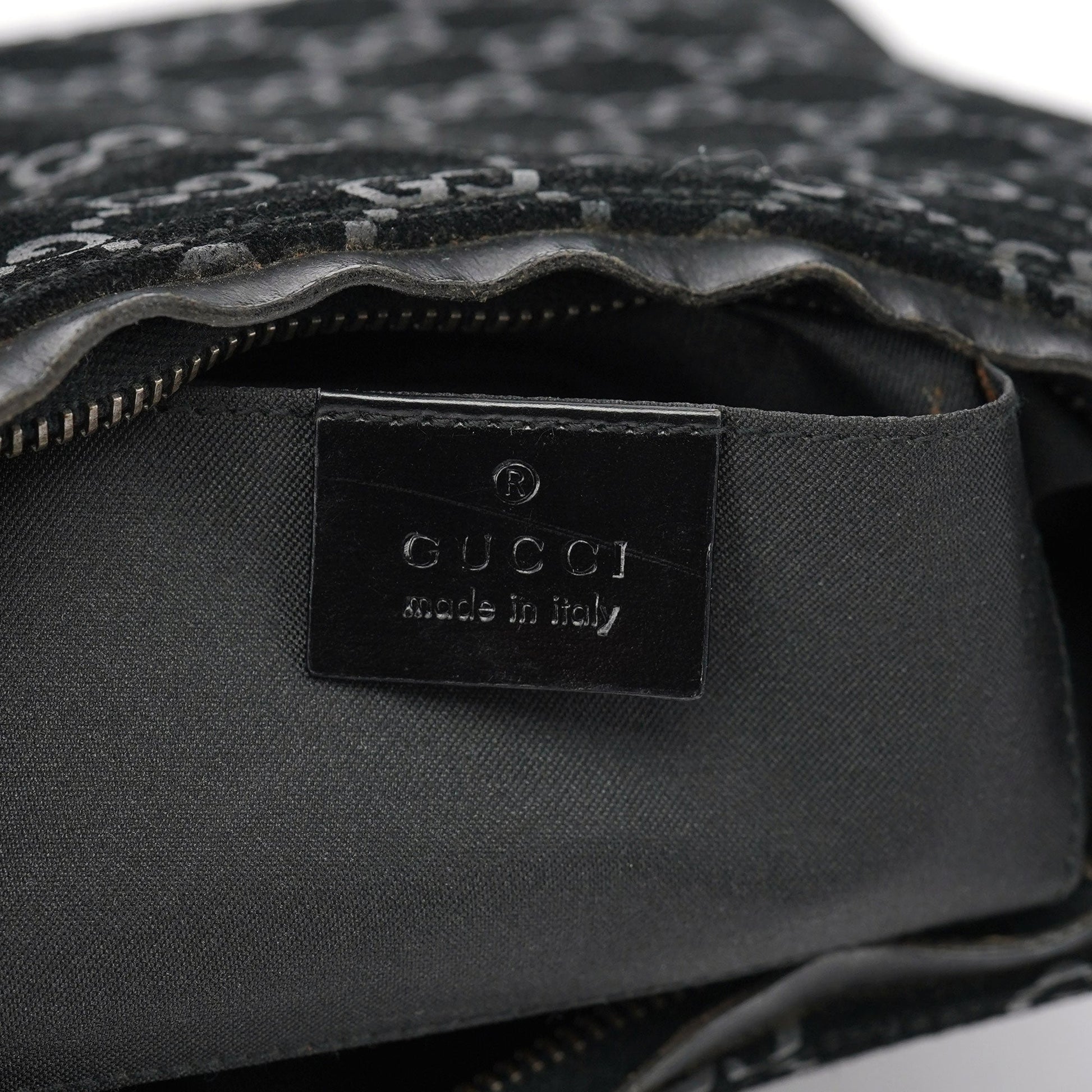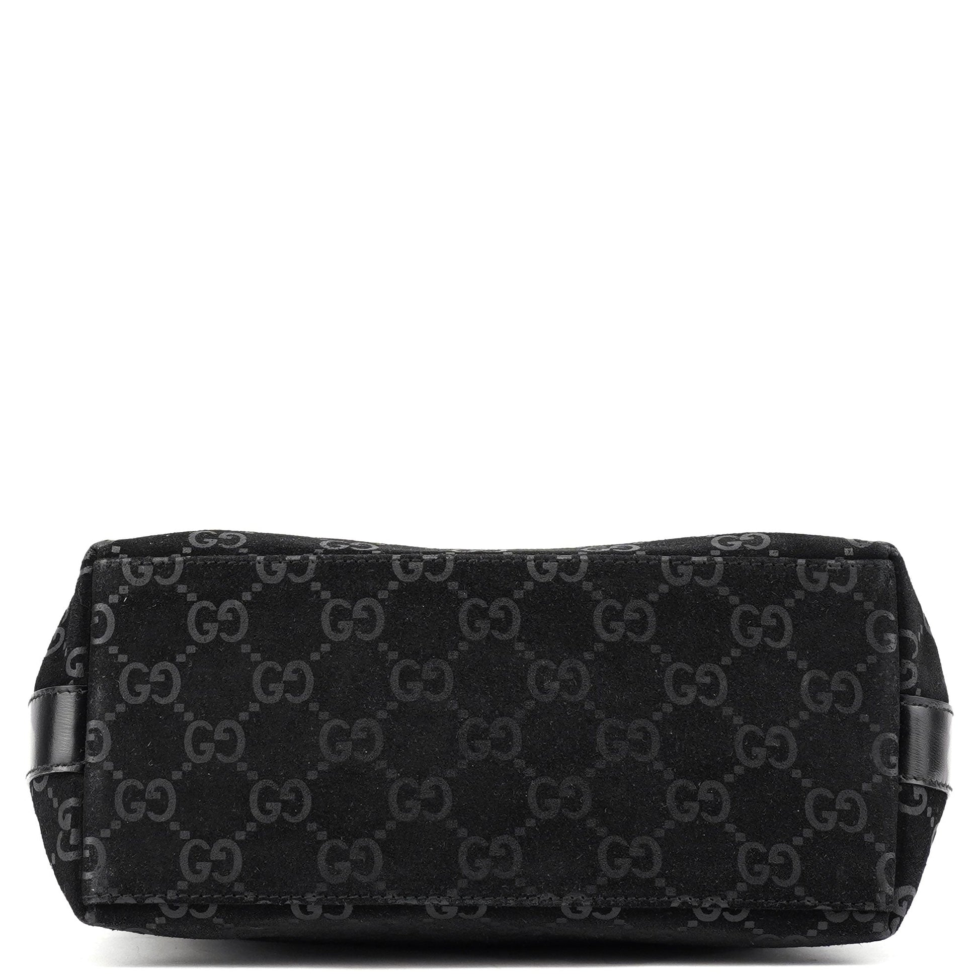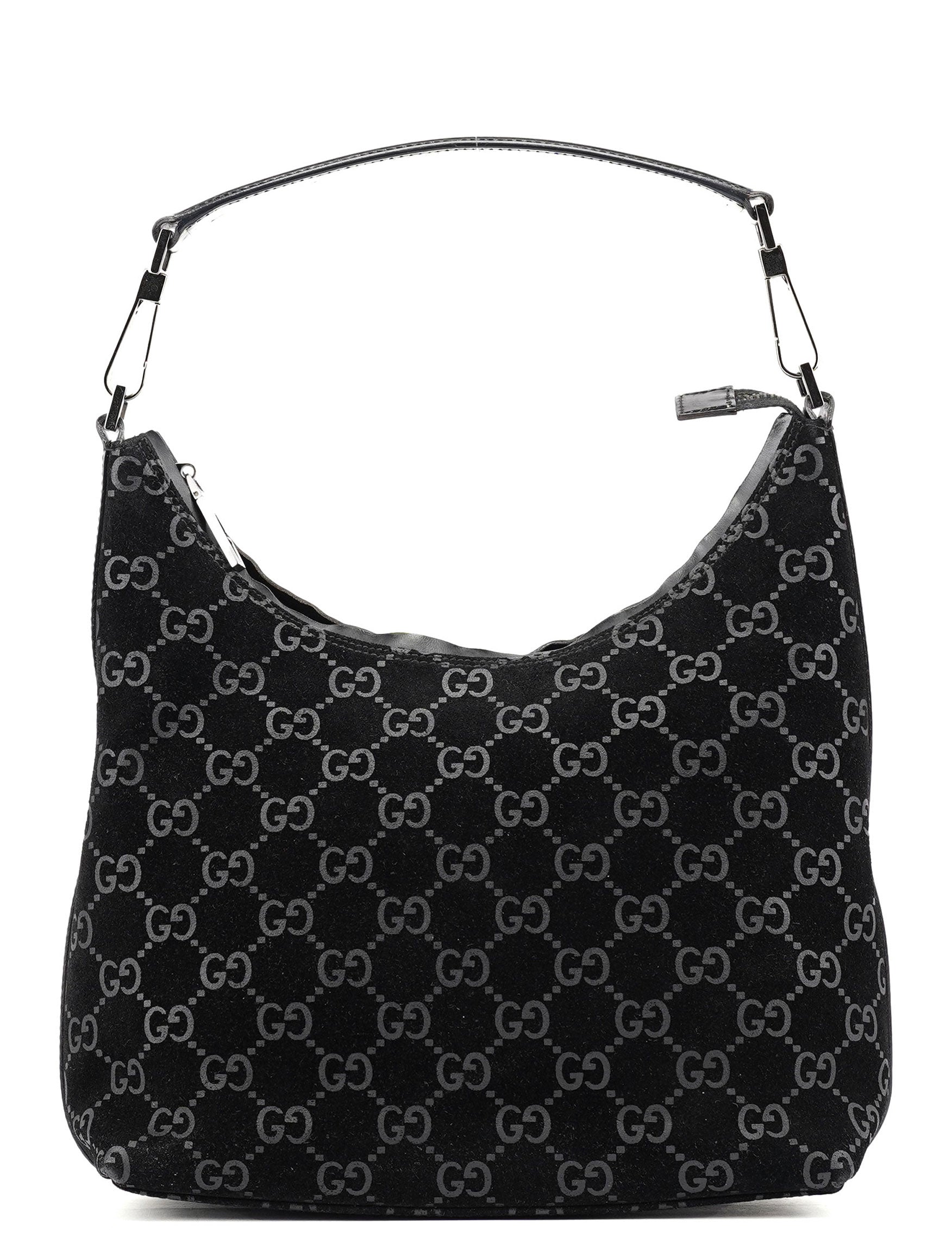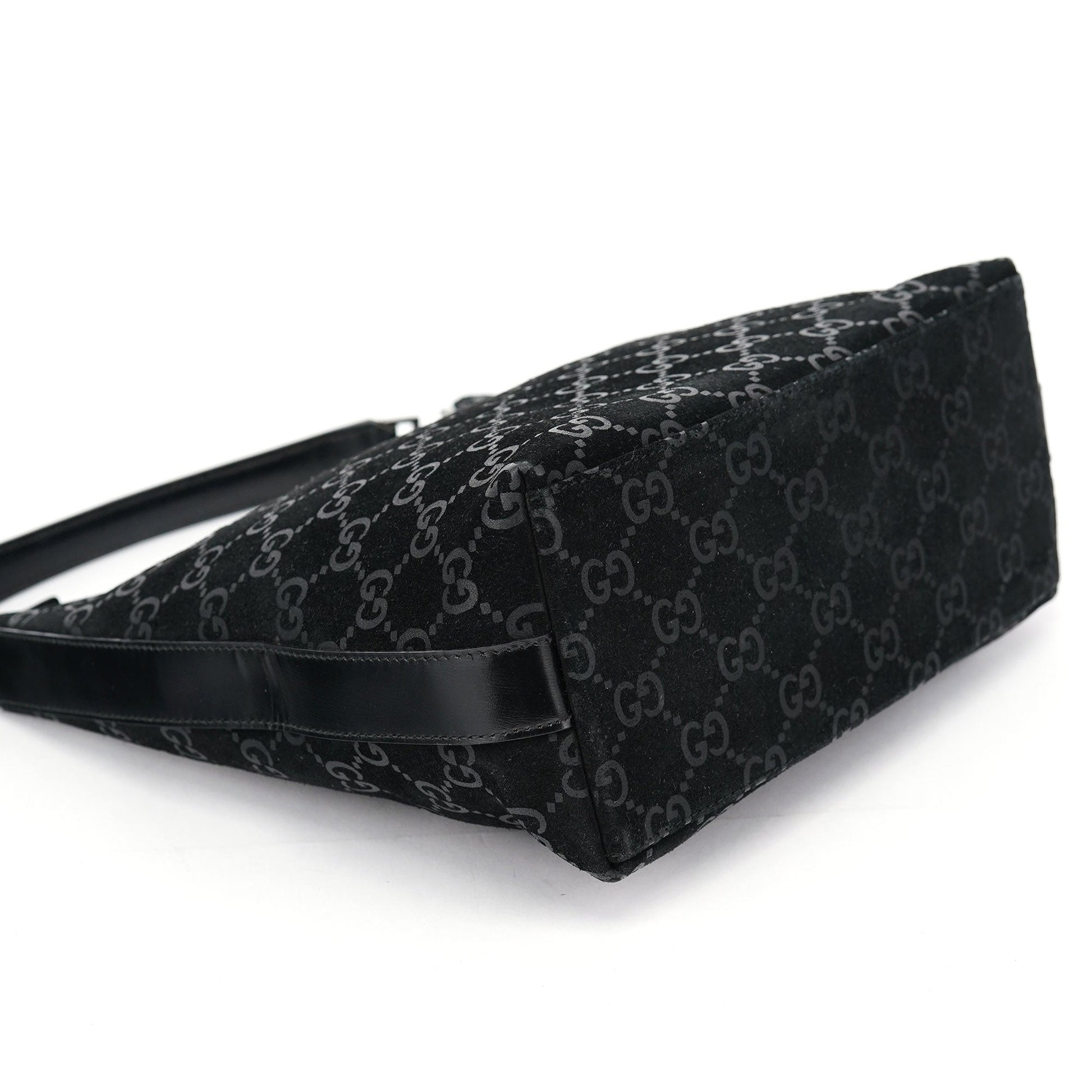 Designed by Tom Ford in 1997, the Gucci GG suede shoulder bag embodies luxurious sophistication. Featuring black GG monogram suede complemented by black calfskin leather trim and silver-tone hardware engraved with the Gucci logo, this piece exudes timeless elegance. A zipper closure secures the satin-lined interior, blending style with practicality.