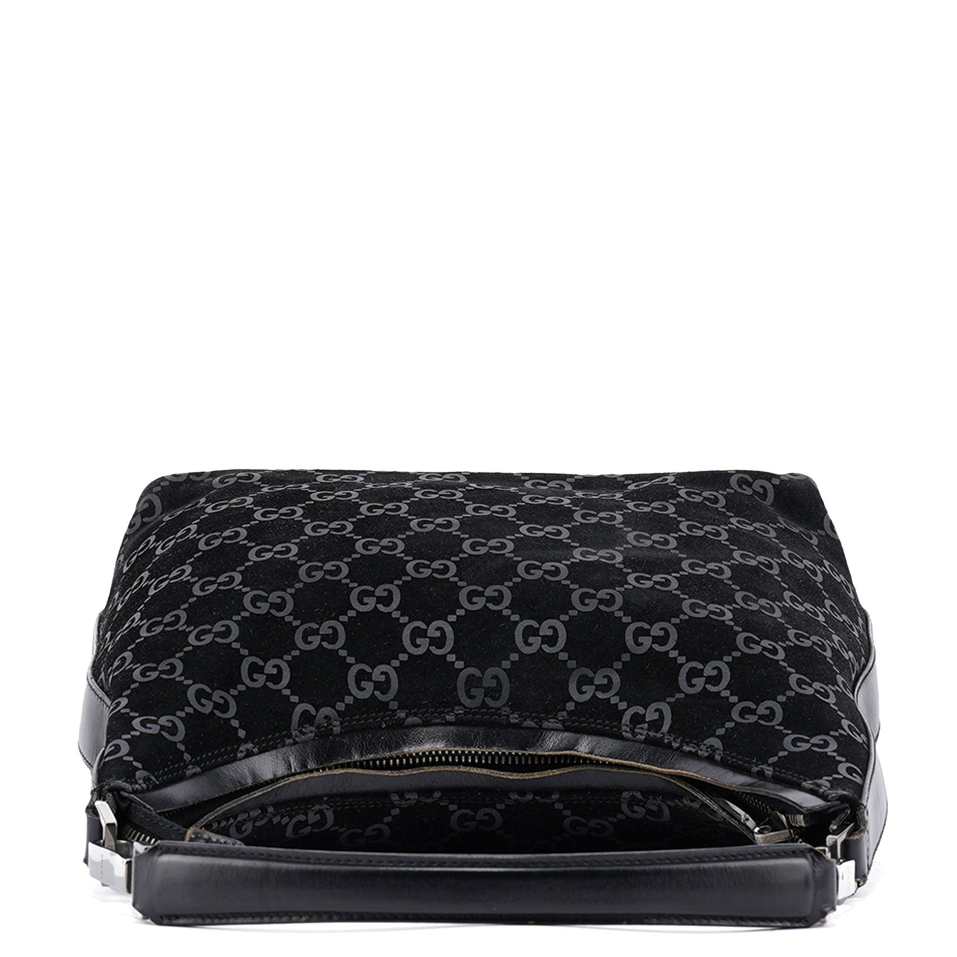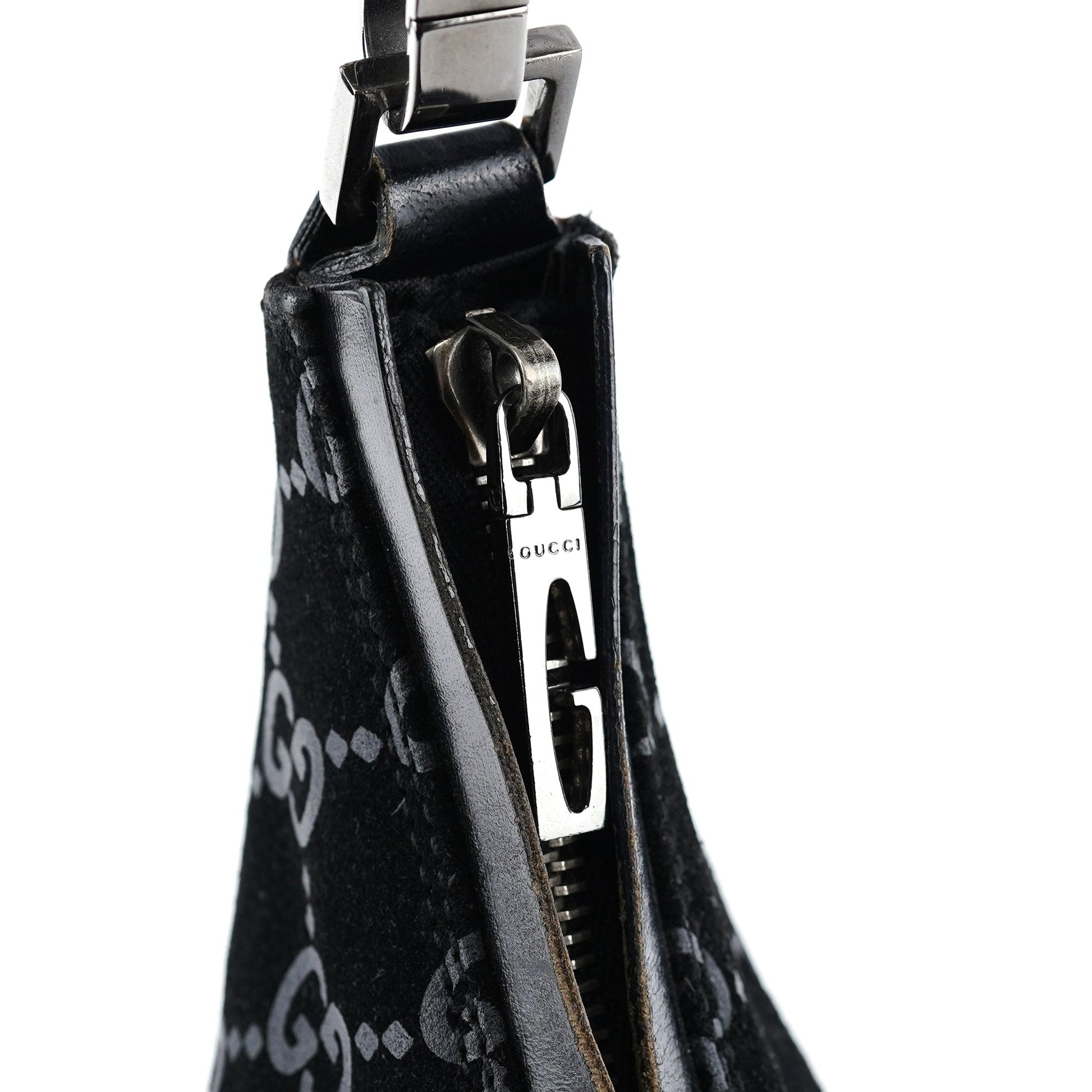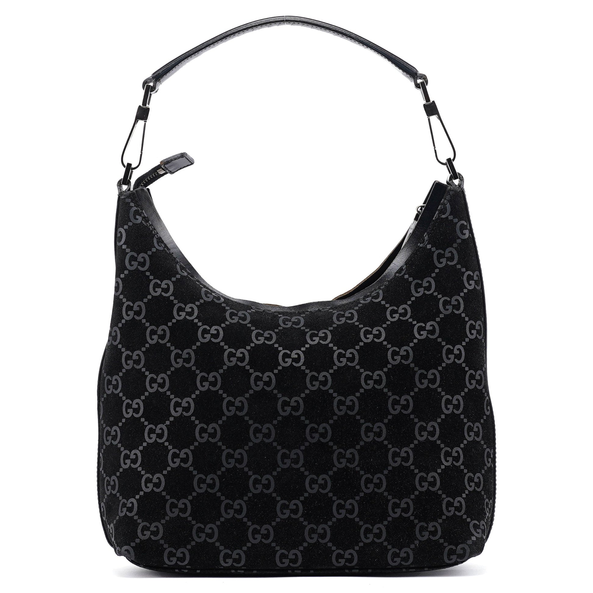 Designed by Tom Ford in 1997, the Gucci GG suede shoulder bag embodies luxurious sophistication. Featuring black GG monogram suede complemented by black calfskin leather trim and silver-tone hardware engraved with the Gucci logo, this piece exudes timeless elegance. A zipper closure secures the satin-lined interior, blending style with practicality.