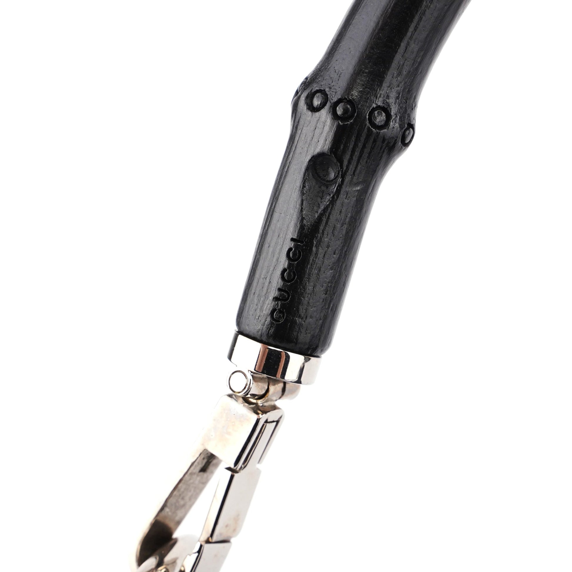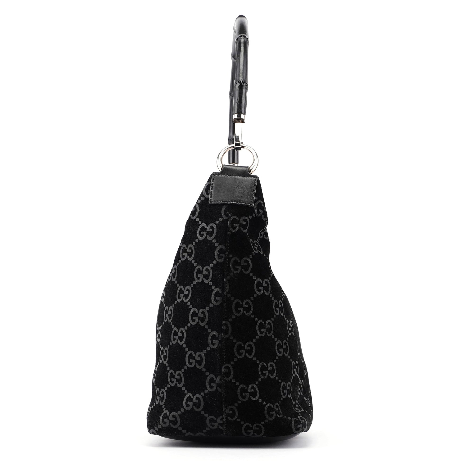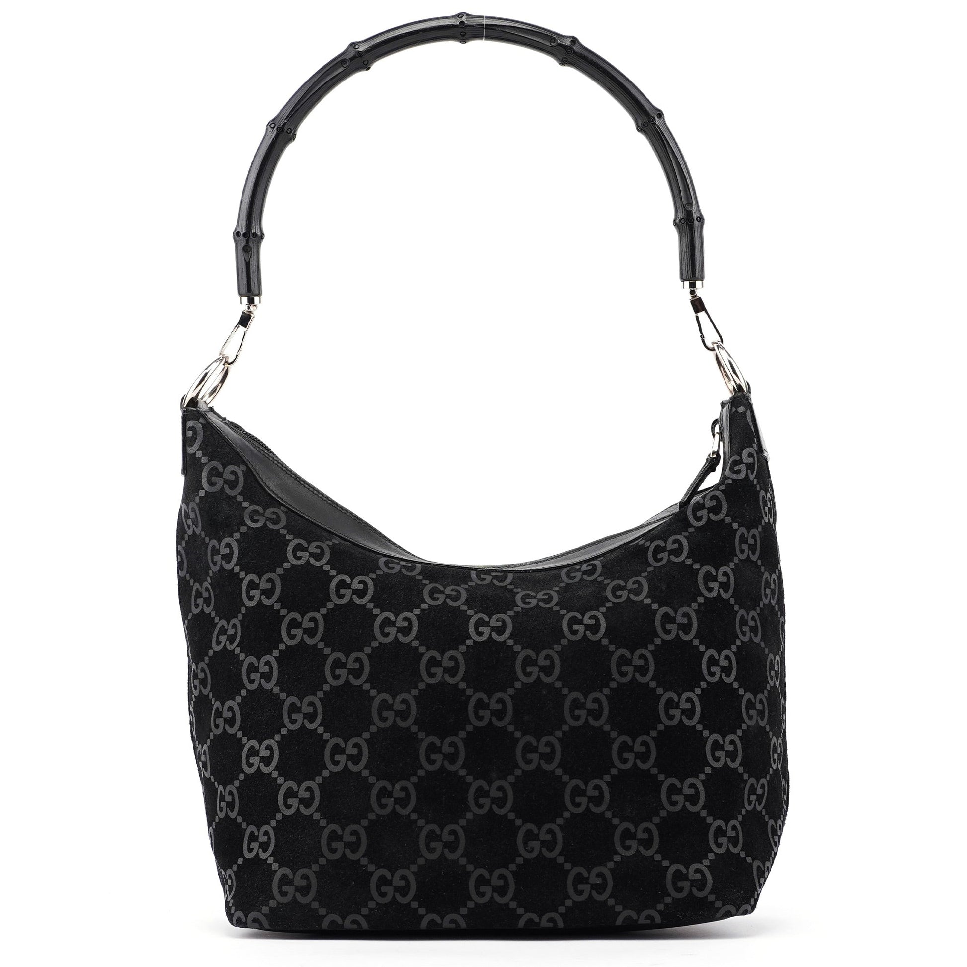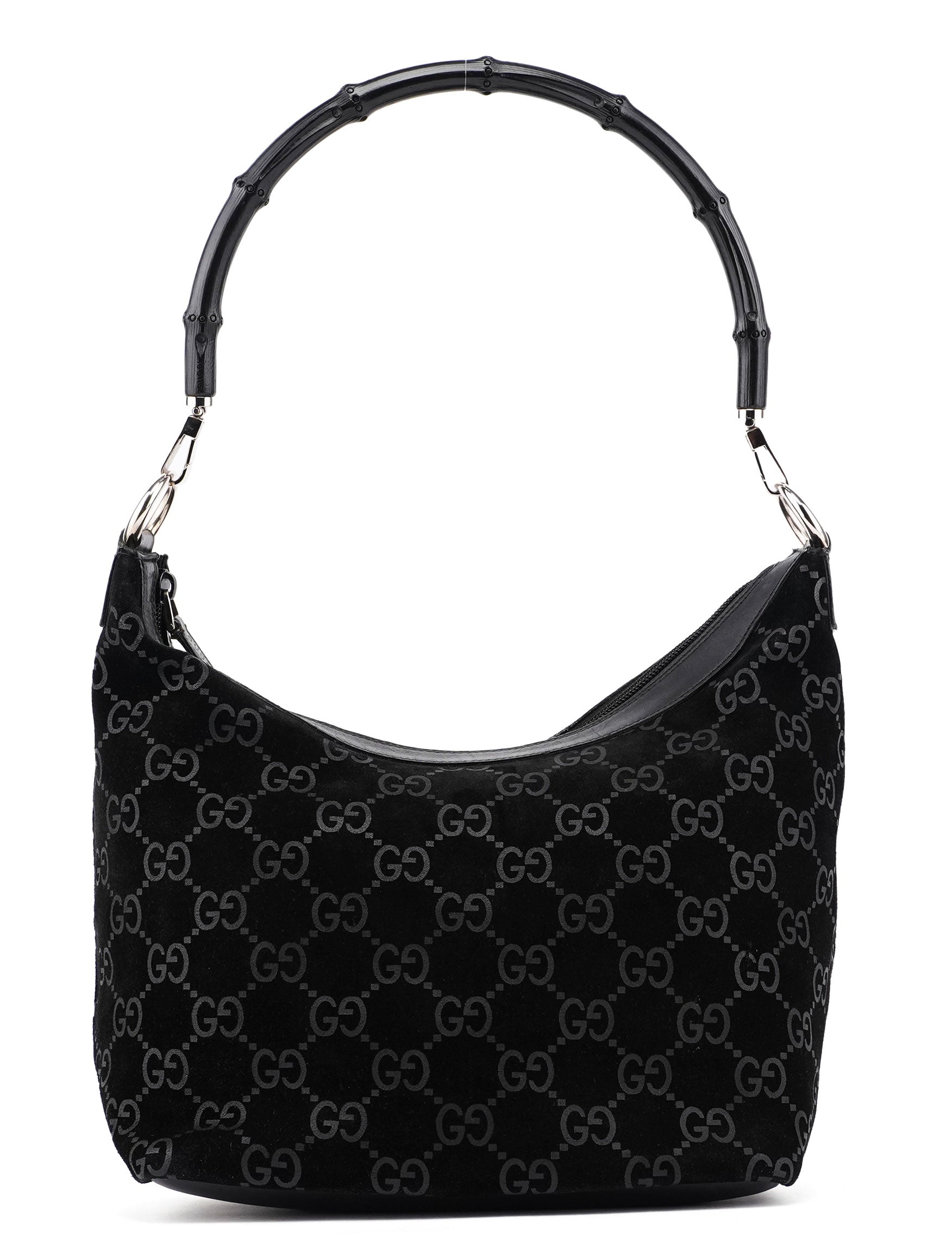 Explore the Gucci Bamboo shoulder bag from Tom Ford’s iconic 1997 collection. This luxurious piece is handcrafted from black suede with a stamped GG monogram and accented with silver-tone hardware and calfskin leather trim. It features a classic black bamboo handle engraved with the Gucci logo. Inside, the satin-lined interior includes a zipper pocket, marrying elegance with functionality.
