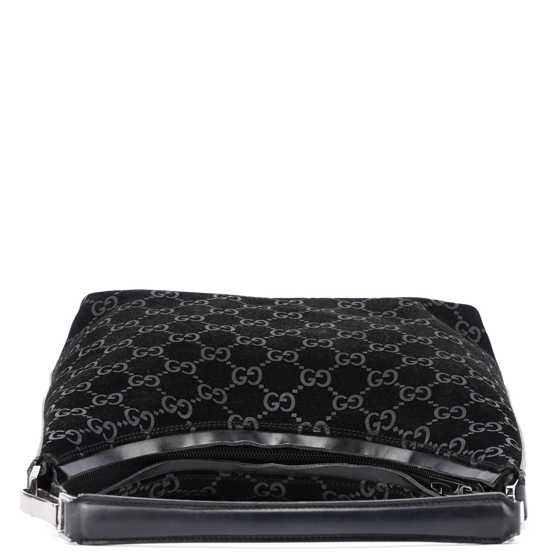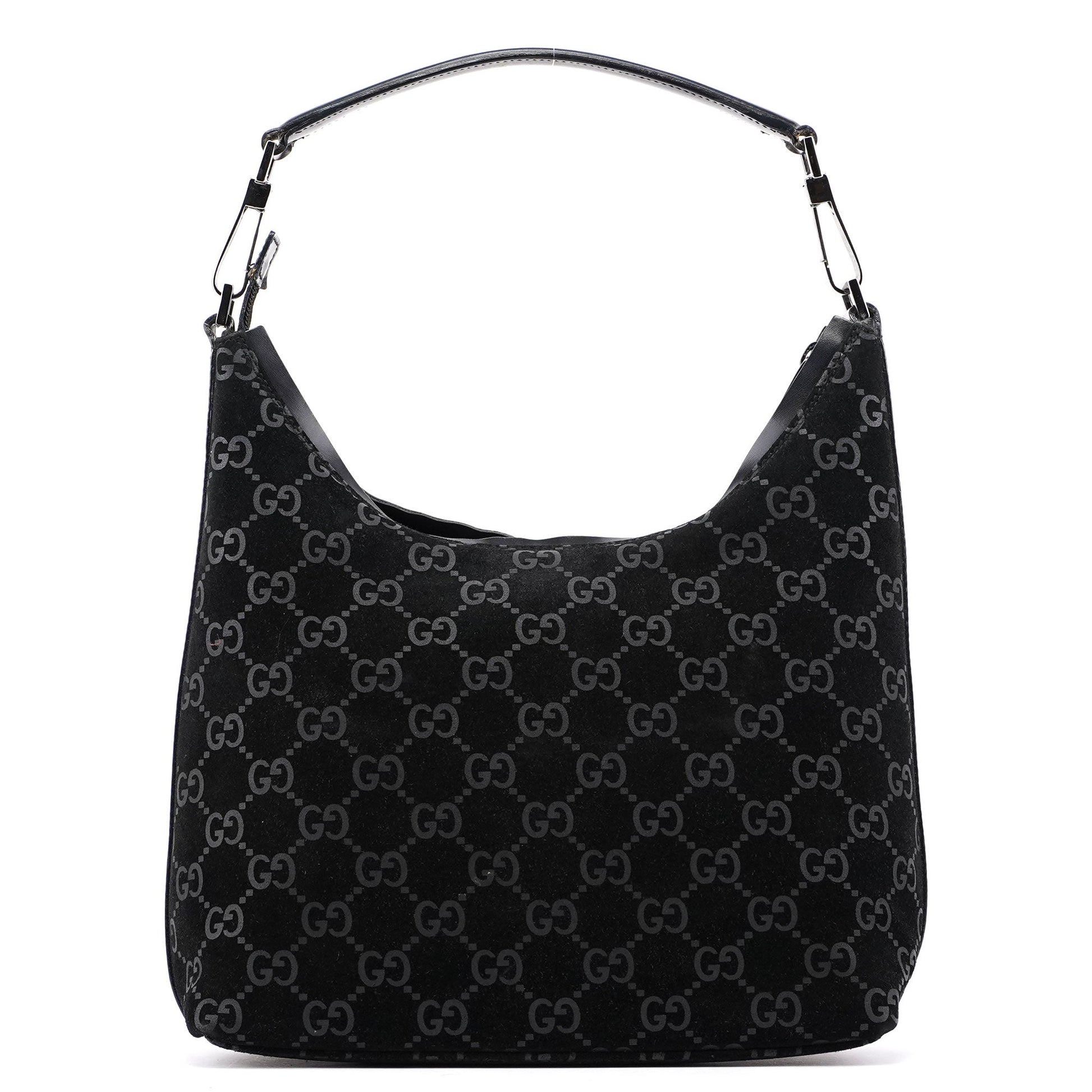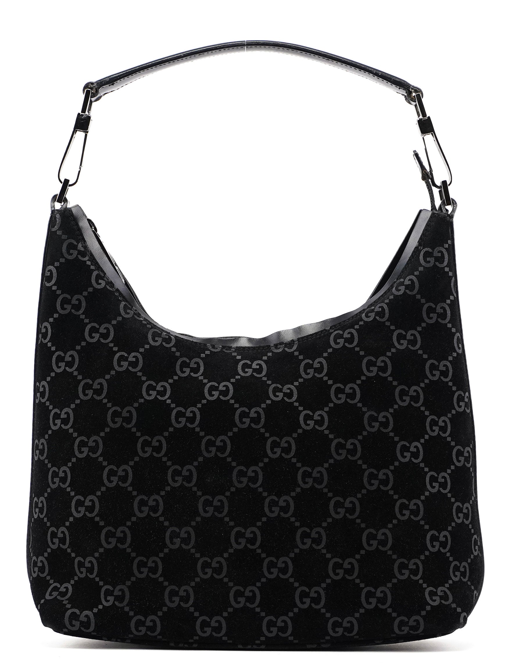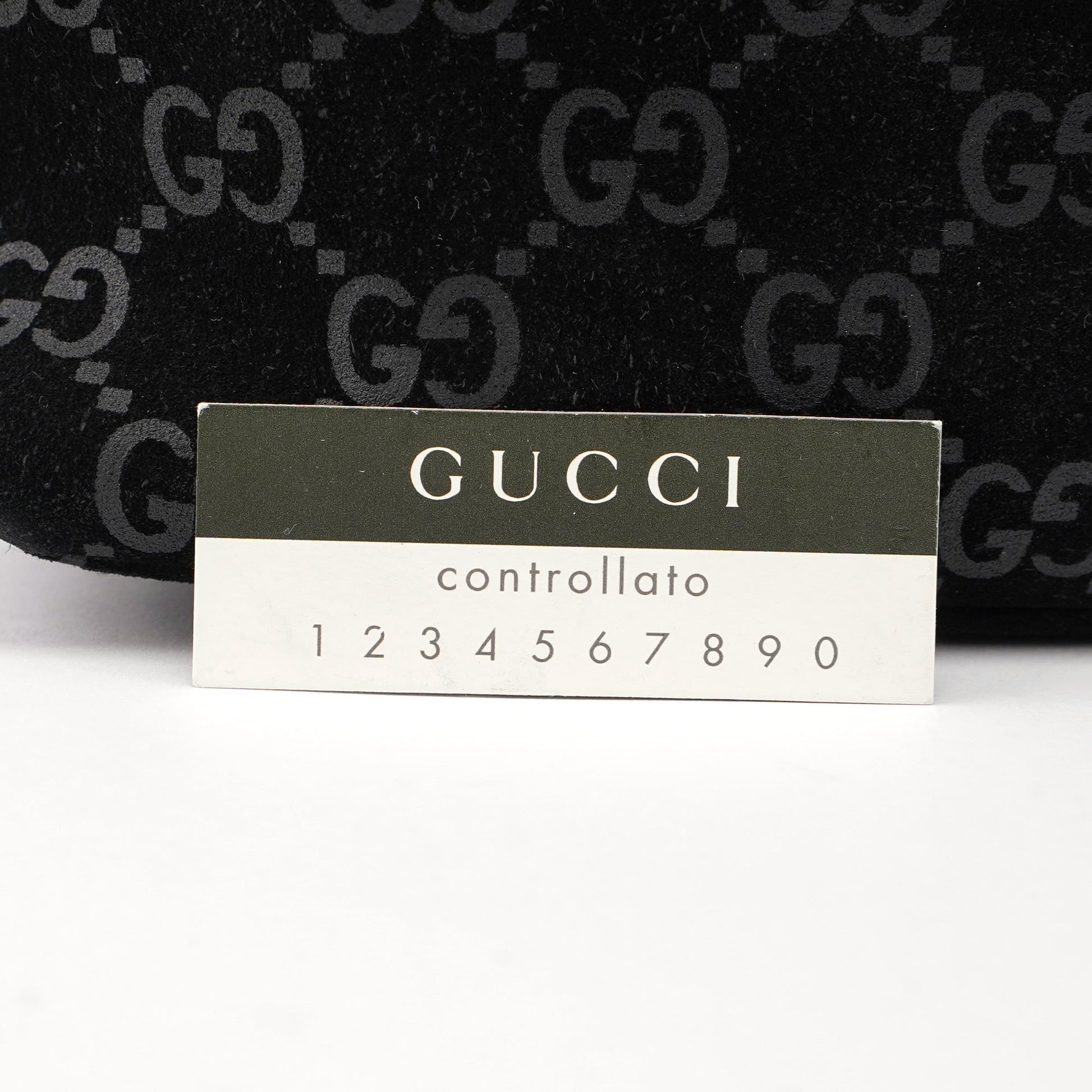 Unveil the elegance of the Gucci GG suede shoulder bag, designed by Tom Ford in 1997. This luxurious piece features silver-tone hardware with engraved Gucci logo, complemented by black calfskin leather trim. A zipper closure secures the satin-lined interior.