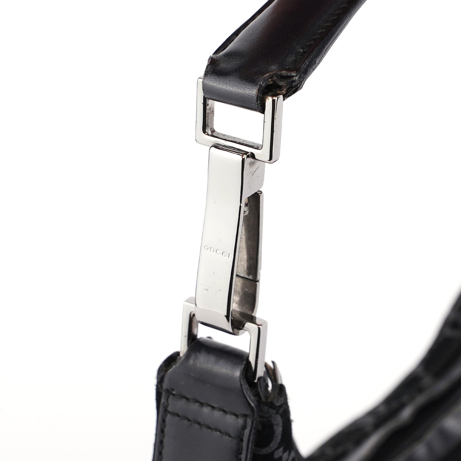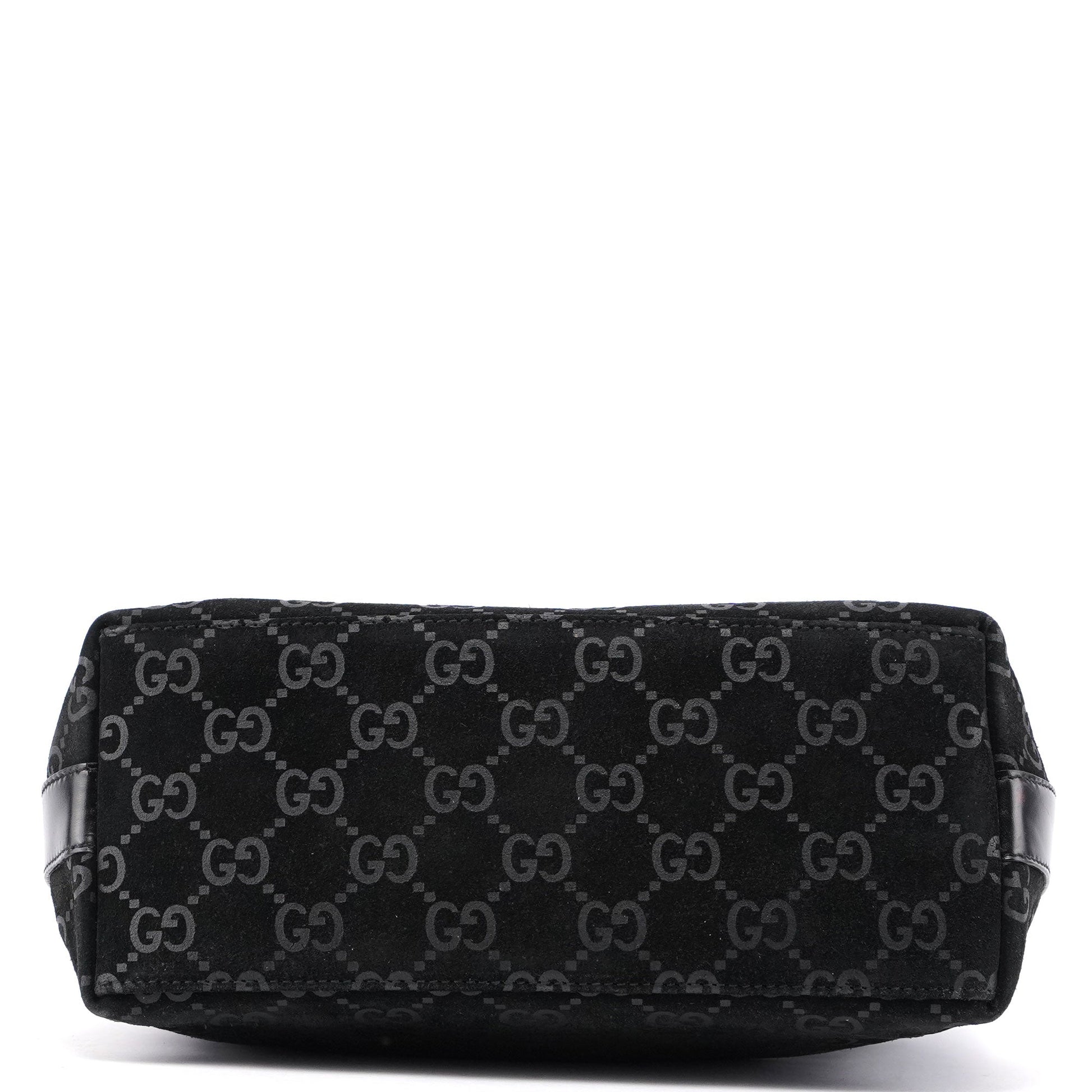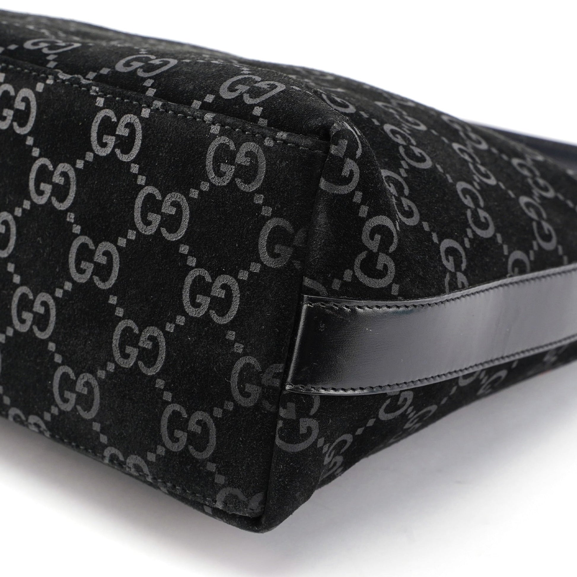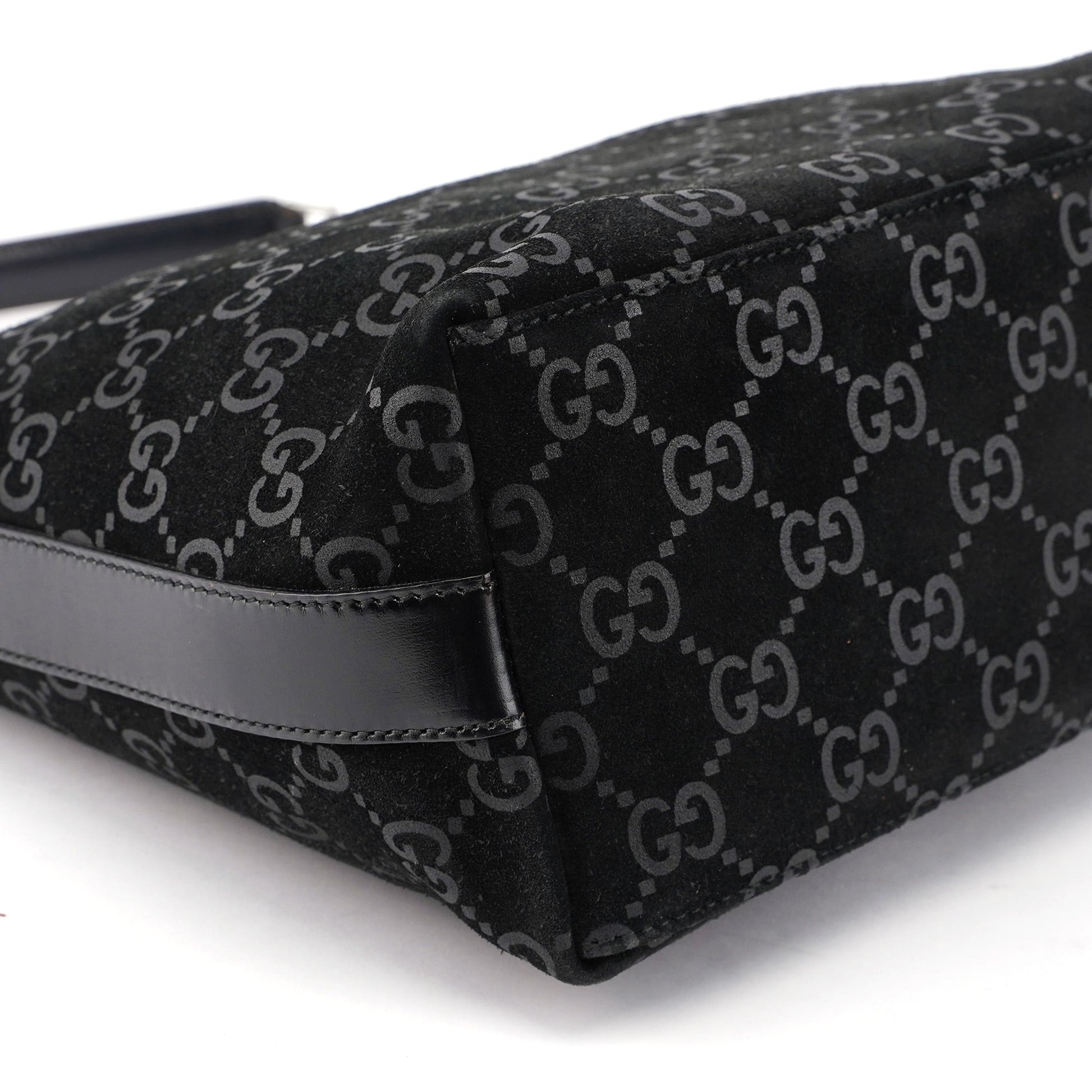 Unveil the elegance of the Gucci GG suede shoulder bag, designed by Tom Ford in 1997. This luxurious piece features silver-tone hardware with engraved Gucci logo, complemented by black calfskin leather trim. A zipper closure secures the satin-lined interior.