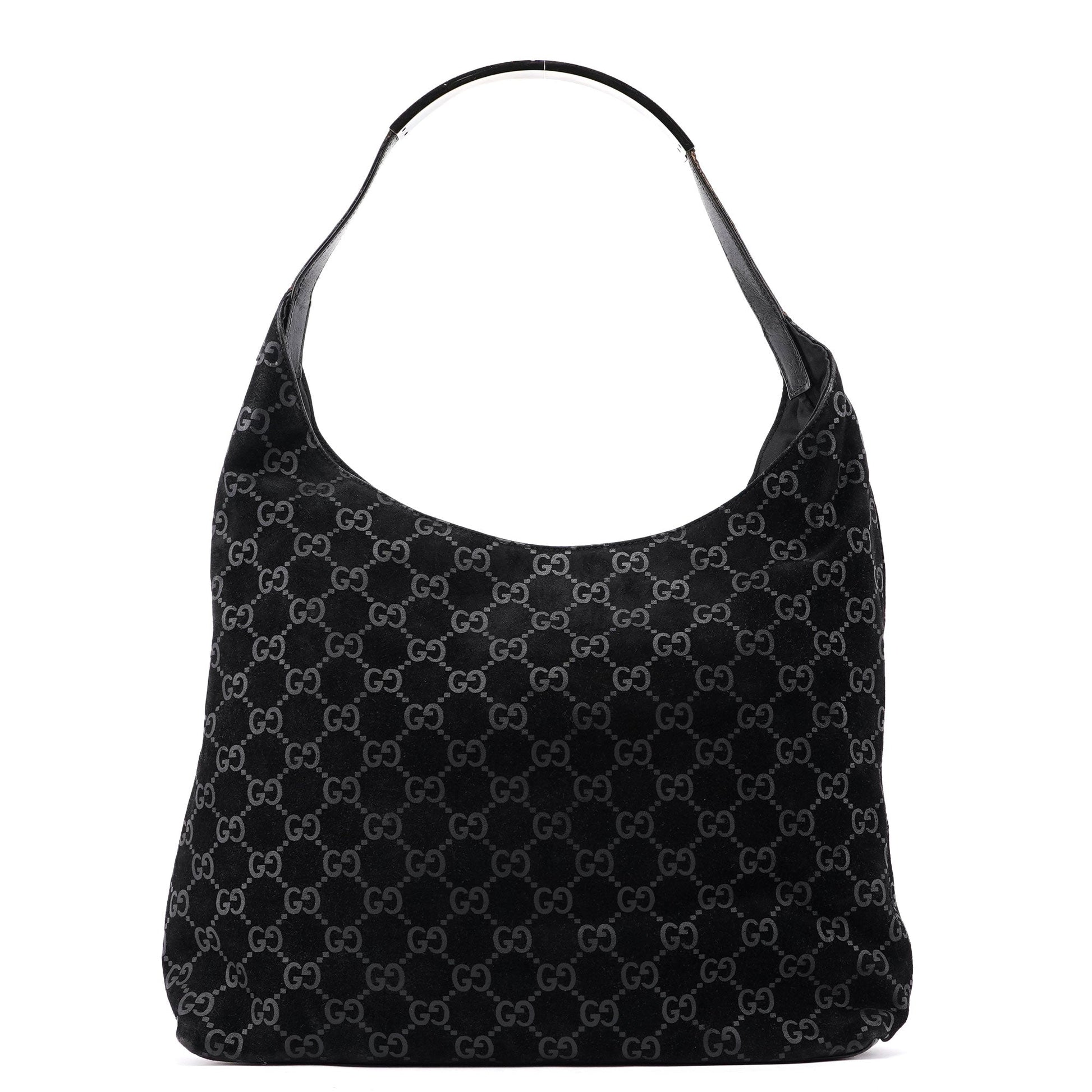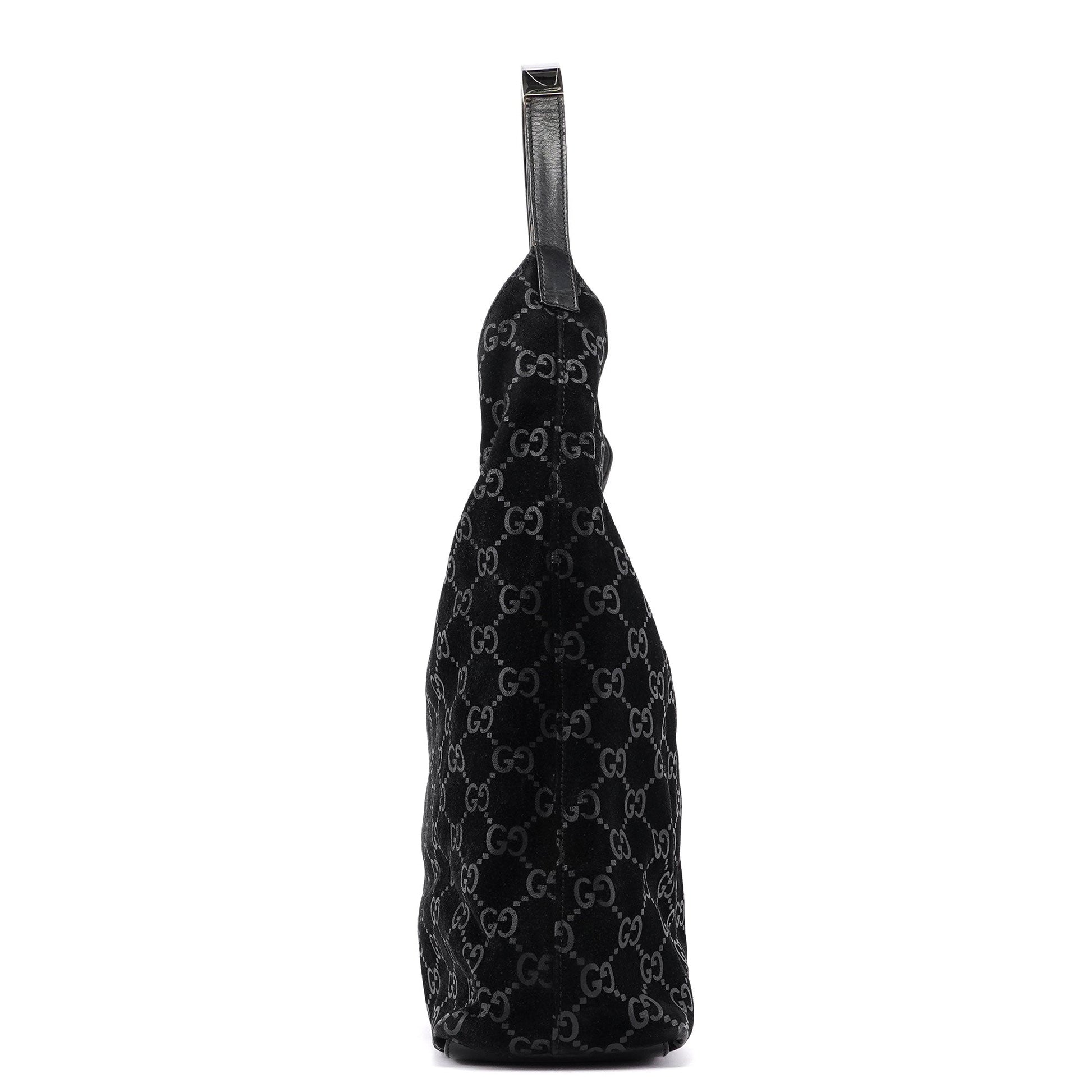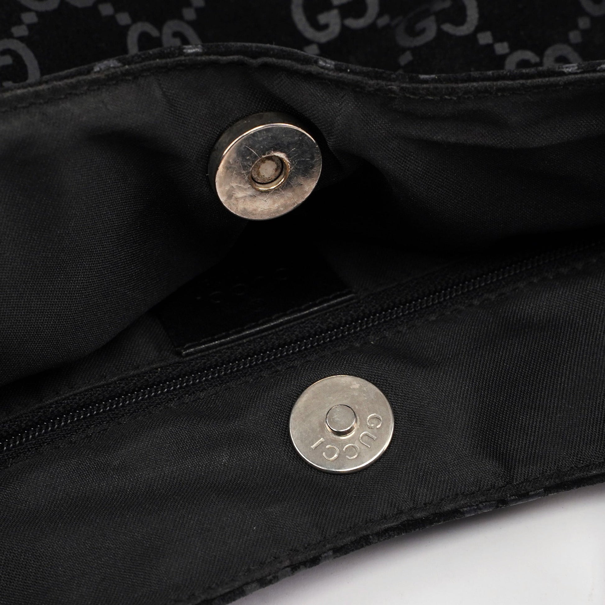 Unveil the elegance of the Gucci GG suede shoulder bag, designed by Tom Ford in 1997. This luxurious piece features silver-tone hardware with engraved Gucci logo, complemented by black calfskin leather trim. The interior compartment is lined in satin, featuring a convenient zipper pocket.
