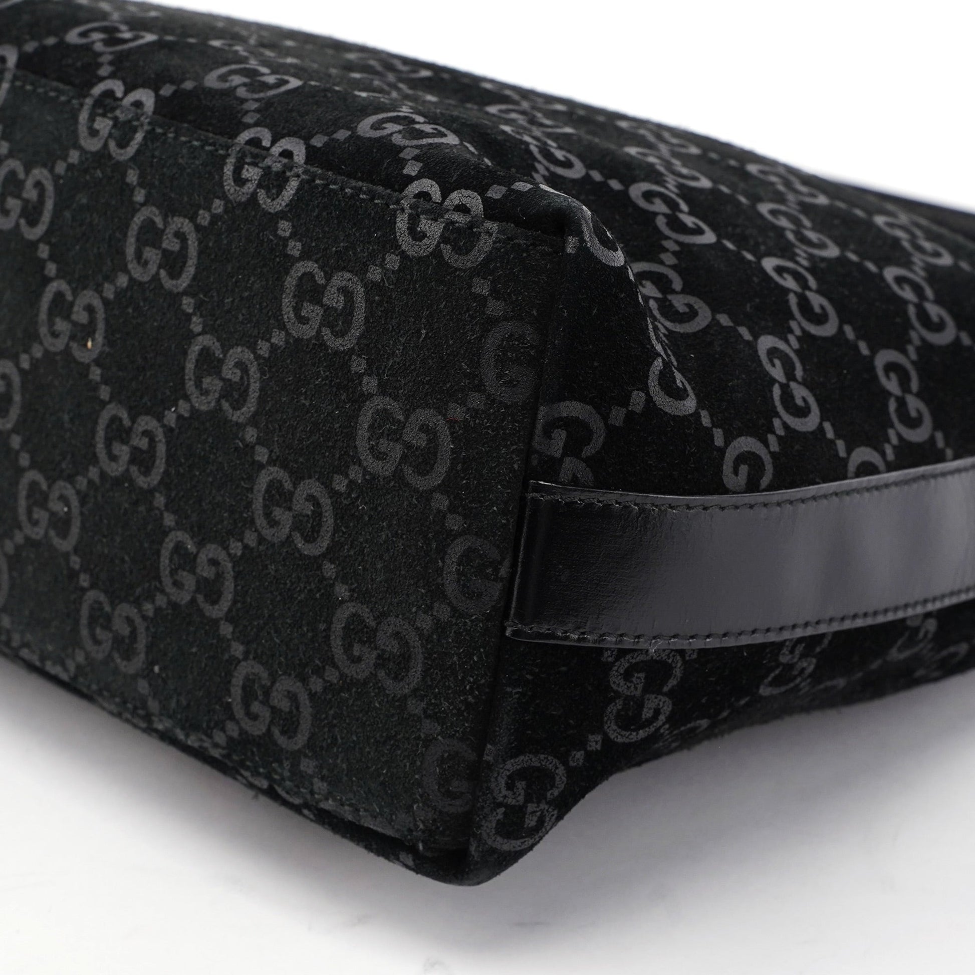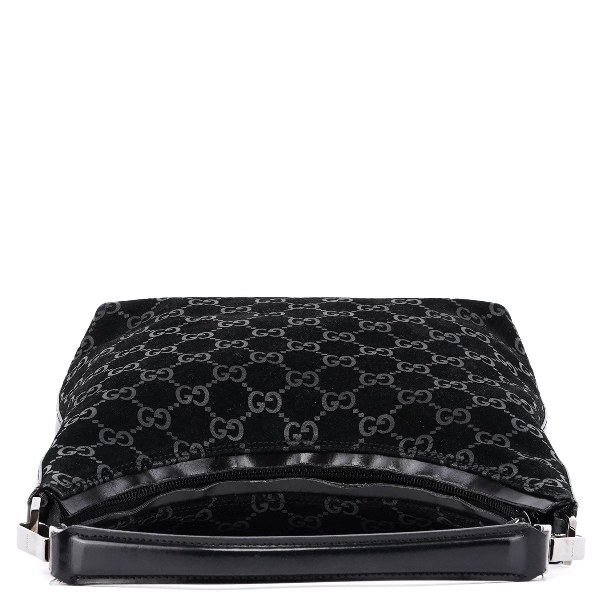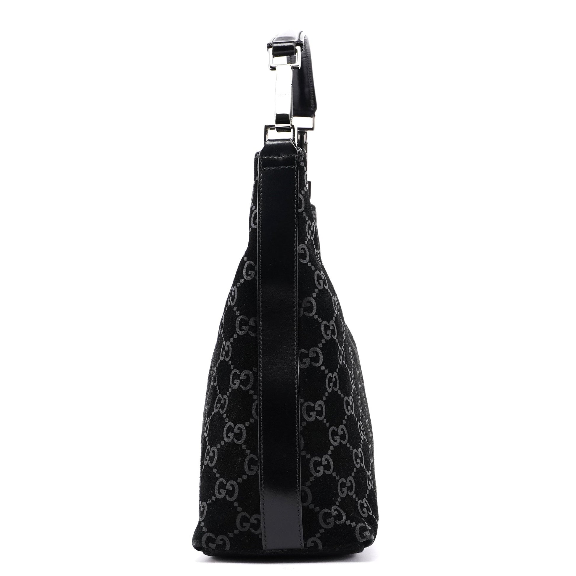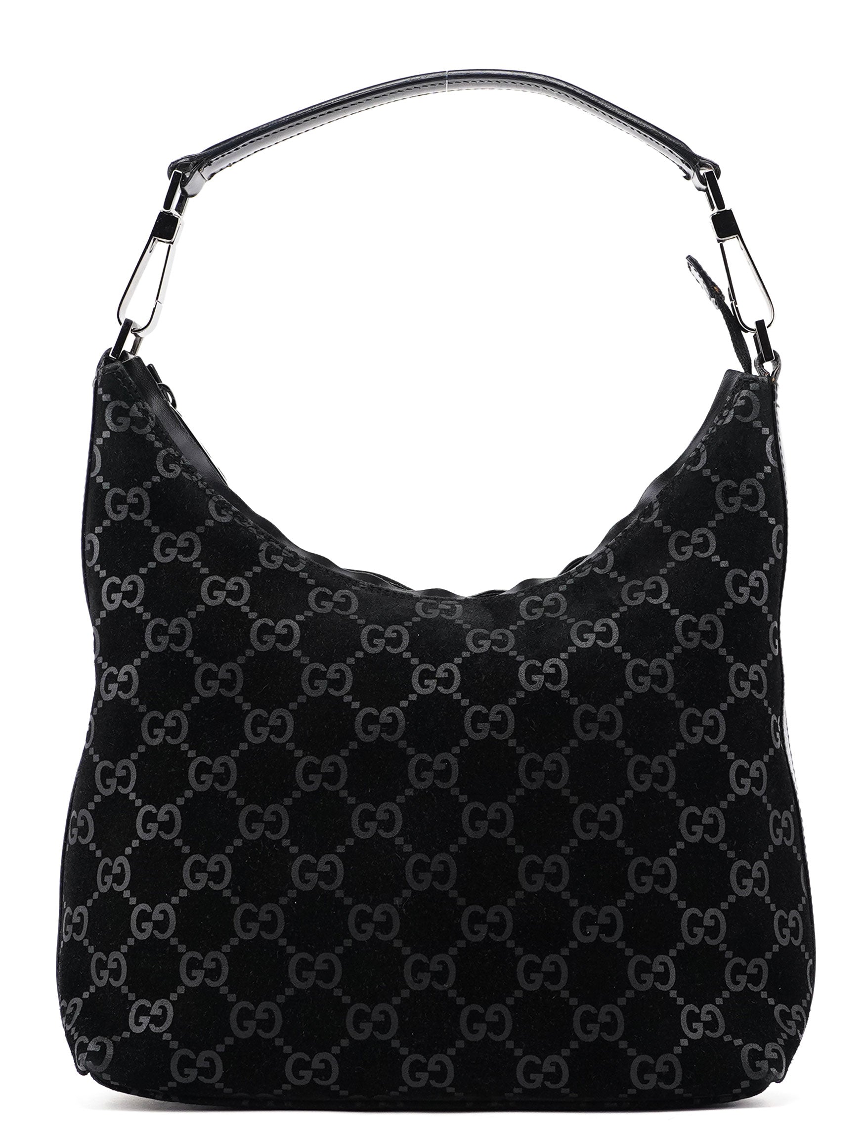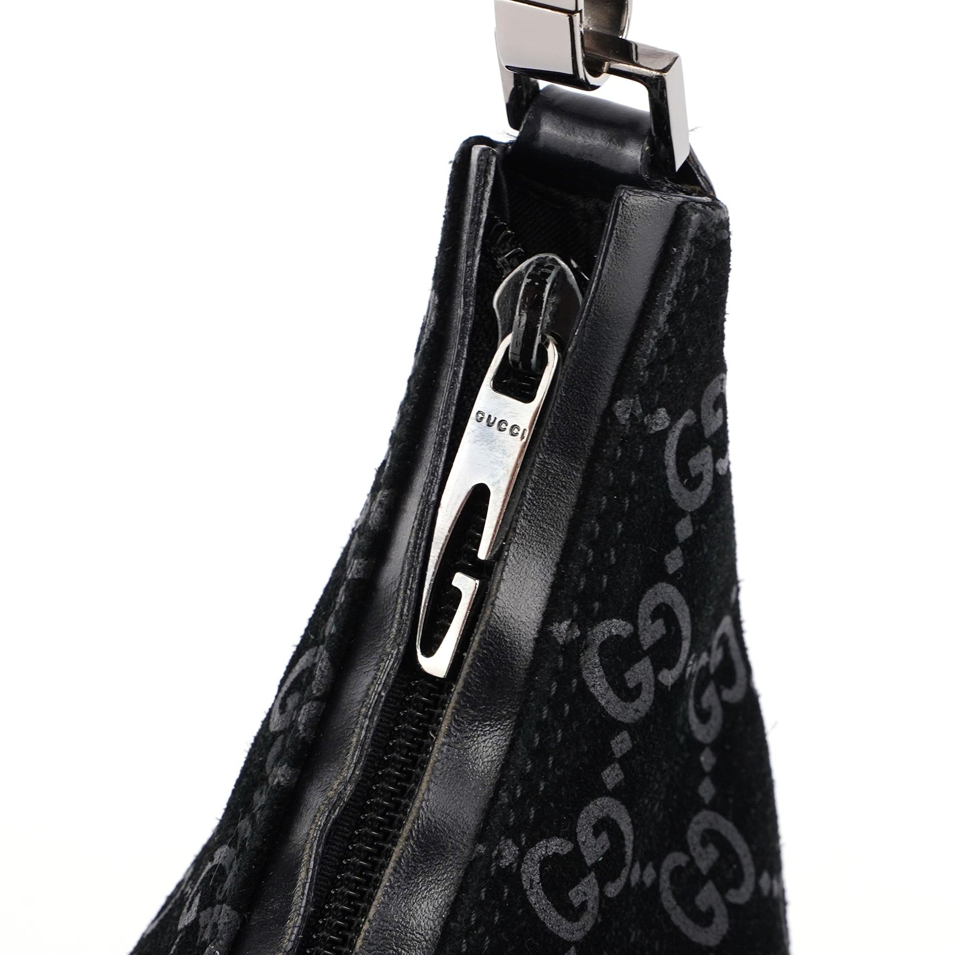 Unveil the elegance of the Gucci GG suede shoulder bag, designed by Tom Ford in 1997. This luxurious piece features silver-tone hardware with engraved Gucci logo, complemented by black calfskin leather trim. A zipper closure secures the satin-lined interior.