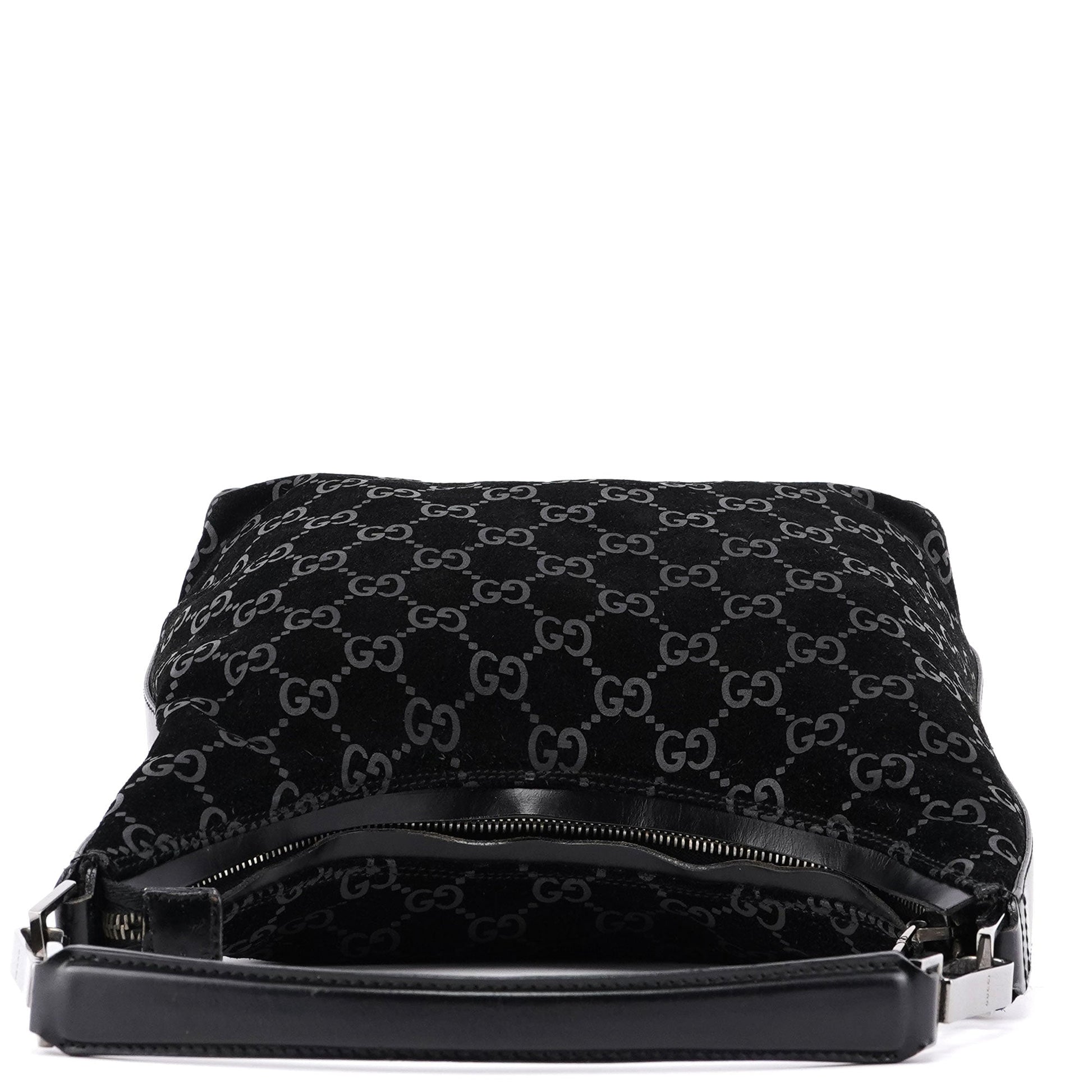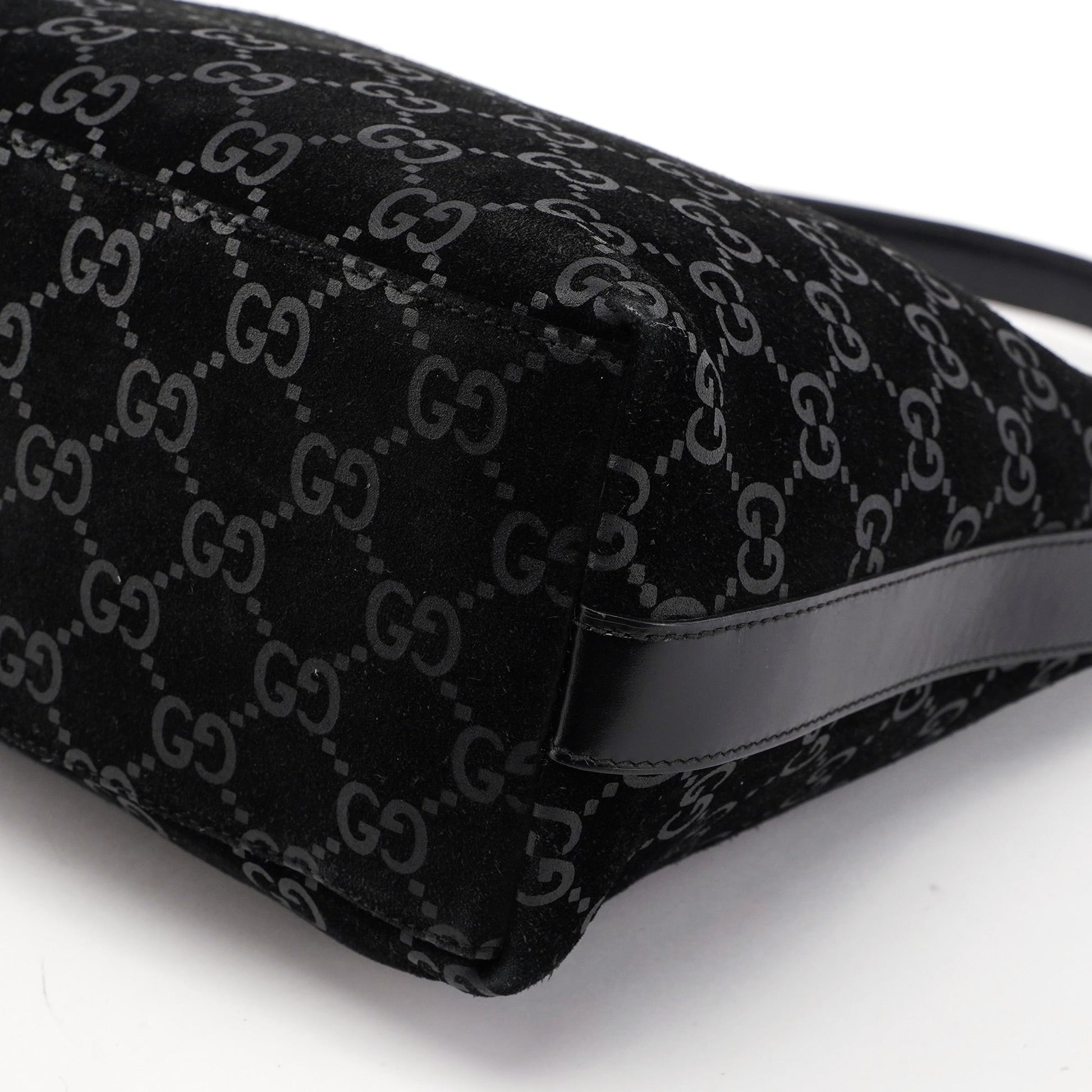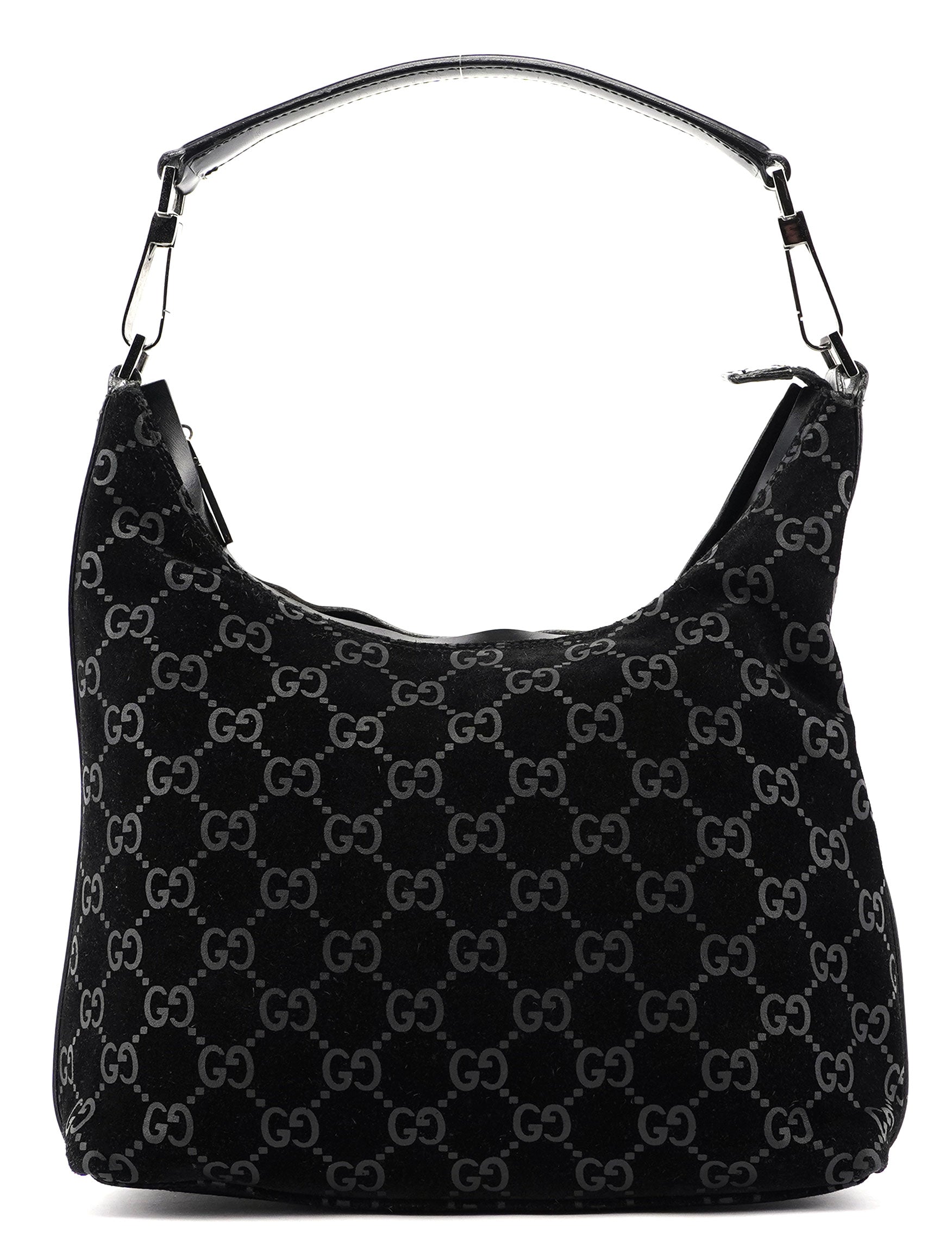 Unveil the elegance of the Gucci GG suede shoulder bag, designed by Tom Ford in 1997. This luxurious piece features silver-tone hardware with engraved Gucci logo, complemented by black calfskin leather trim. A zipper closure secures the satin-lined interior.