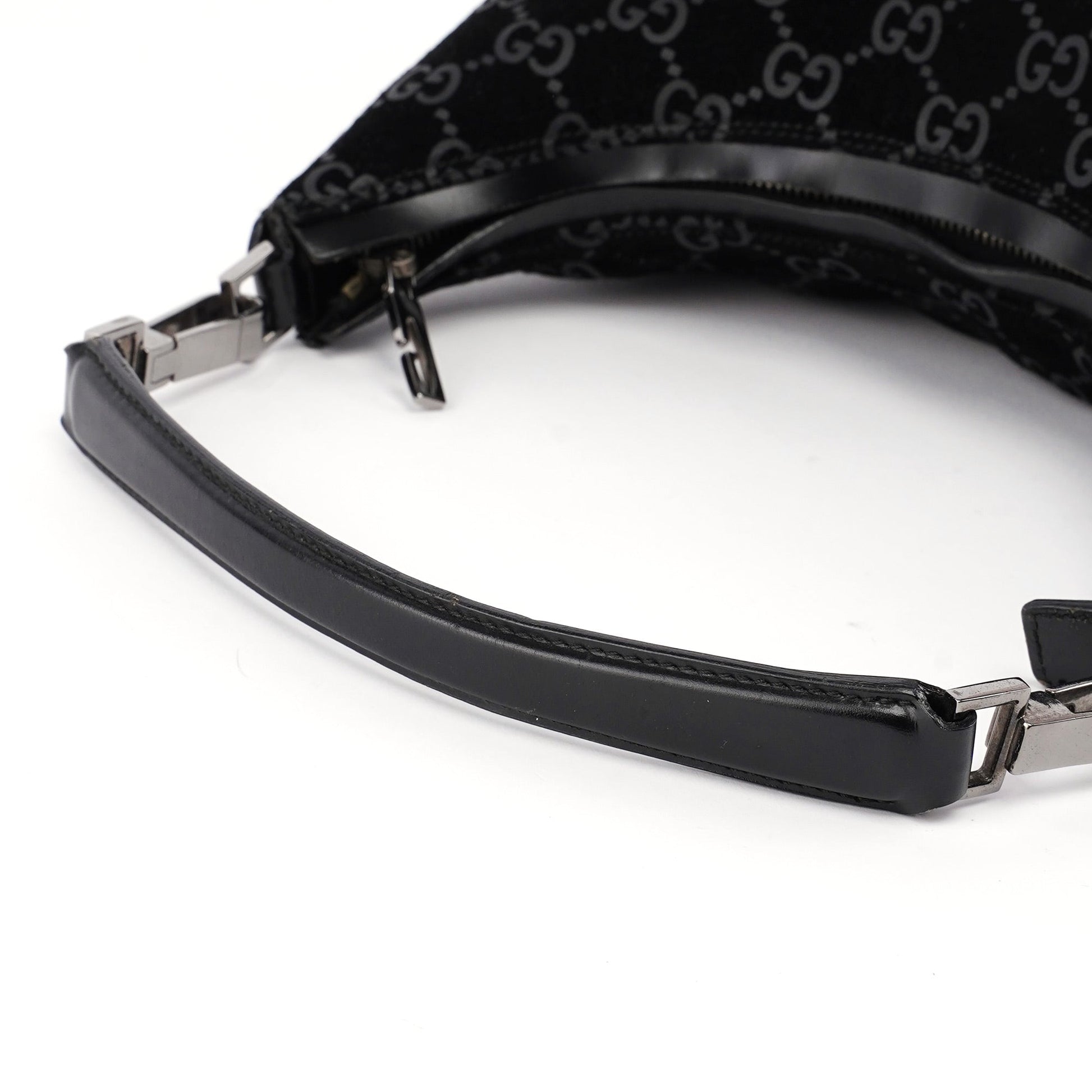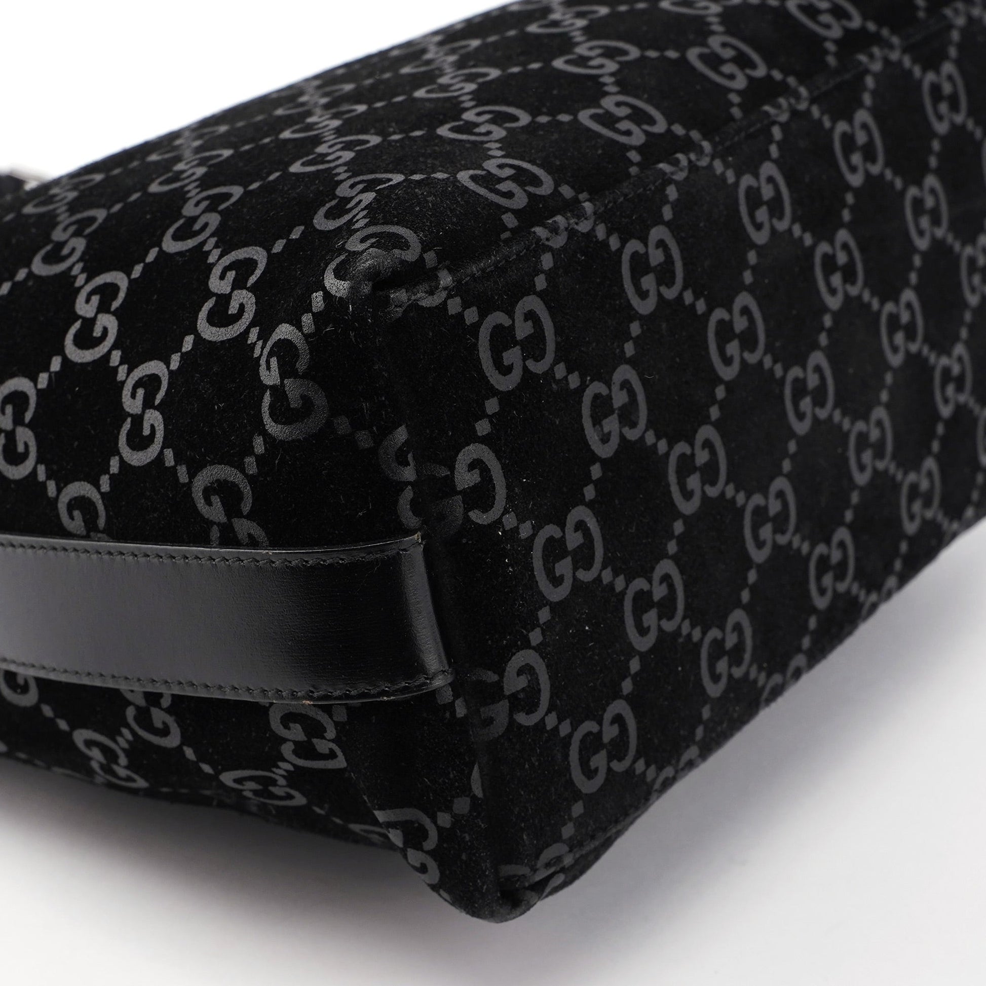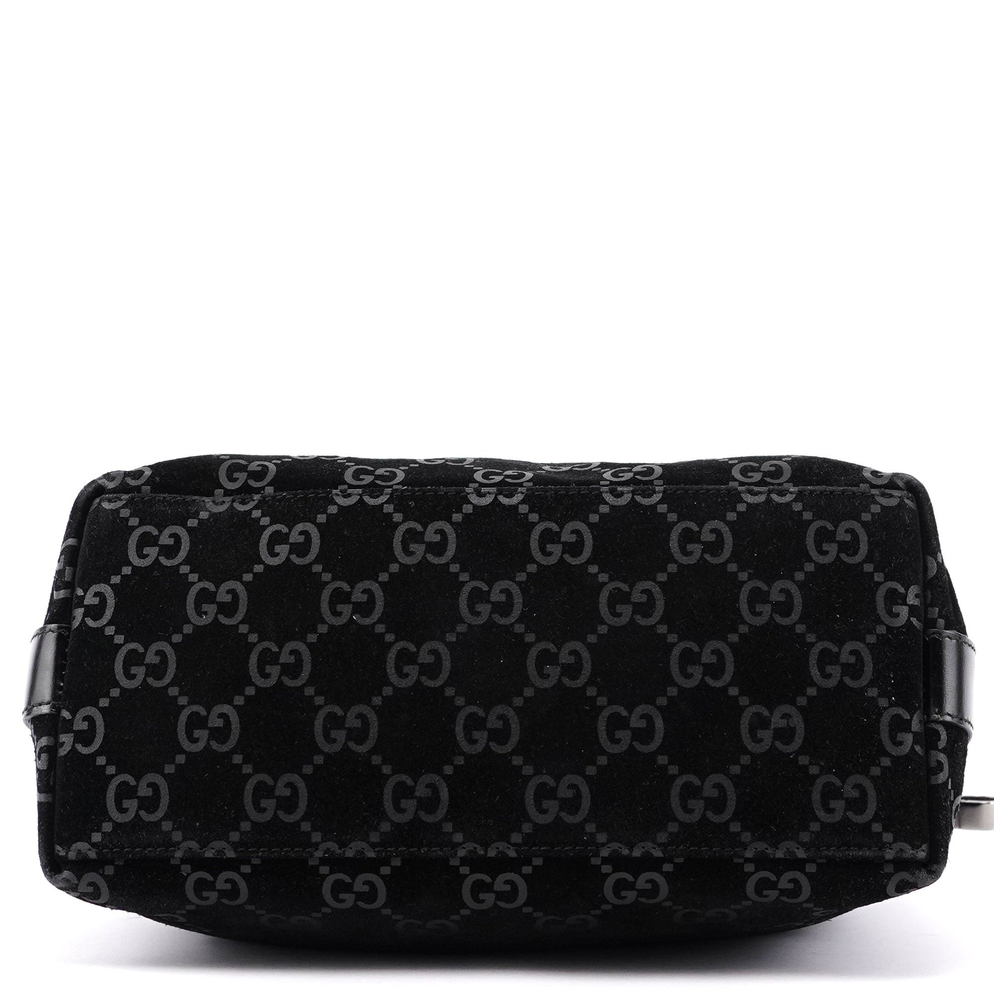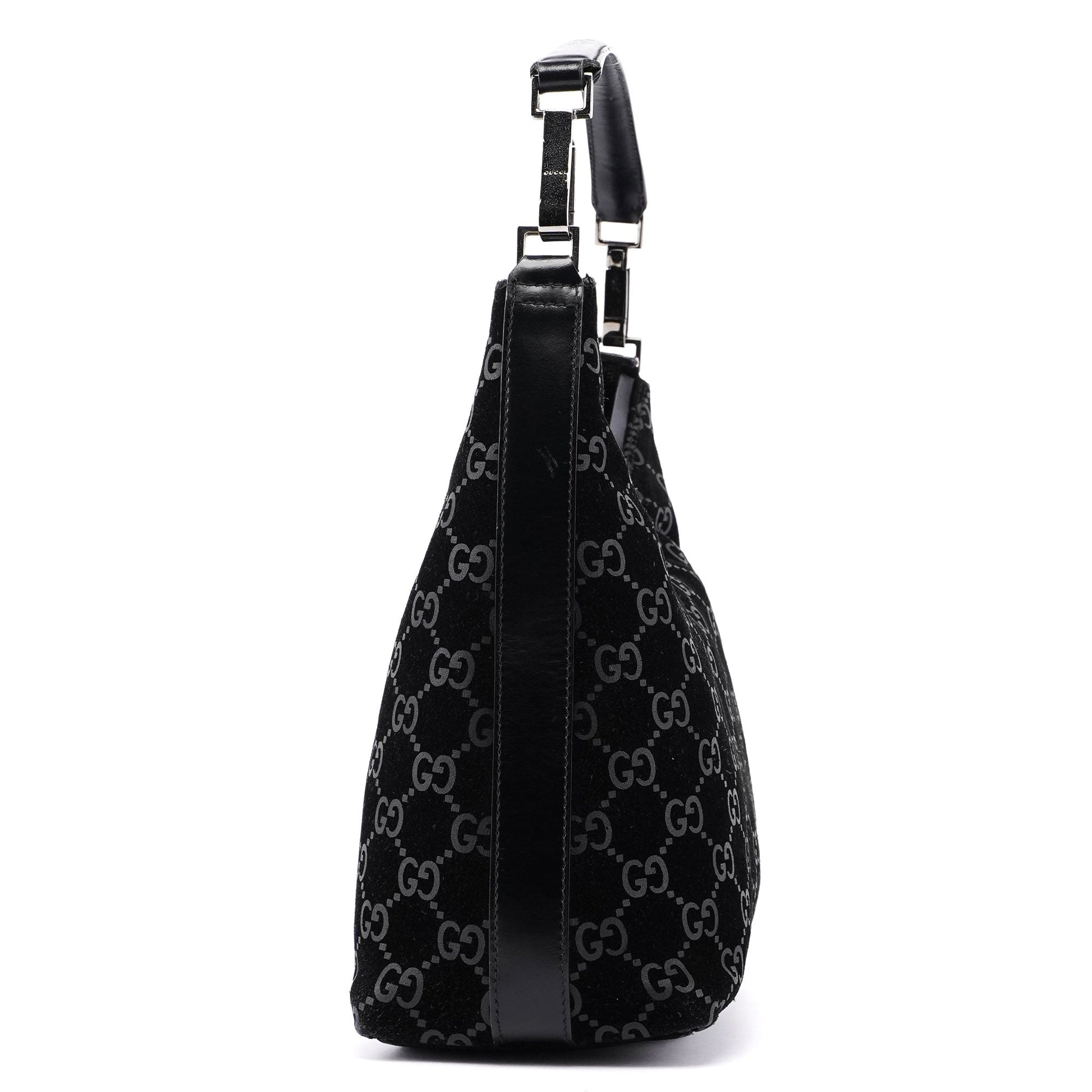 Unveil the elegance of the Gucci GG suede shoulder bag, designed by Tom Ford in 1997. This luxurious piece features silver-tone hardware with engraved Gucci logo, complemented by black calfskin leather trim. A zipper closure secures the satin-lined interior.