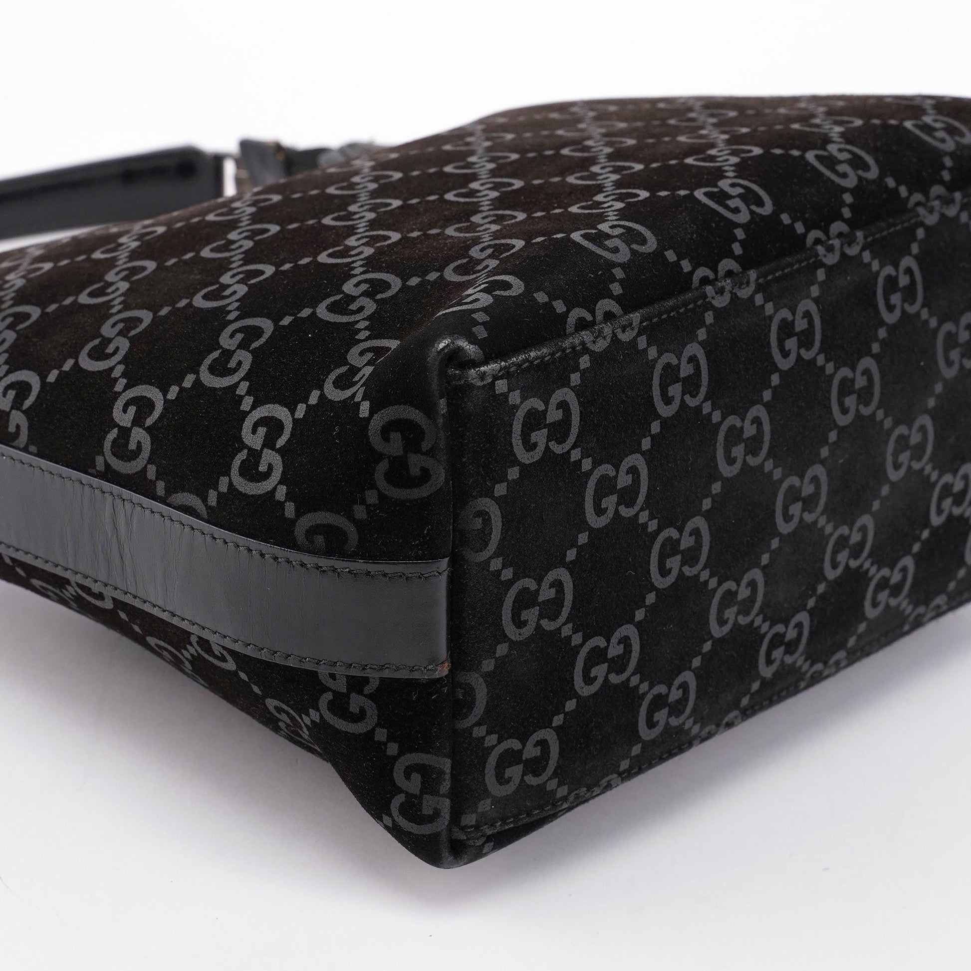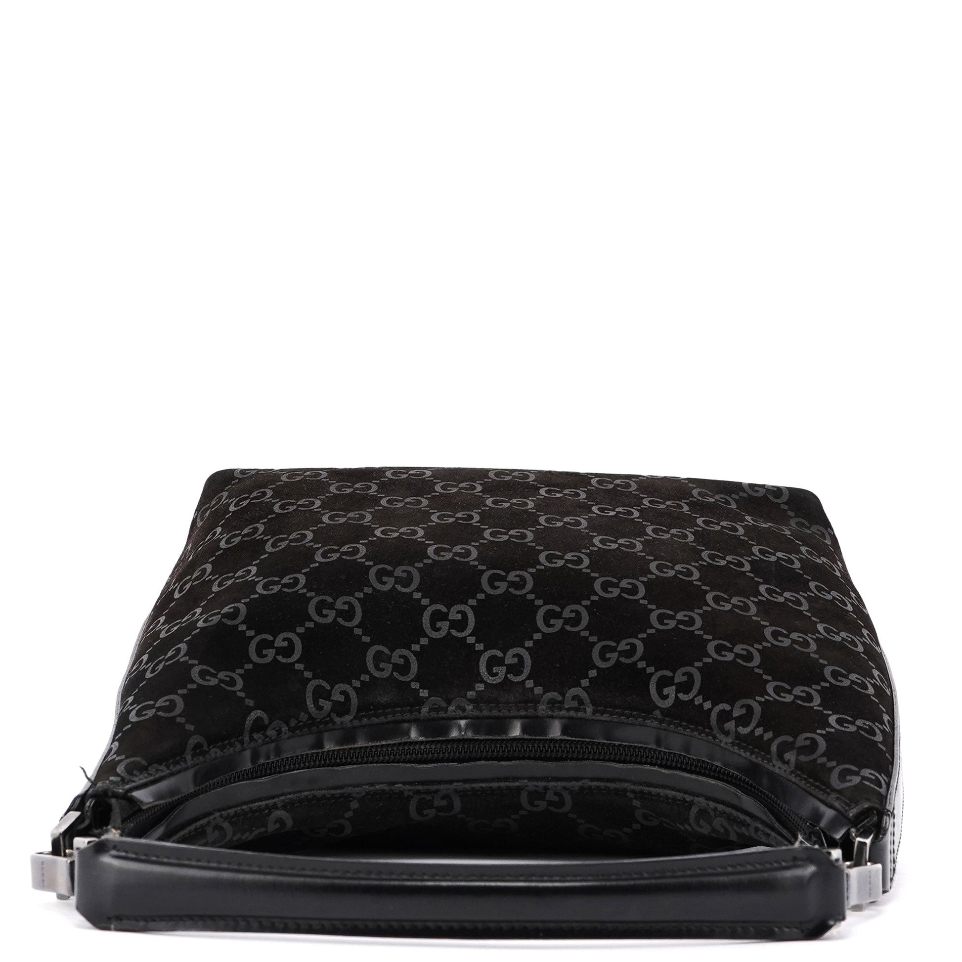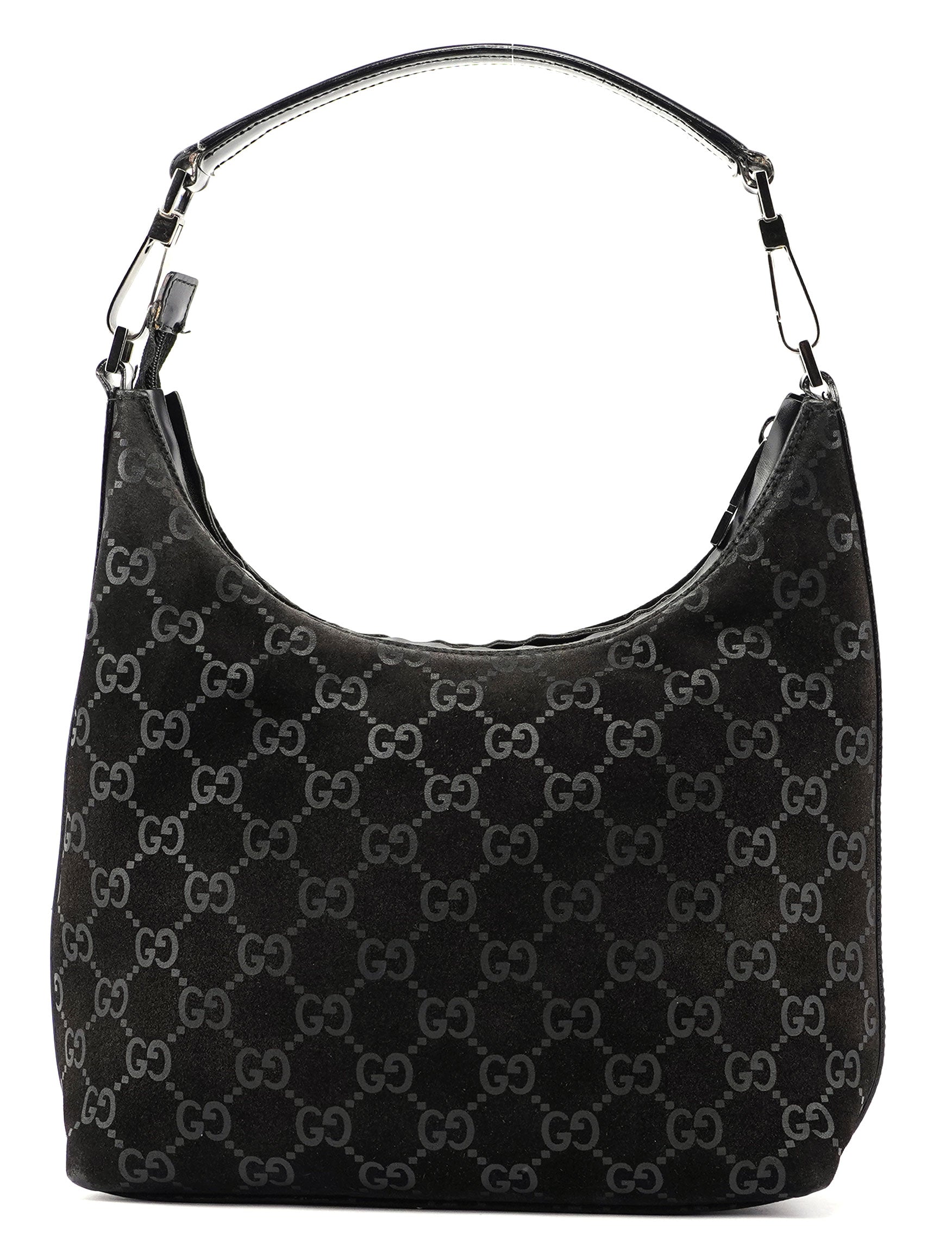 Unveil the elegance of the Gucci GG suede shoulder bag, designed by Tom Ford in 1997. This luxurious piece features silver-tone hardware with engraved Gucci logo, complemented by black calfskin leather trim. A zipper closure secures the satin-lined interior.