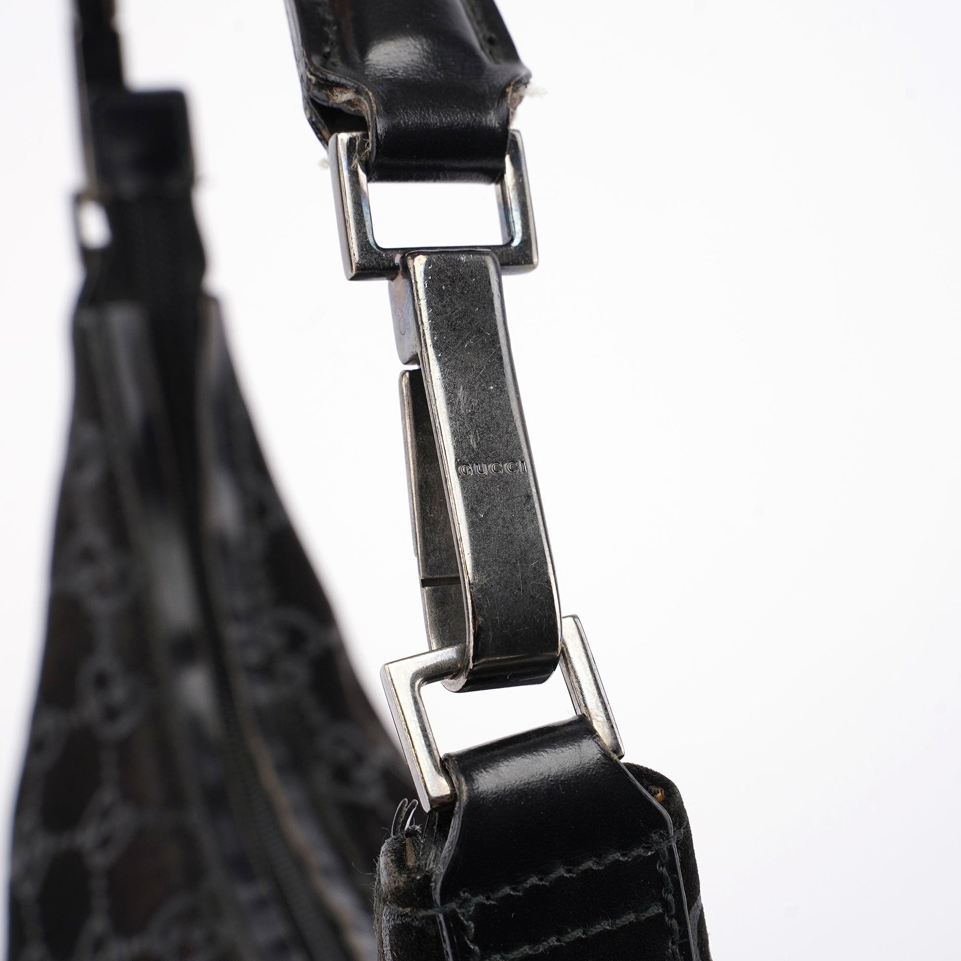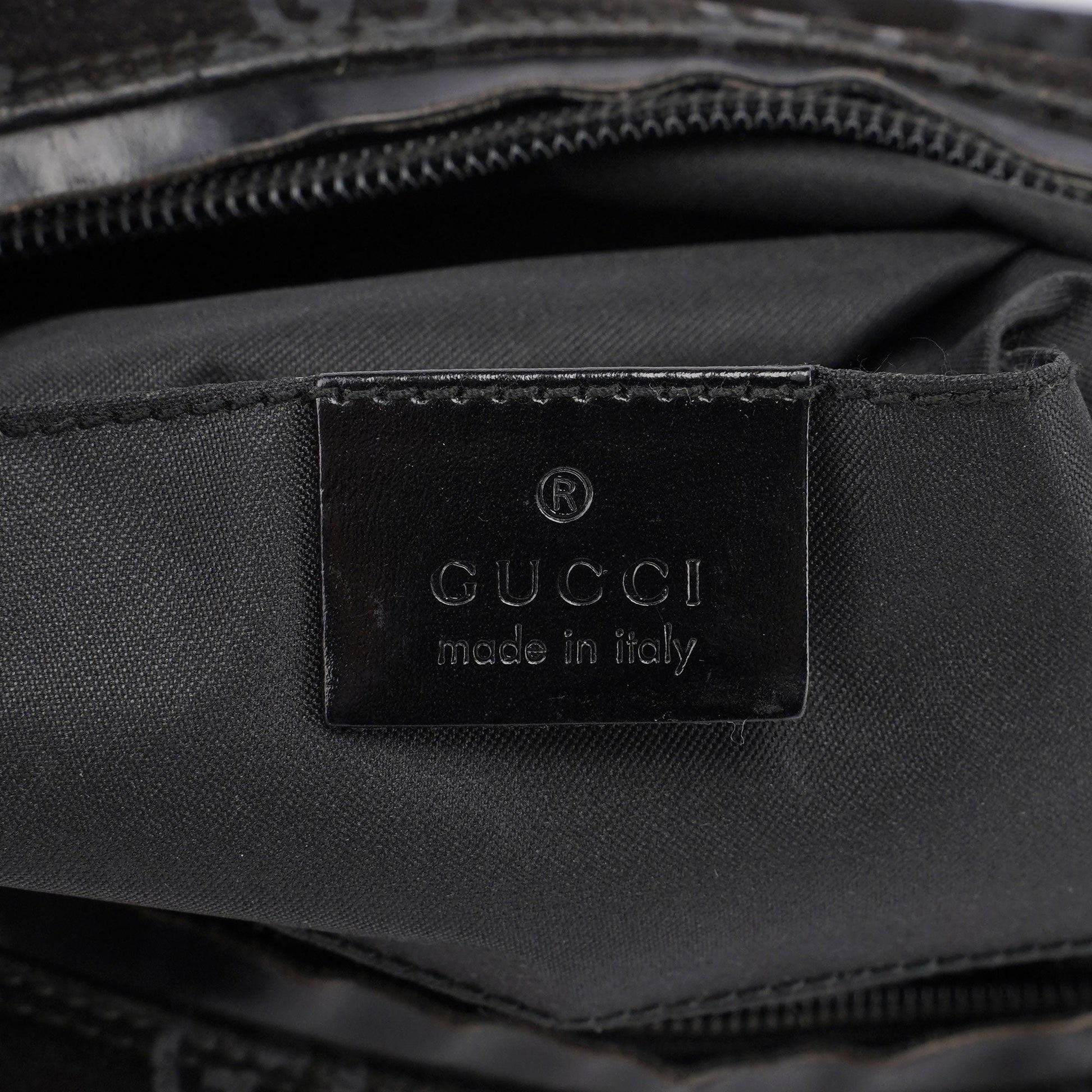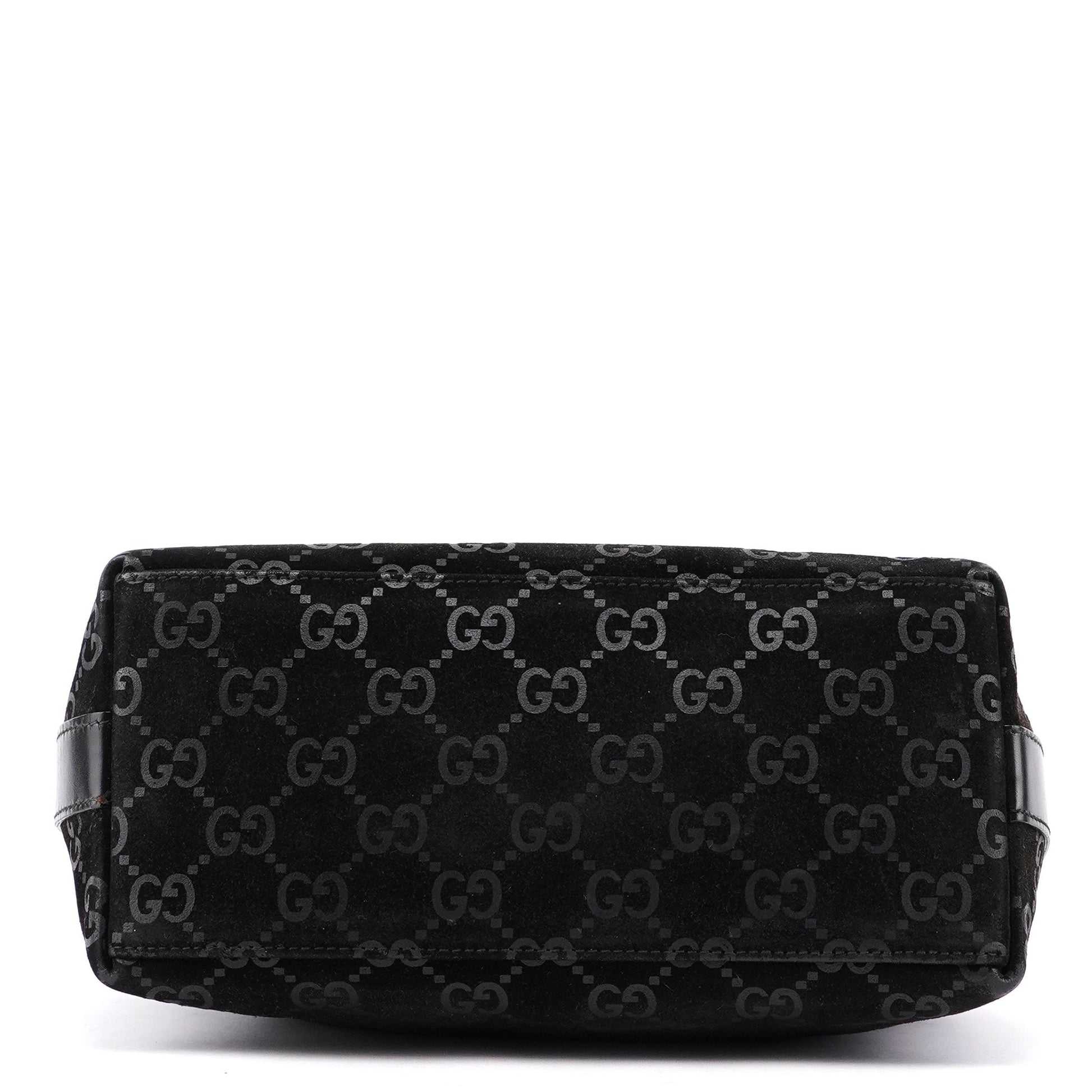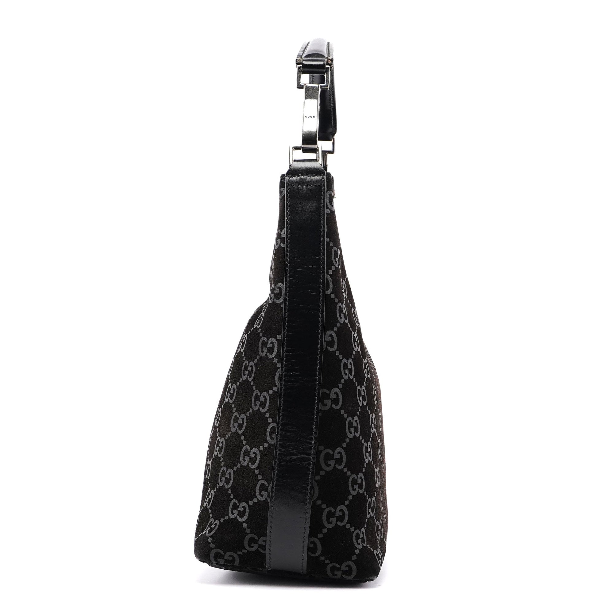 Unveil the elegance of the Gucci GG suede shoulder bag, designed by Tom Ford in 1997. This luxurious piece features silver-tone hardware with engraved Gucci logo, complemented by black calfskin leather trim. A zipper closure secures the satin-lined interior.