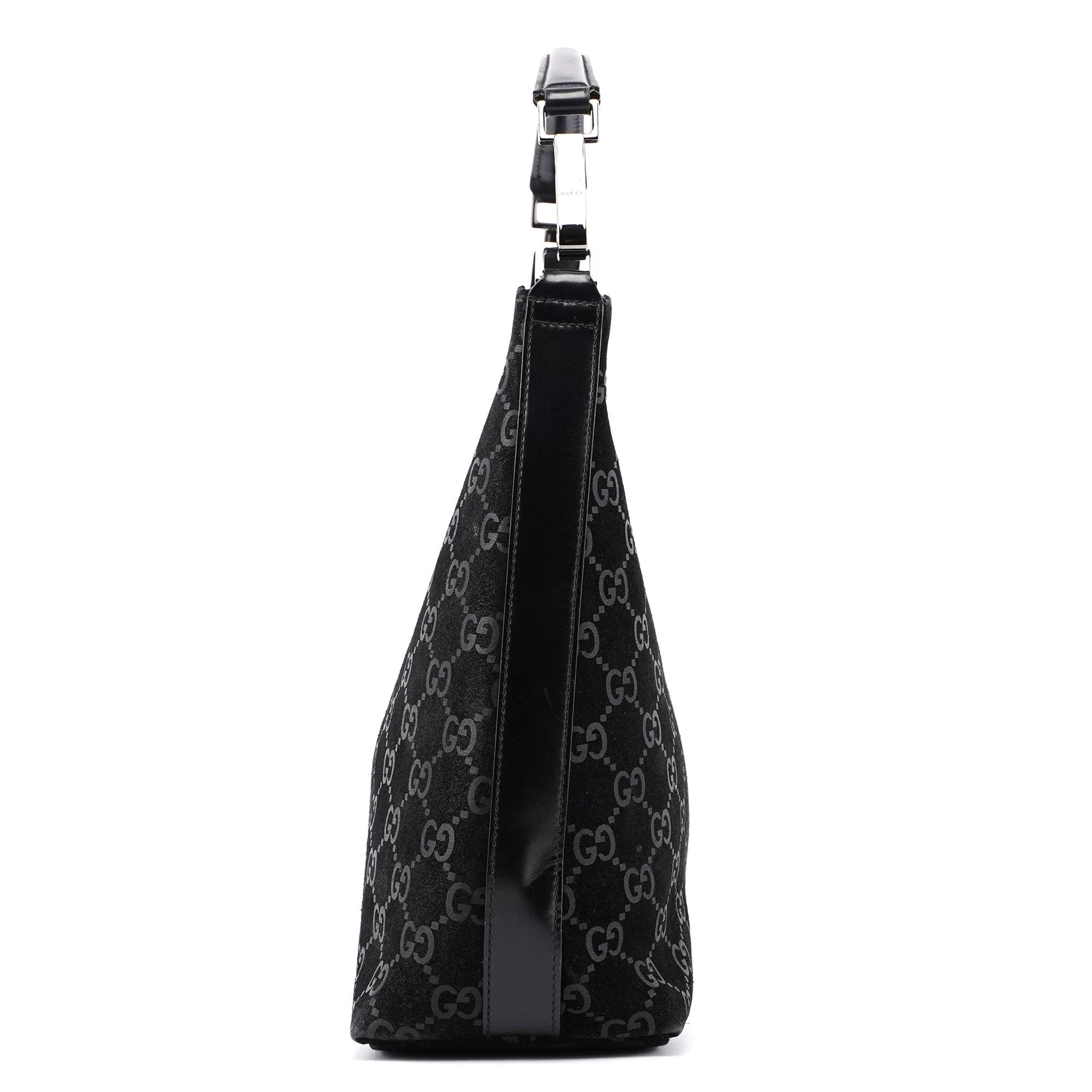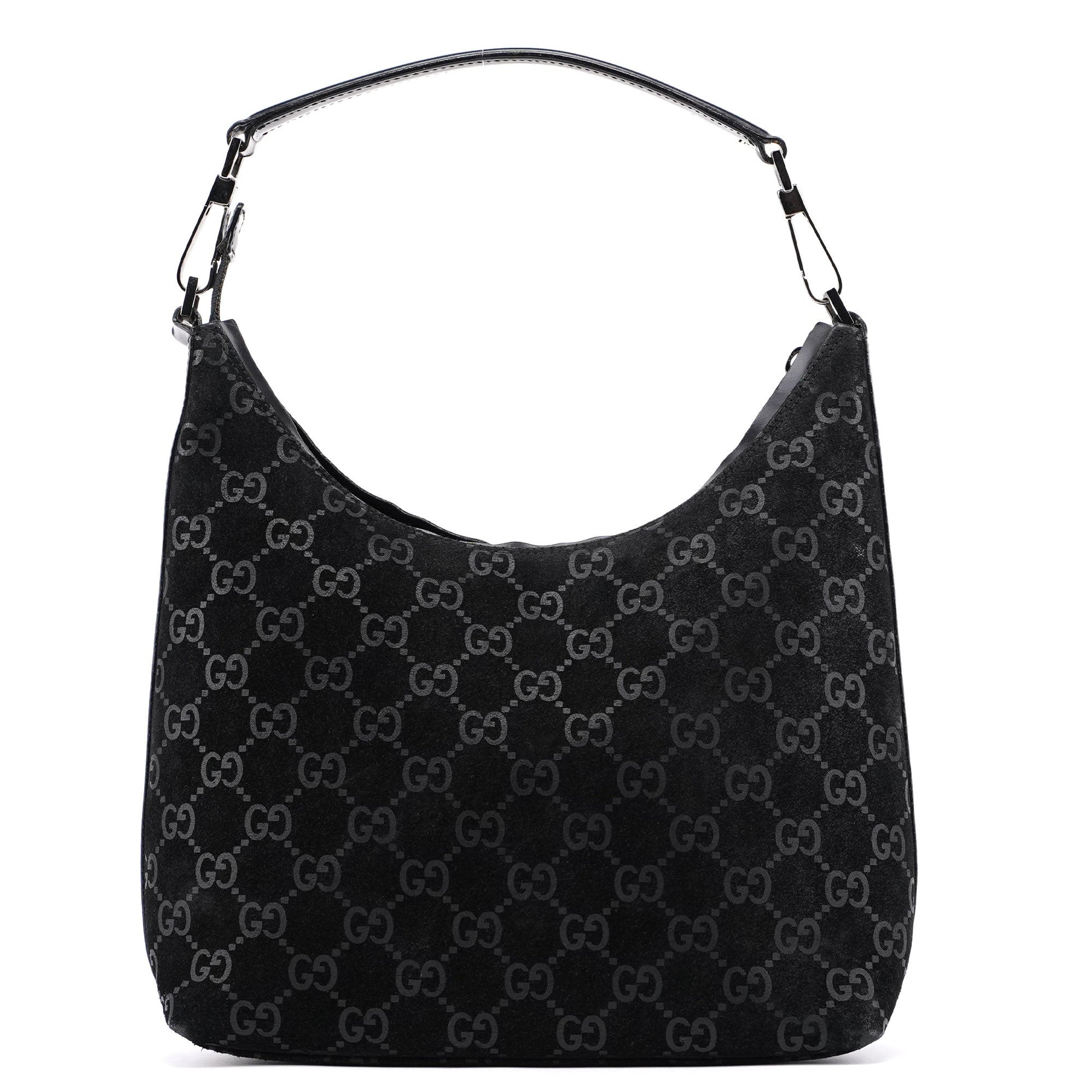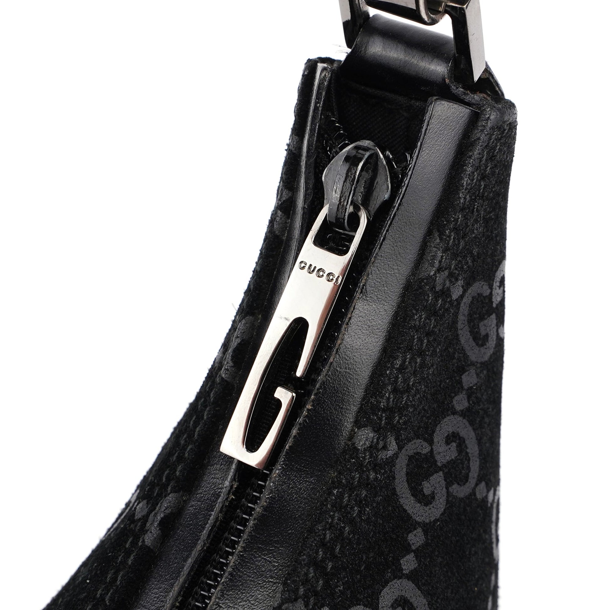 Unveil the elegance of the Gucci GG suede shoulder bag, designed by Tom Ford in 1997. This luxurious piece features silver-tone hardware with engraved Gucci logo, complemented by black calfskin leather trim. A zipper closure secures the satin-lined interior.