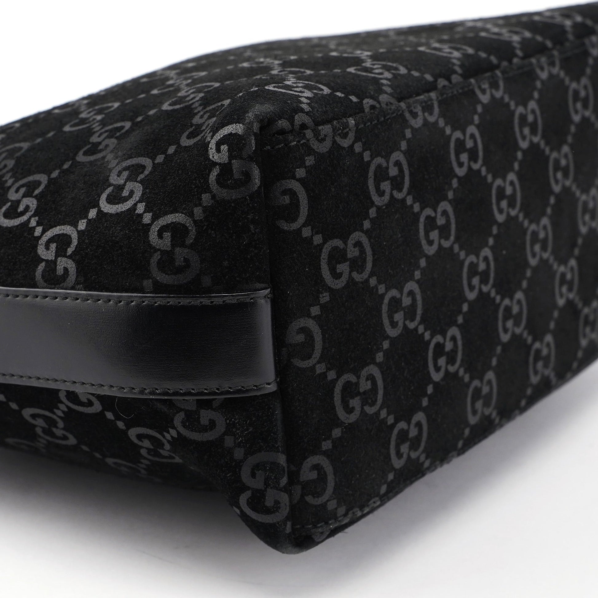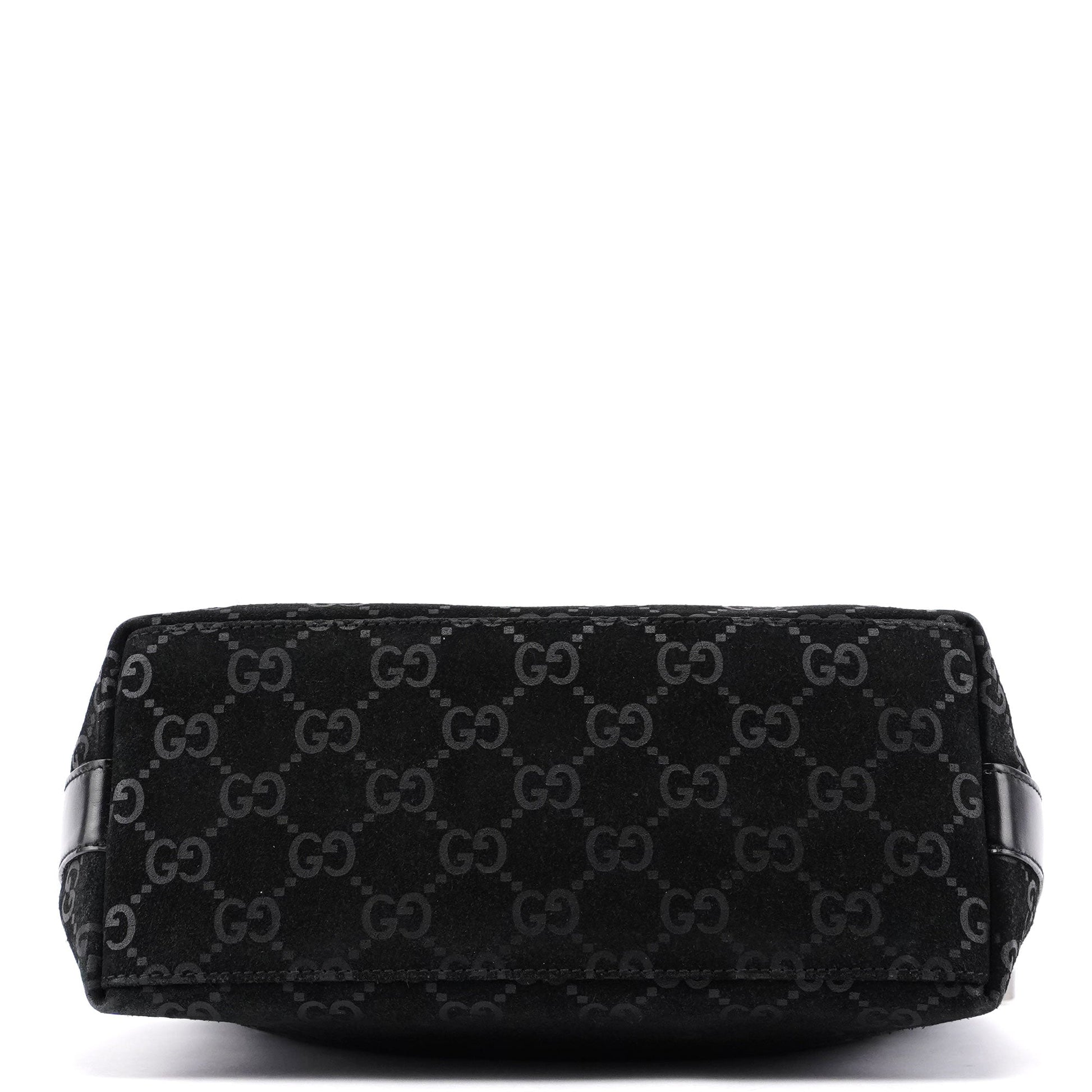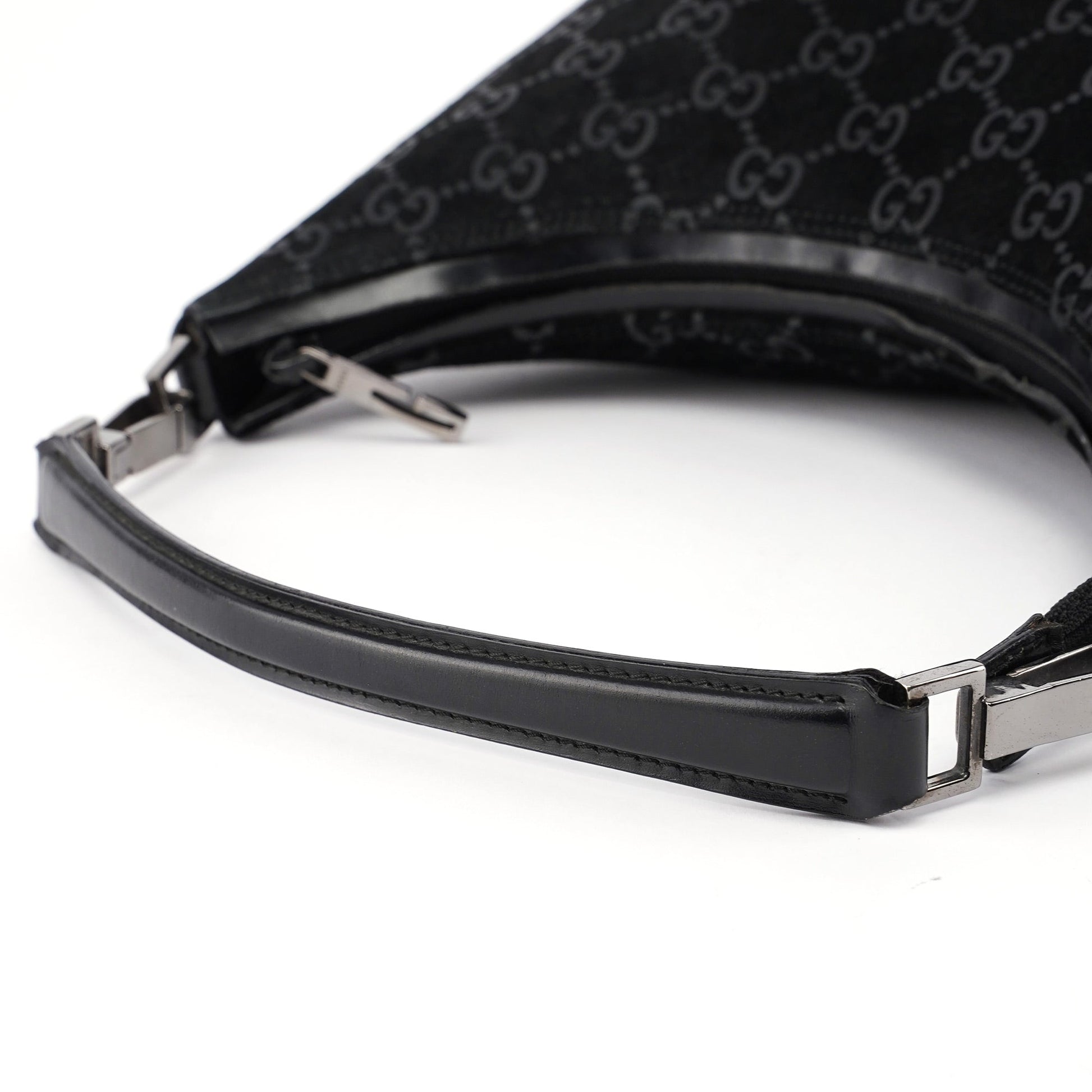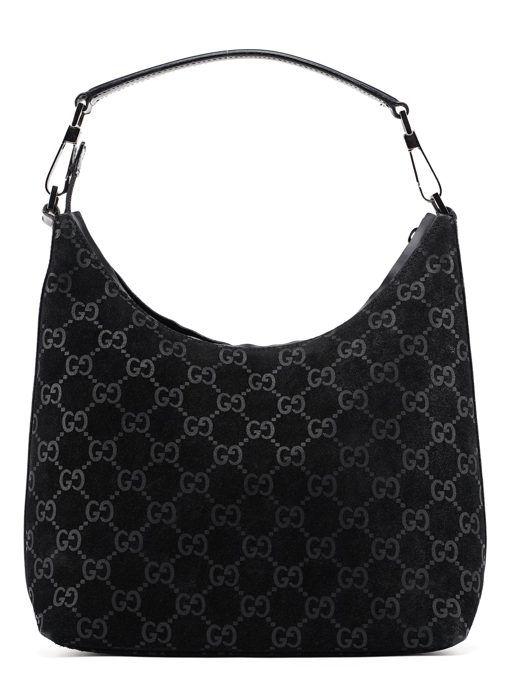 Unveil the elegance of the Gucci GG suede shoulder bag, designed by Tom Ford in 1997. This luxurious piece features silver-tone hardware with engraved Gucci logo, complemented by black calfskin leather trim. A zipper closure secures the satin-lined interior.