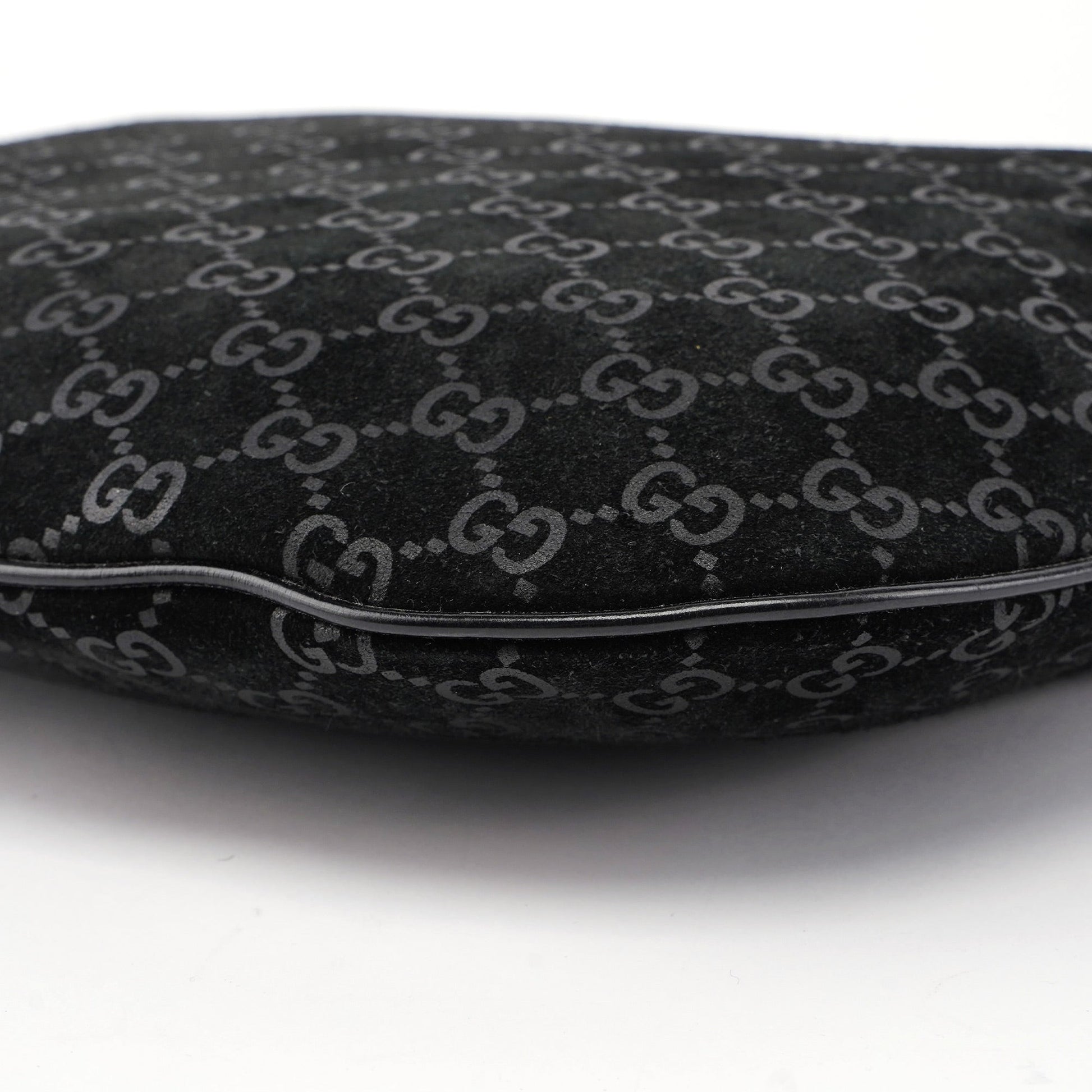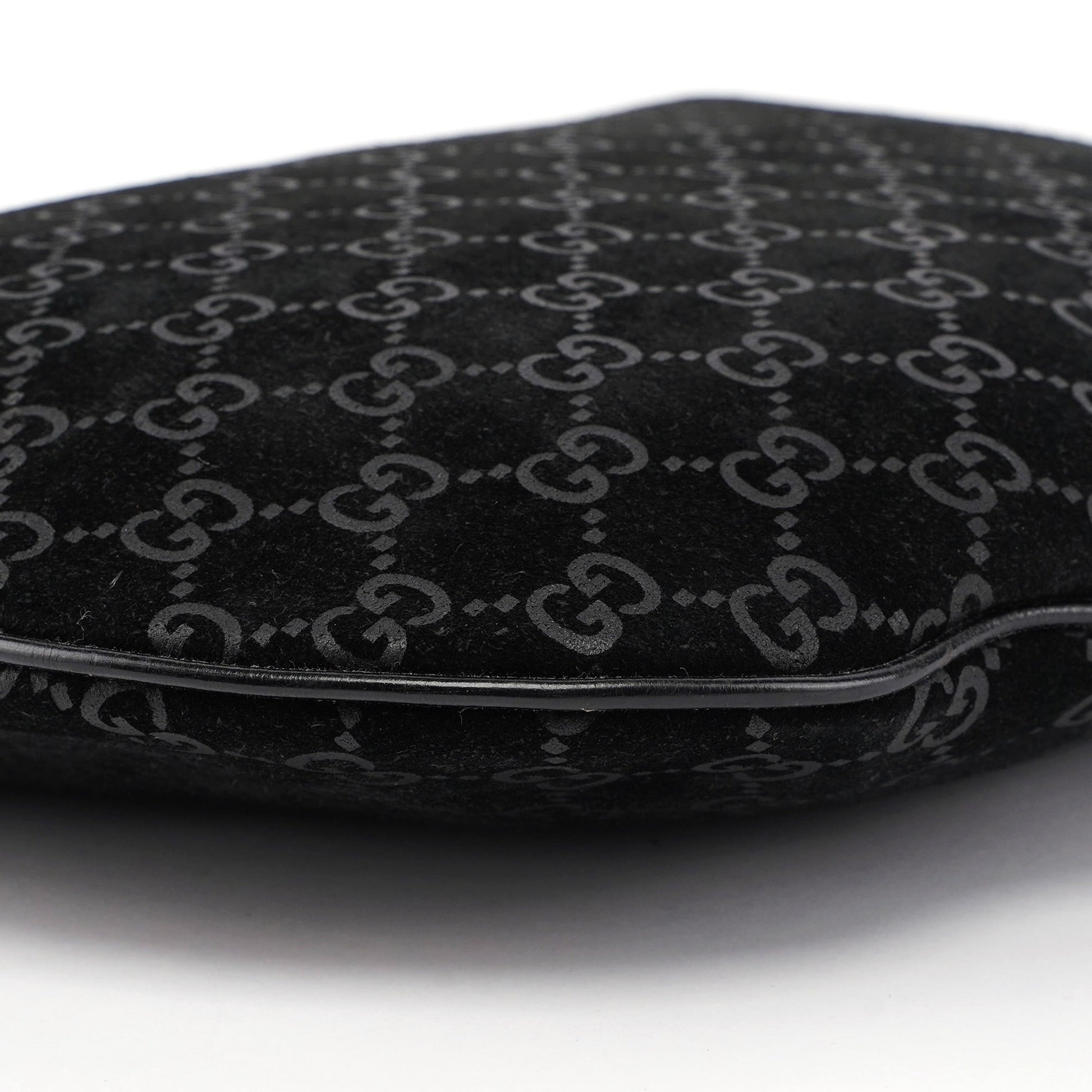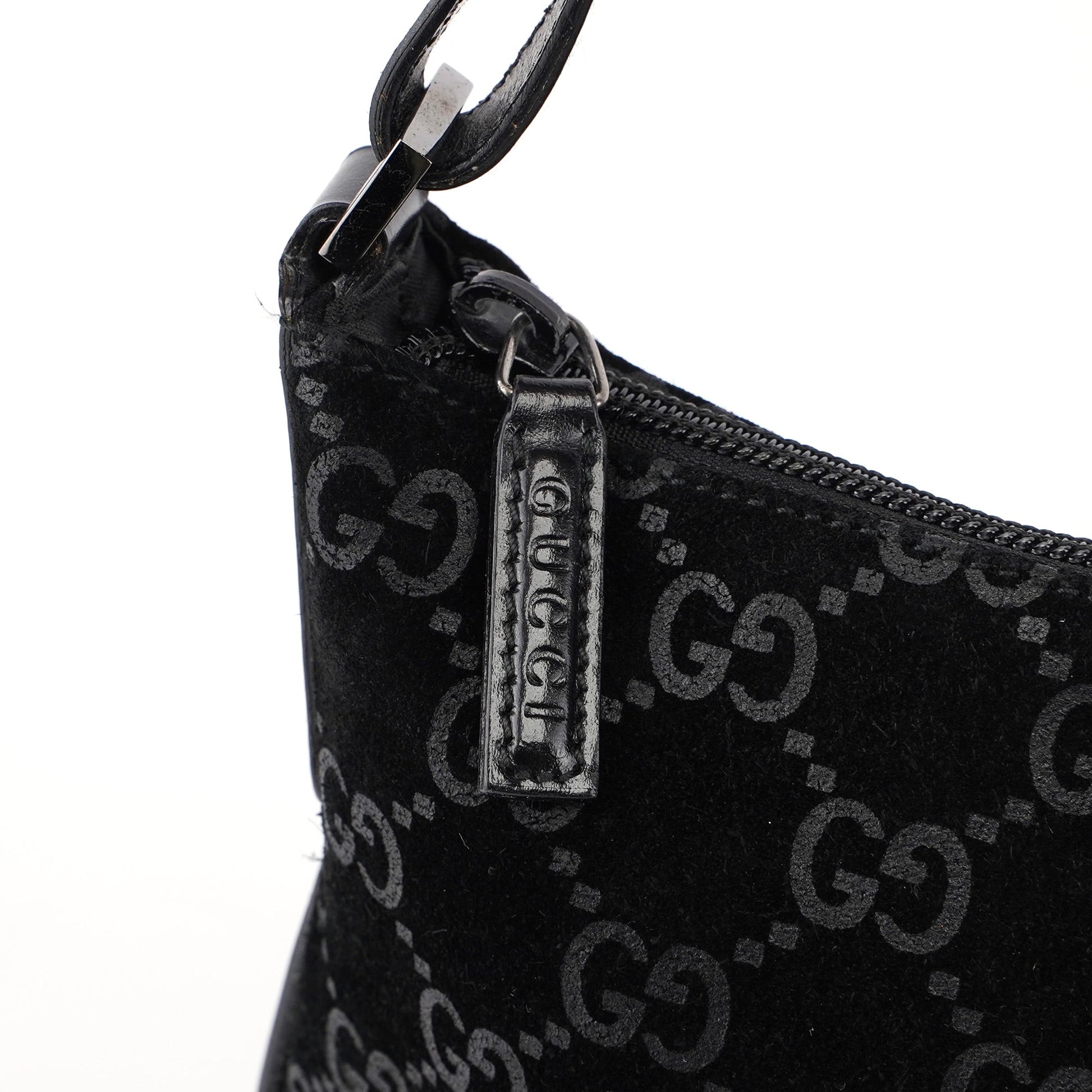 Gucci GG suede shoulder bag, designed by Tom Ford in 1997, handcrafted from black GG monogram suede features silver-tone hardware and complemented by black calfskin leather trim. A zipper closure secures the cotton-lined interior and a zipper pocket.