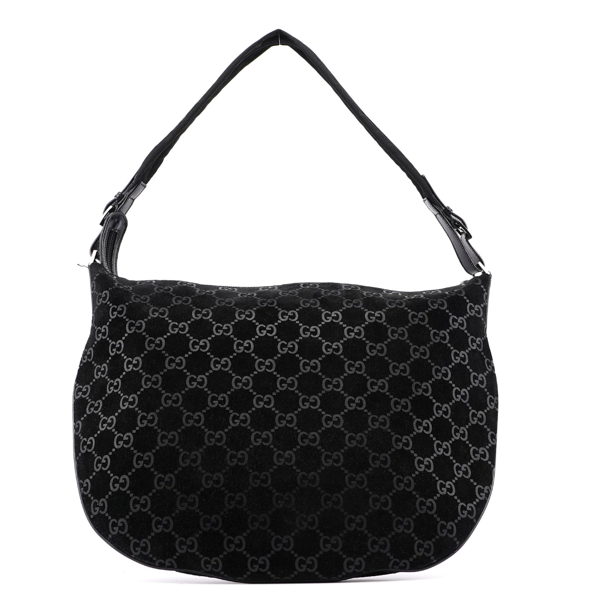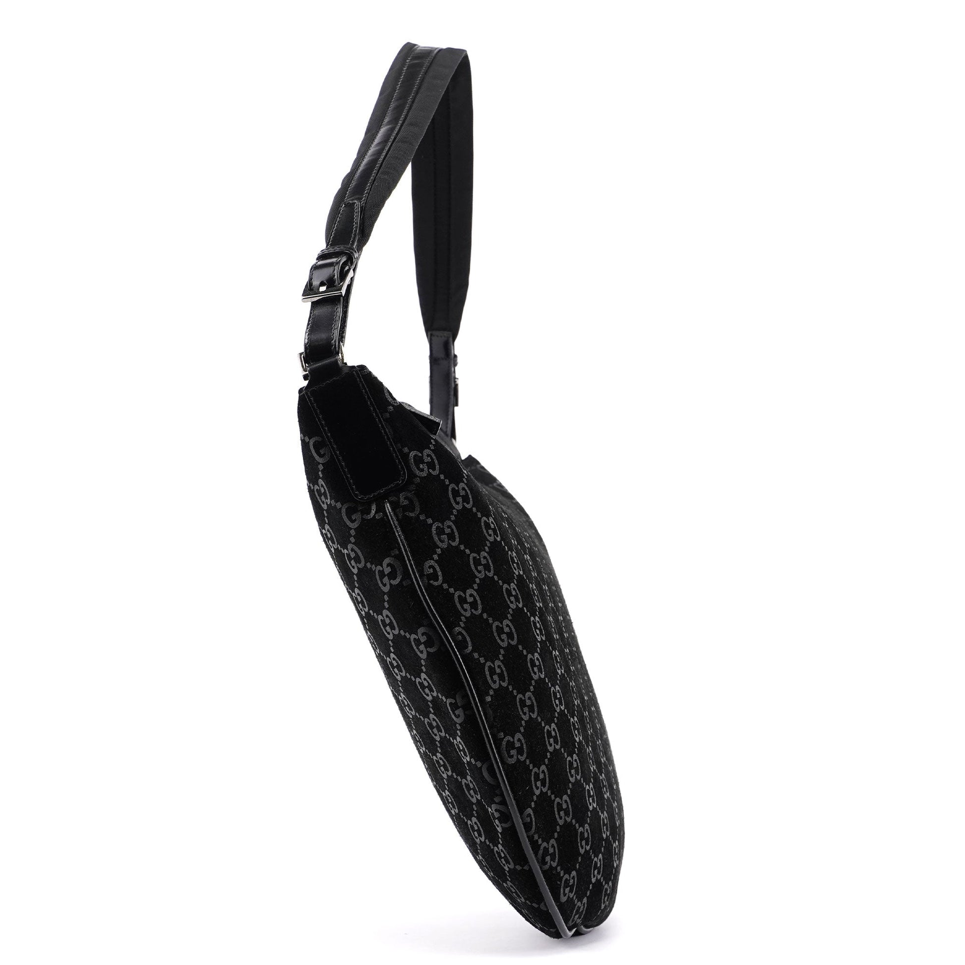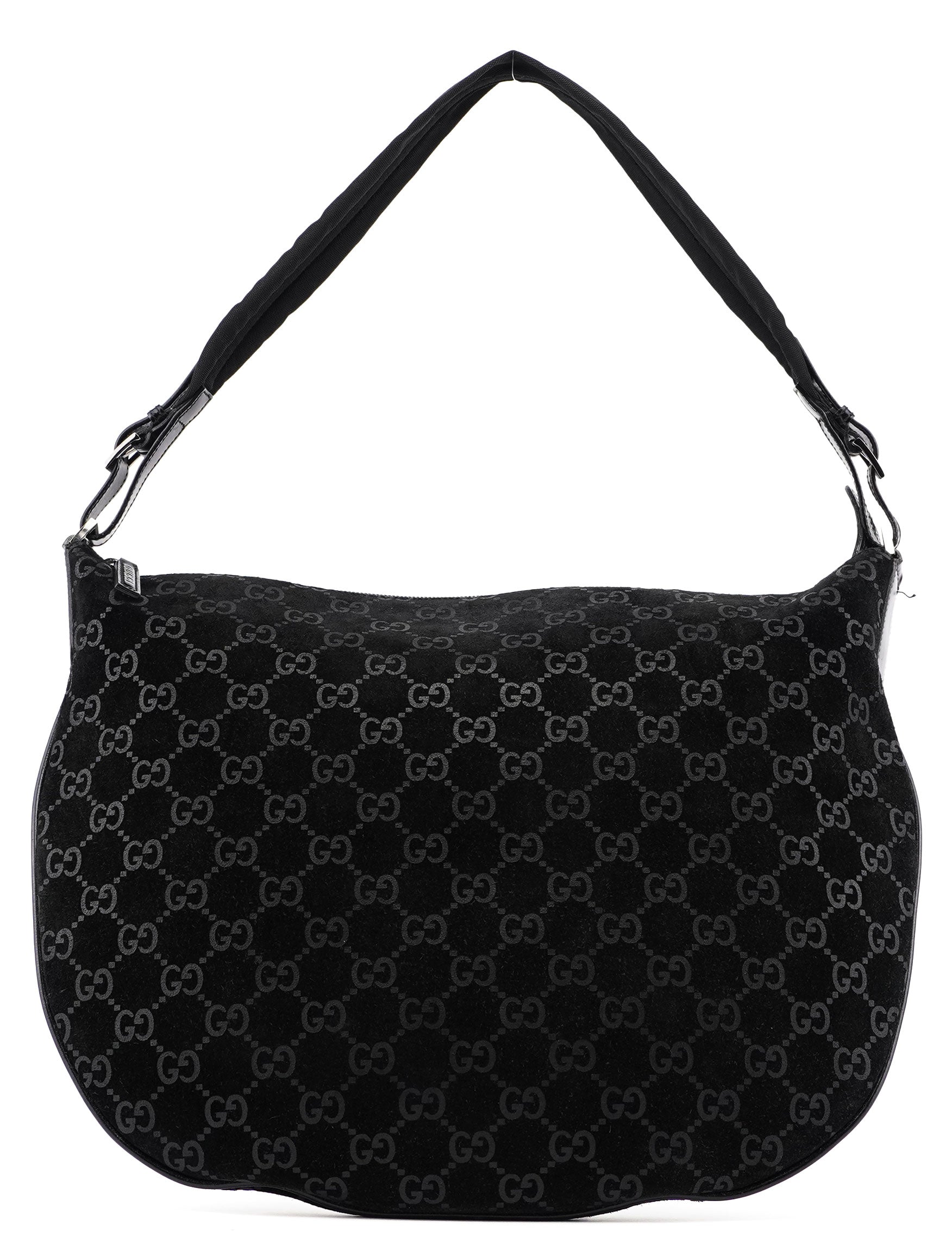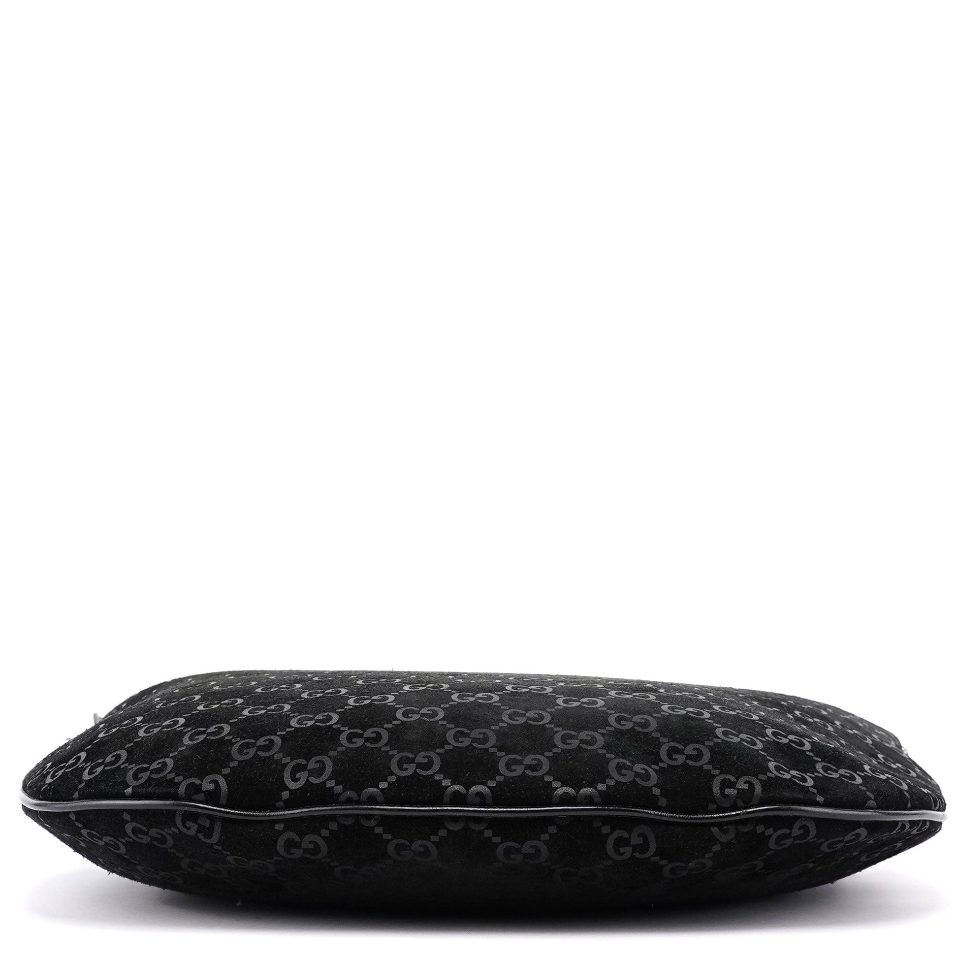 Gucci GG suede shoulder bag, designed by Tom Ford in 1997, handcrafted from black GG monogram suede features silver-tone hardware and complemented by black calfskin leather trim. A zipper closure secures the cotton-lined interior and a zipper pocket.