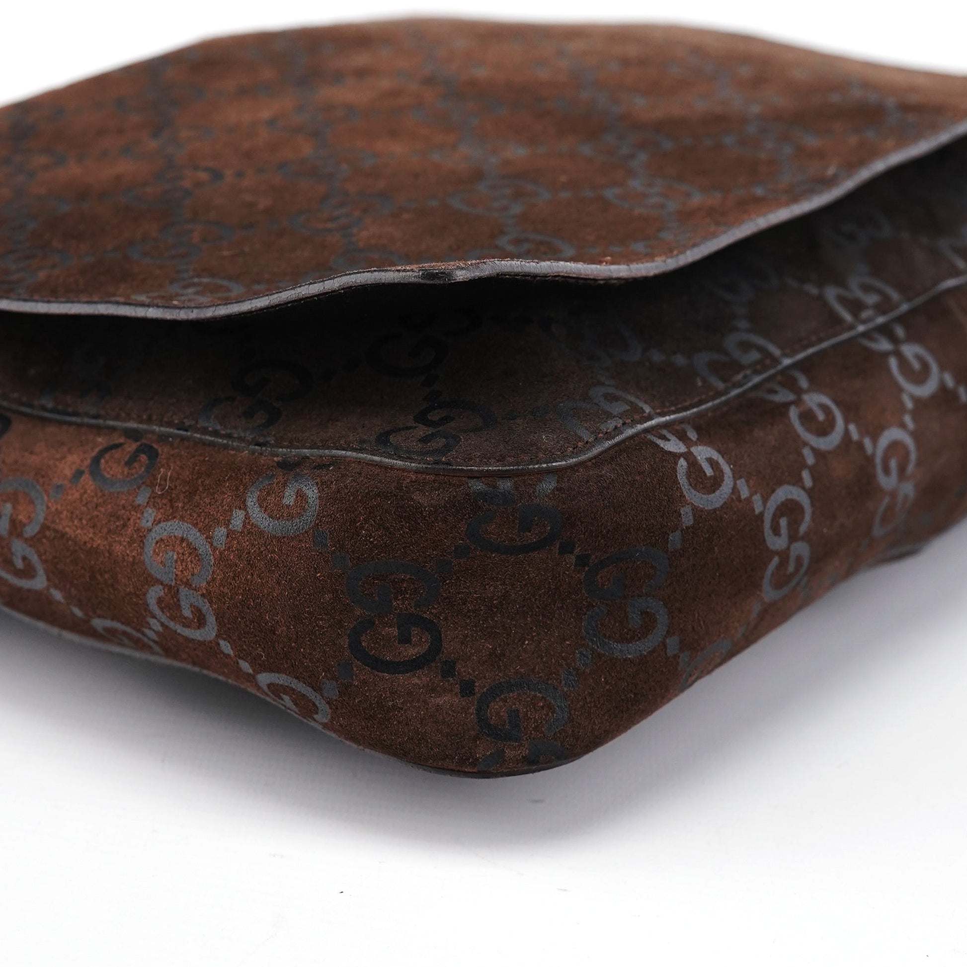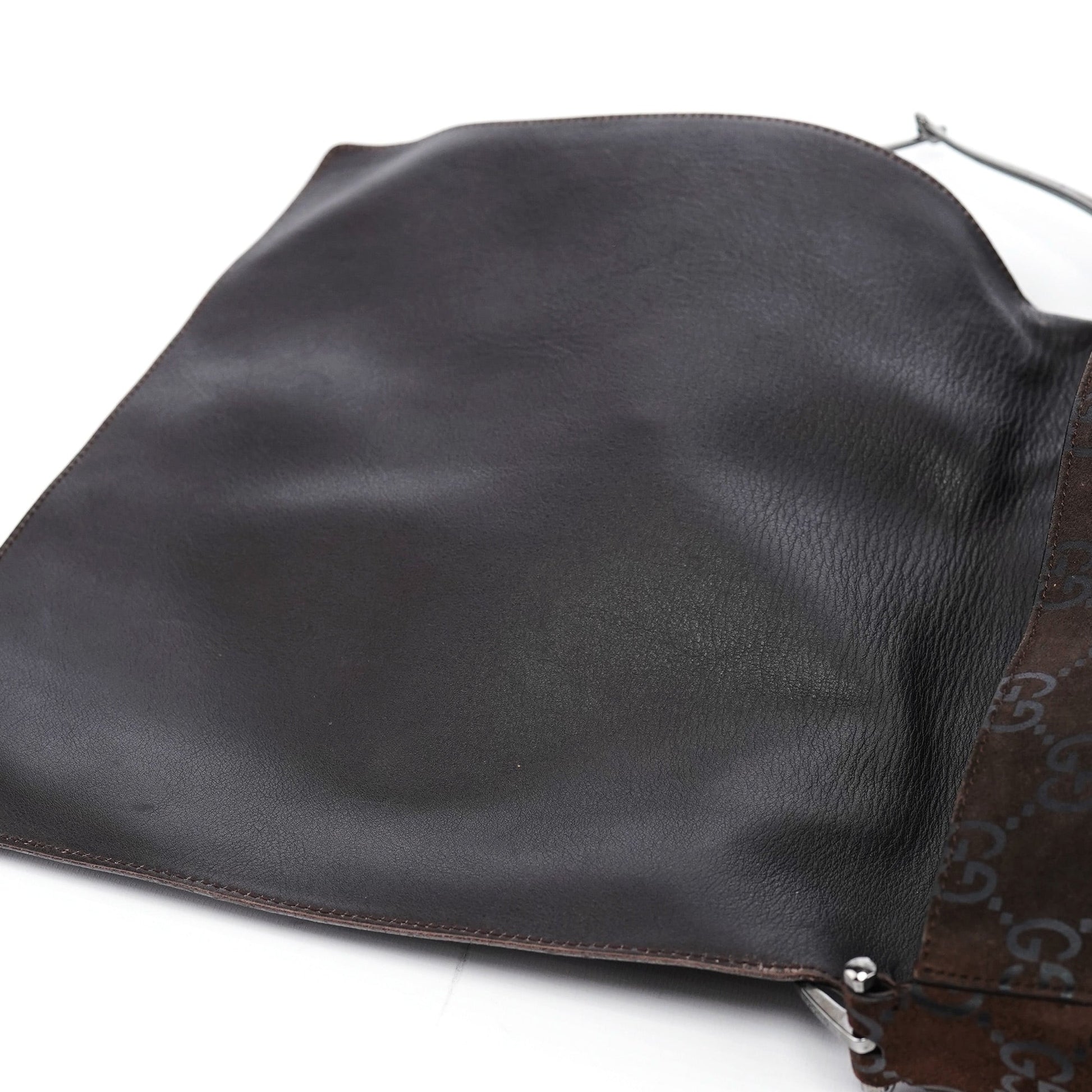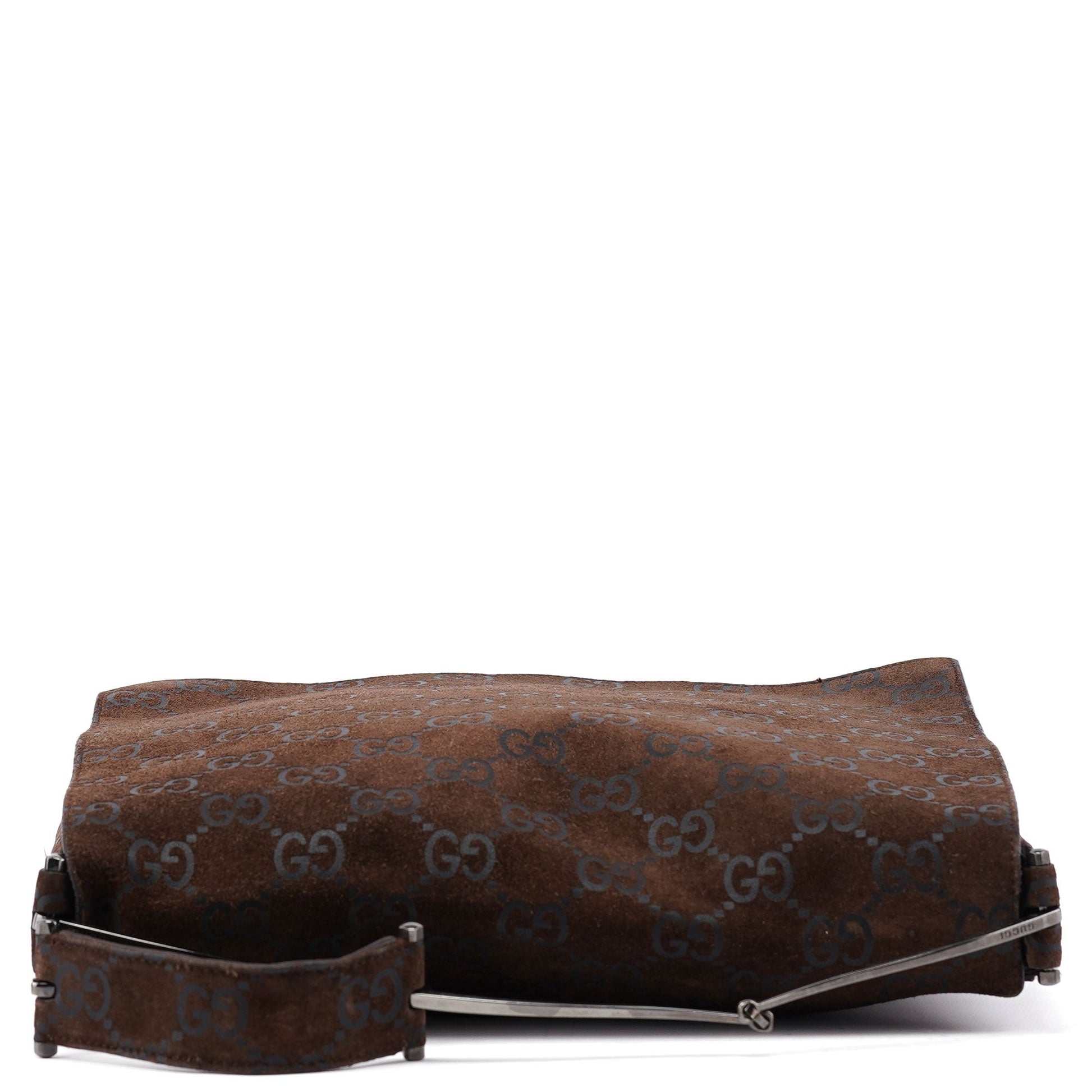 Designed by Tom Ford in 1997, this Gucci GG Horsebit shoulder bag is handcrafted from brown GG monogram suede with calfskin leather trim. It features a silver-tone Horsebit handle engraved with the Gucci logo, a classic flap closure, and a leather-lined interior, combining timeless elegance with practical sophistication.