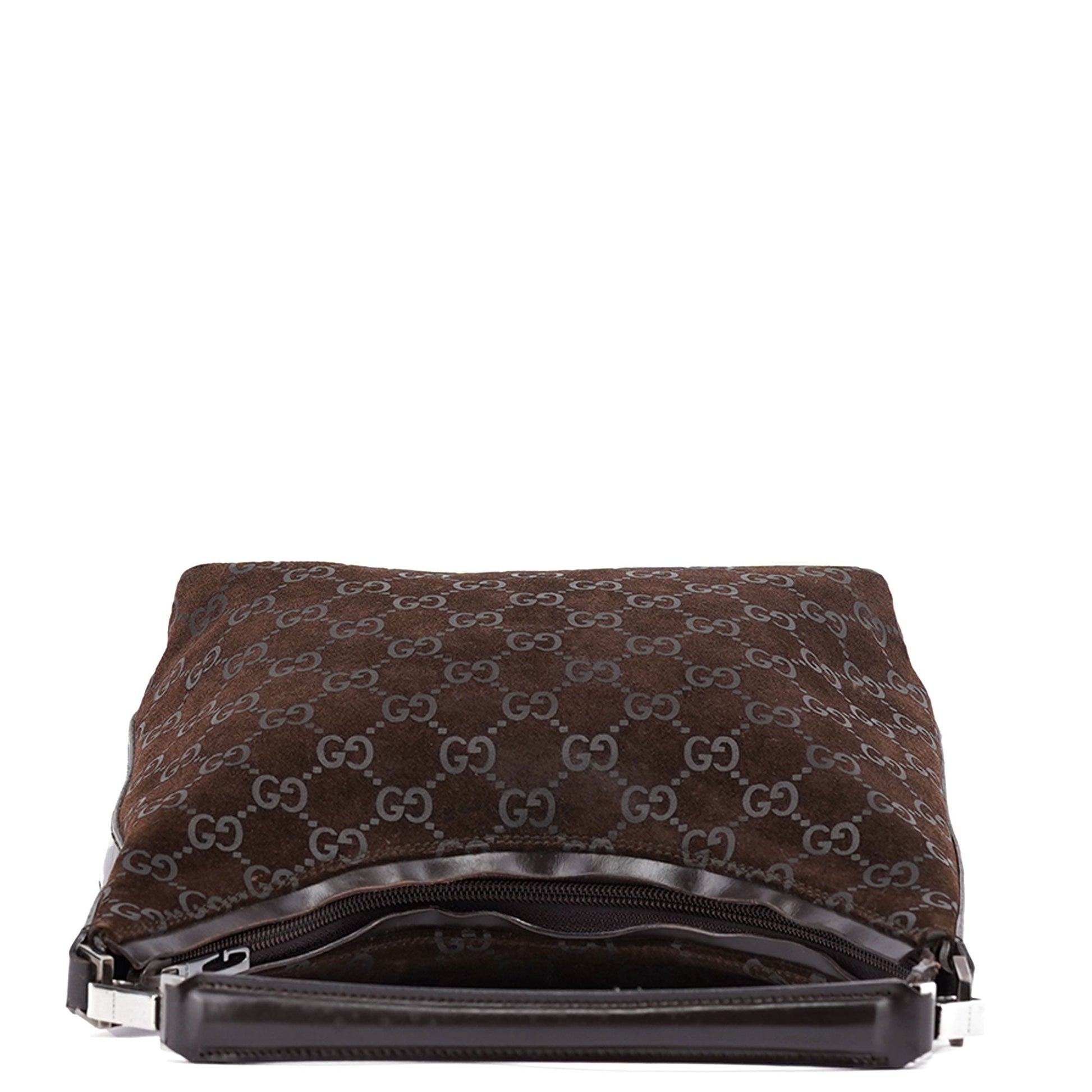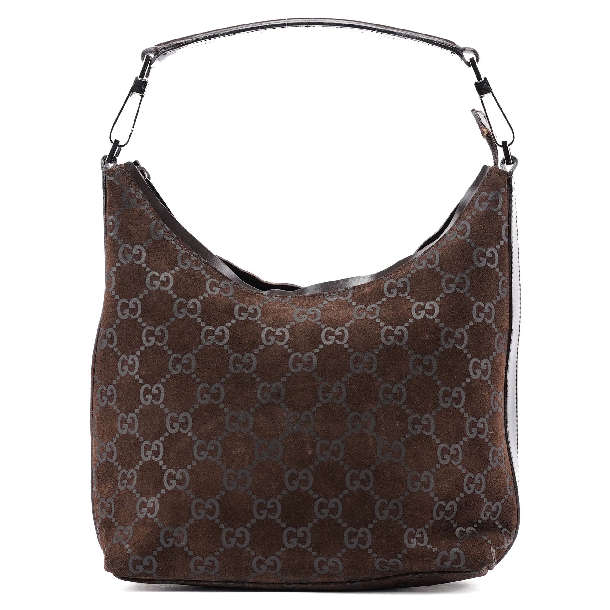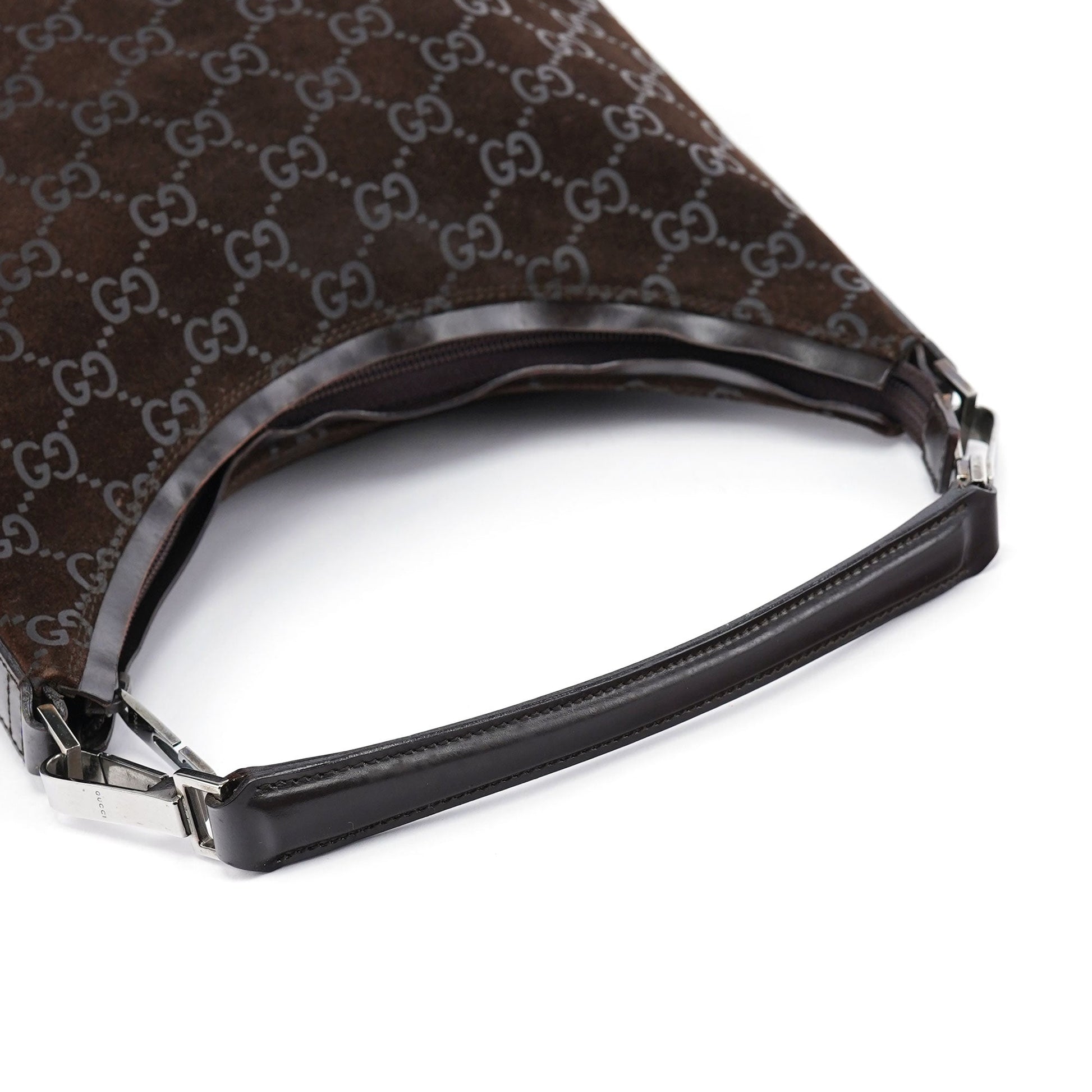 Designed by Tom Ford in 1997, the Gucci GG suede shoulder bag is handcrafted from brown GG monogram suede with tonal calfskin leather trim and silver-tone hardware engraved with the Gucci logo. A zipper closure secures the satin-lined interior, blending timeless elegance with practicality.