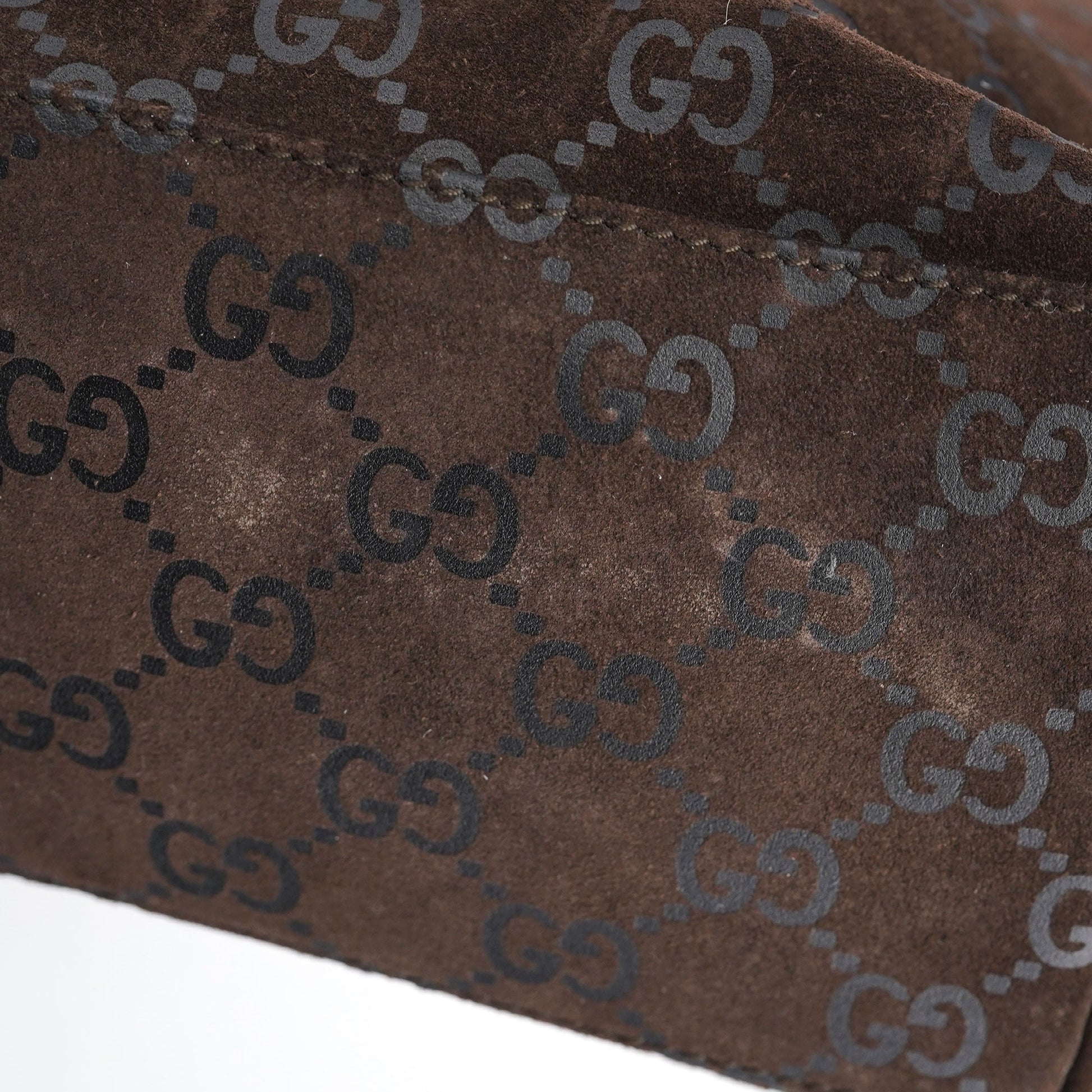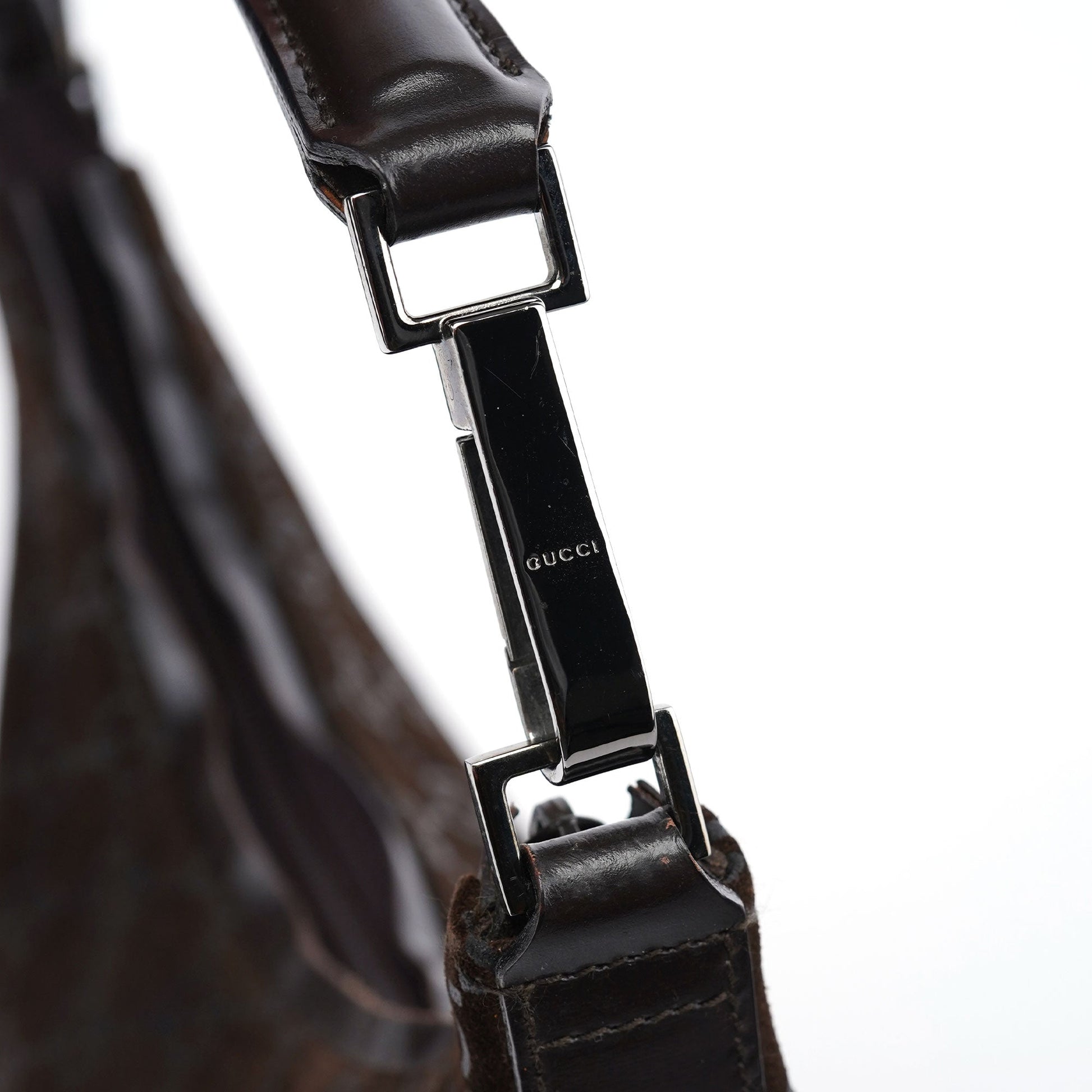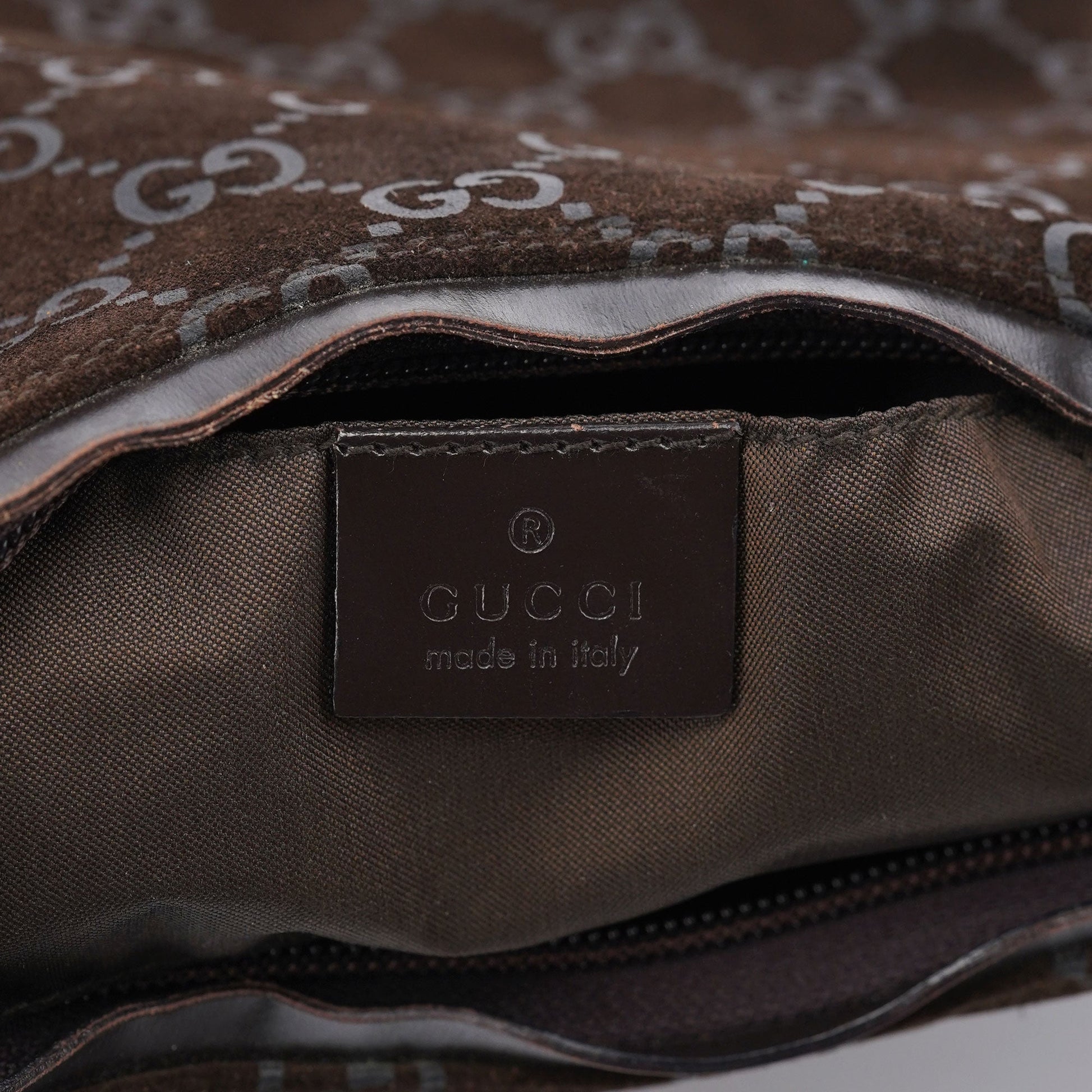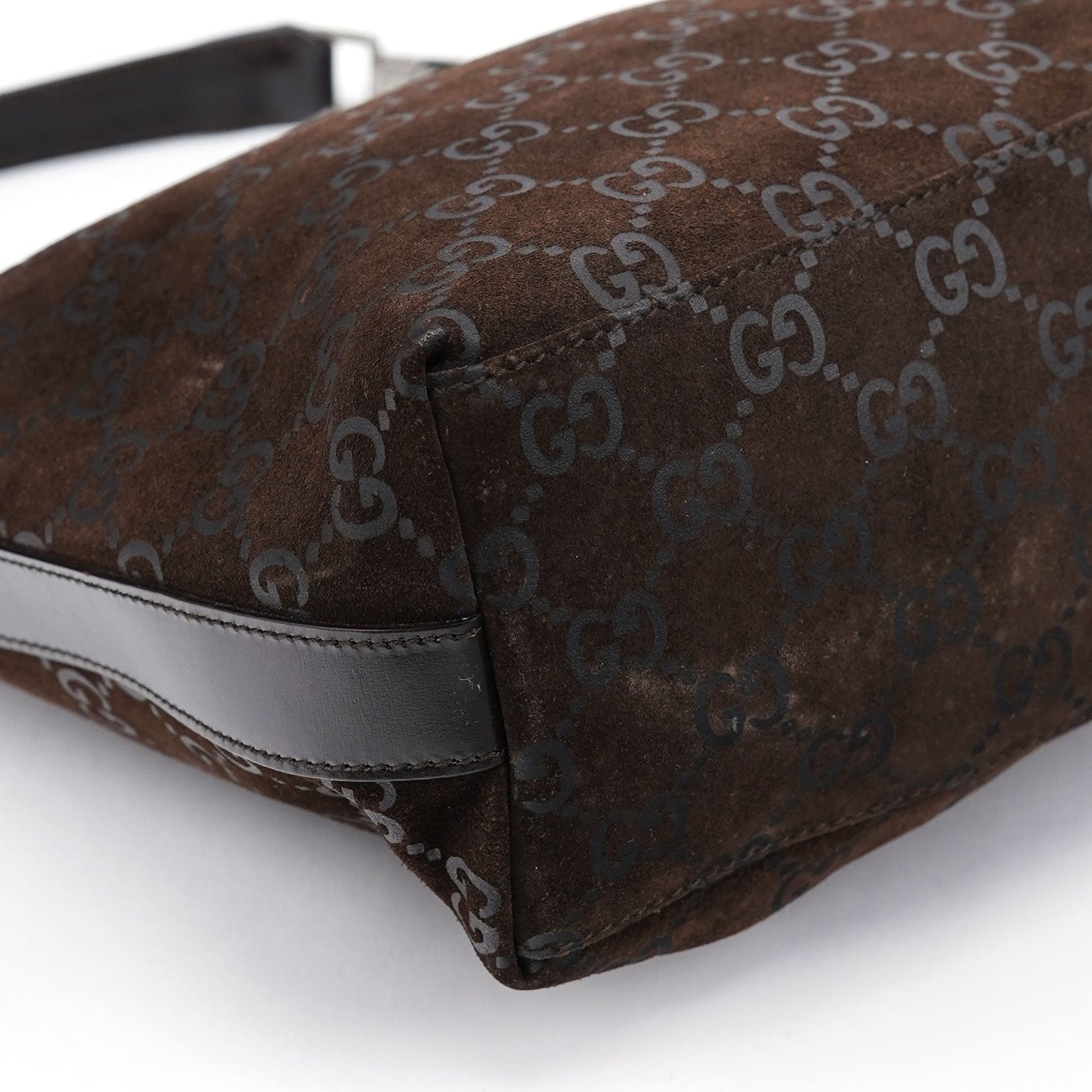 Designed by Tom Ford in 1997, the Gucci GG suede shoulder bag is handcrafted from brown GG monogram suede with tonal calfskin leather trim and silver-tone hardware engraved with the Gucci logo. A zipper closure secures the satin-lined interior, blending timeless elegance with practicality.