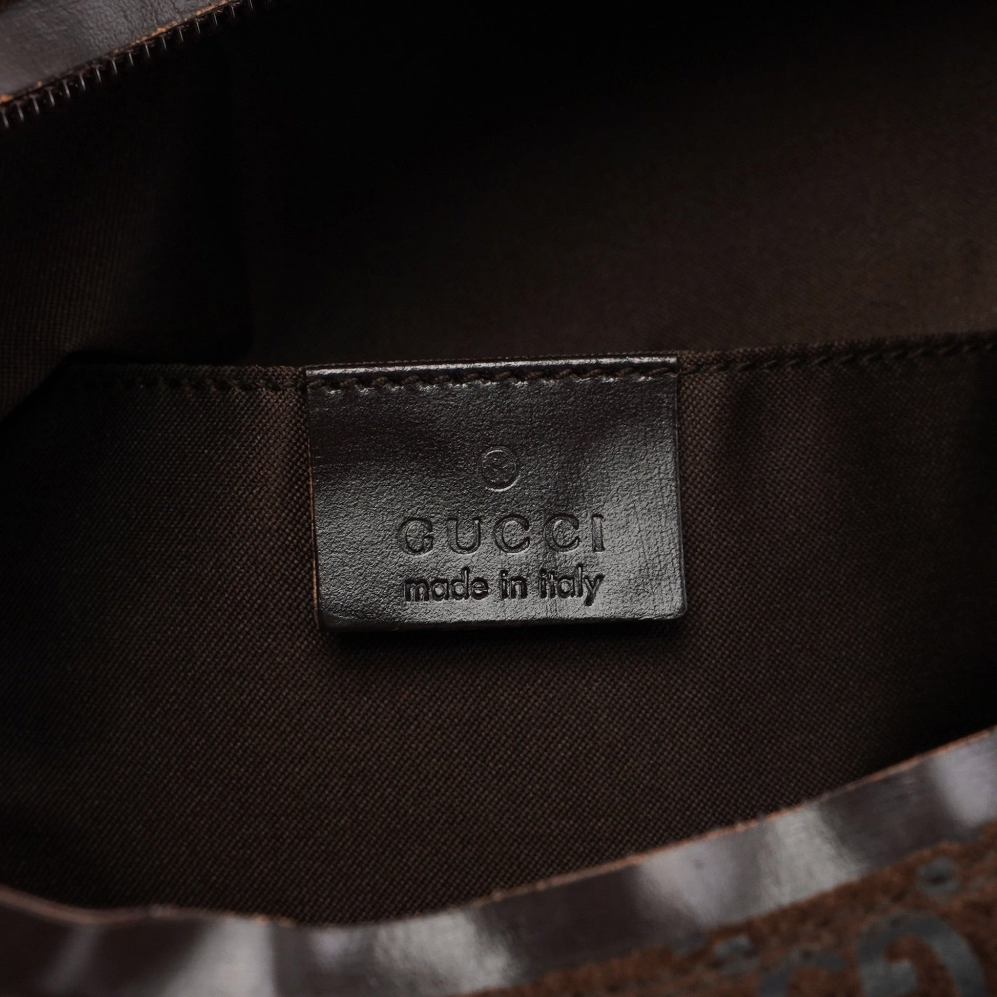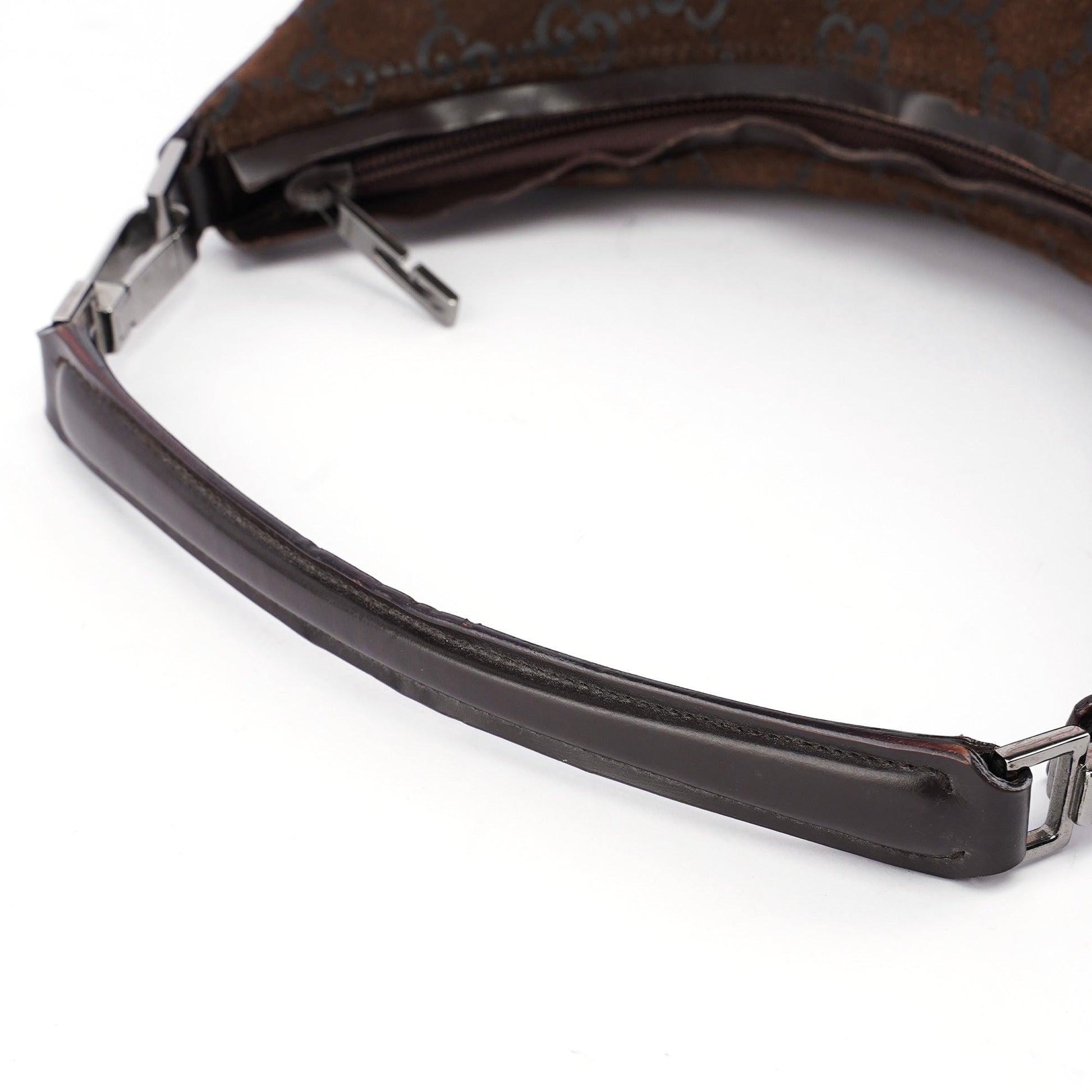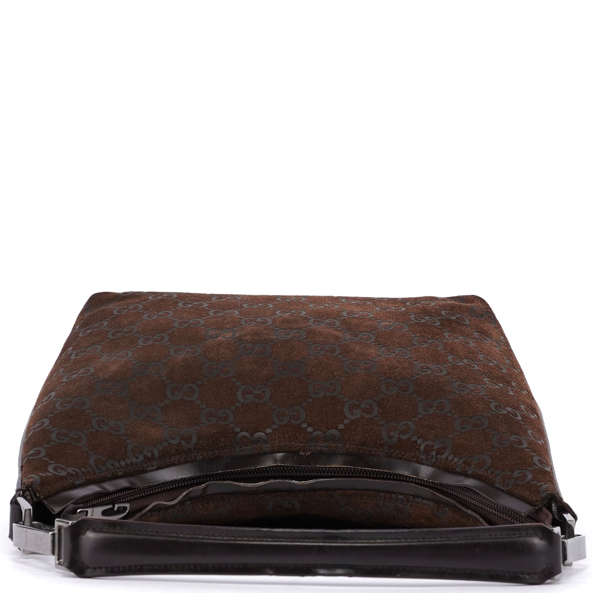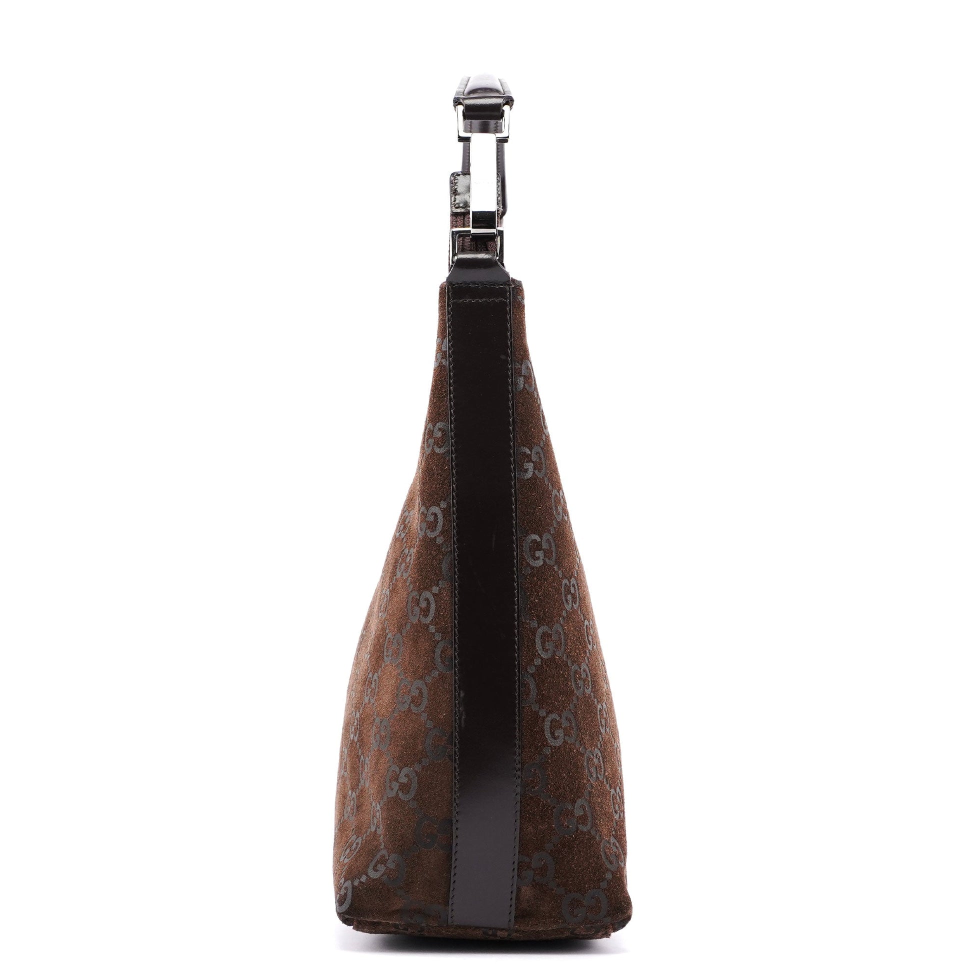 Unveil the elegance of the Gucci GG suede shoulder bag, designed by Tom Ford in 1997. This luxurious piece features silver-tone hardware with engraved Gucci logo, complemented by brown calfskin leather trim. A zipper closure secures the satin-lined interior, making it a perfect fusion of timeless design and modern sophistication.