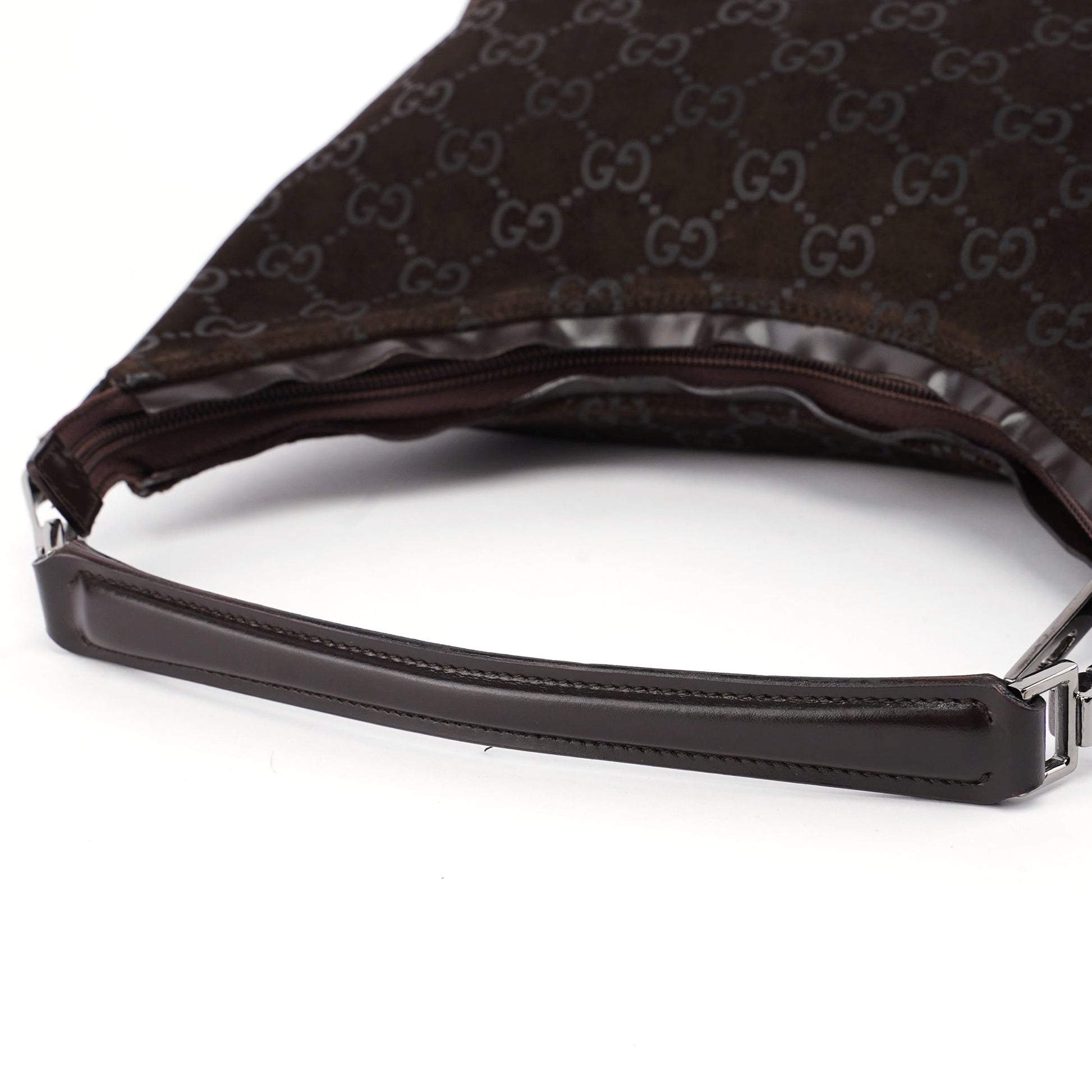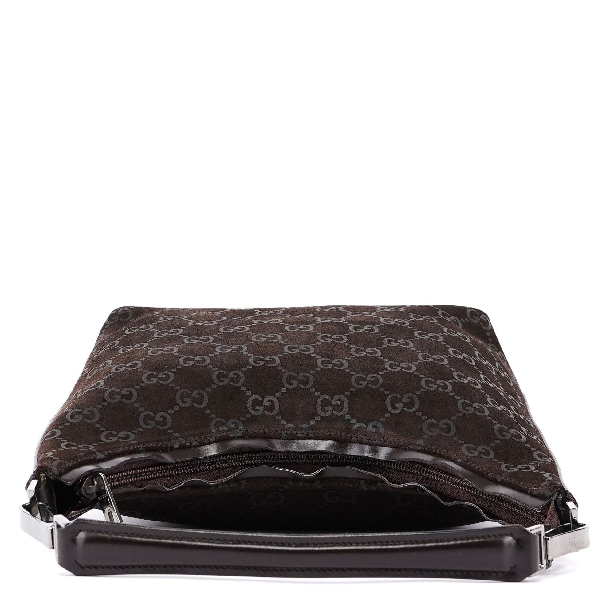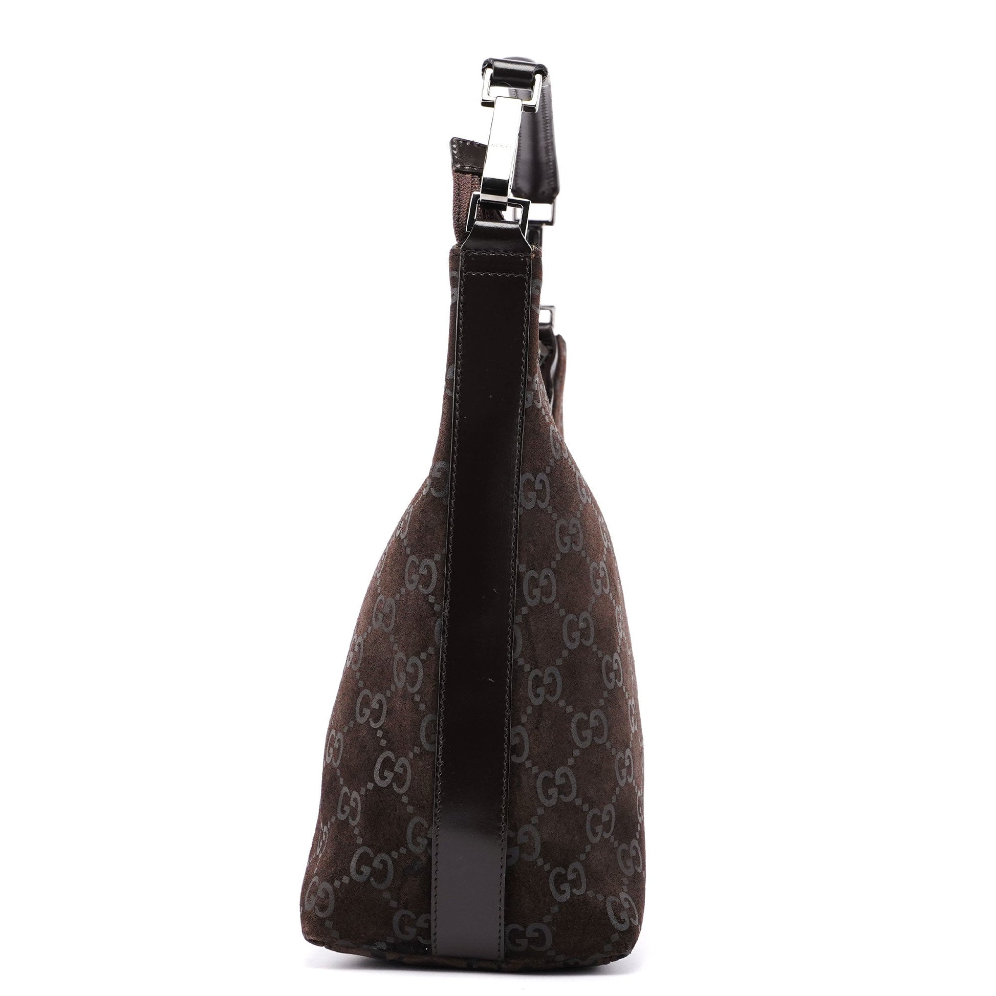 Designed by Tom Ford in 1997, the Gucci GG Suede shoulder bag exudes elegance. Handcrafted in brown GG monogram suede with calfskin leather trim and handle, it boasts silver-tone hardware engraved with the Gucci logo. The zipper closure opens to a satin-lined interior including an interior zipper pocket.