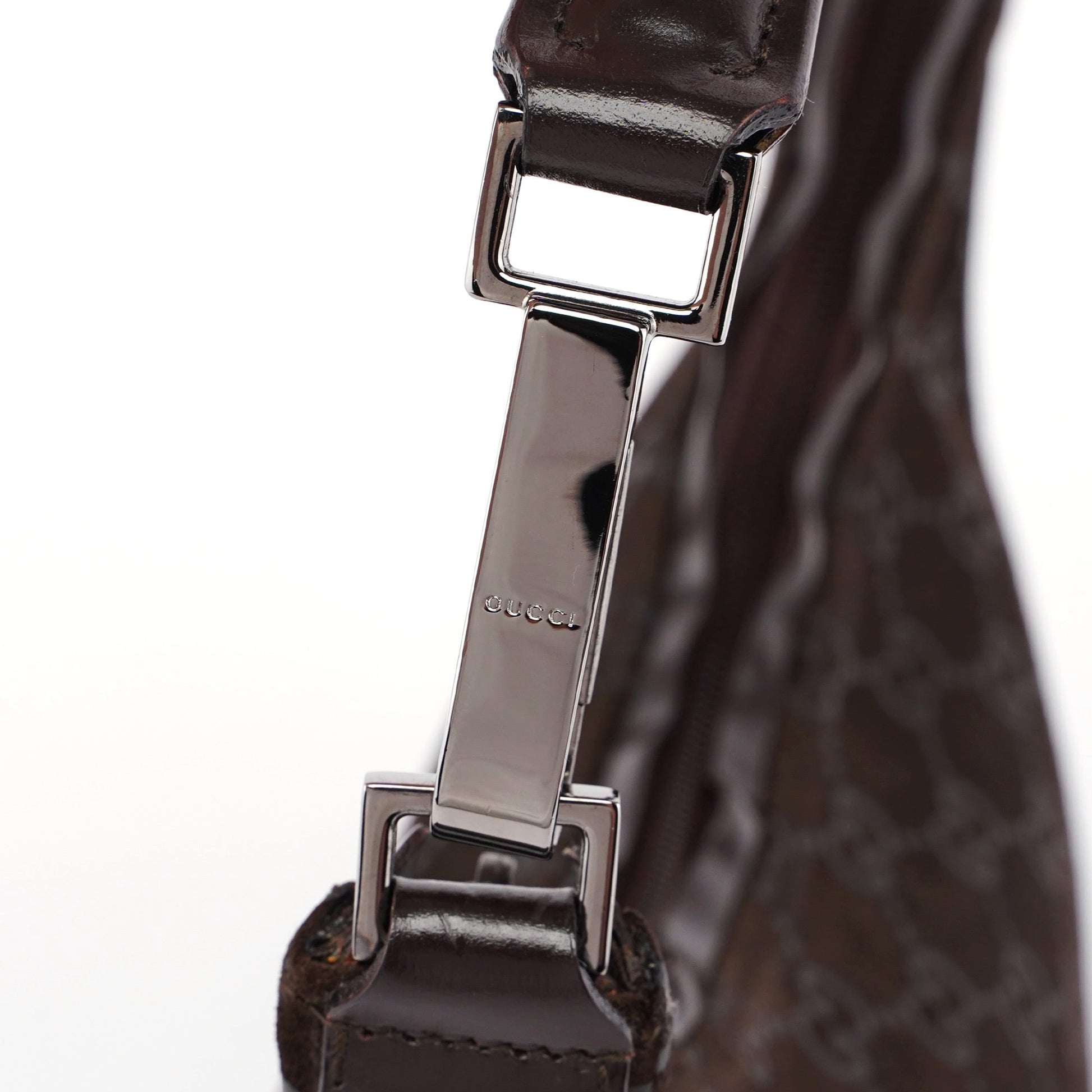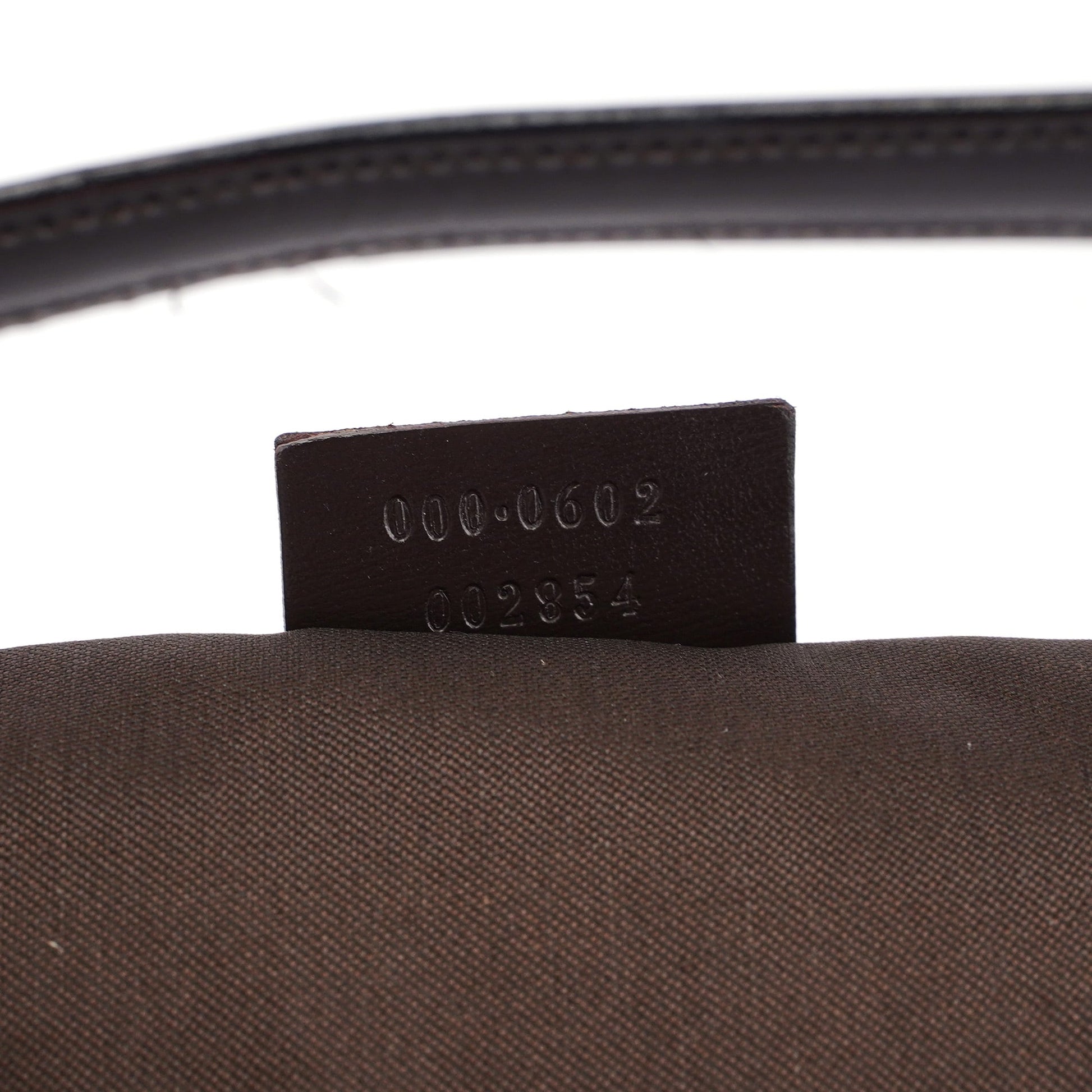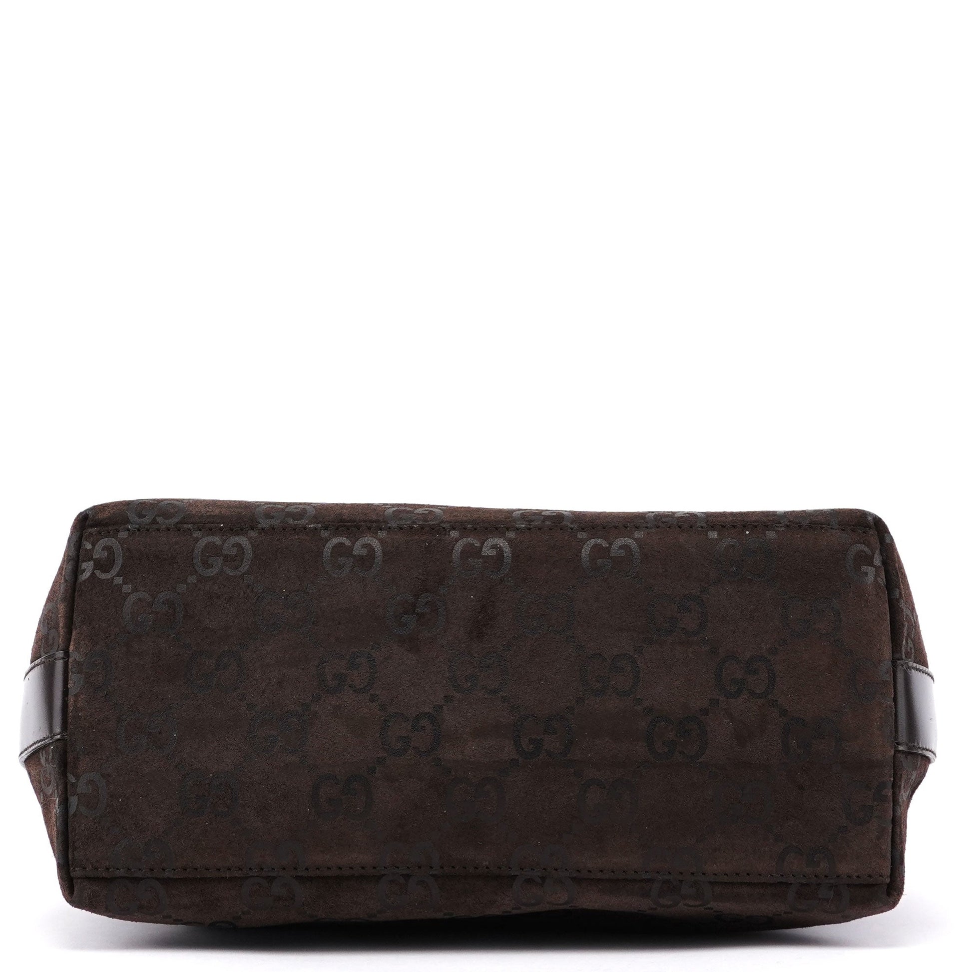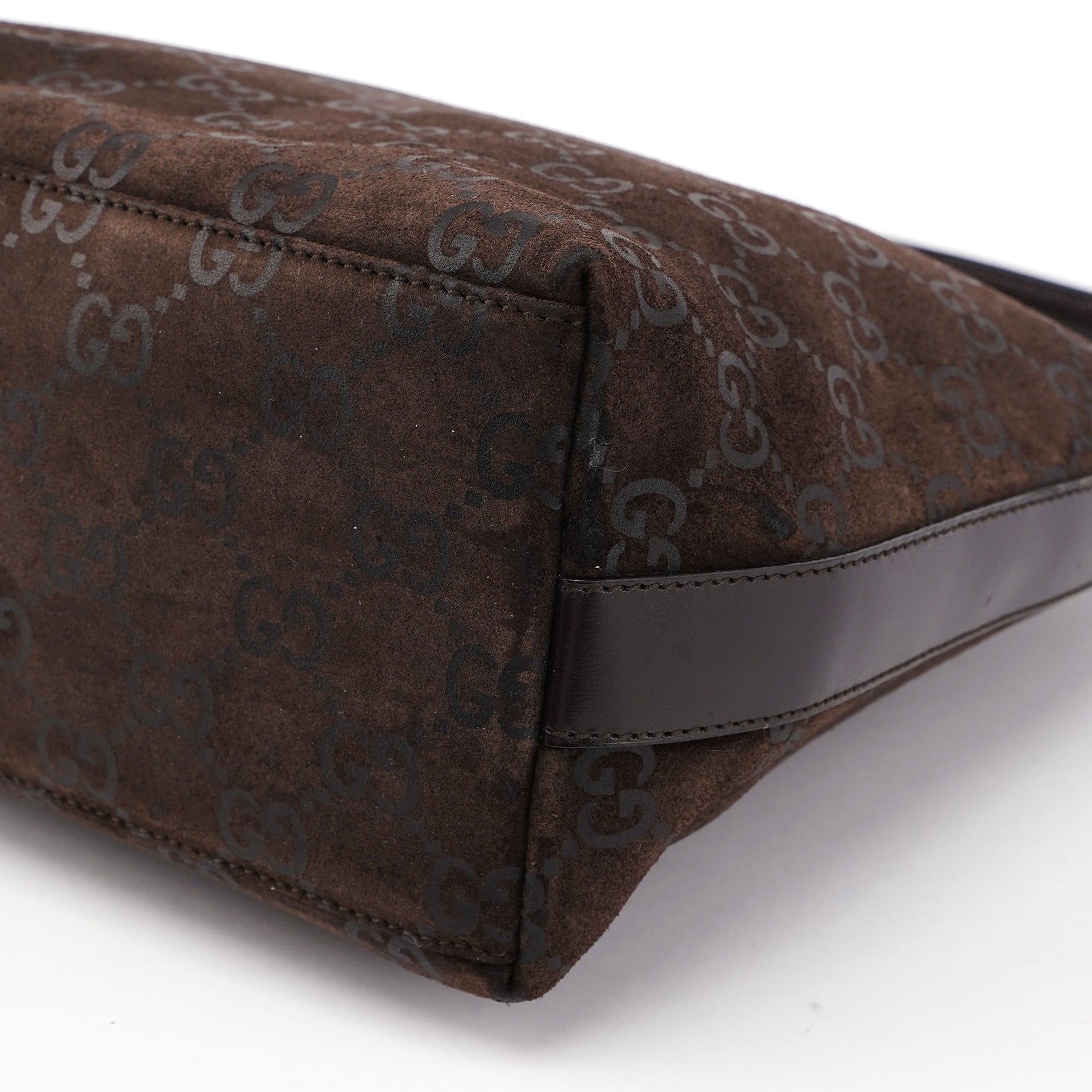Designed by Tom Ford in 1997, the Gucci GG Suede shoulder bag exudes elegance. Handcrafted in brown GG monogram suede with calfskin leather trim and handle, it boasts silver-tone hardware engraved with the Gucci logo. The zipper closure opens to a satin-lined interior including an interior zipper pocket.