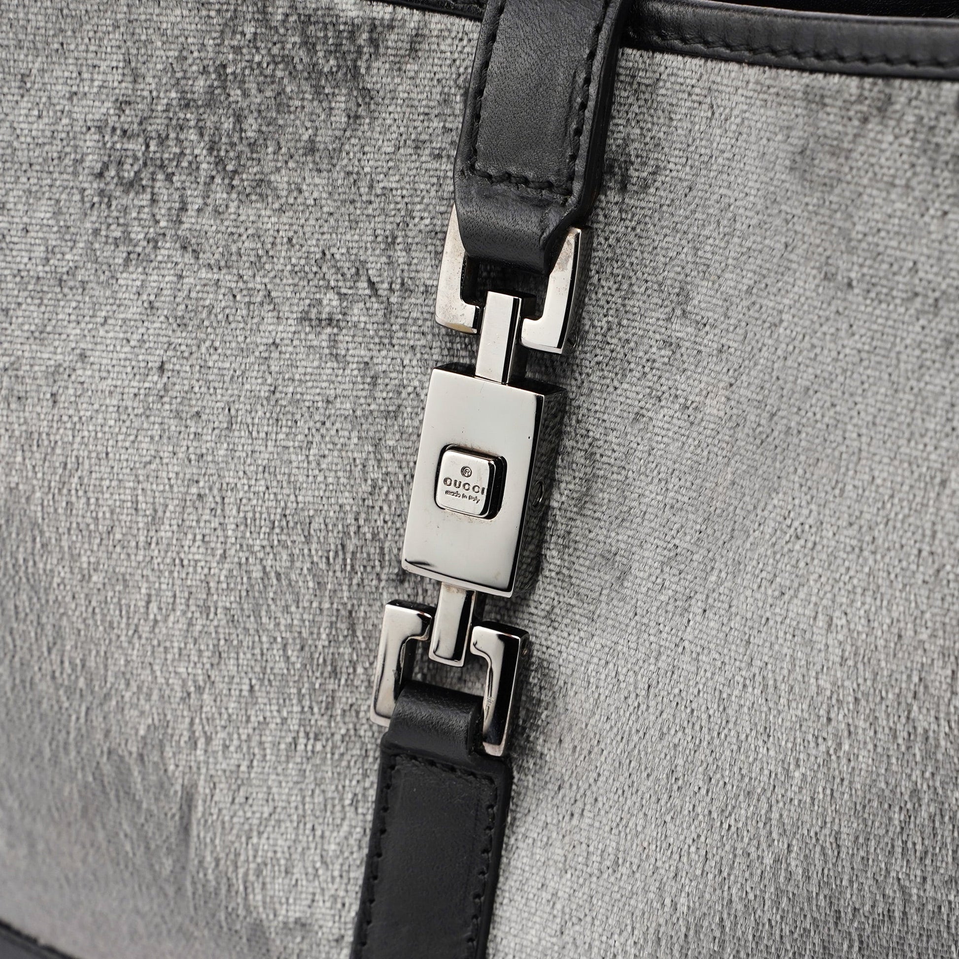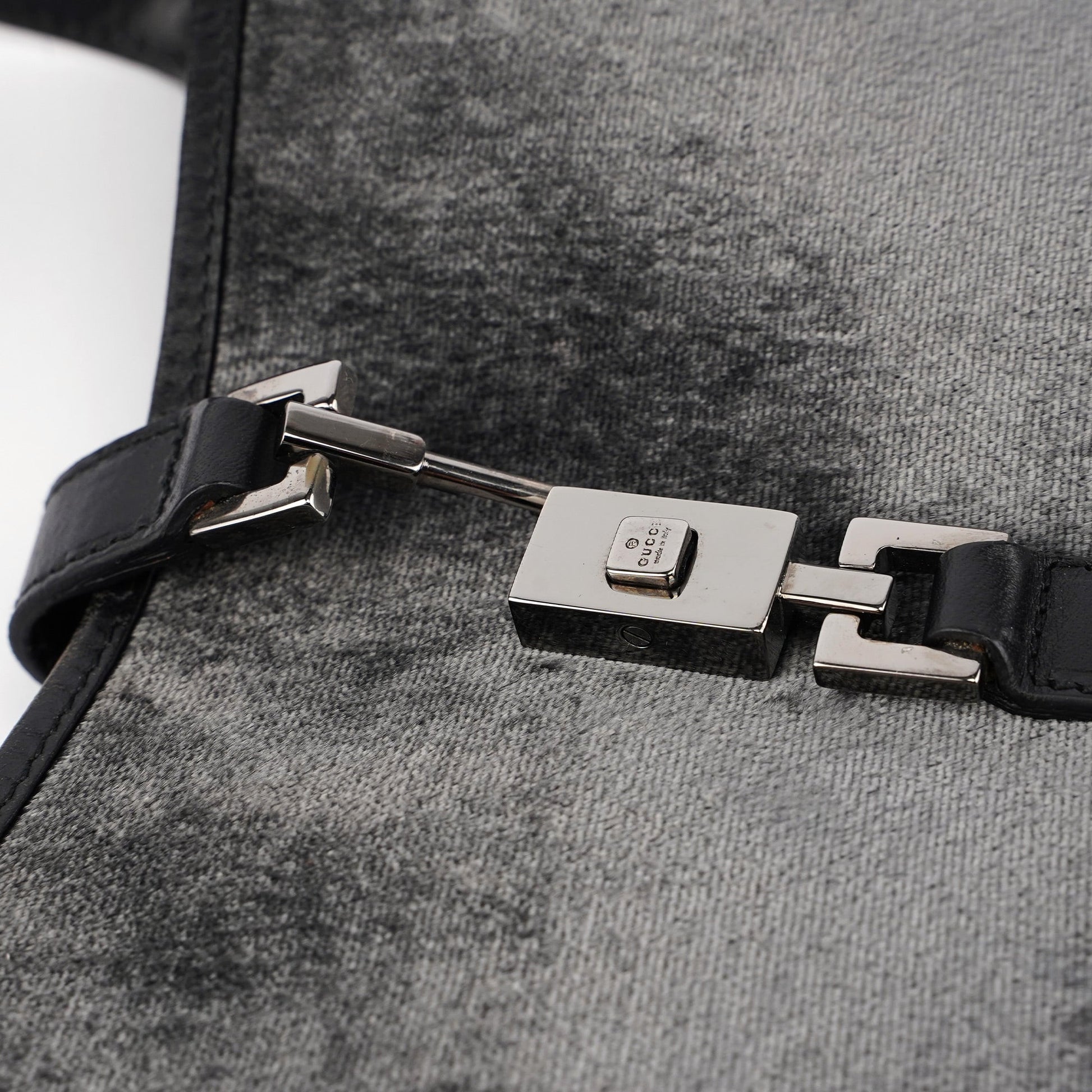 Explore the vintage Gucci Jackie shoulder bag, an iconic design by Tom Ford from the 1999 collection, now re-released and gaining popularity again. This luxurious piece is crafted in grey velvet with calfskin leather trim and features silver-tone hardware engraved with the Gucci logo. It boasts belt detailing on the handle and a classic Jackie-style closure. The interior is lined with satin and includes a zipper pocket. Incredibly rare in today’s market, especially in this condition, this bag is a true collector’s item.