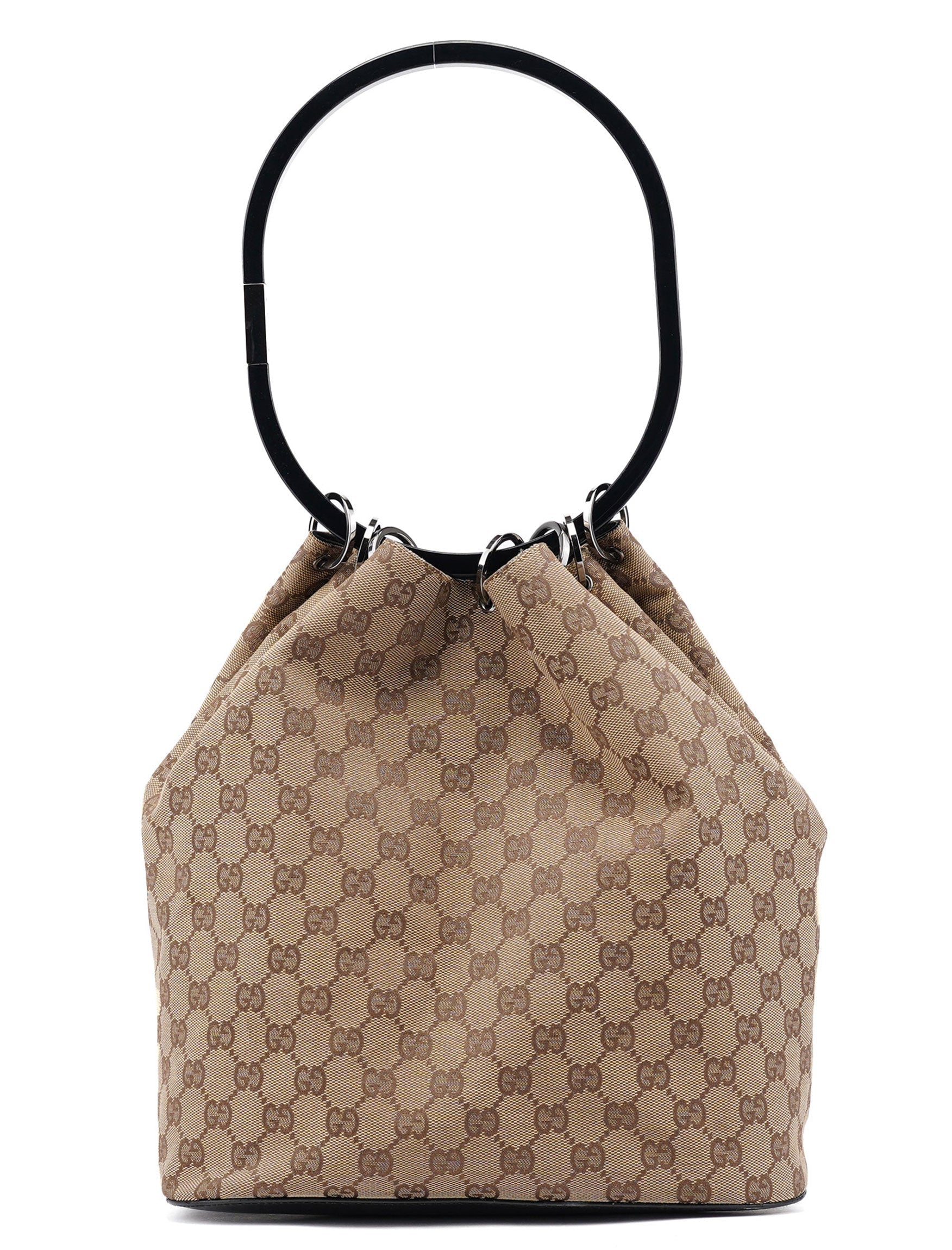 Designed by Tom Ford for the iconic 1999 collection, this incredibly rare Gucci GG Ring bag is handcrafted in the iconic GG beige monogram canvas with black patent leather trim and silver-tone hardware. It features a gloss black handle with Gucci logo engraving and a suede-lined interior with an interior zipper pocket.