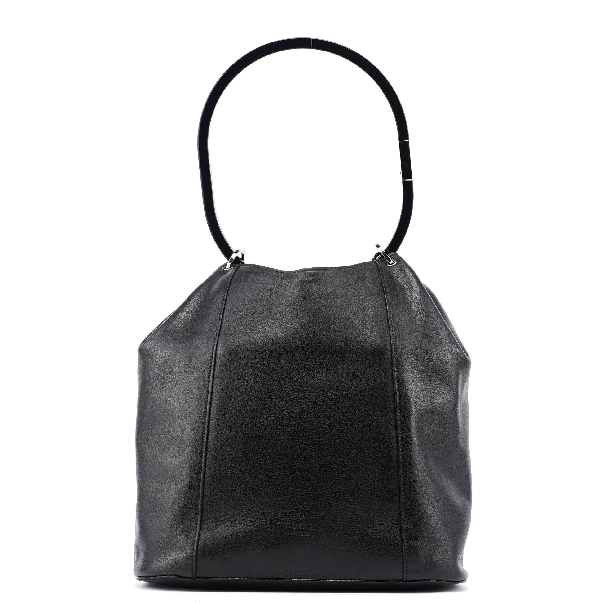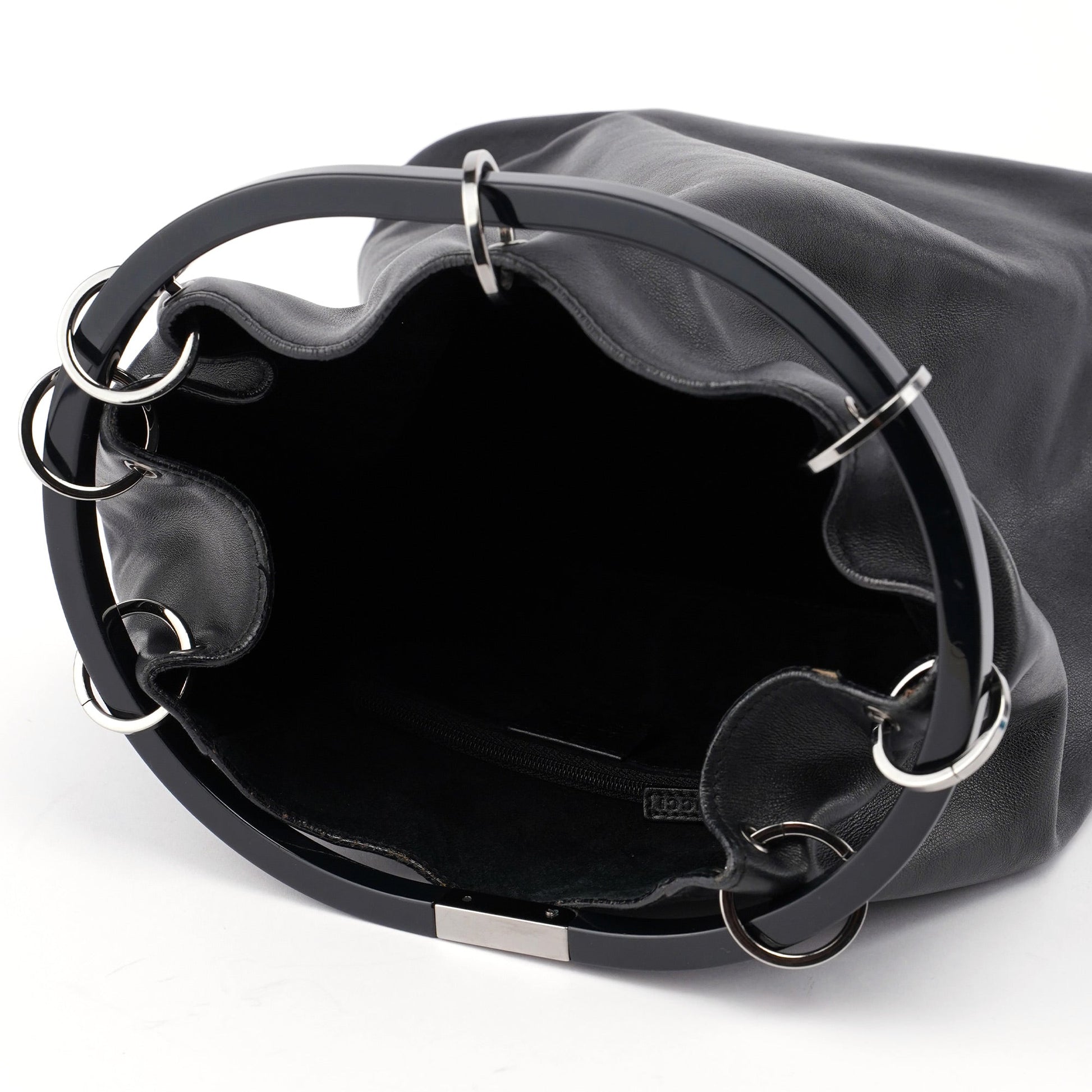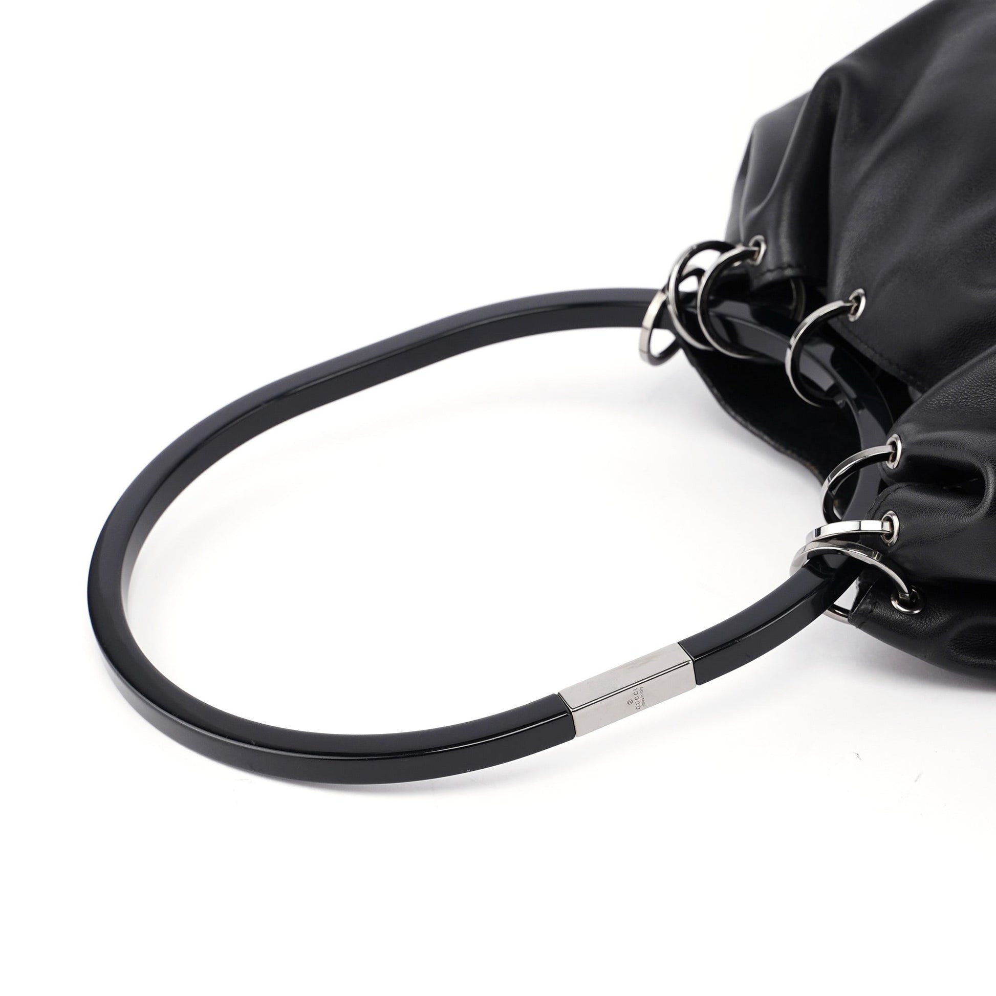 Handcrafted from black calfskin leather, this Gucci Ring bag by Tom Ford from 1999 features silver-tone hardware engraved with the Gucci logo, a plastic handle, and a suede-lined interior with an interior zipper pocket, showcasing timeless elegance.