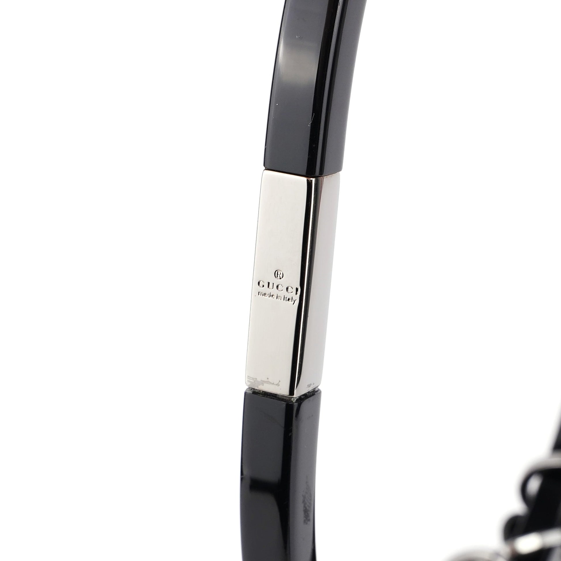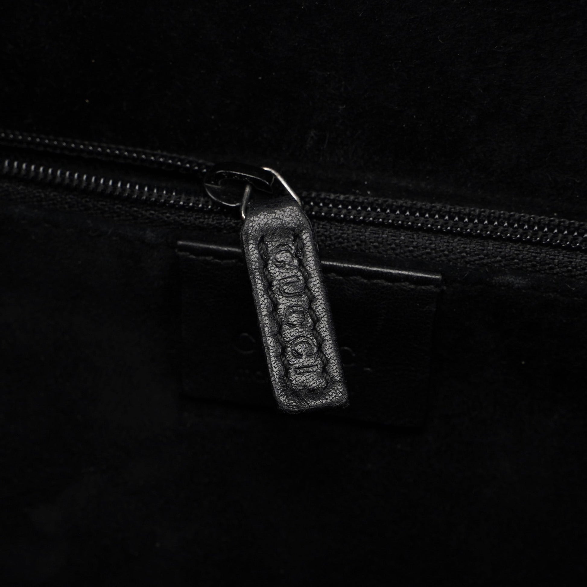 Discover the Gucci Ring bag from Tom Ford’s iconic 1999 collection. Crafted in black calfskin leather with silver-tone hardware, it features a gloss black ring handle engraved with the Gucci logo. The suede-lined interior includes a zipper pocket, and the front is embossed with the Gucci logo, embodying luxury and iconic design.