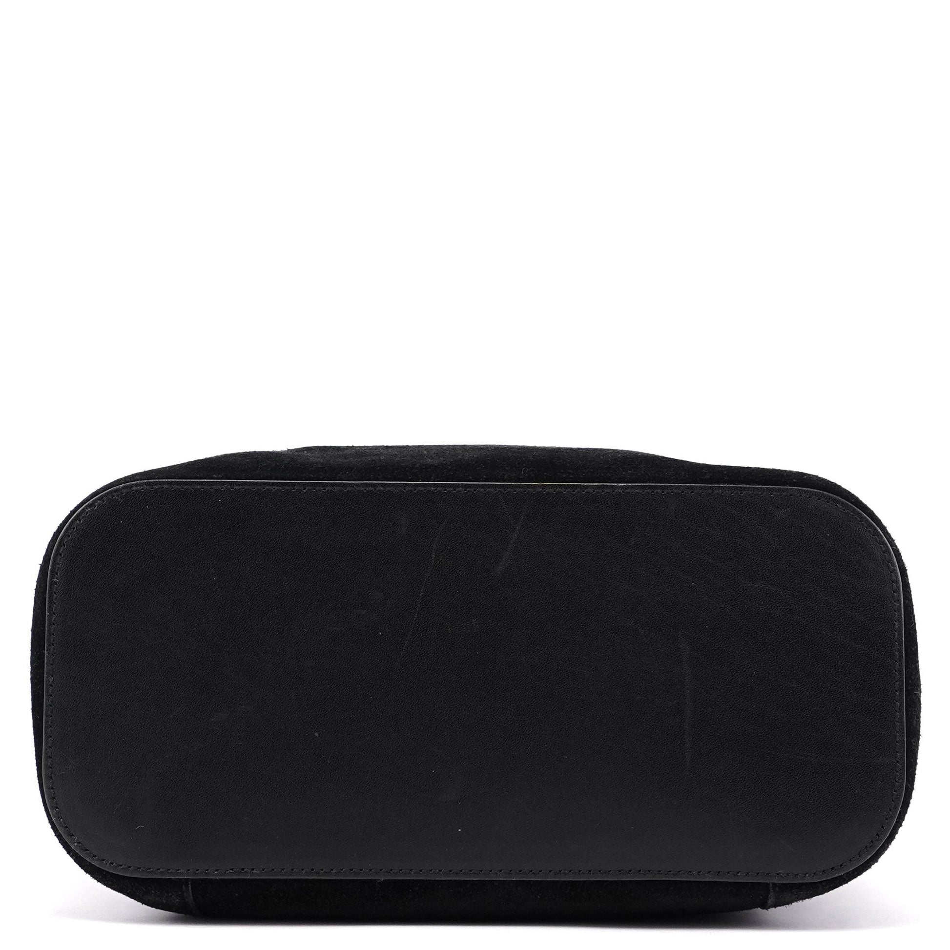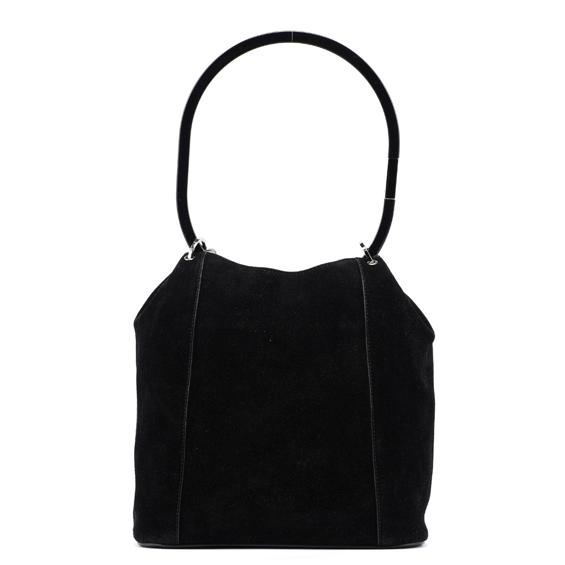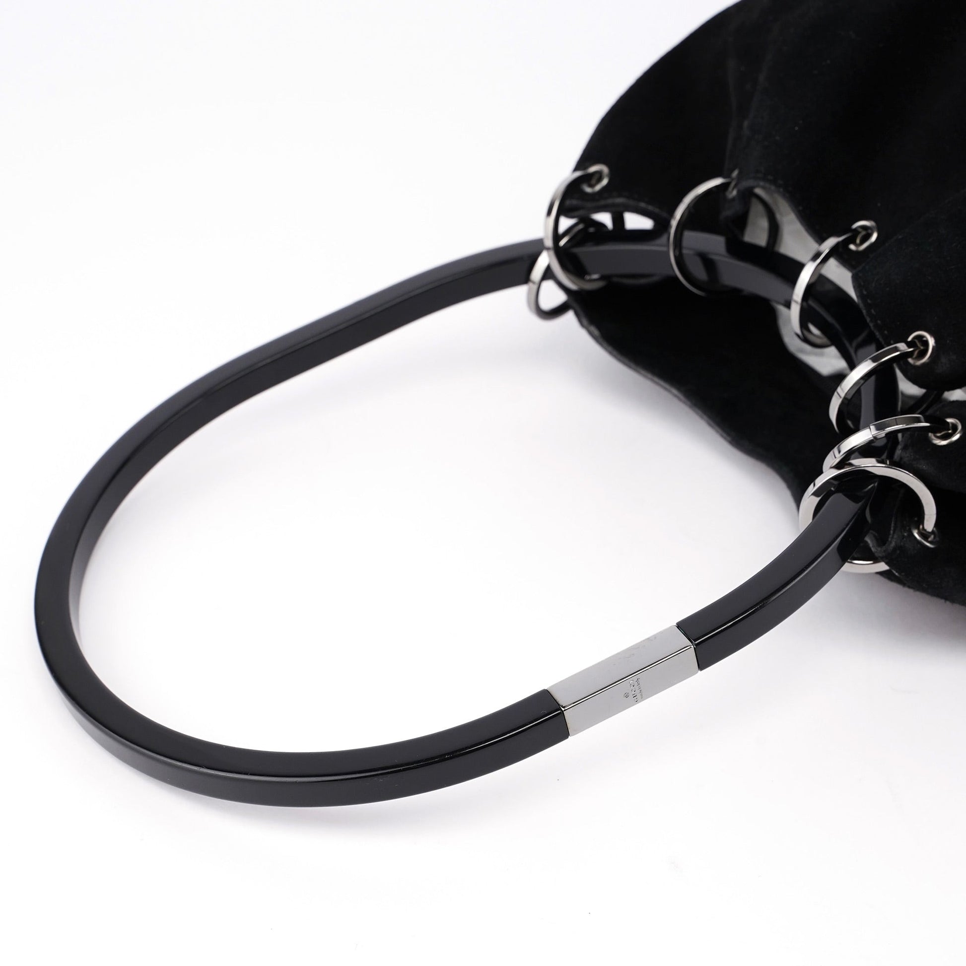 Handcrafted from luxurious black suede with tonal calfskin leather trim, this Gucci Ring bag by Tom Ford from 1999 features silver-tone hardware engraved with the Gucci logo, a plastic handle, and a suede-lined interior with an interior zipper pocket, showcasing timeless elegance. The Gucci logo is embossed at the front, adding a signature touch.