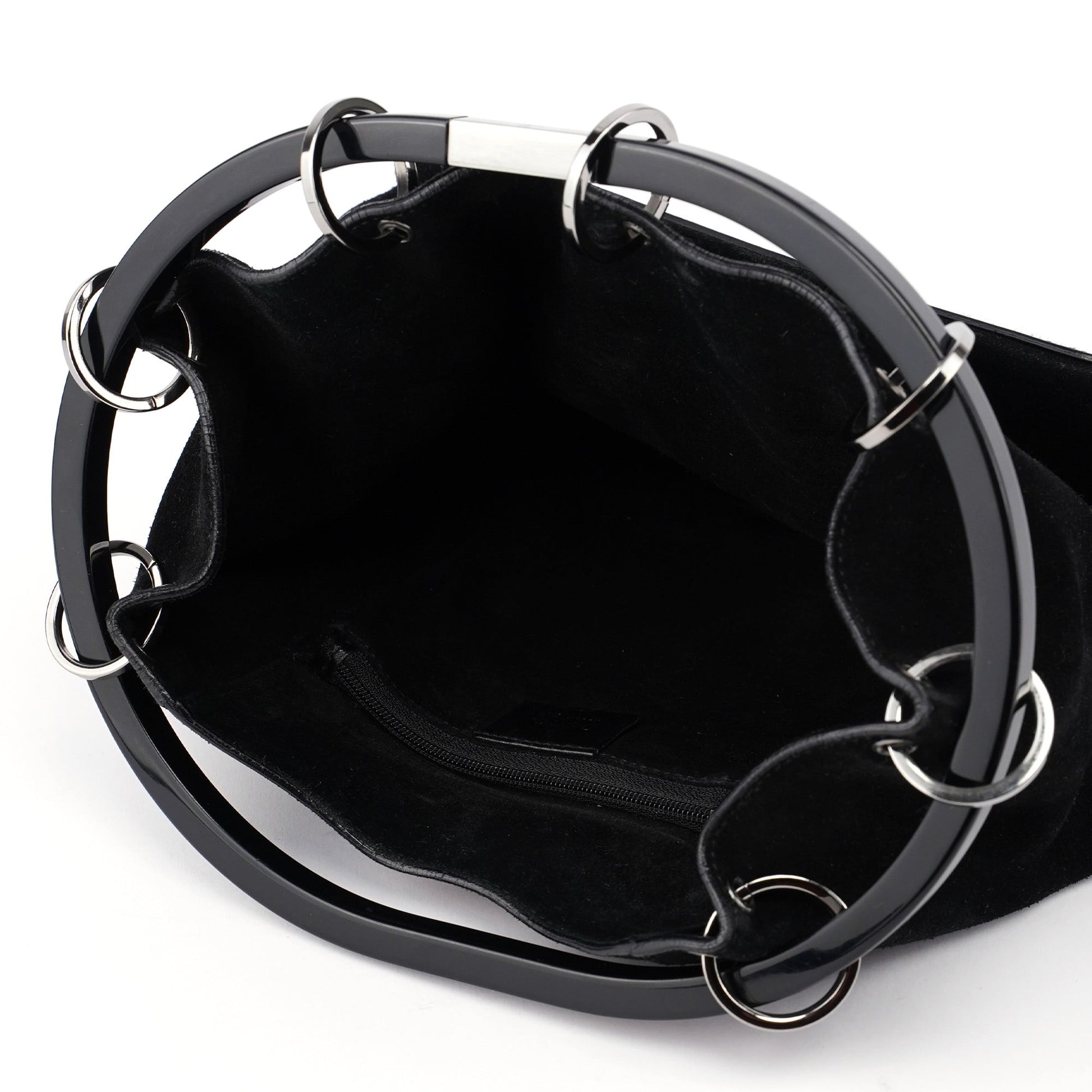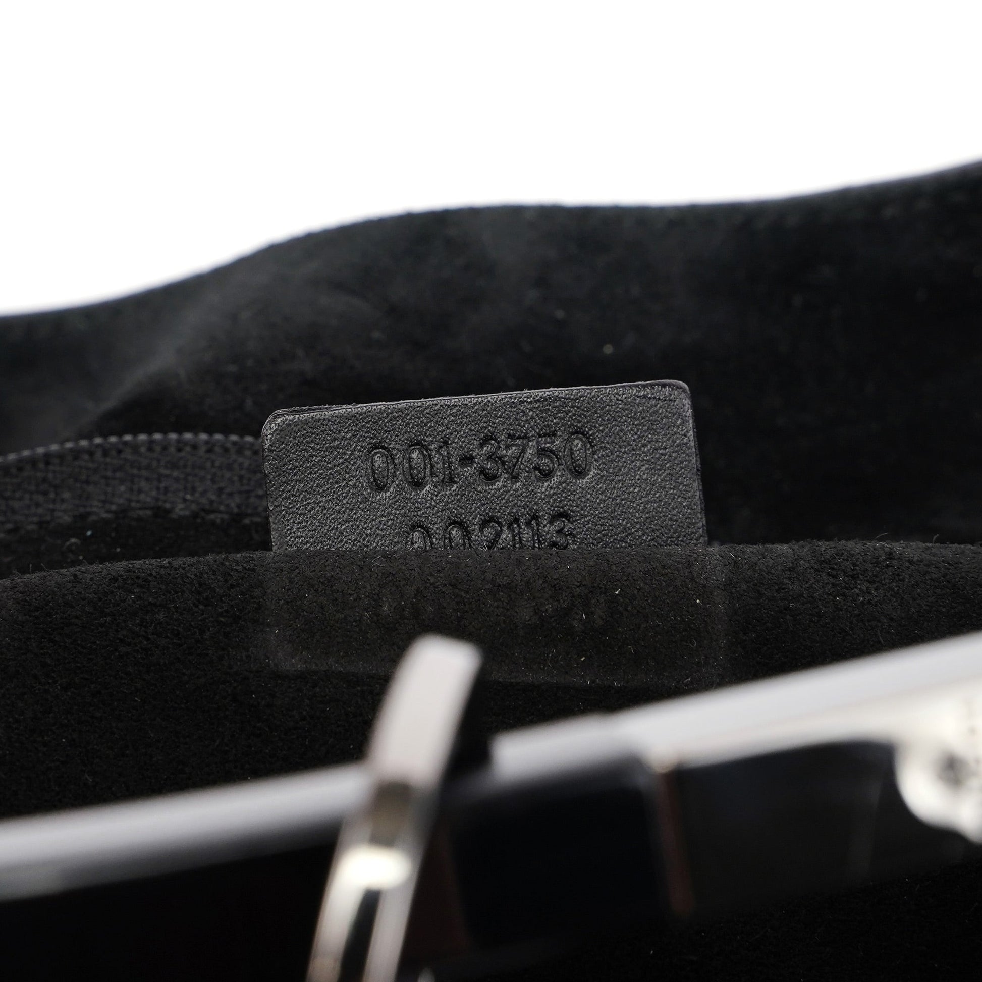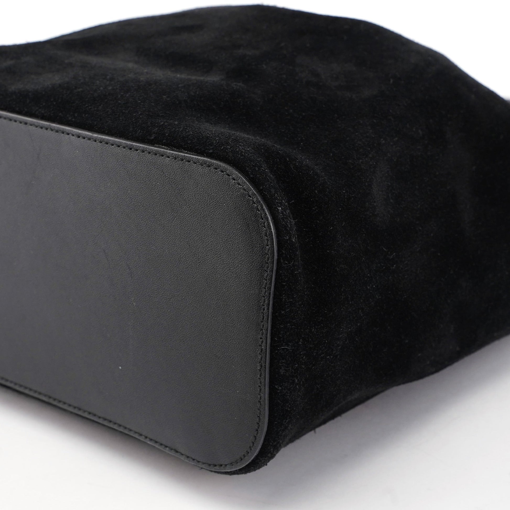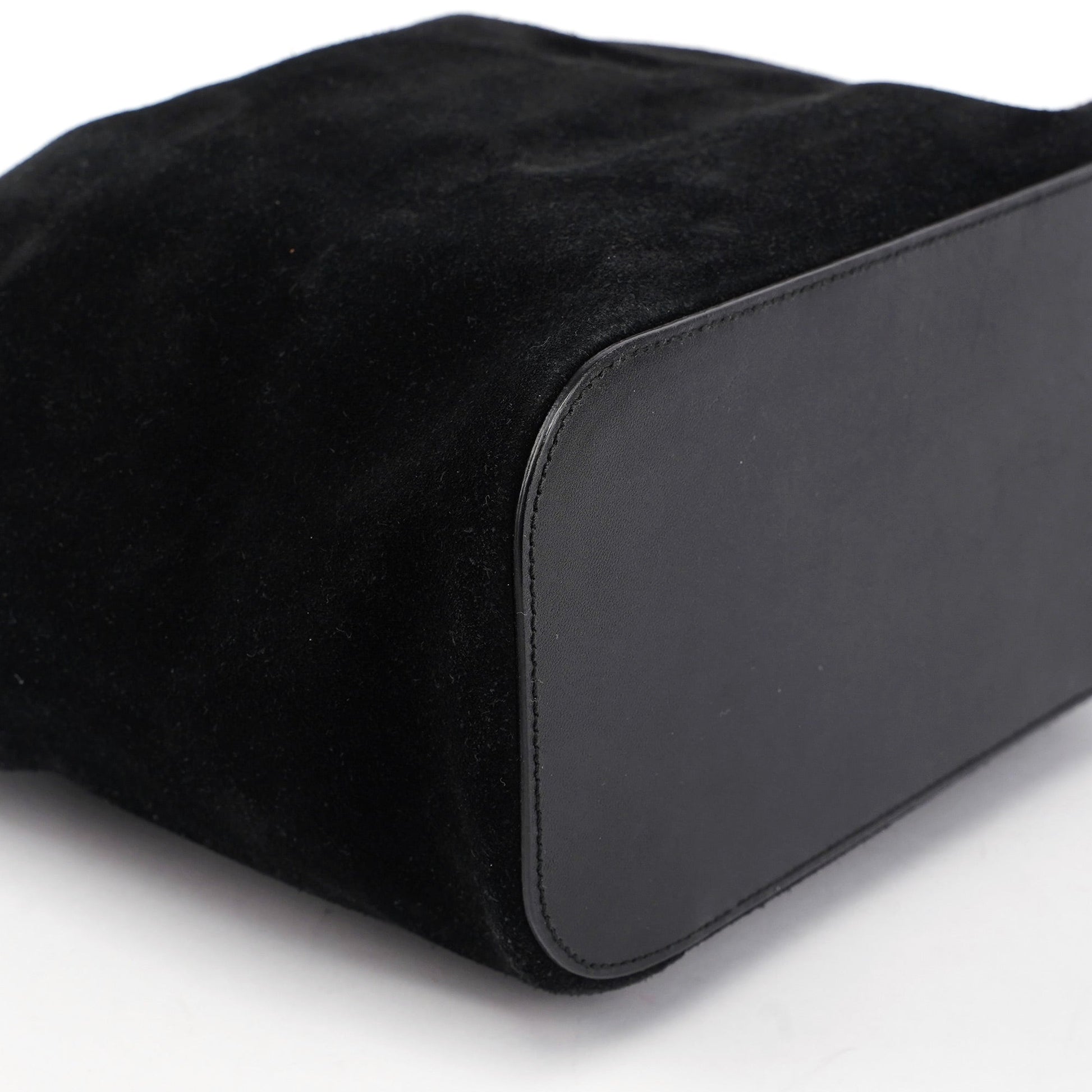 Handcrafted from luxurious black suede with tonal calfskin leather trim, this Gucci Ring bag by Tom Ford from 1999 features silver-tone hardware engraved with the Gucci logo, a plastic handle, and a suede-lined interior with an interior zipper pocket, showcasing timeless elegance. The Gucci logo is embossed at the front, adding a signature touch.