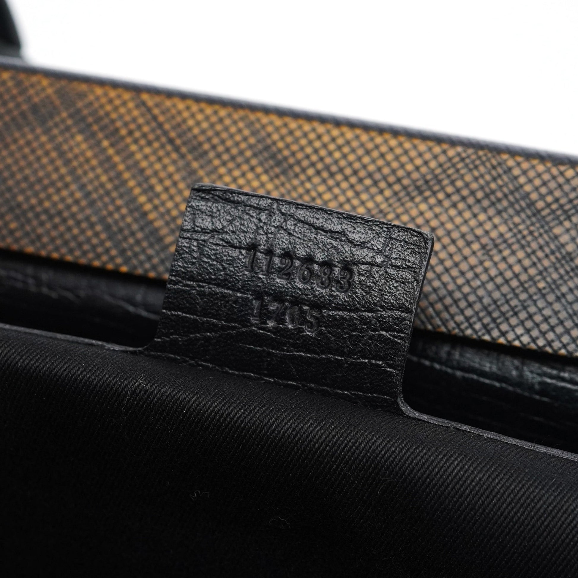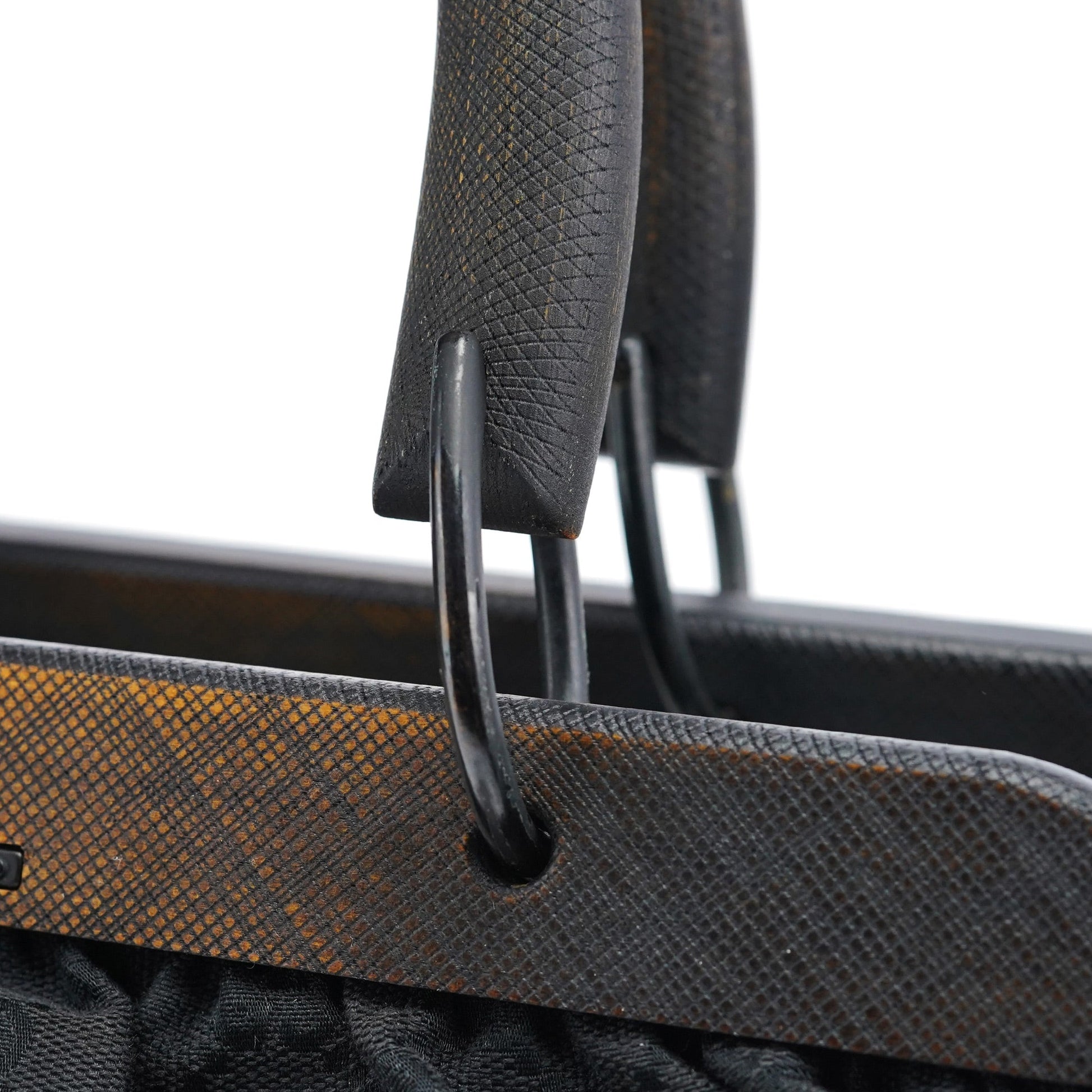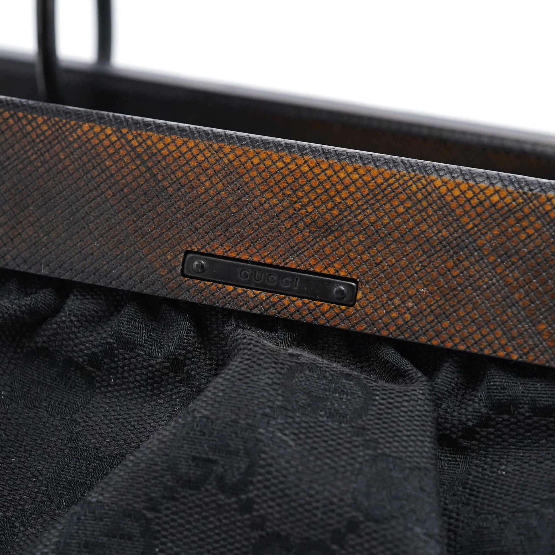 From Tom Ford’s legendary Fall 2002 collection, this Gucci GG doctor bag is a standout piece crafted in black GG monogram canvas with textured black leather trim. It features wooden handles, matte black hardware, and a discreet Gucci logo plaque that subtly nods to the brand’s heritage. The cotton-lined interior includes a zipper pocket for easy organization, blending functionality with Ford’s signature style. A true collector’s item, famously showcased on the Fall 2002 runway.
