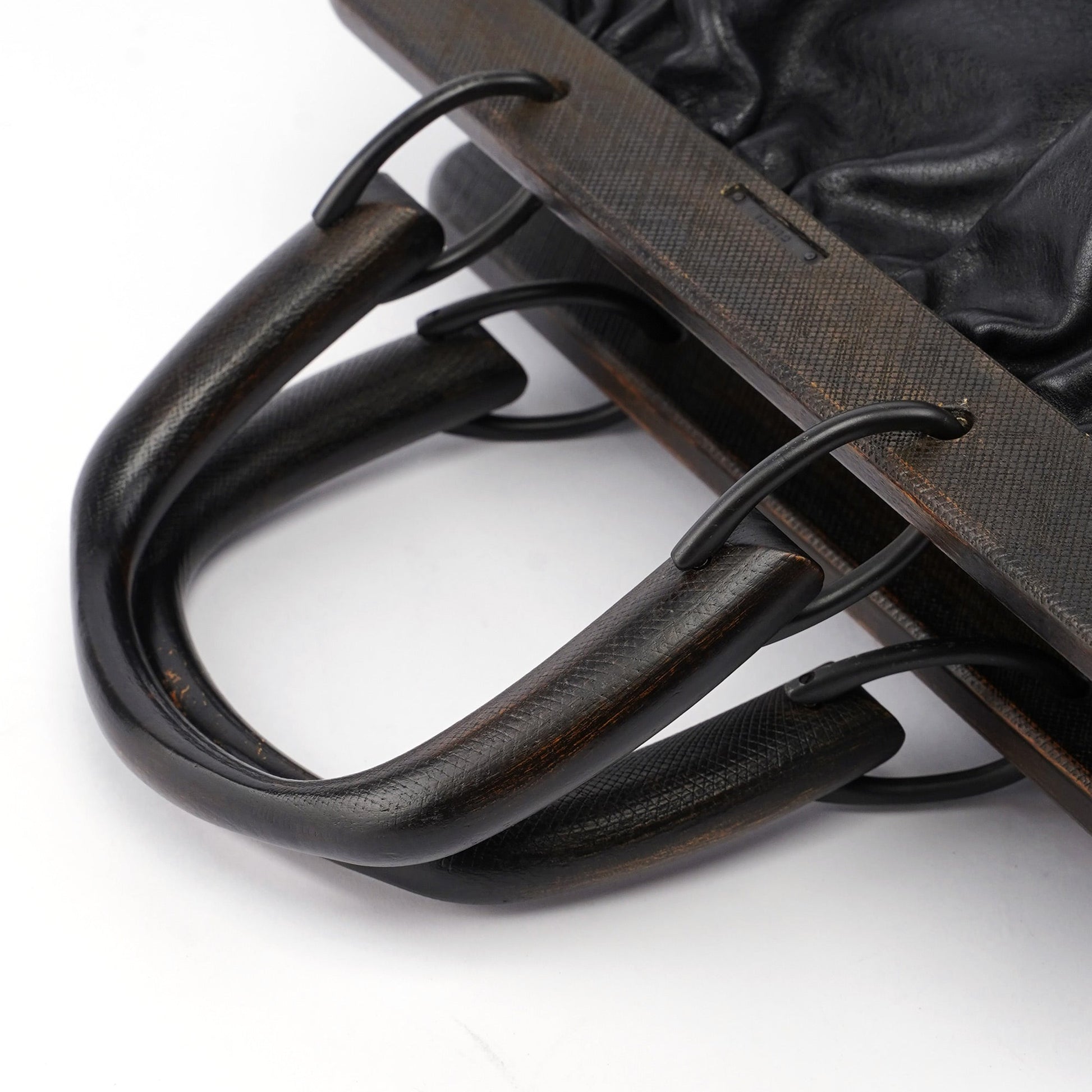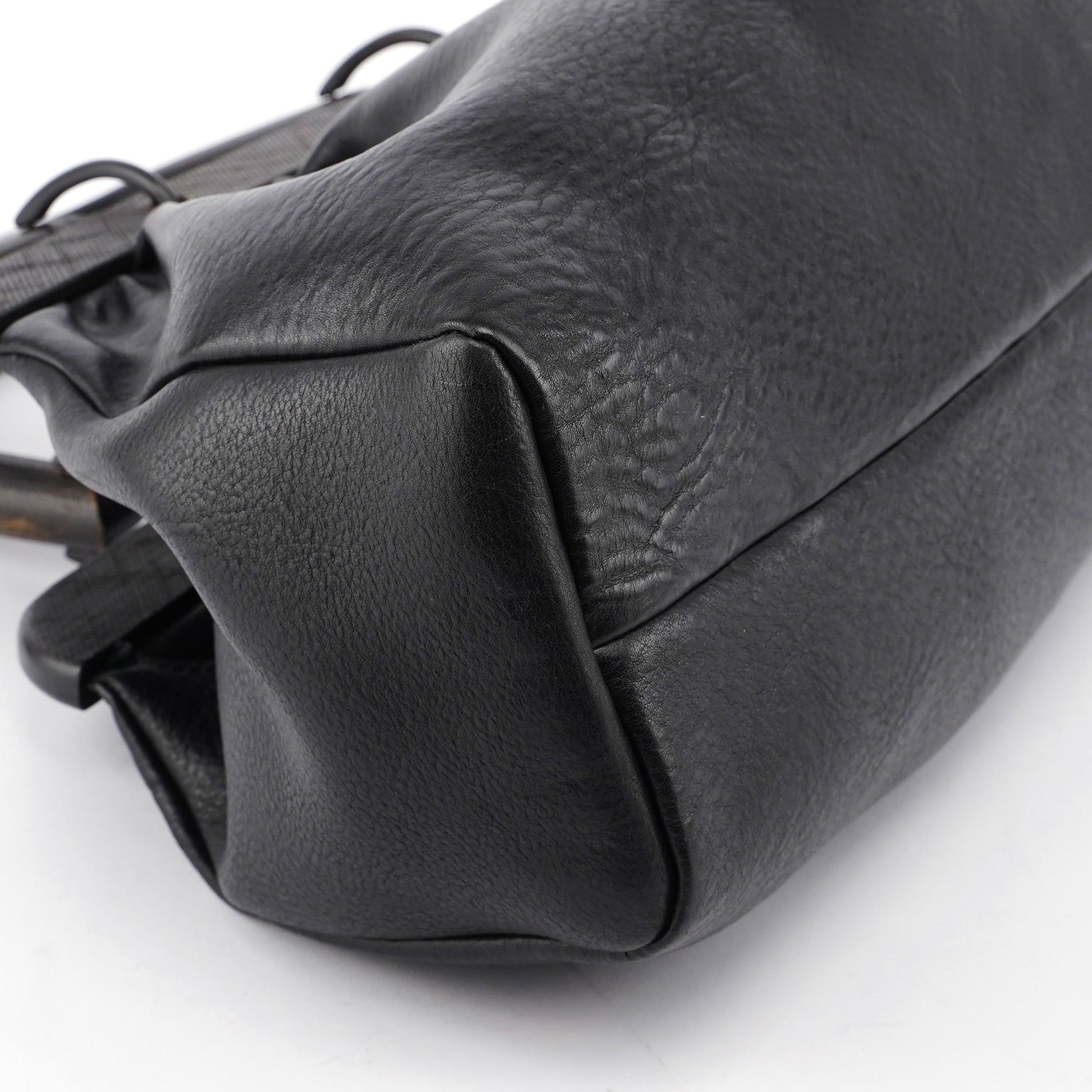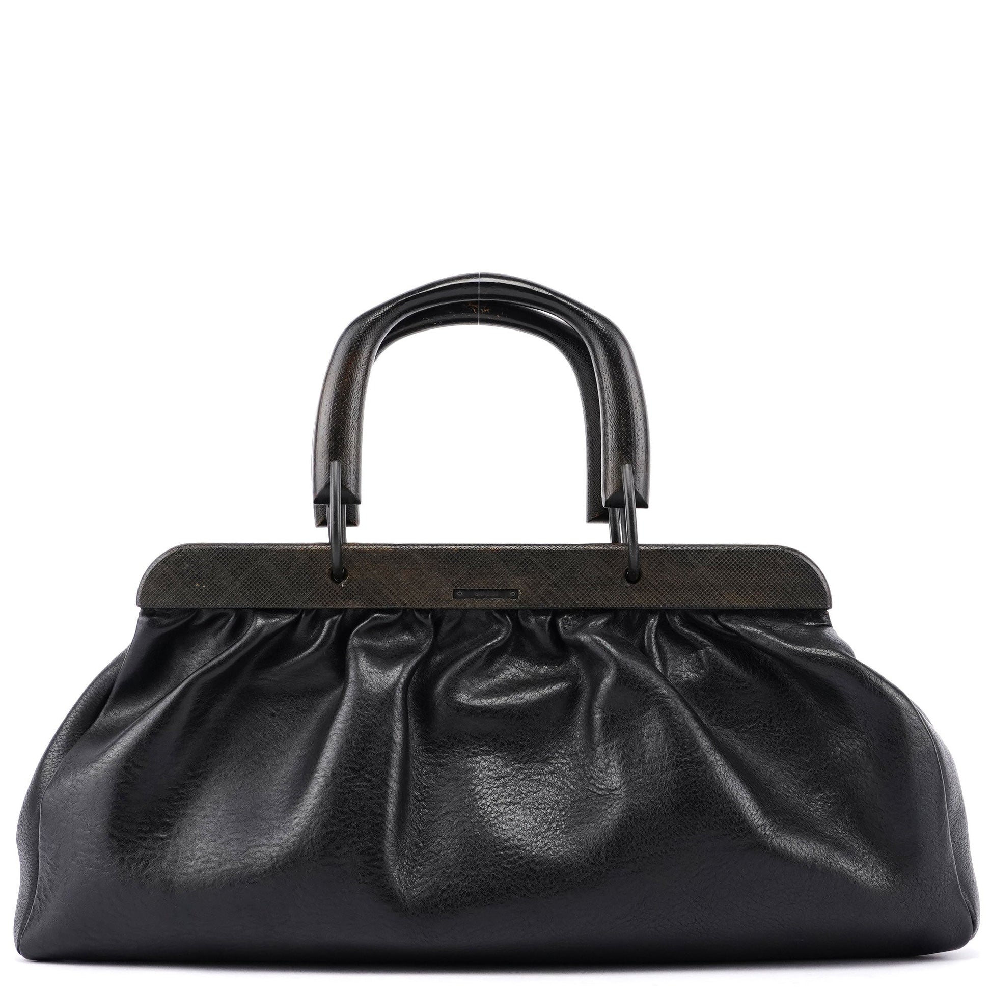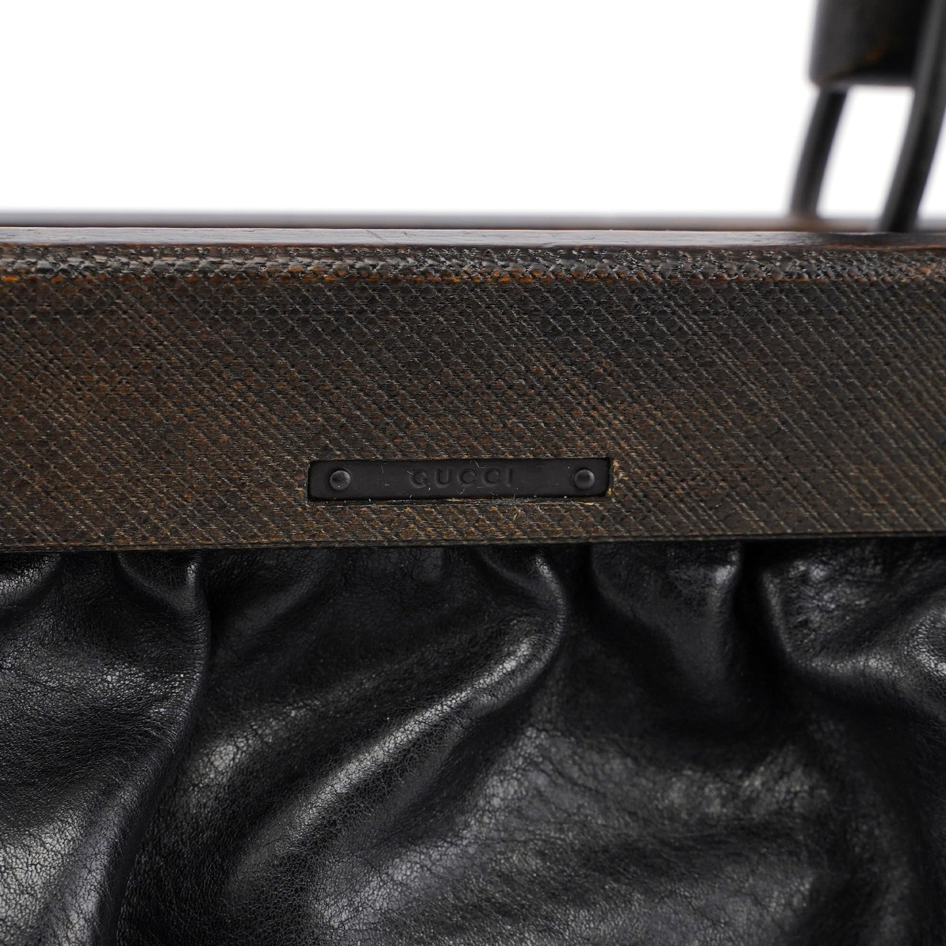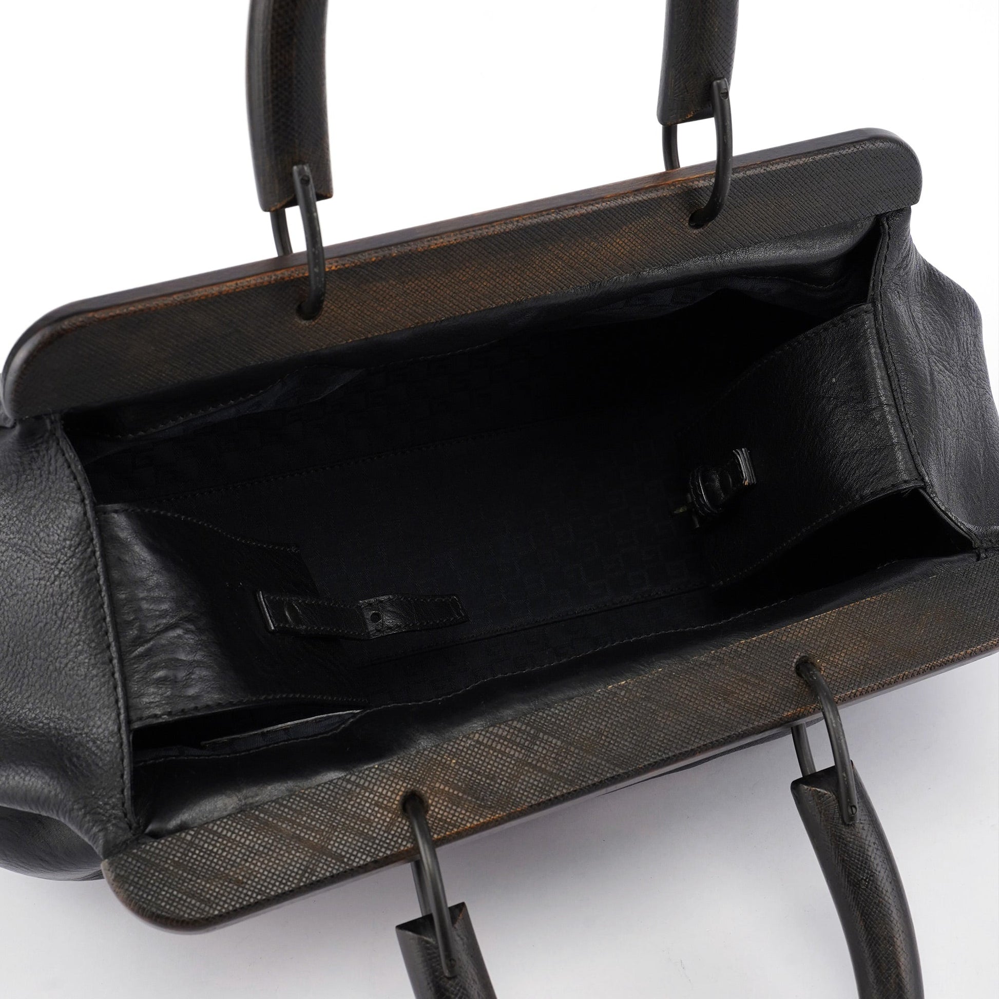 This Gucci Doctor bag, designed by Tom Ford for the Fall 2002 collection, is handcrafted in black leather and distinguished by two wooden handles. The interior, lined with cotton and including an interior zipper pocket, combines practicality with elegance, while the subtle Gucci plaque at the front adds a touch of heritage. As worn during the iconic Fall 2002 runway show.