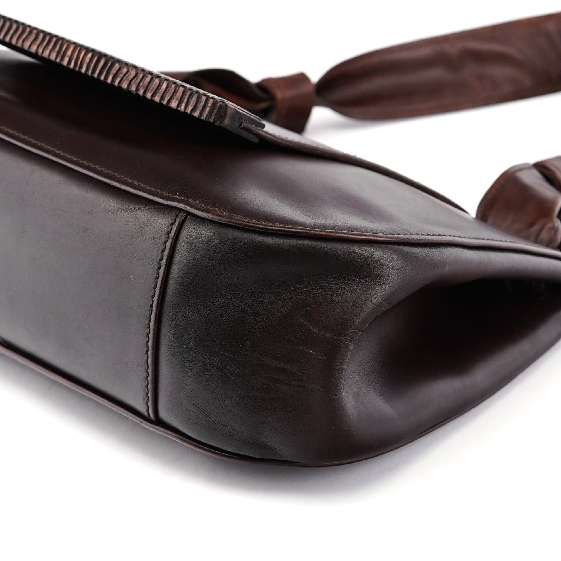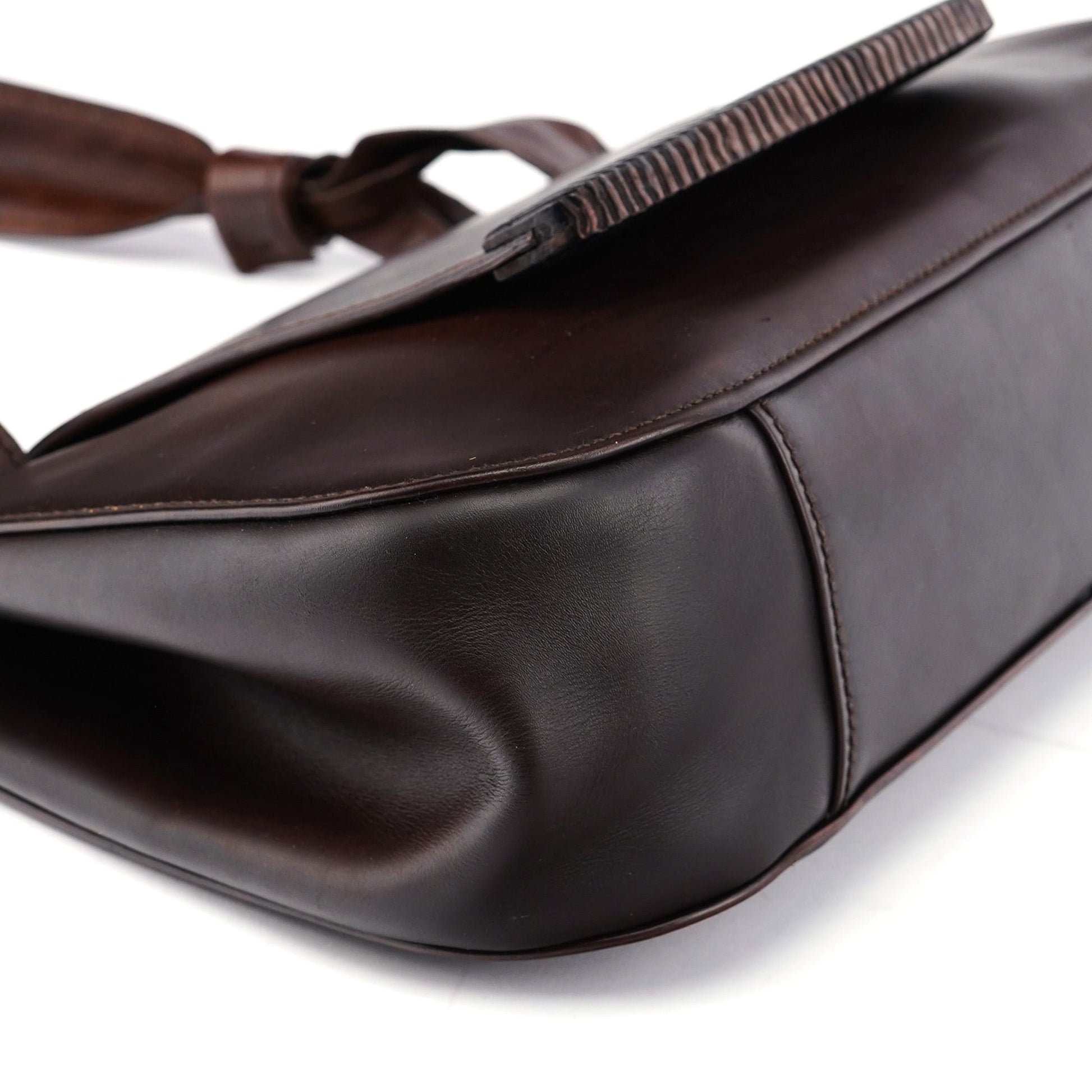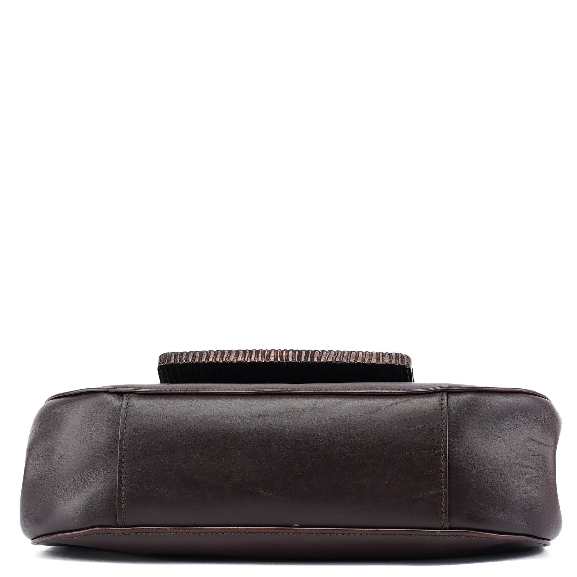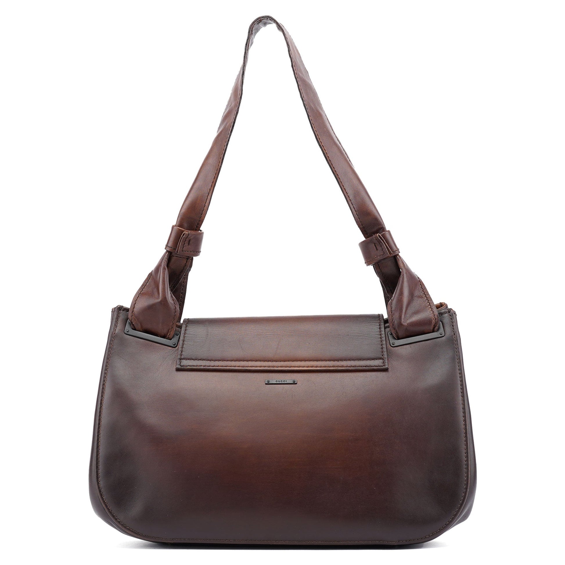 Designed by Tom Ford in 2002, this Gucci shoulder bag is handcrafted from rich brown calfskin leather and accented with anthracite hardware. A striking wood detail embellishes the flap closure, adding a unique touch to its sophisticated design. The satin-lined interior includes a zipper pocket, blending luxurious craftsmanship with practical elegance.