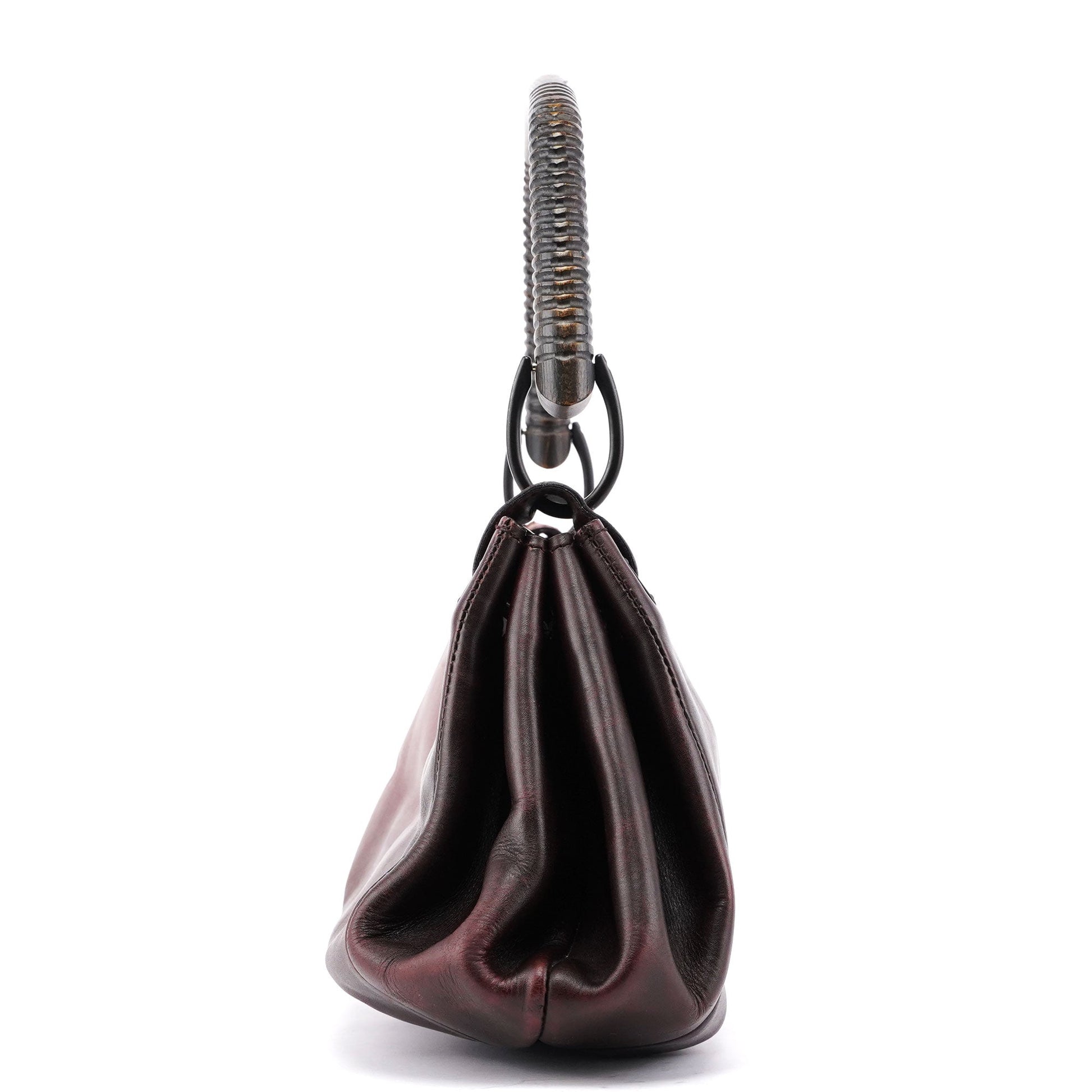 Handcrafted from brown calfskin leather, this Gucci Wood Handle bag by Tom Ford from 2002 features a wood handle and matte black hardware. The interior is lined in GG cotton with an interior zipper pocket, showcasing timeless elegance.
