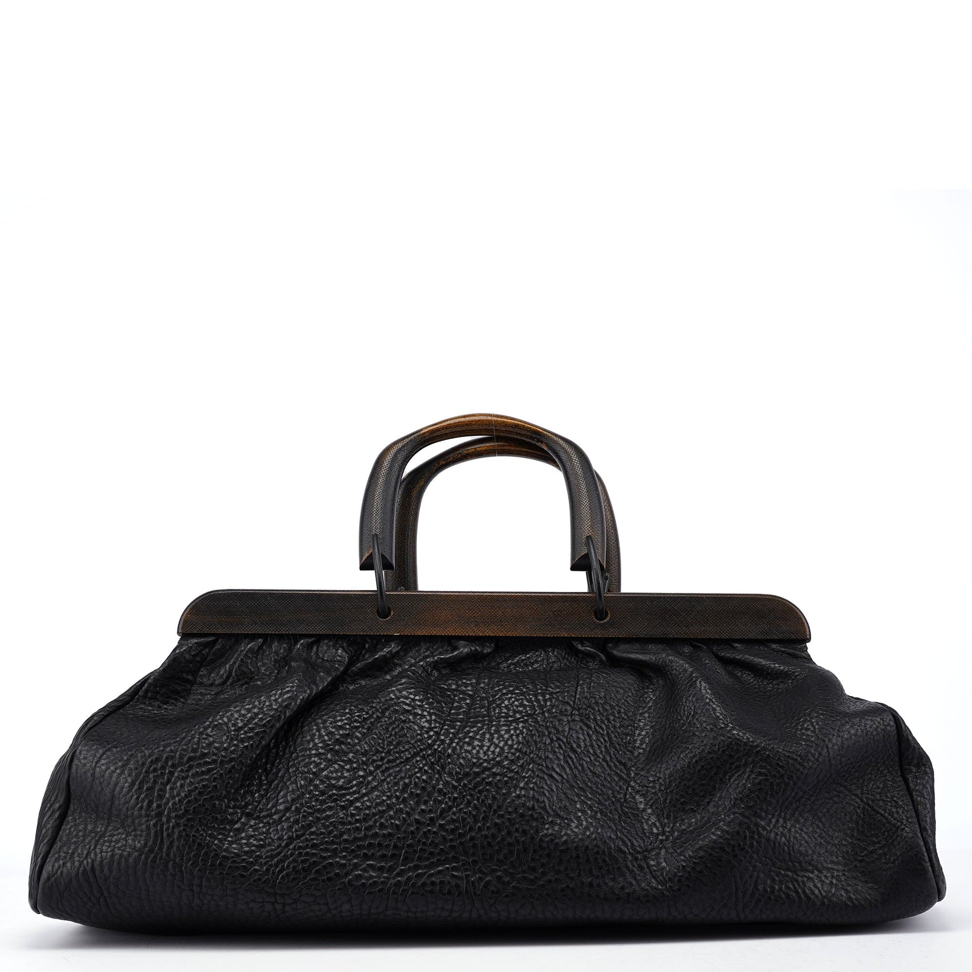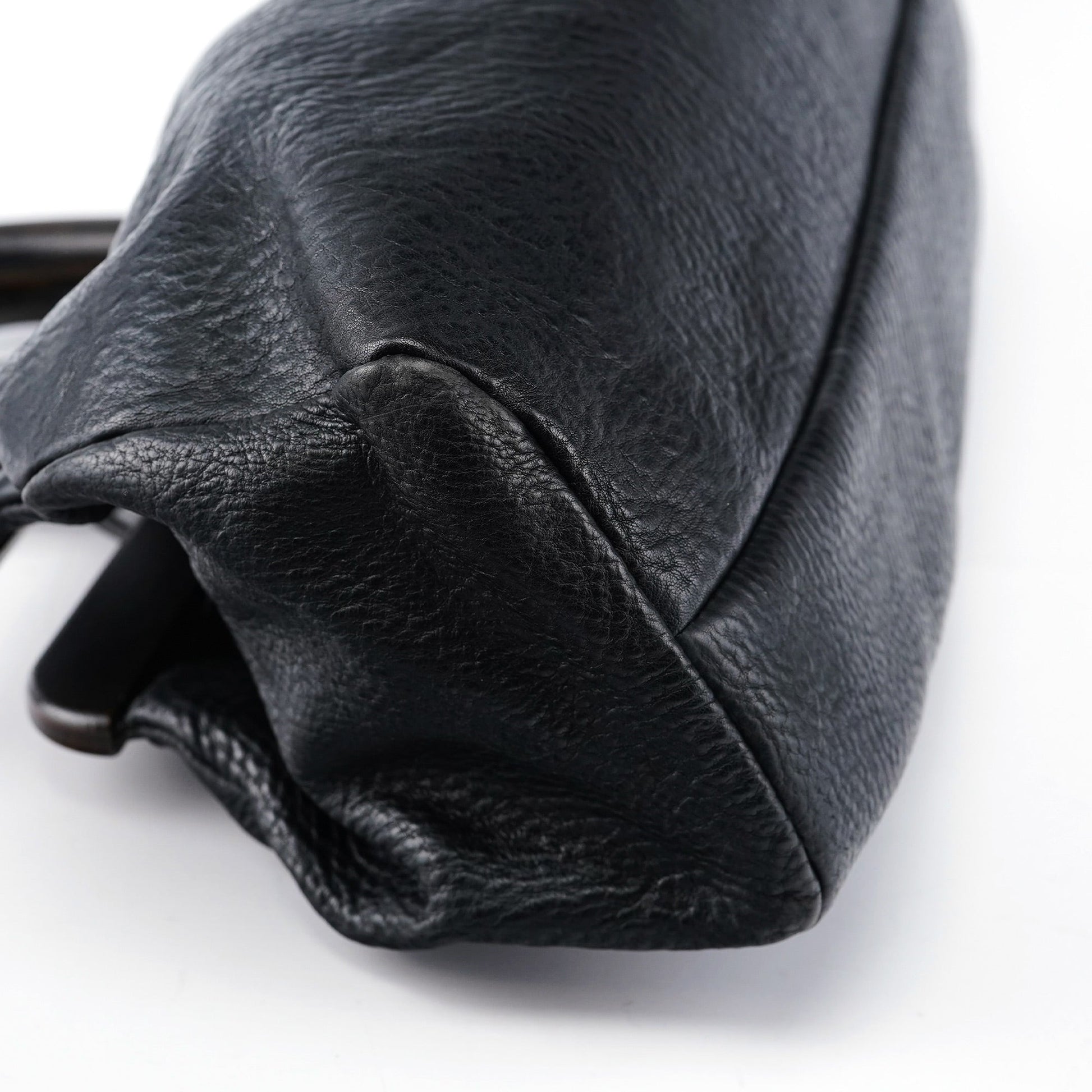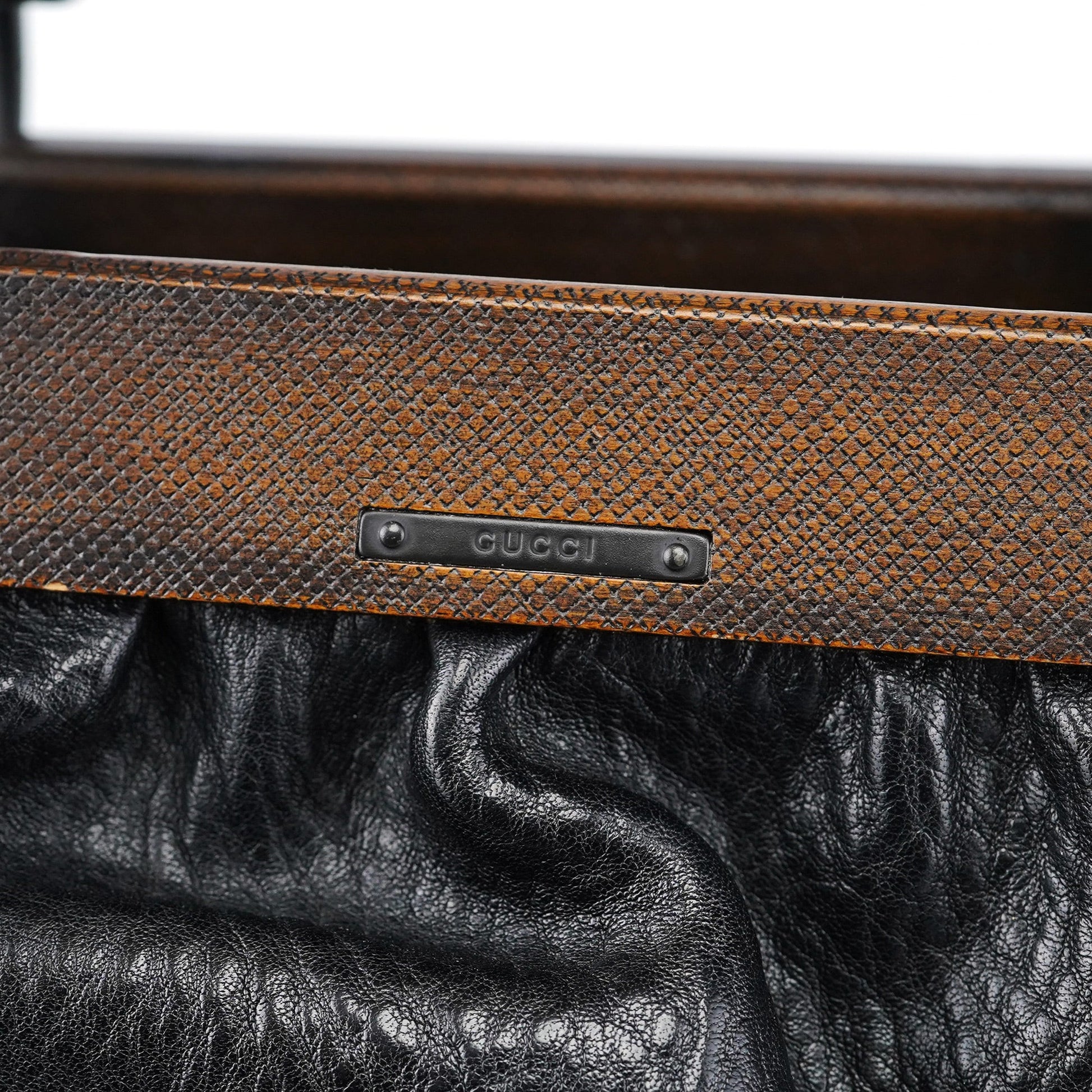 Designed by Tom Ford for the Fall 2002 collection, this Gucci Doctor bag is handcrafted from black bison leather and features distinctive wooden handles. The interior, lined with GG cotton, includes a zipper pocket for organized storage. A subtle Gucci plaque at the front adds a touch of heritage, as showcased during the iconic Fall 2002 runway show.