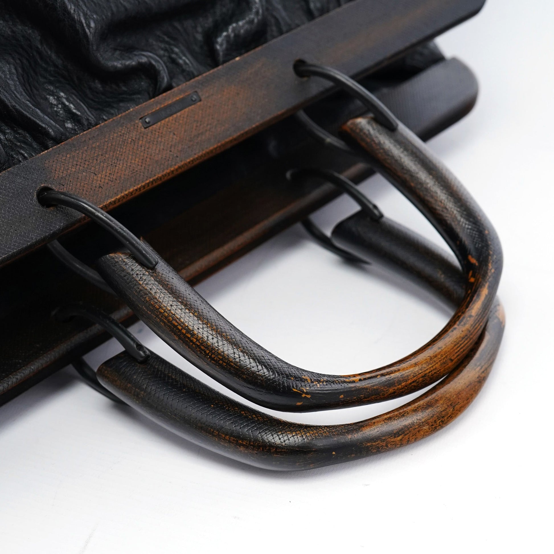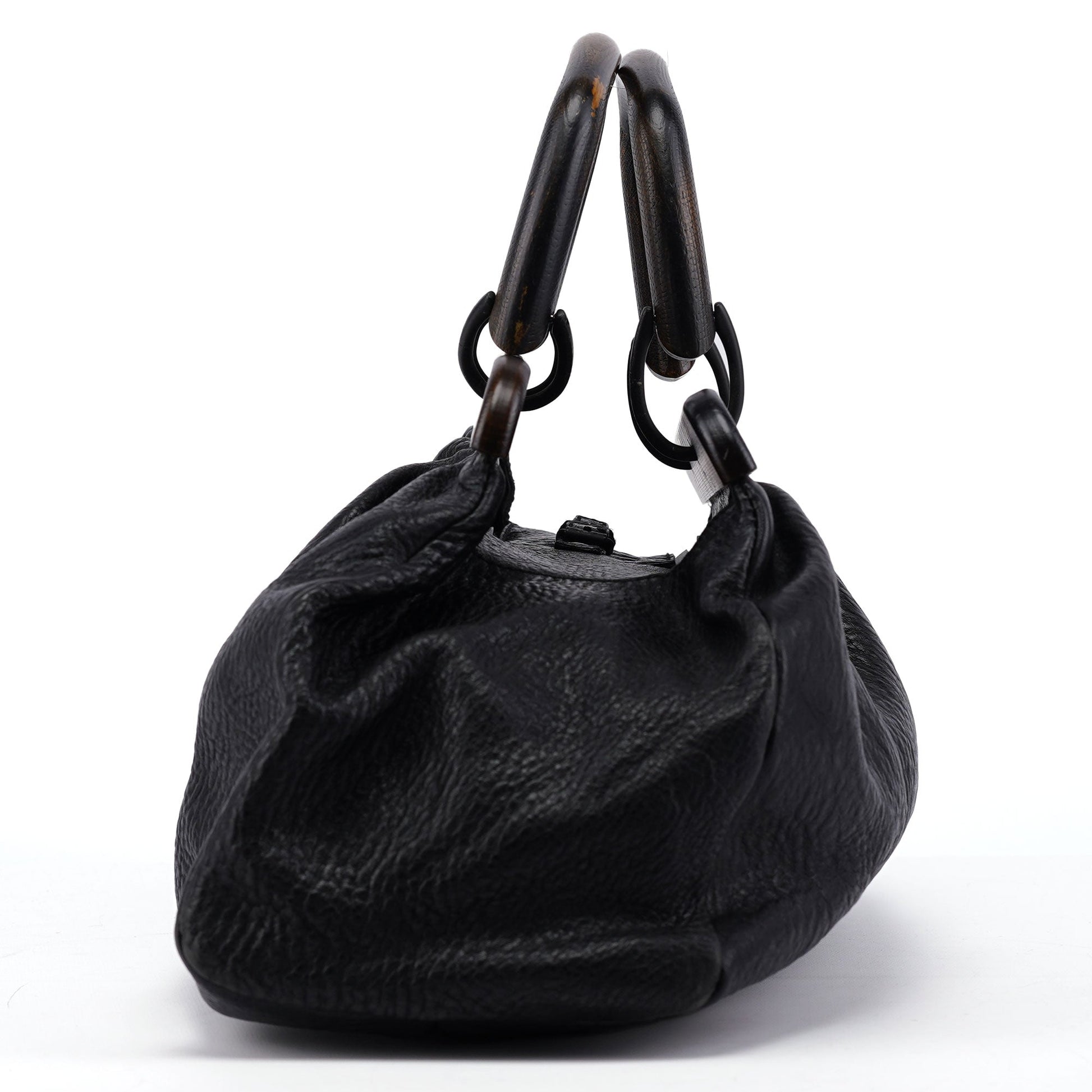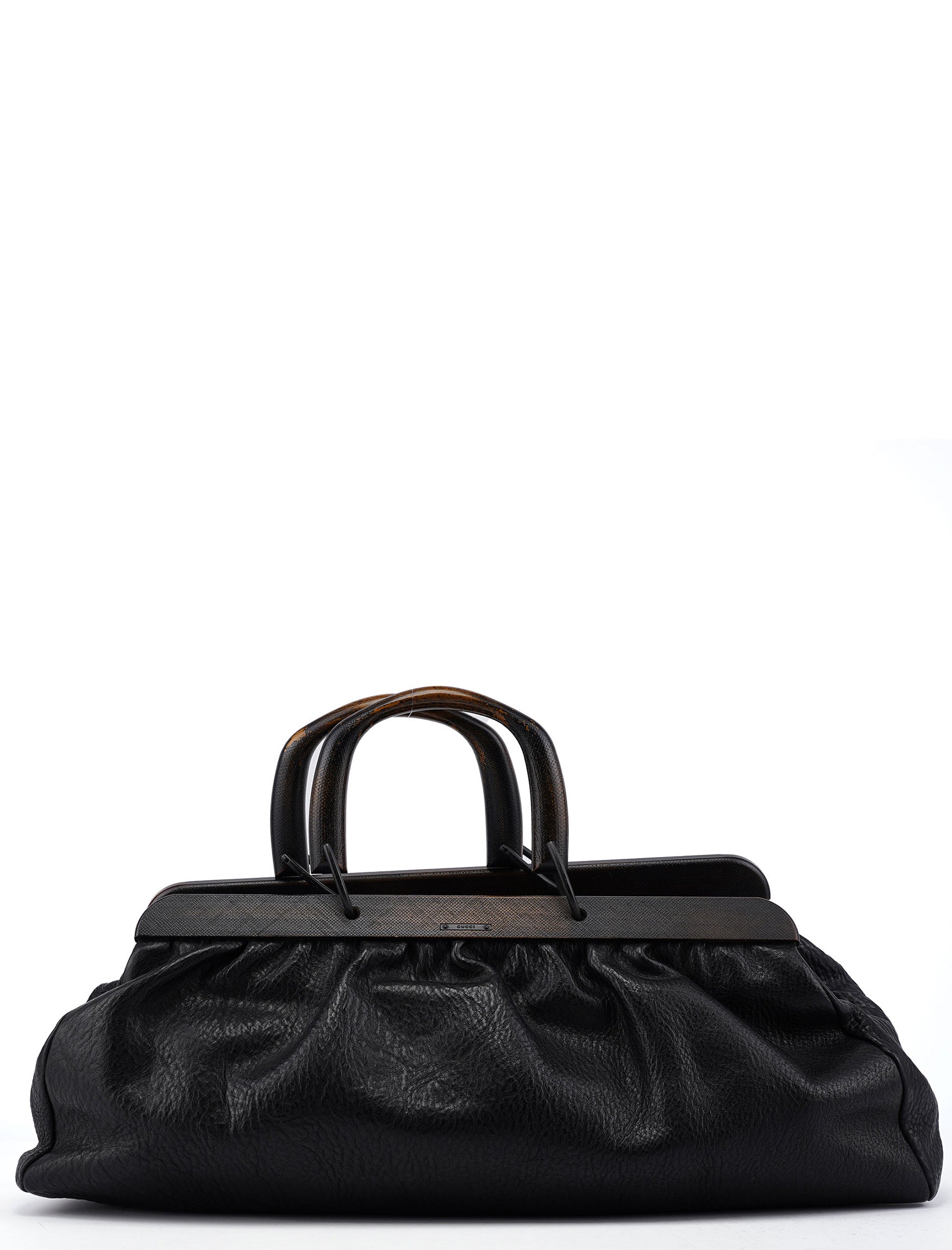 Designed by Tom Ford for the Fall 2002 collection, this Gucci Doctor bag is handcrafted from black bison leather and features distinctive wooden handles. The interior, lined with GG cotton, includes a zipper pocket for organized storage. A subtle Gucci plaque at the front adds a touch of heritage, as showcased during the iconic Fall 2002 runway show.