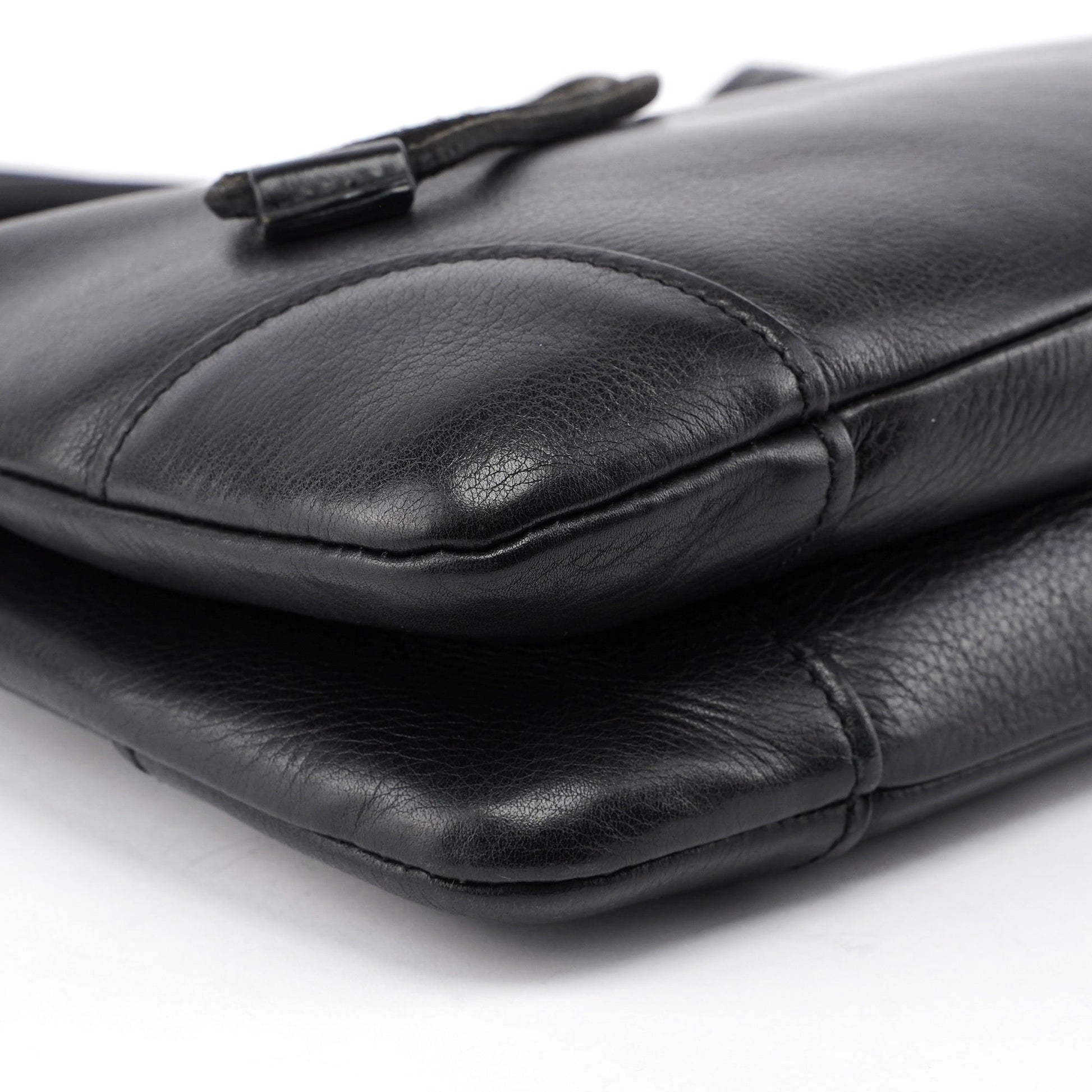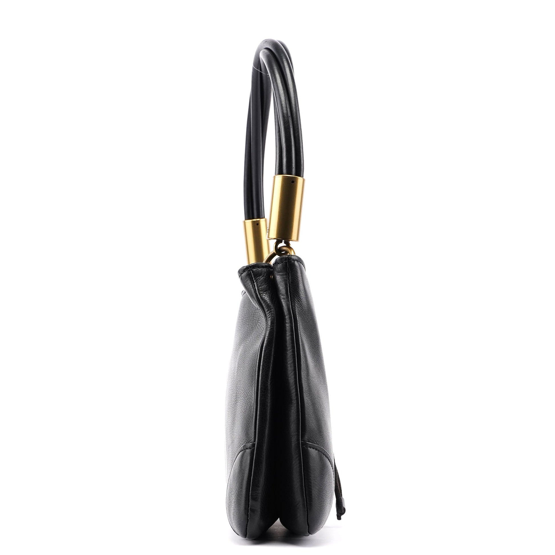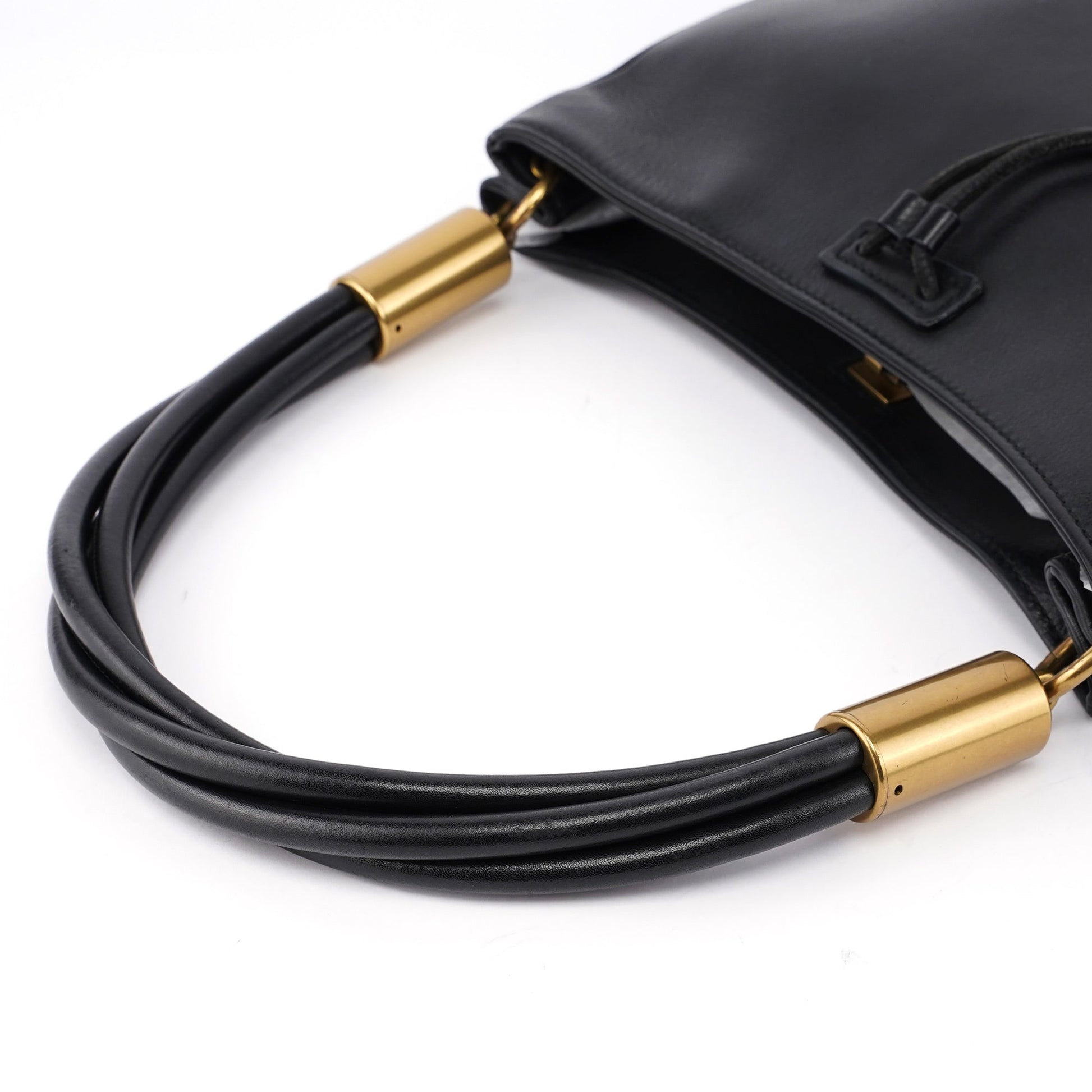 This Gucci Knot handle bag by Tom Ford from the 2003 collection is crafted from black calfskin leather, featuring a distinctive knotted handle. It is accented with brushed gold-tone hardware engraved with the Gucci logo. The drawstring closure reveals a GG cotton-lined interior with a zipper pocket. The Gucci logo is embossed on the front, reflecting timeless elegance.