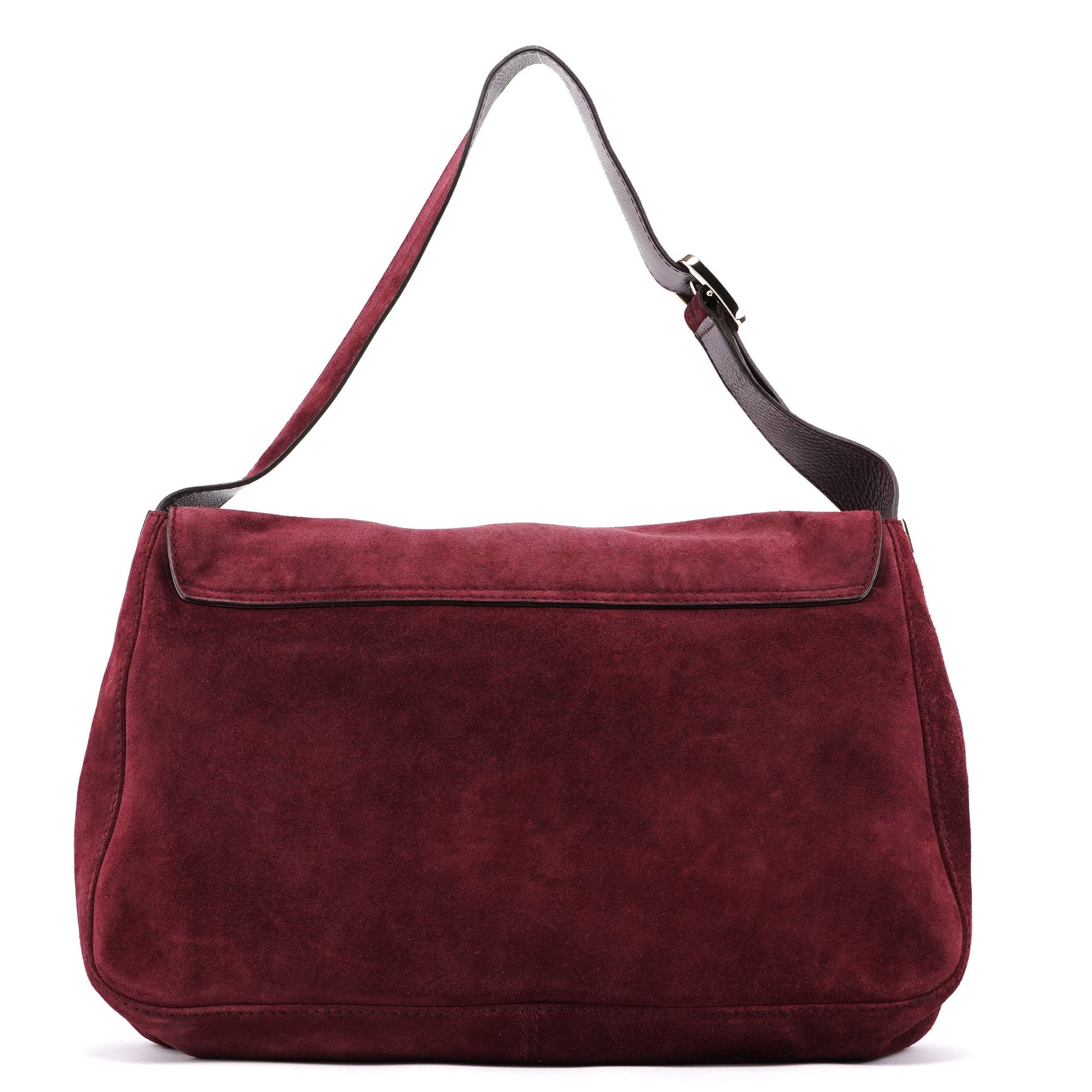 Handcrafted from burgundy suede with tonal leather trim, this Gucci Scamosciato GG shoulder bag by Tom Ford from the mid 2000's features gold-tone hardware. The interior is lined in satin with an interior zipper pocket, showcasing timeless elegance.