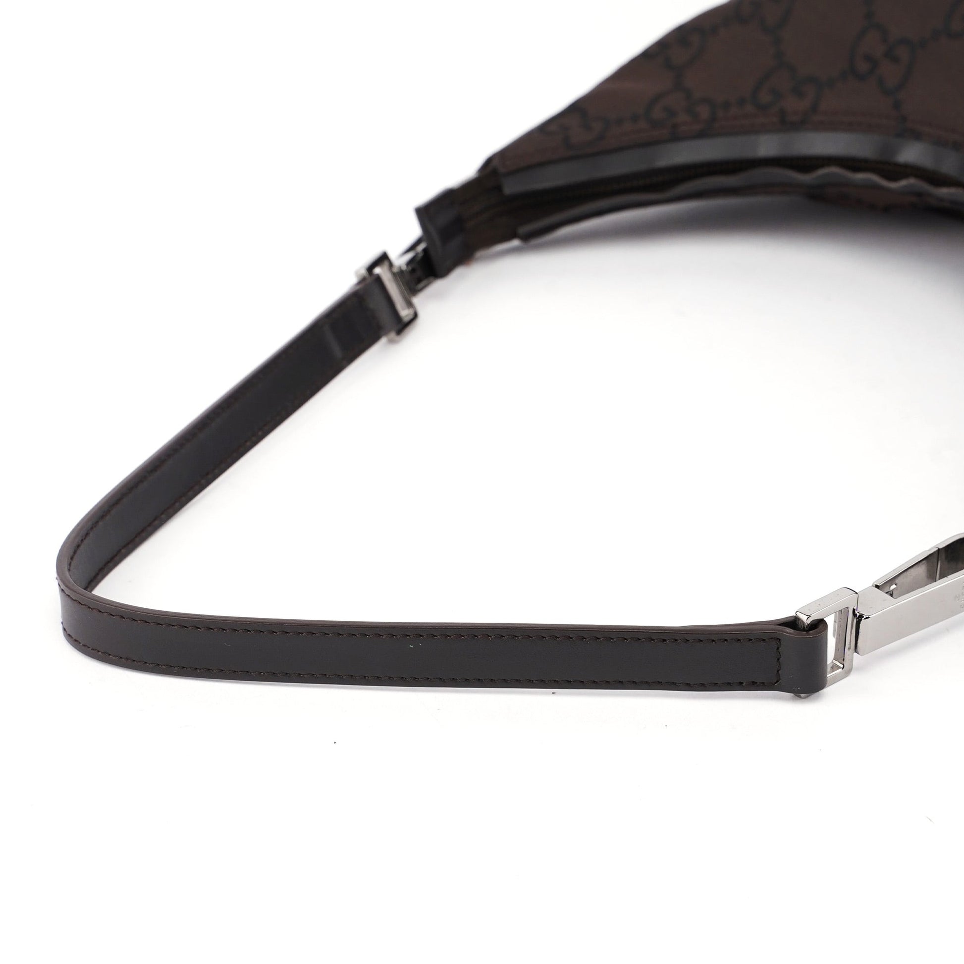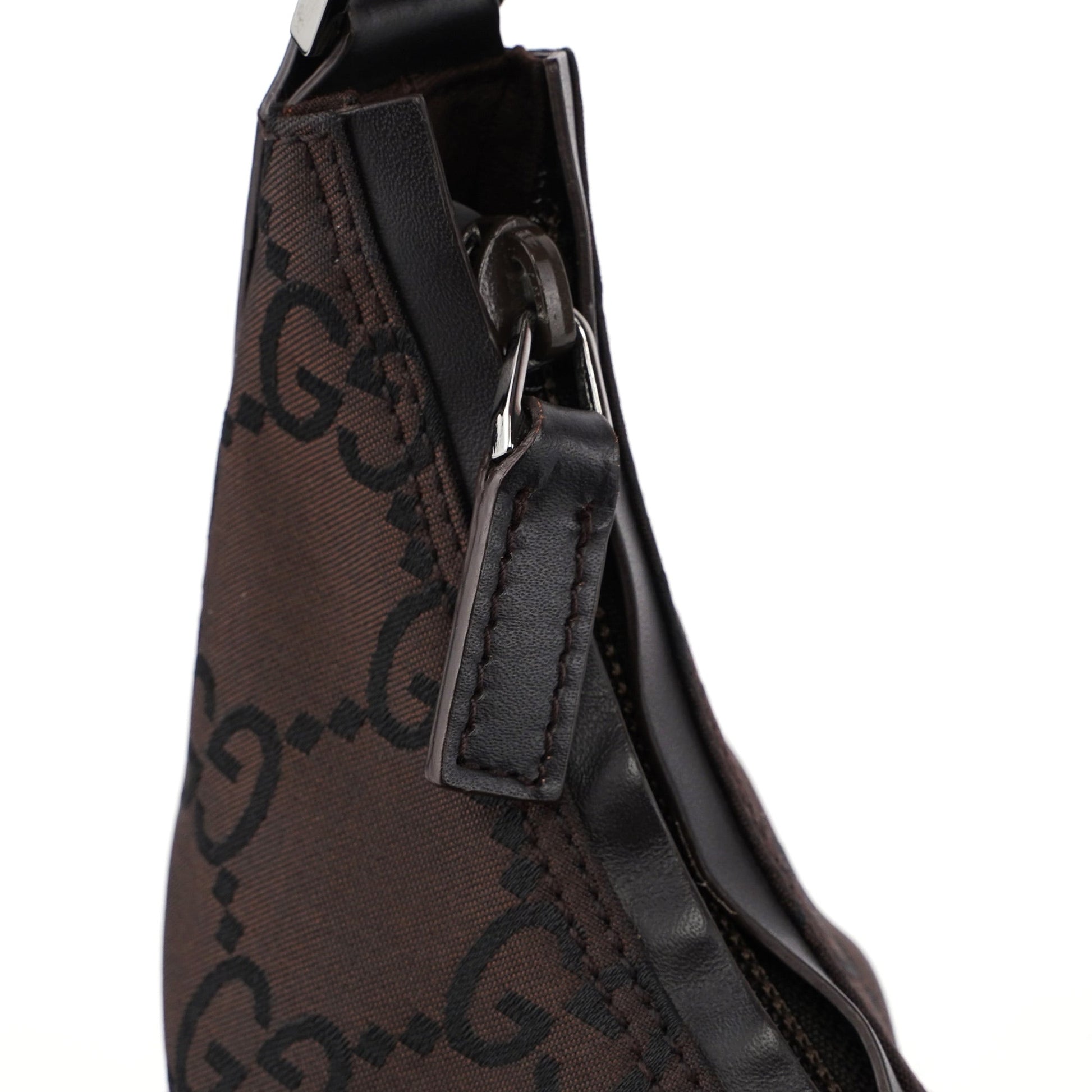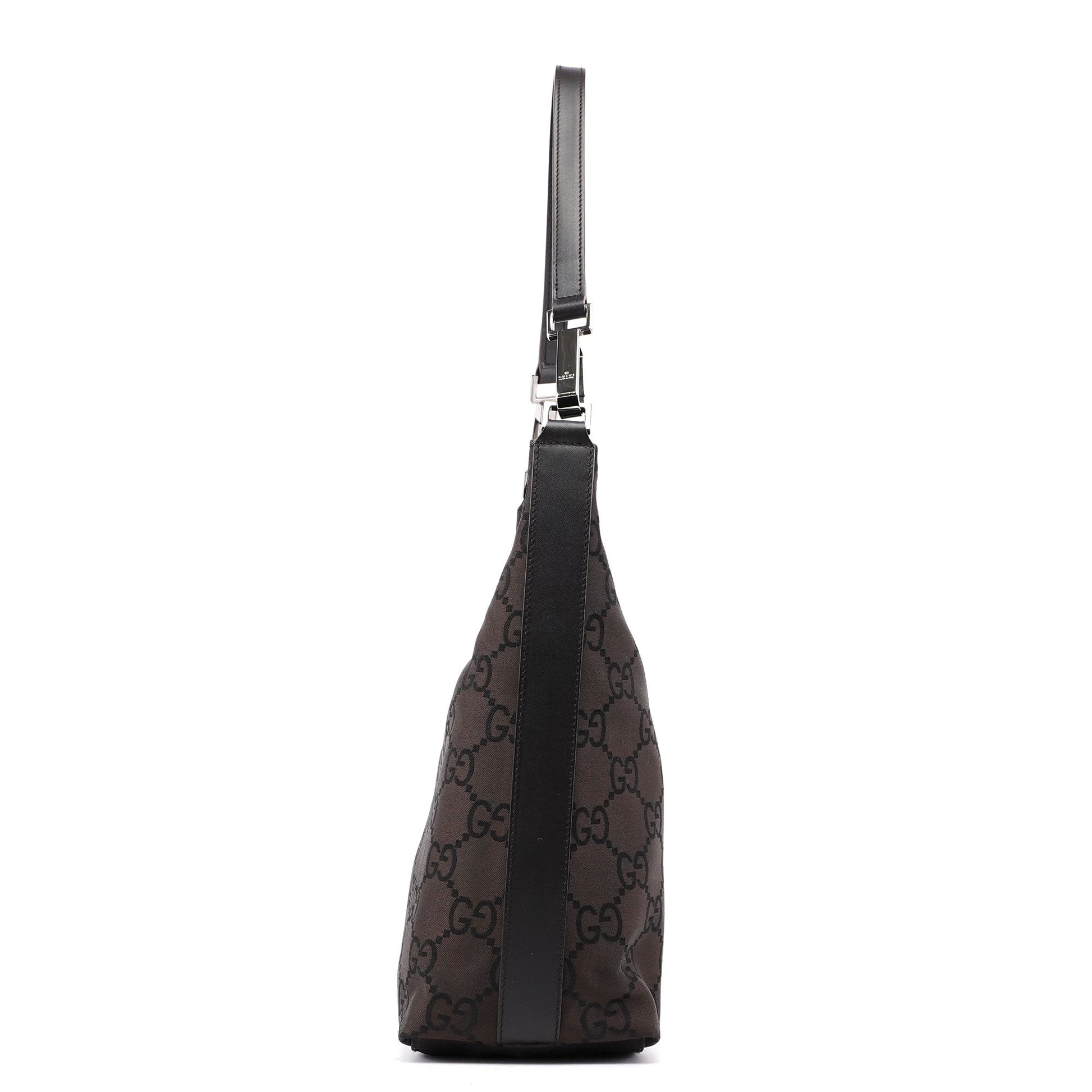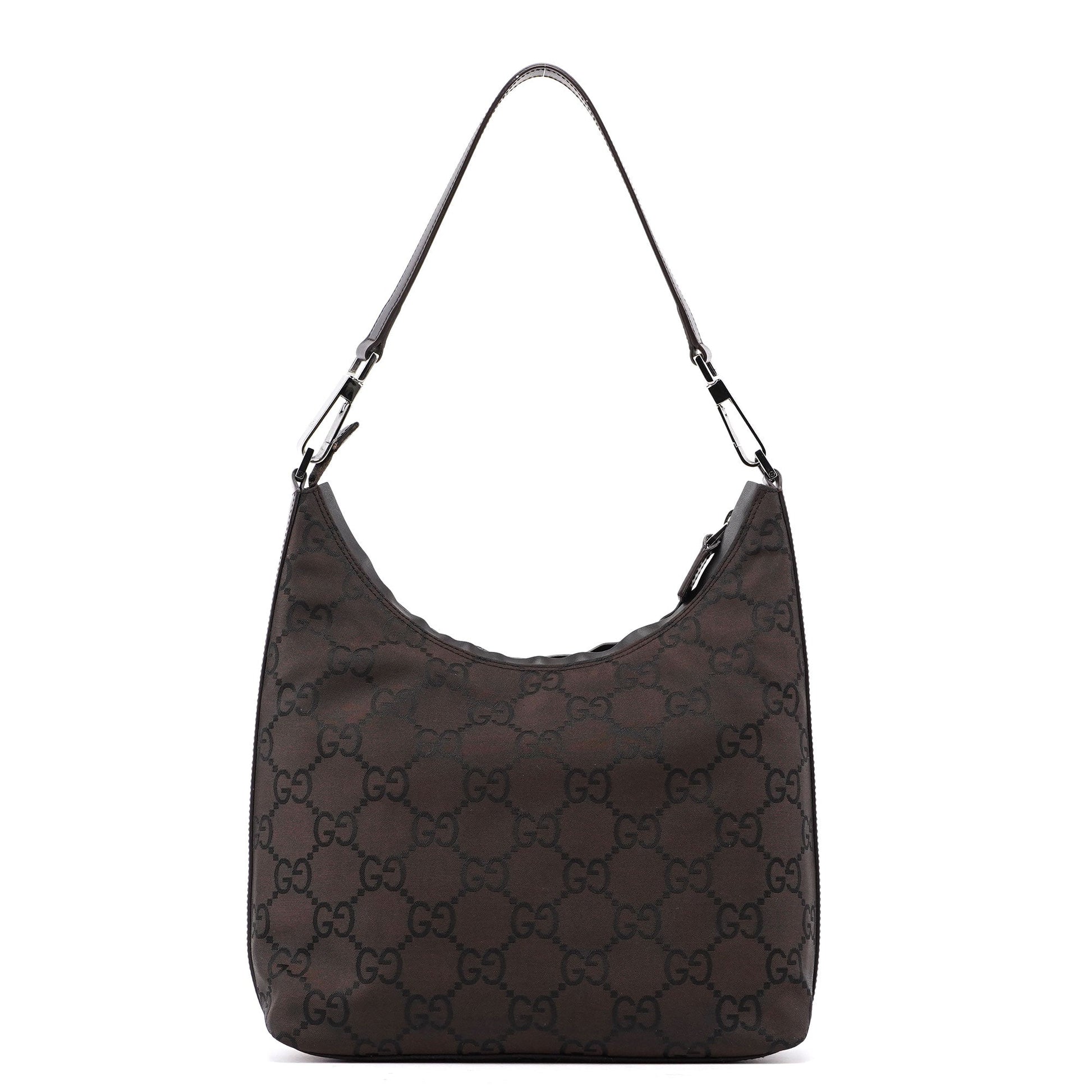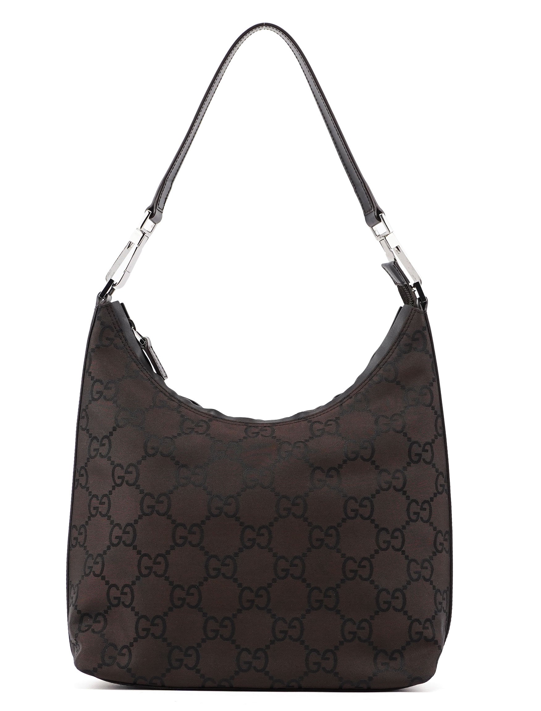 This Gucci GG hobo shoulder bag, designed by Tom Ford in the late 1990s is handcrafted from brown GG monogram nylon, and features silver-tone hardware with engraved Gucci logo, complemented by brown calfskin leather trim. A zipper closure secures the satin-lined interior.