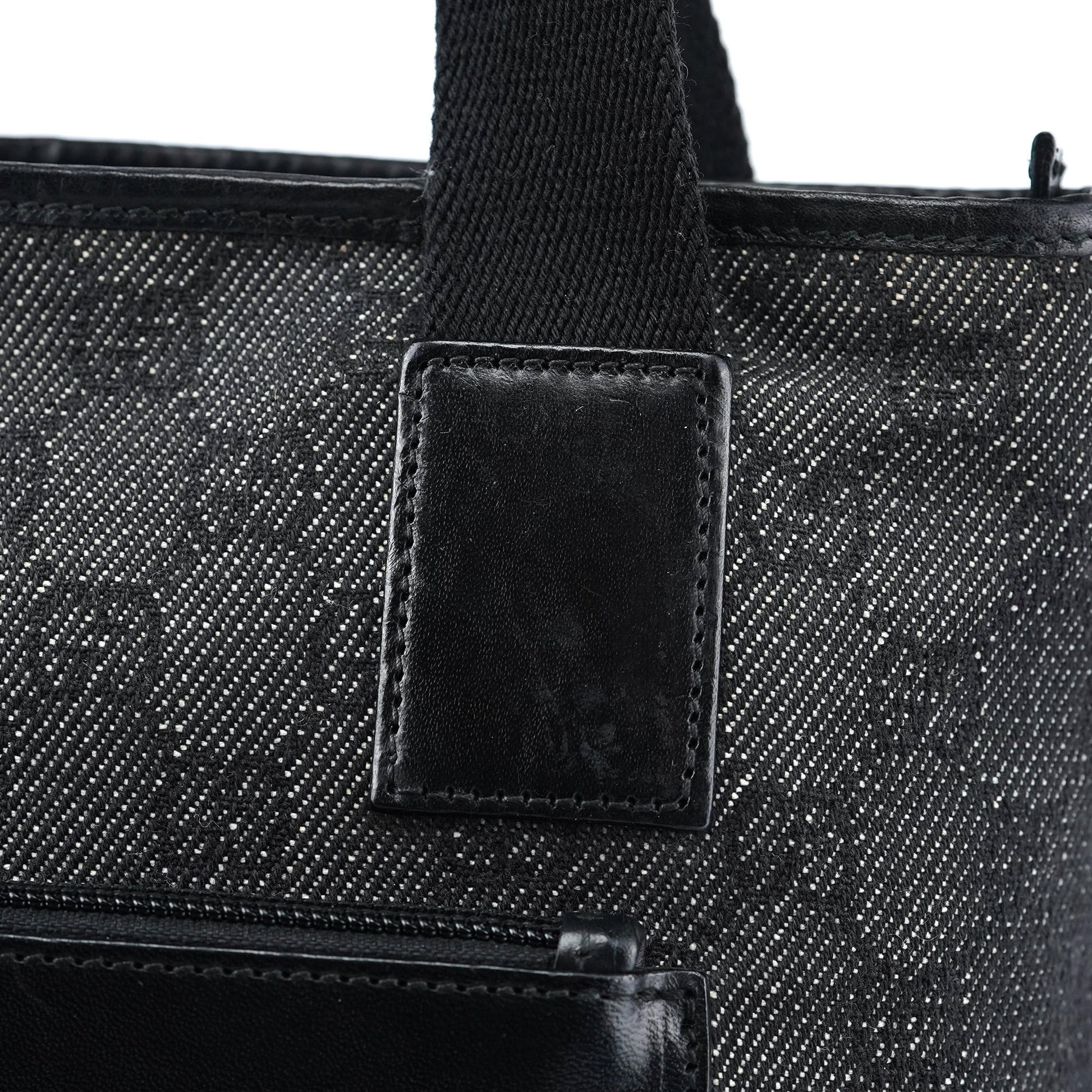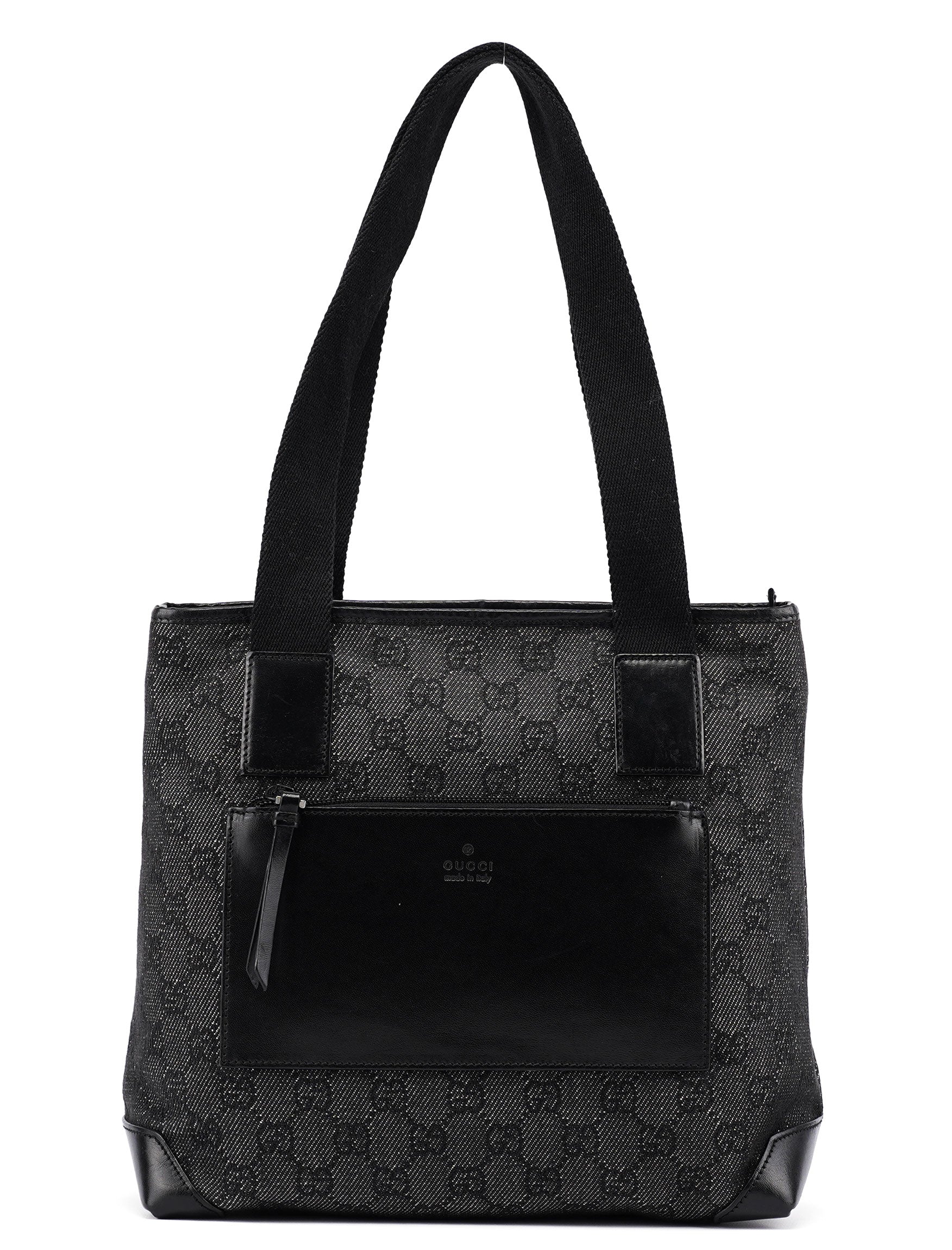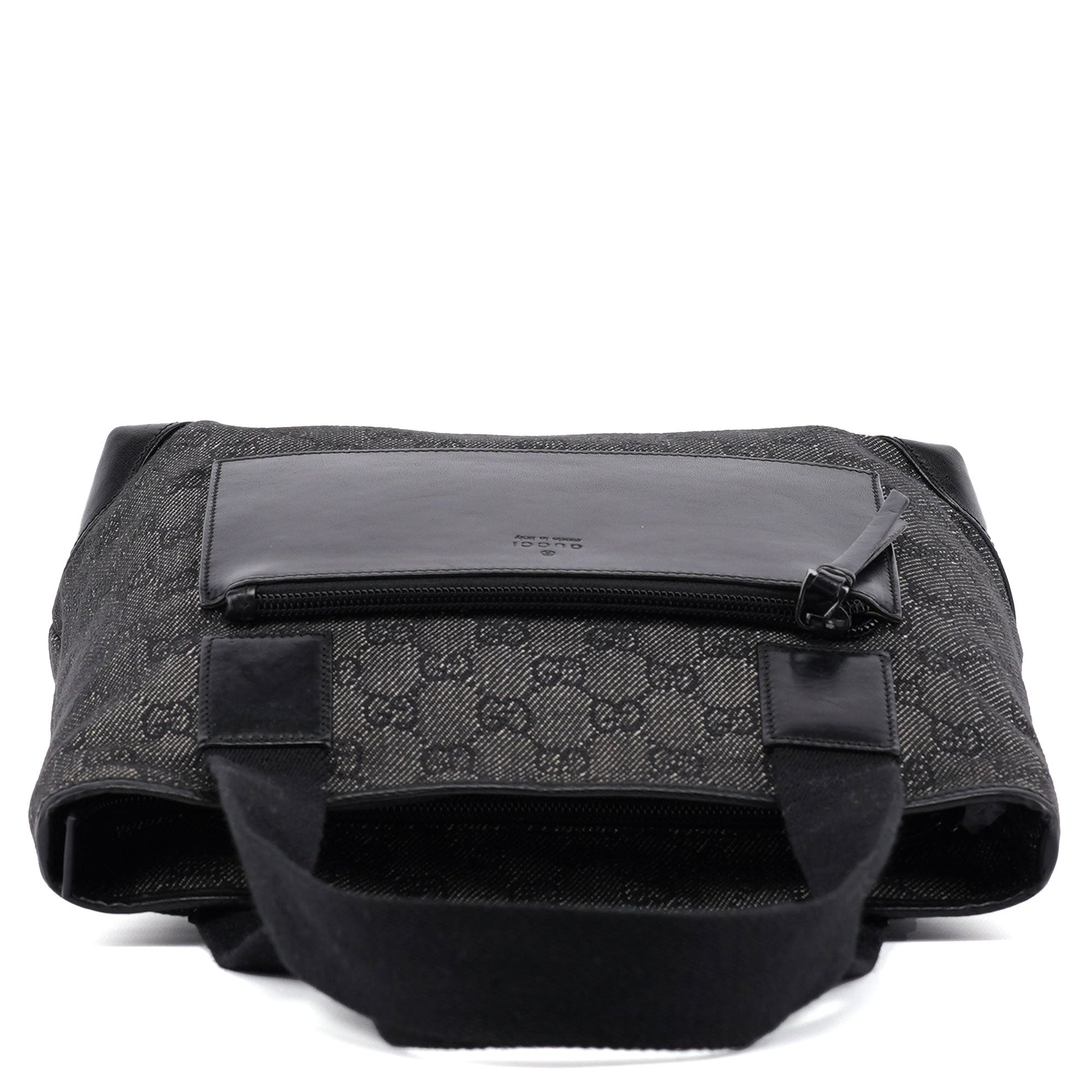 Discover the Gucci GG tote bag, a refined creation by Tom Ford from the late 1990s. Handcrafted in anthracite GG monogram canvas with black leather trim, it features sleek silver-tone hardware, a front pocket, and a secure zipper closure. The satin-lined interior includes a zipper pocket for added functionality, while the embossed Gucci logo on the front adds an elegant finishing touch.