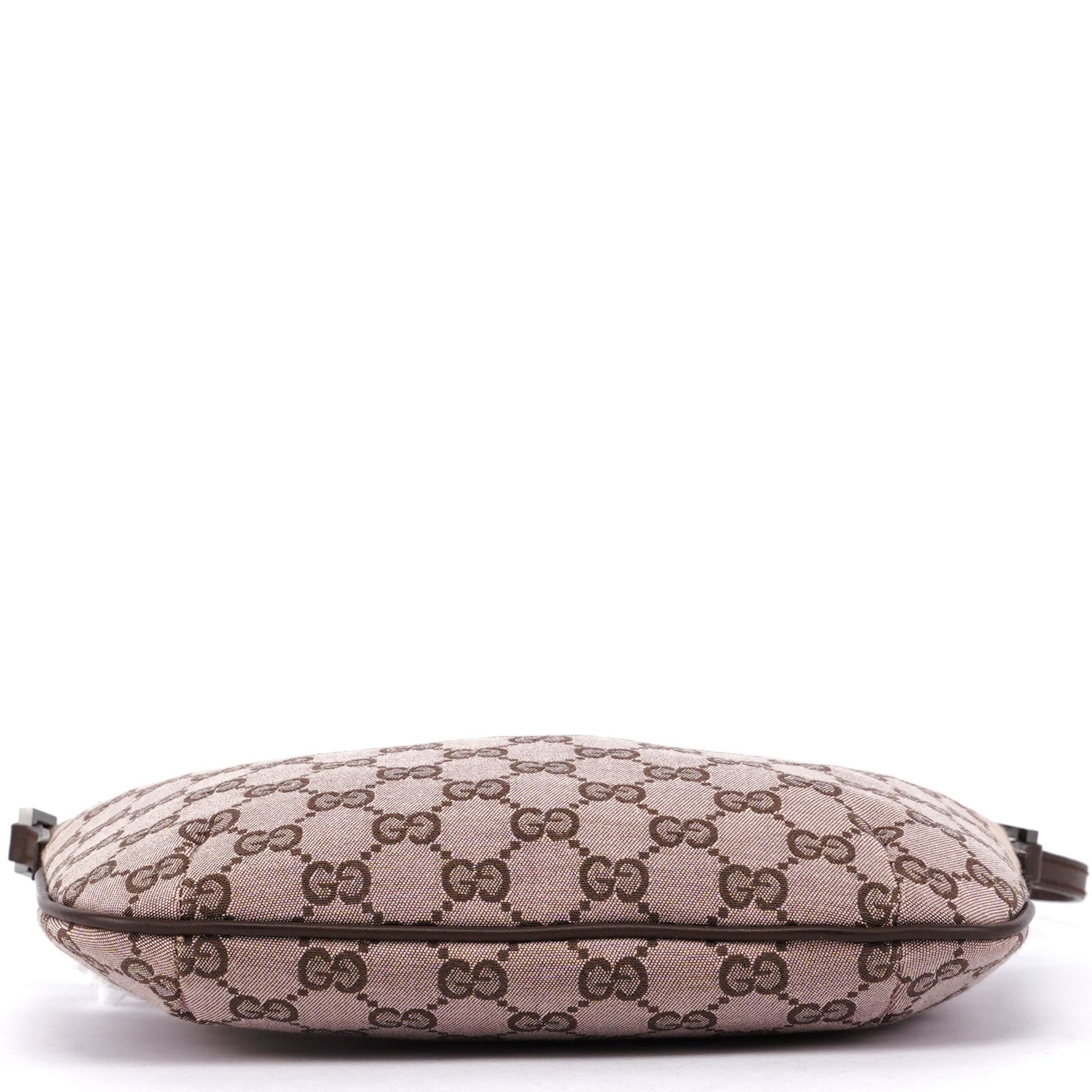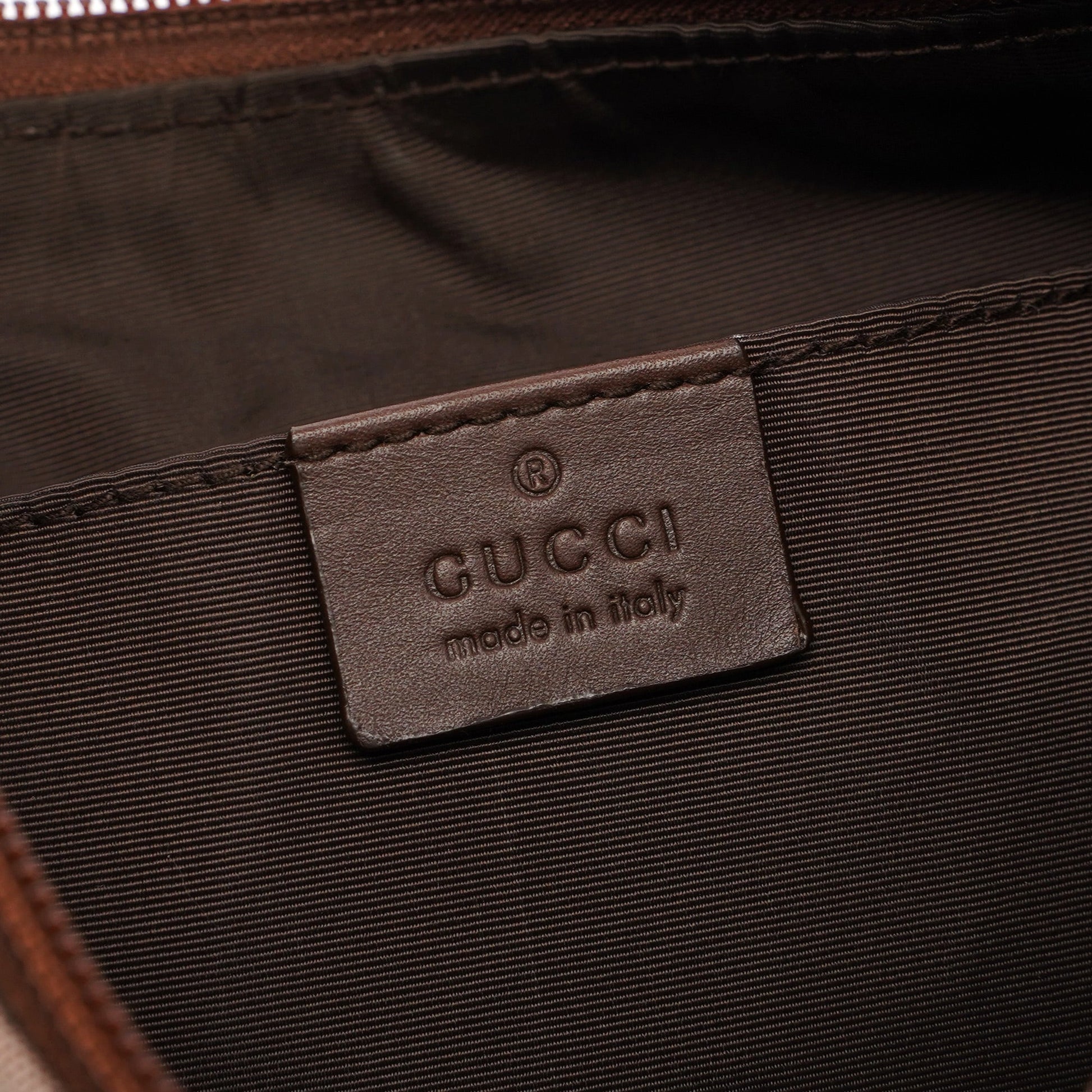 Designed by Tom Ford in the late 1990's, this Gucci GG shoulder bag is crafted from the iconic beige GG monogram canvas with brown leather trim. Its silver-tone hardware adds a touch of elegance, while the satin-lined interior features a convenient pocket for organization.