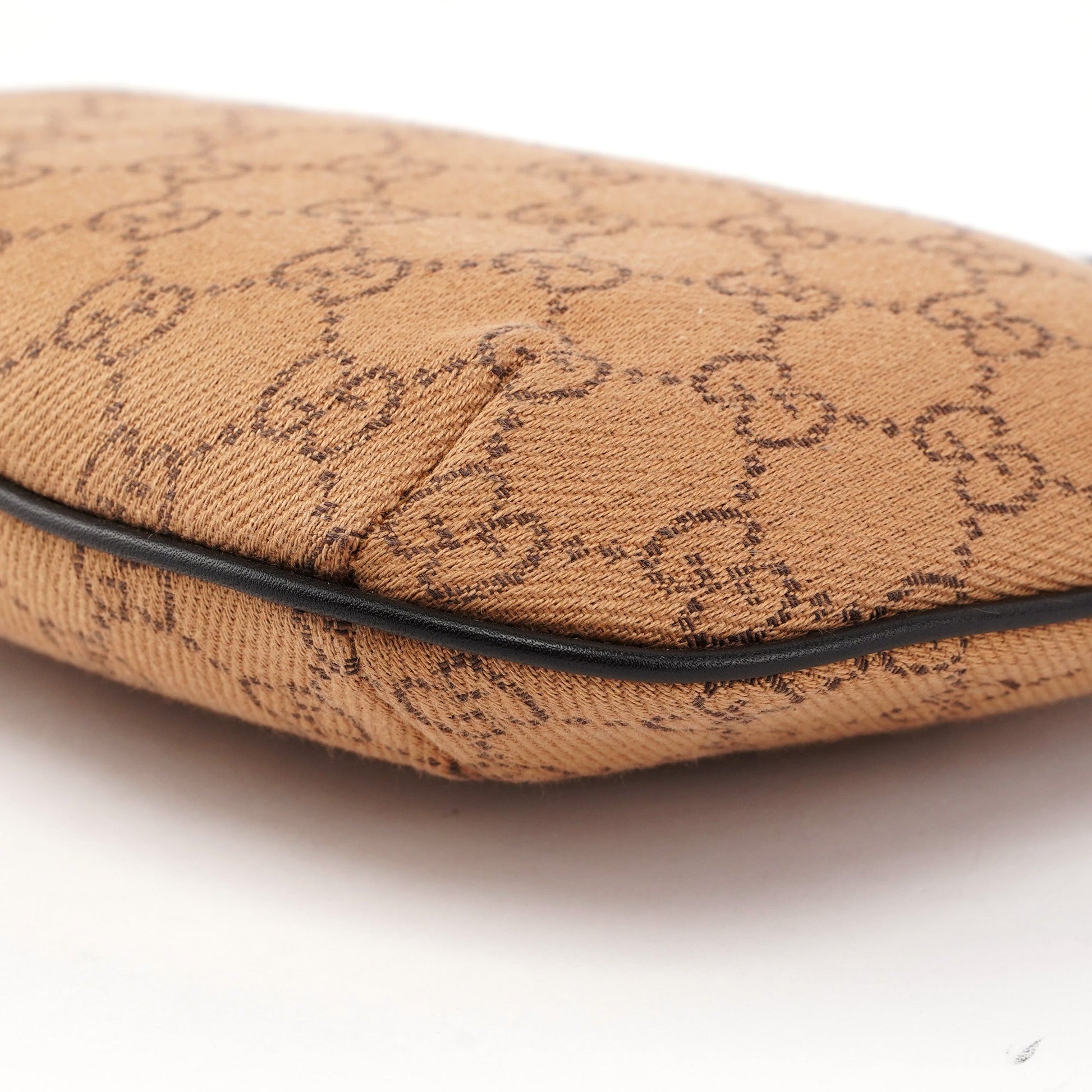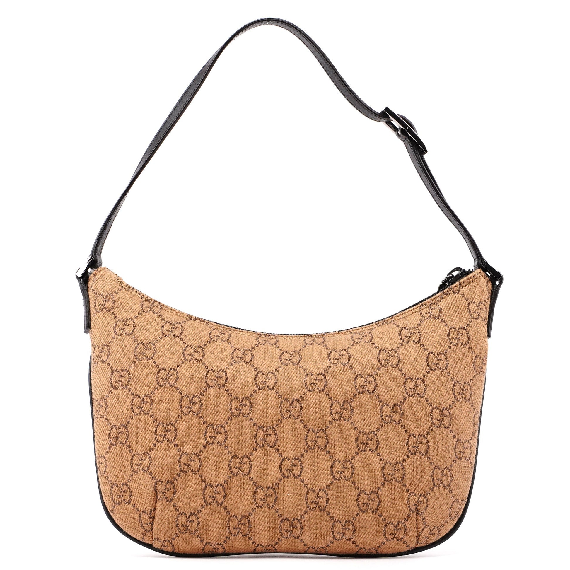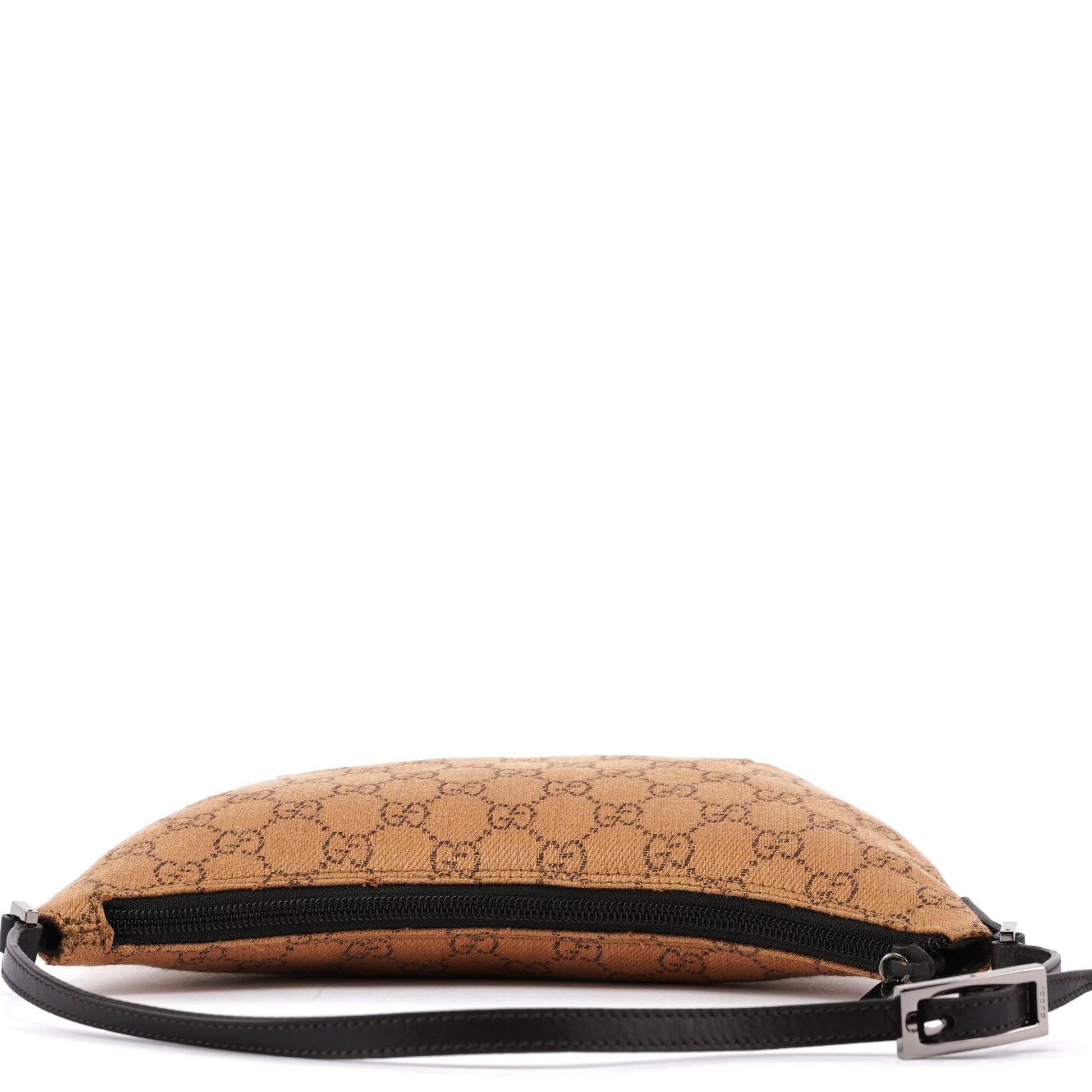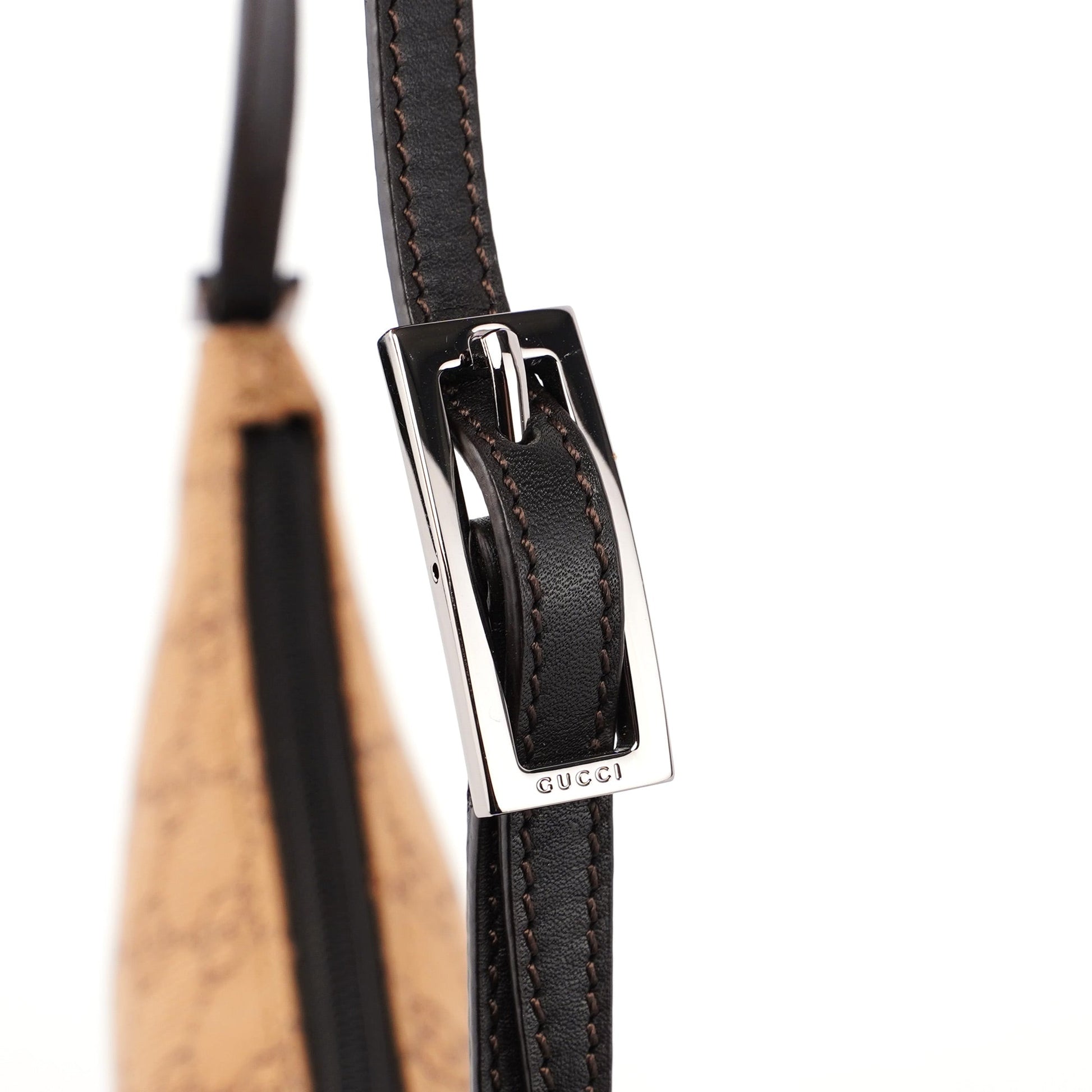 Designed by Tom Ford in the late 1990's, this Gucci GG shoulder bag is crafted from the iconic beige GG monogram canvas with brown leather trim. Its silver-tone hardware adds a touch of elegance, while the satin-lined interior features a convenient pocket for organization.