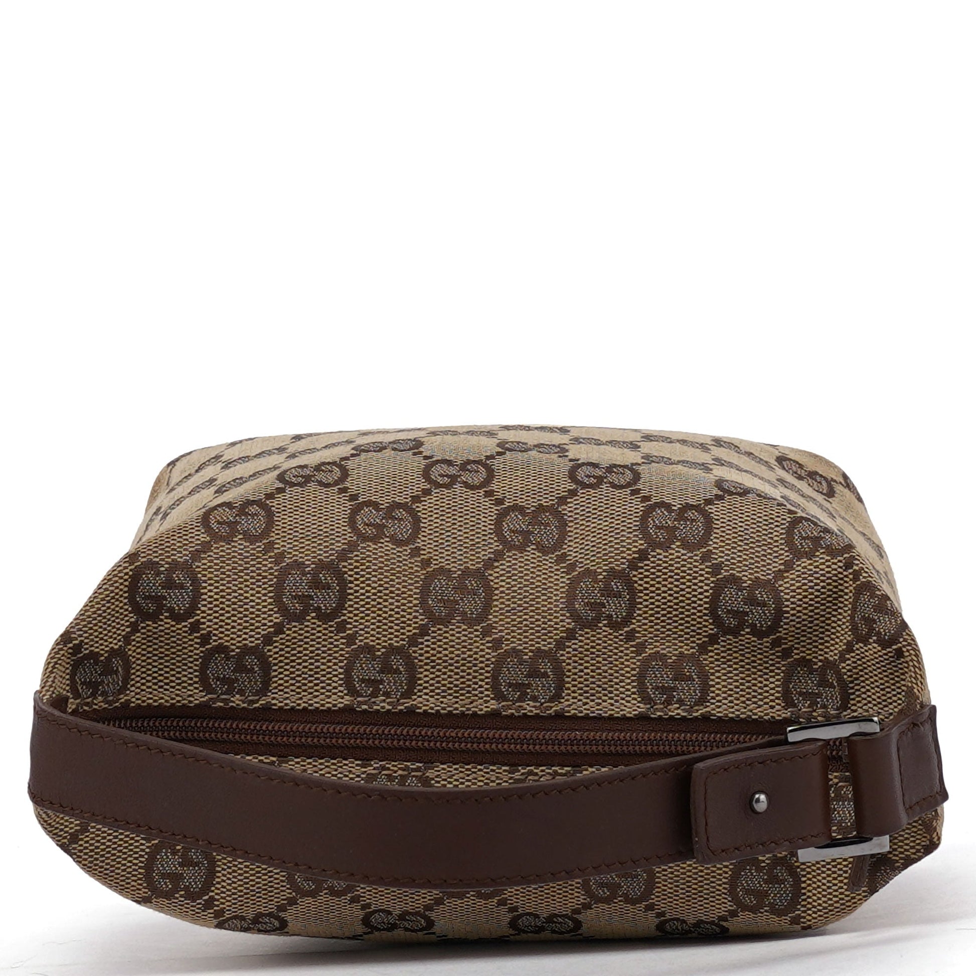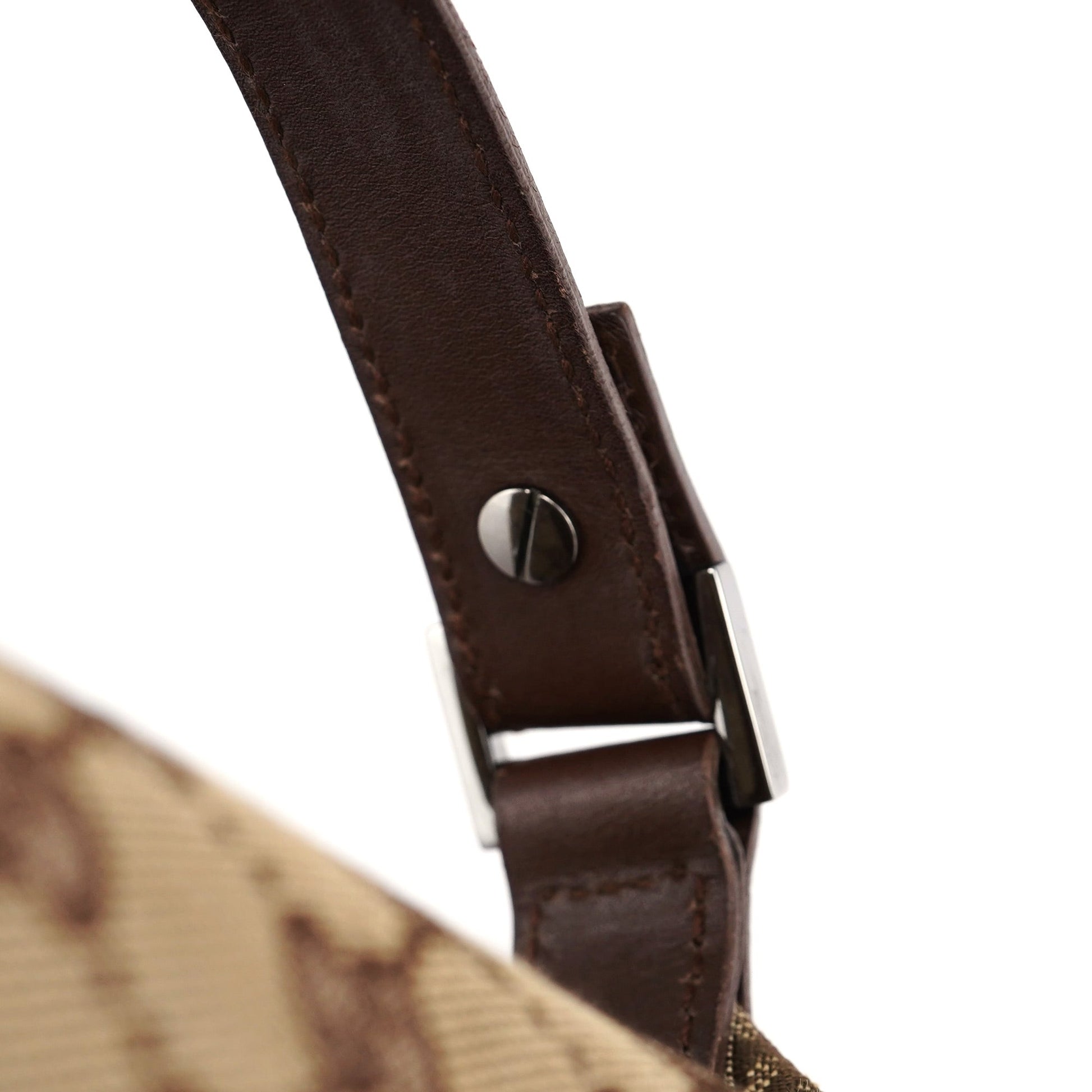 Designed by Tom Ford in the late 1990's, this Gucci GG handbag is crafted from the iconic beige GG monogram canvas with tonal leather trim. Its silver-tone hardware adds a touch of elegance, while the satin-lined interior features a convenient pocket for organization.