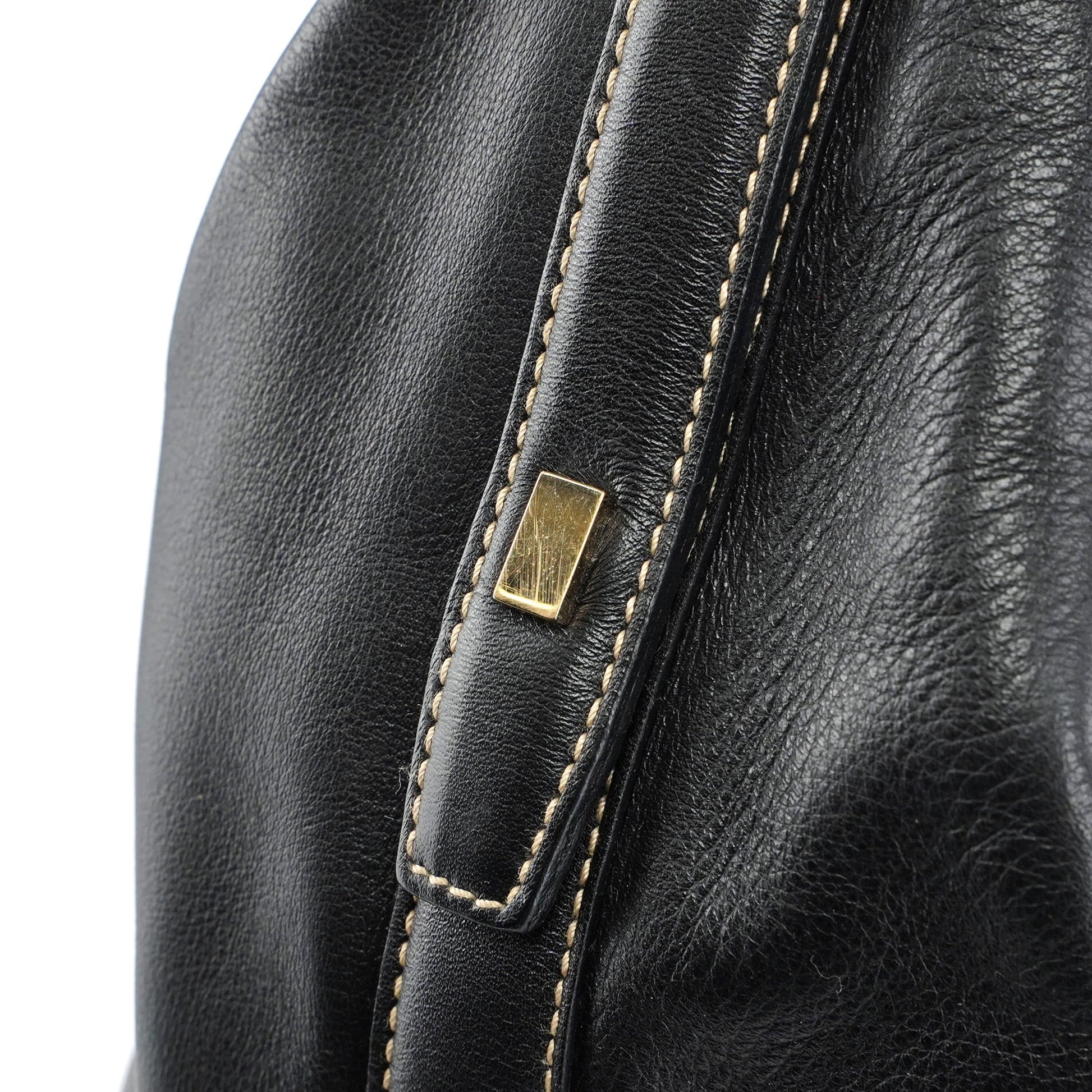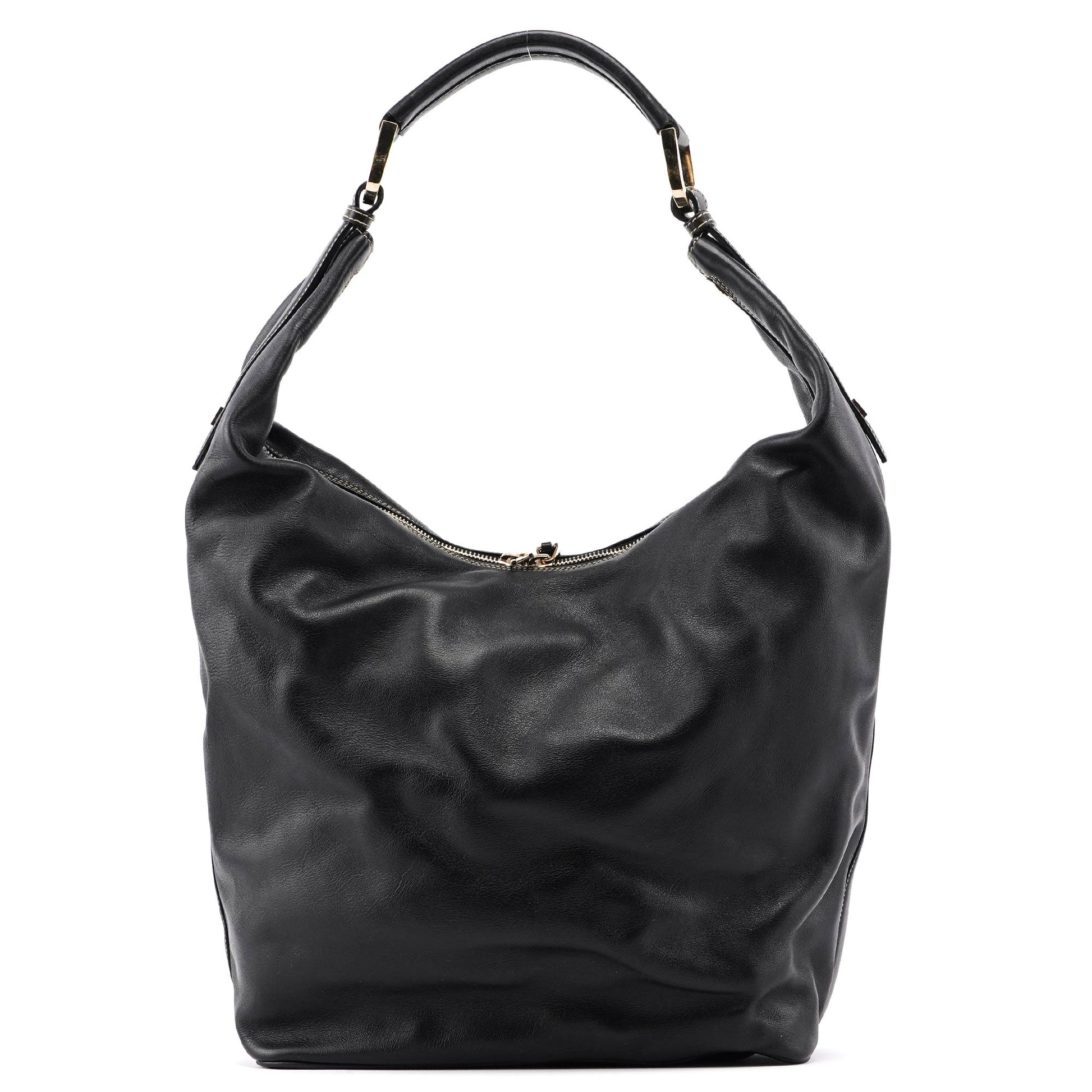 Handcrafted from black calfskin leather, this Gucci Vitello hobo bag by Tom Ford from the late 1990s features gold-tone hardware, contrast stitch details, and a zipper closure. The interior is lined in GG monogram suede with a zipper pocket. The Gucci logo plate is at the front, showcasing timeless elegance.