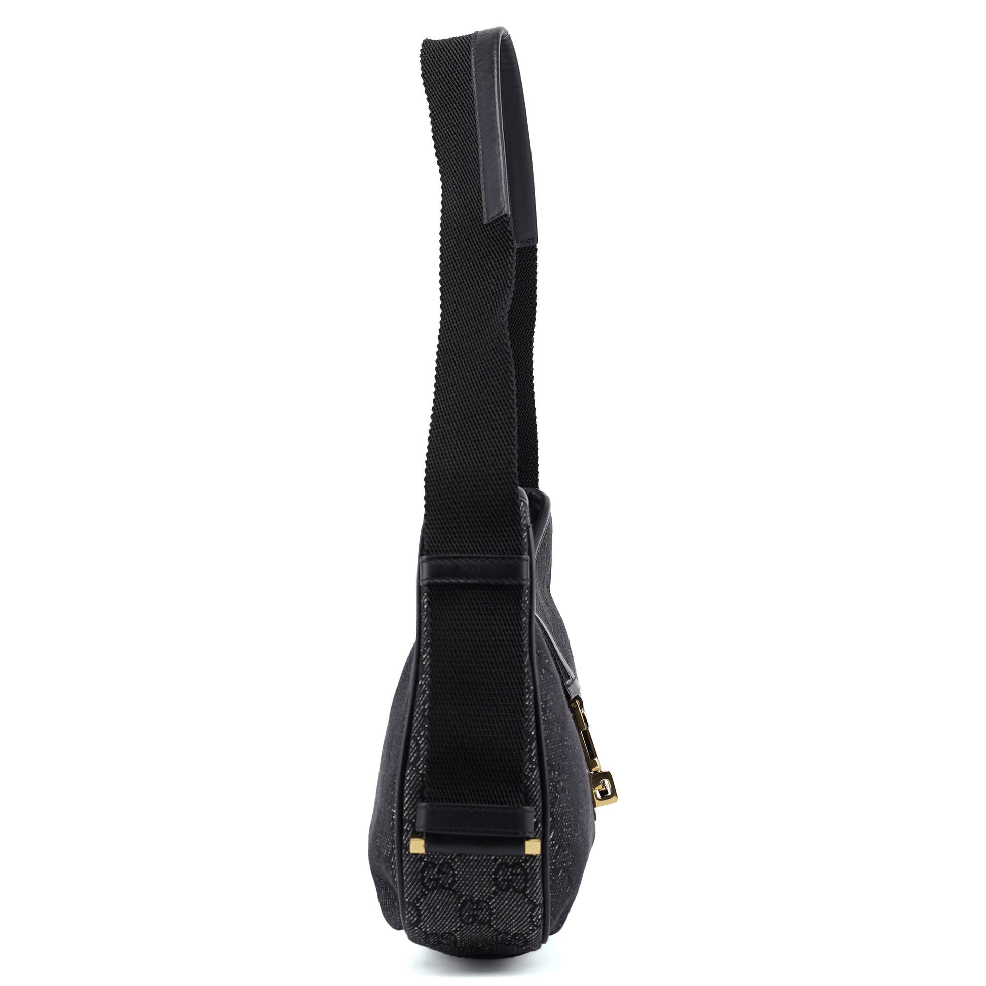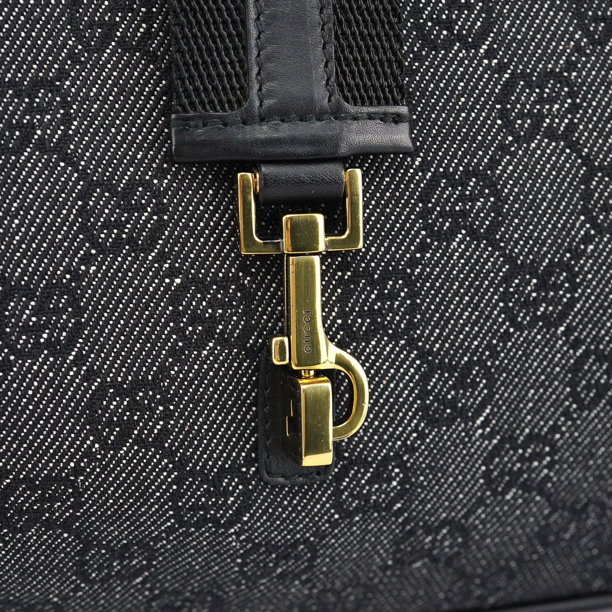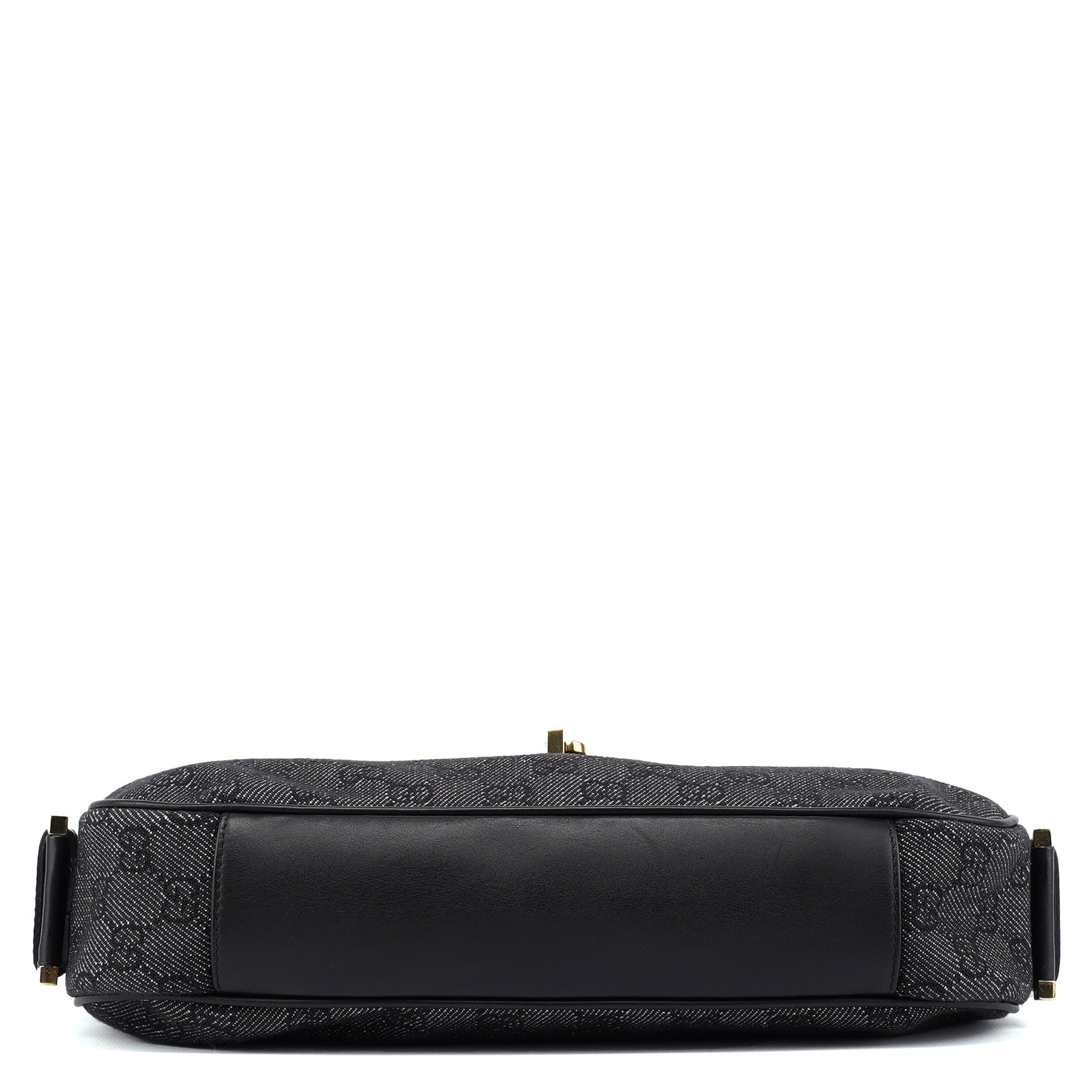 Handcrafted from GG denim monogram canvas with black calfskin leather trim, this Gucci GG Jackie bag, designed by Tom Ford in the late 1990s, features brass hardware engraved with the Gucci logo and the iconic Jackie clasp closure. The satin-lined interior includes an interior zipper pocket, embodying timeless elegance and sophisticated style.