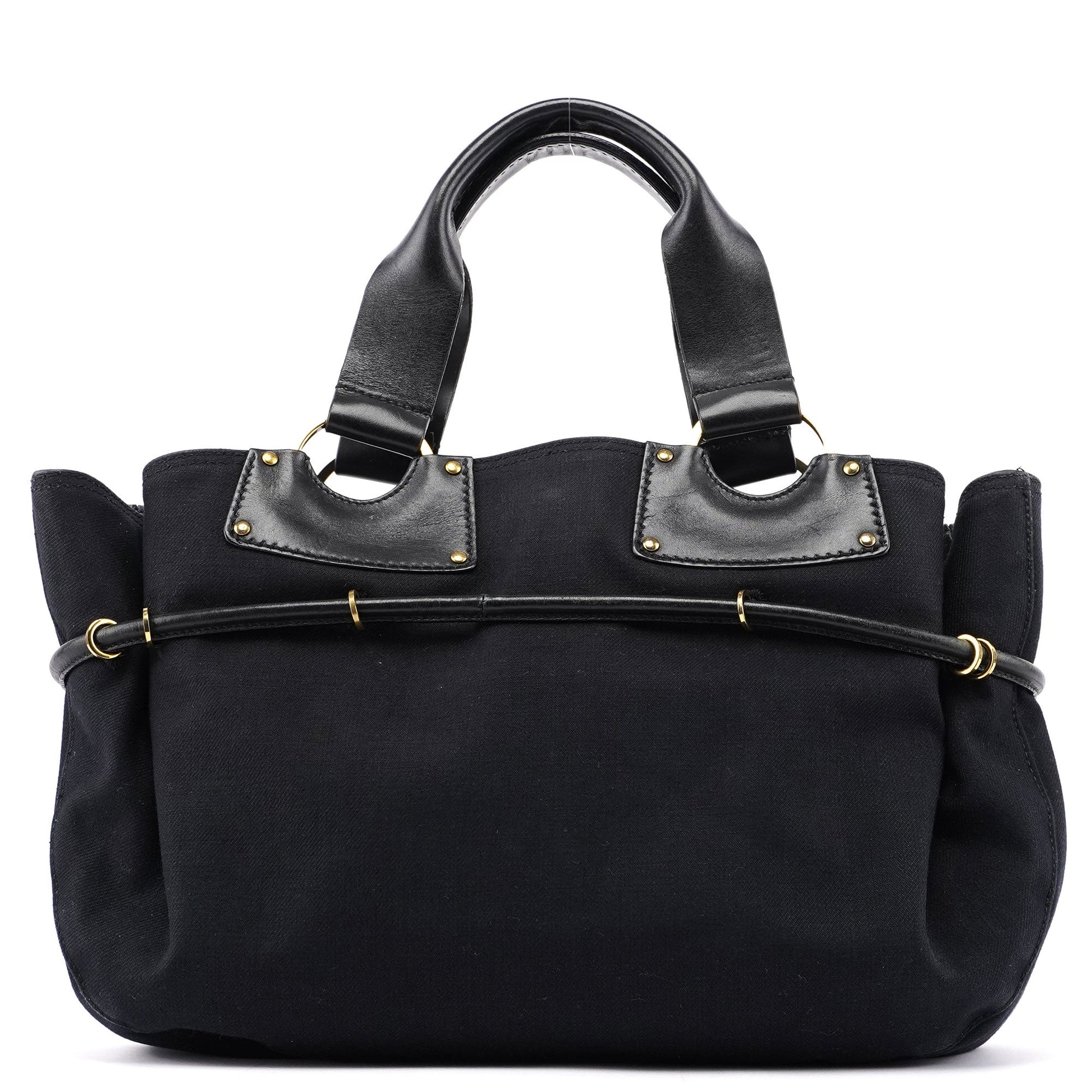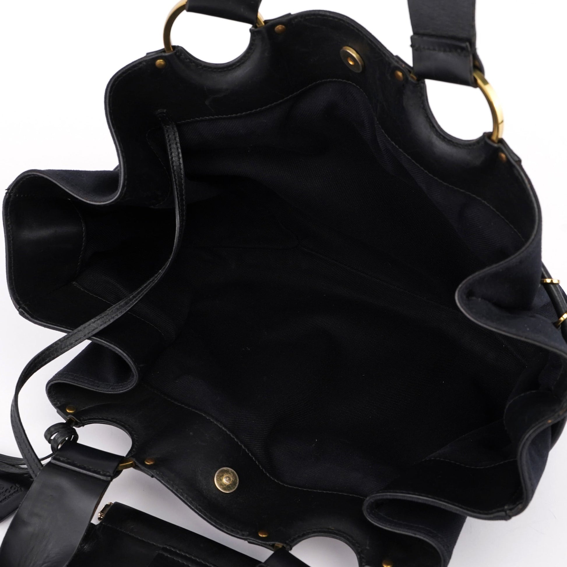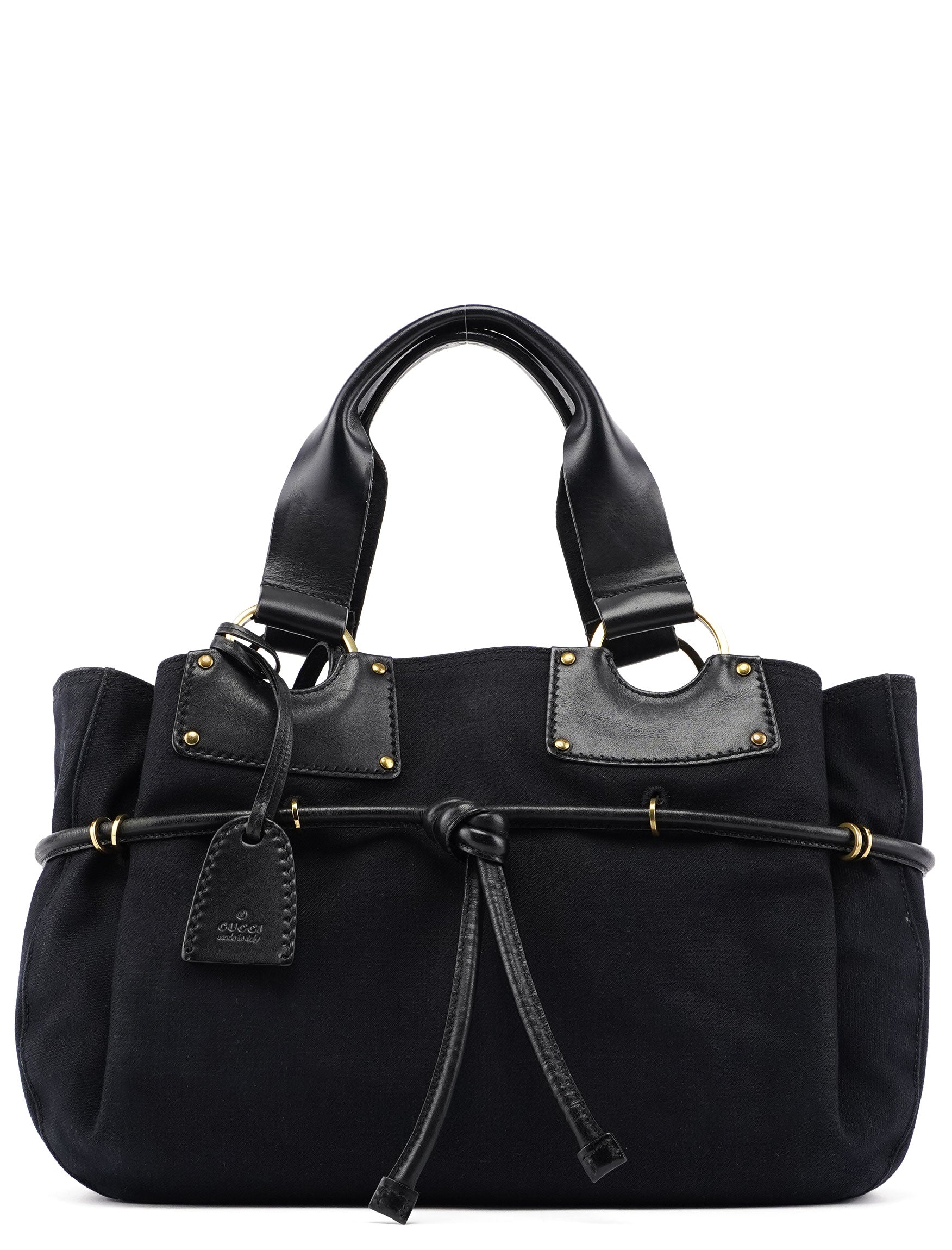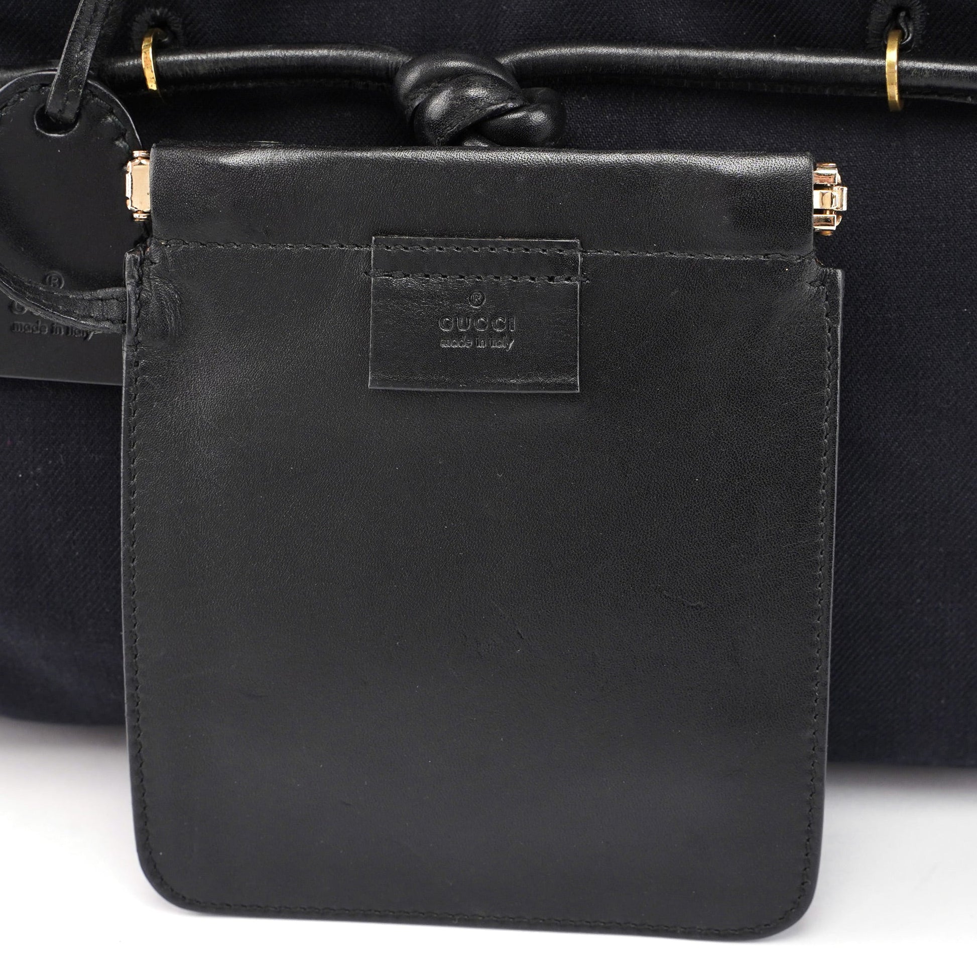 Designed by Tom Ford in the late 1990s, this Gucci tote bag is handcrafted from black canvas with calfskin leather trim. It features gold-tone hardware, an attached leather pouch, and a satin-lined interior. A Gucci leather logo keychain is attached to the bag, showcasing timeless elegance.