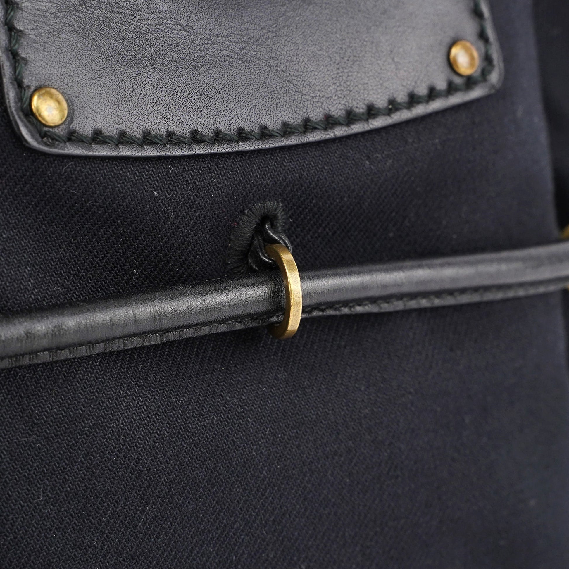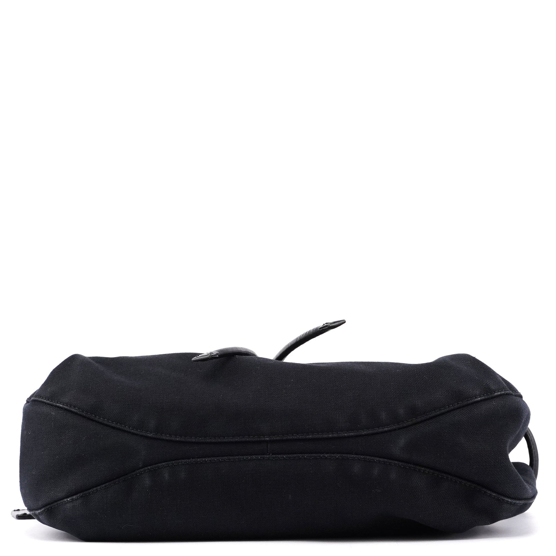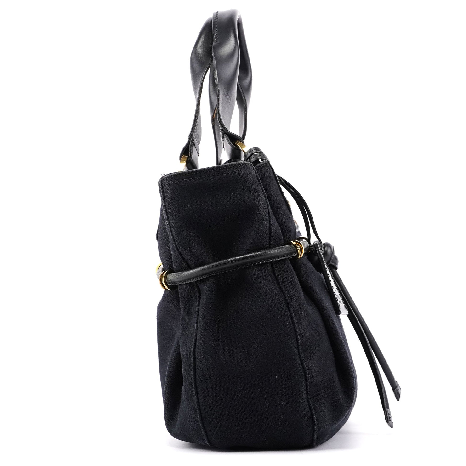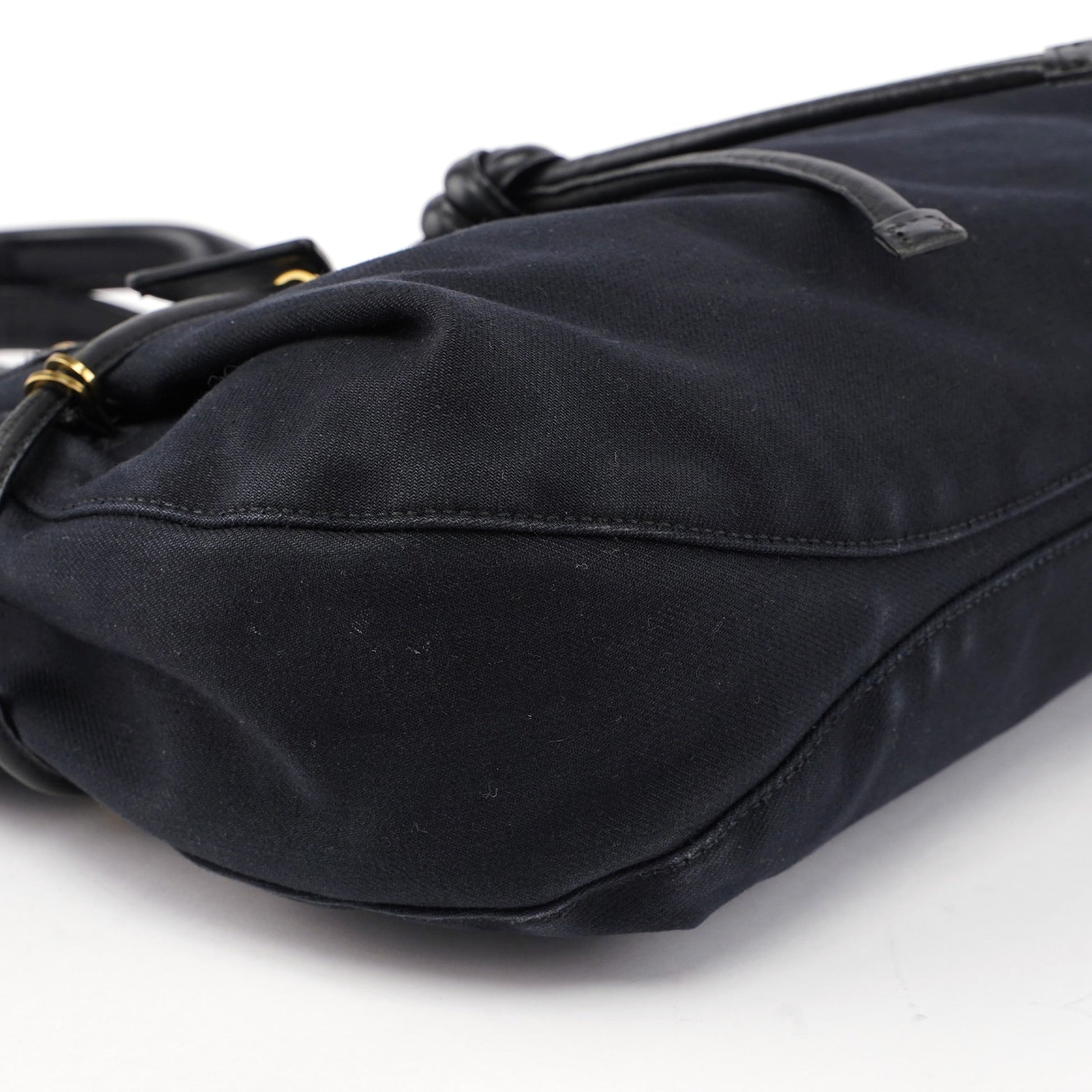 Designed by Tom Ford in the late 1990s, this Gucci tote bag is handcrafted from black canvas with calfskin leather trim. It features gold-tone hardware, an attached leather pouch, and a satin-lined interior. A Gucci leather logo keychain is attached to the bag, showcasing timeless elegance.