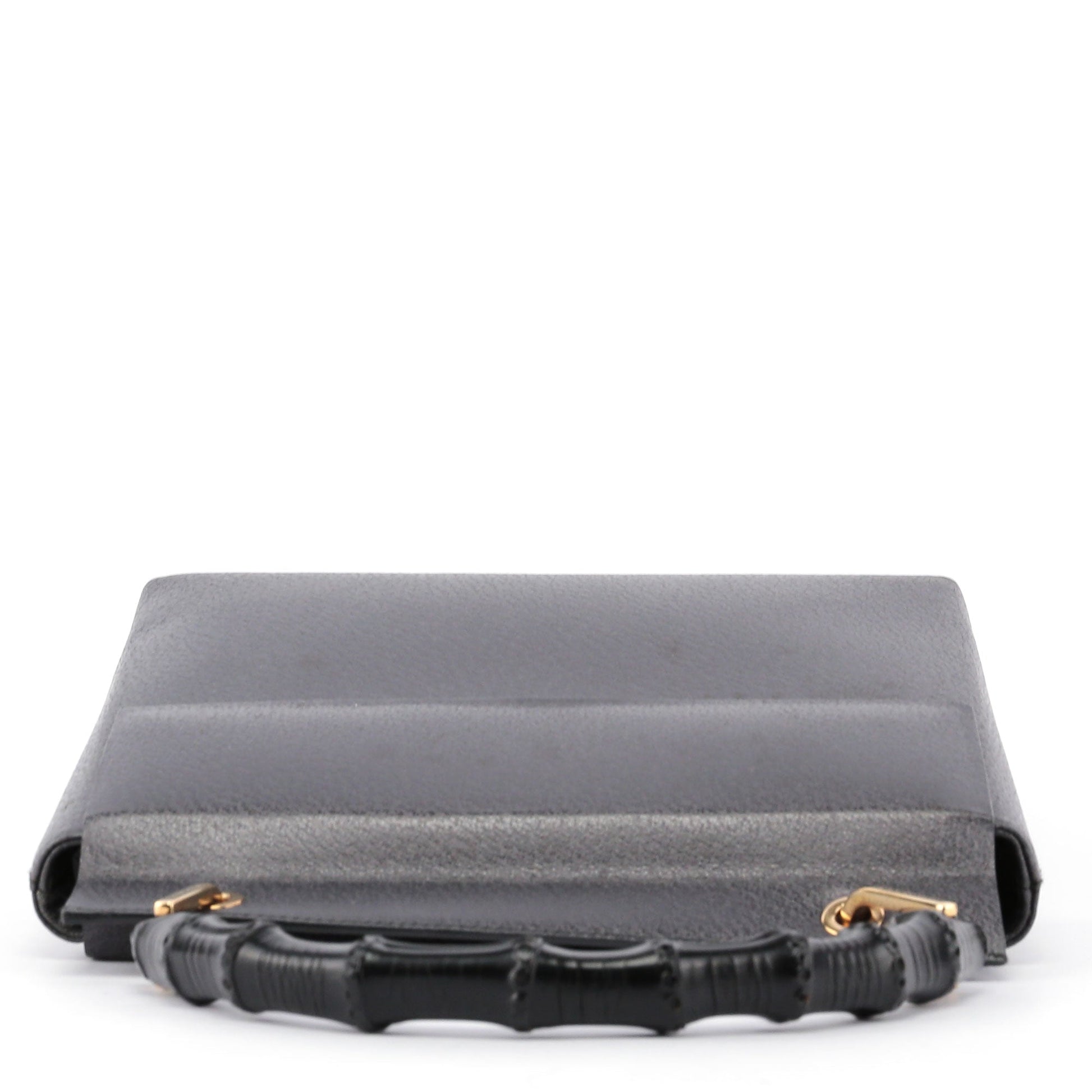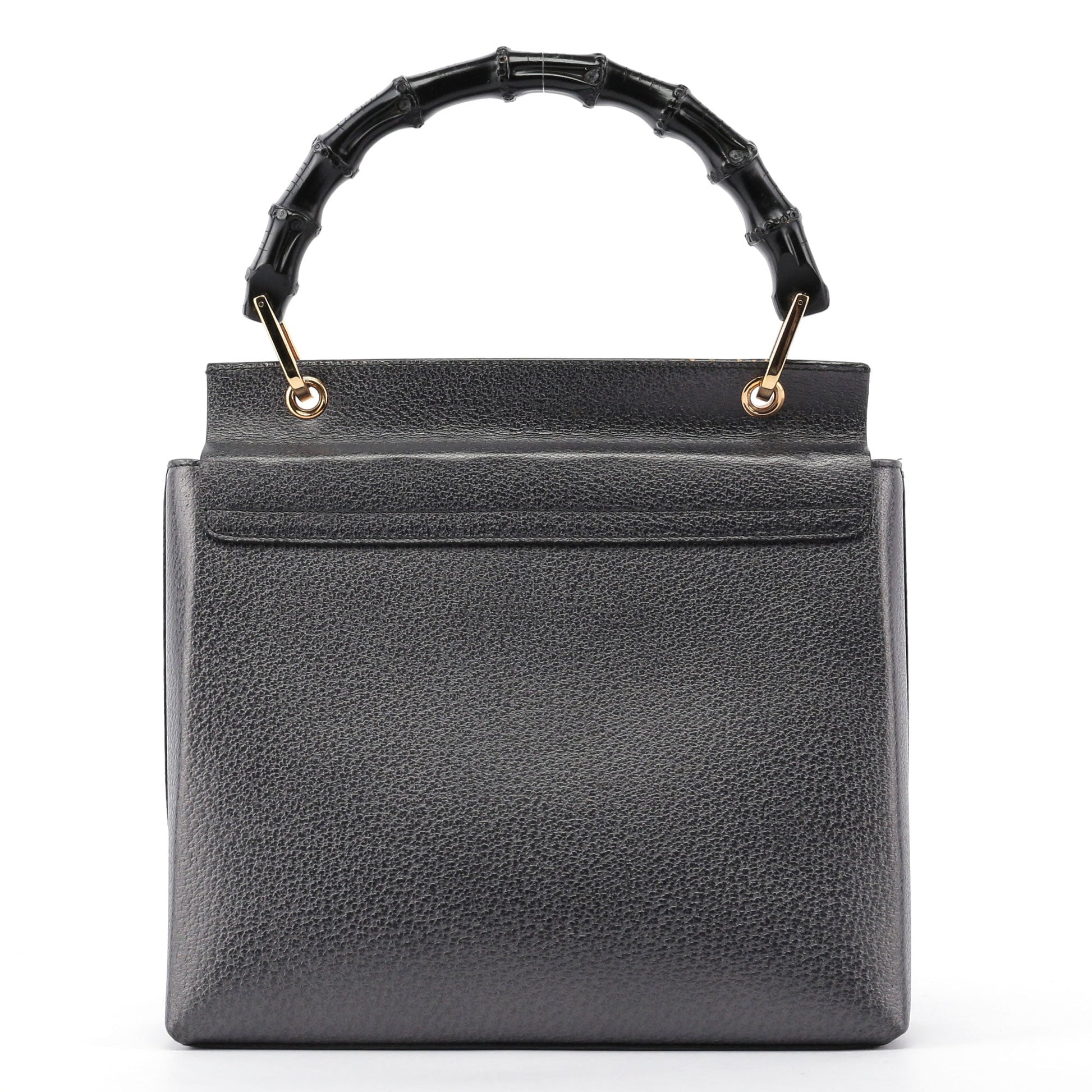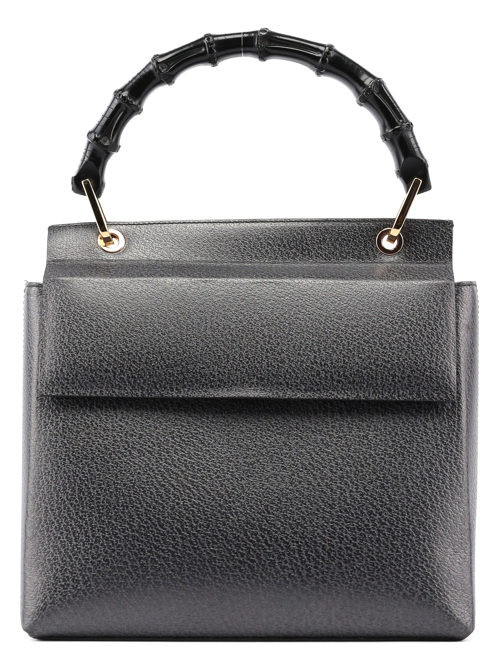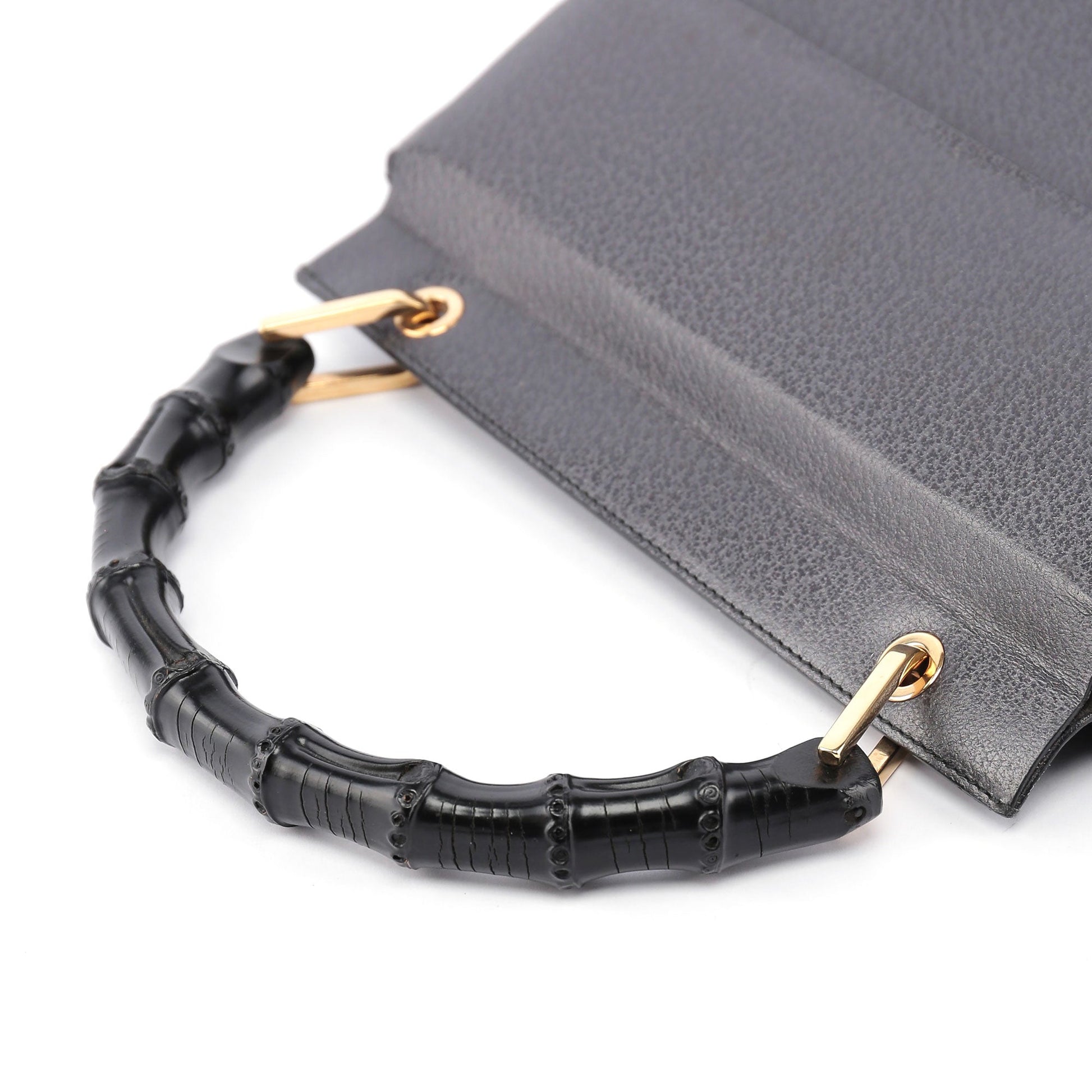 Designed by Tom Ford in the mid-'90s, this Gucci Bamboo top handle bag handcrafted in anthracite leather features gold-tone hardware and a gloss black bamboo handle. A flap with magnetic closure opens to a suede-lined interior with a zipper pocket, blending luxurious materials with iconic design.