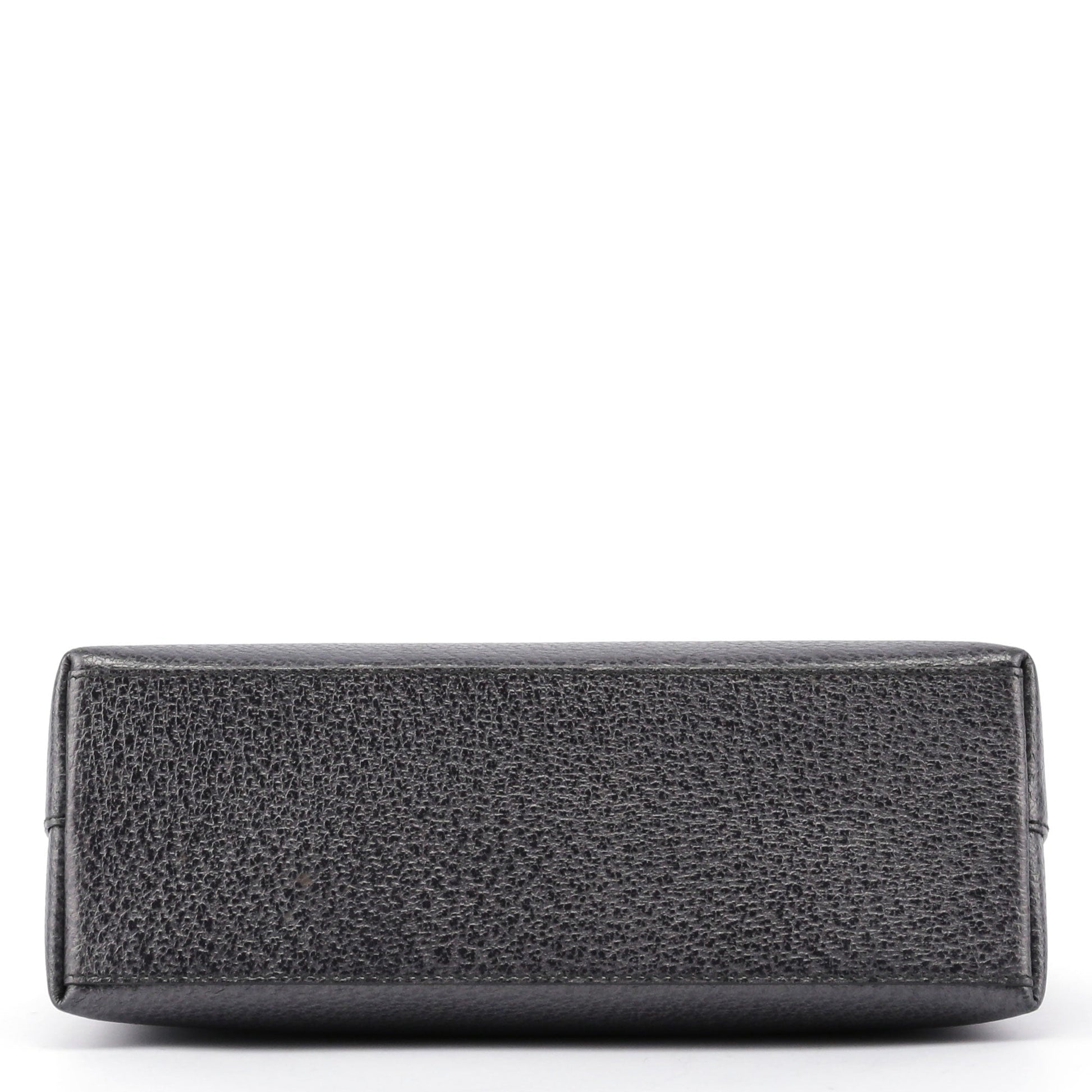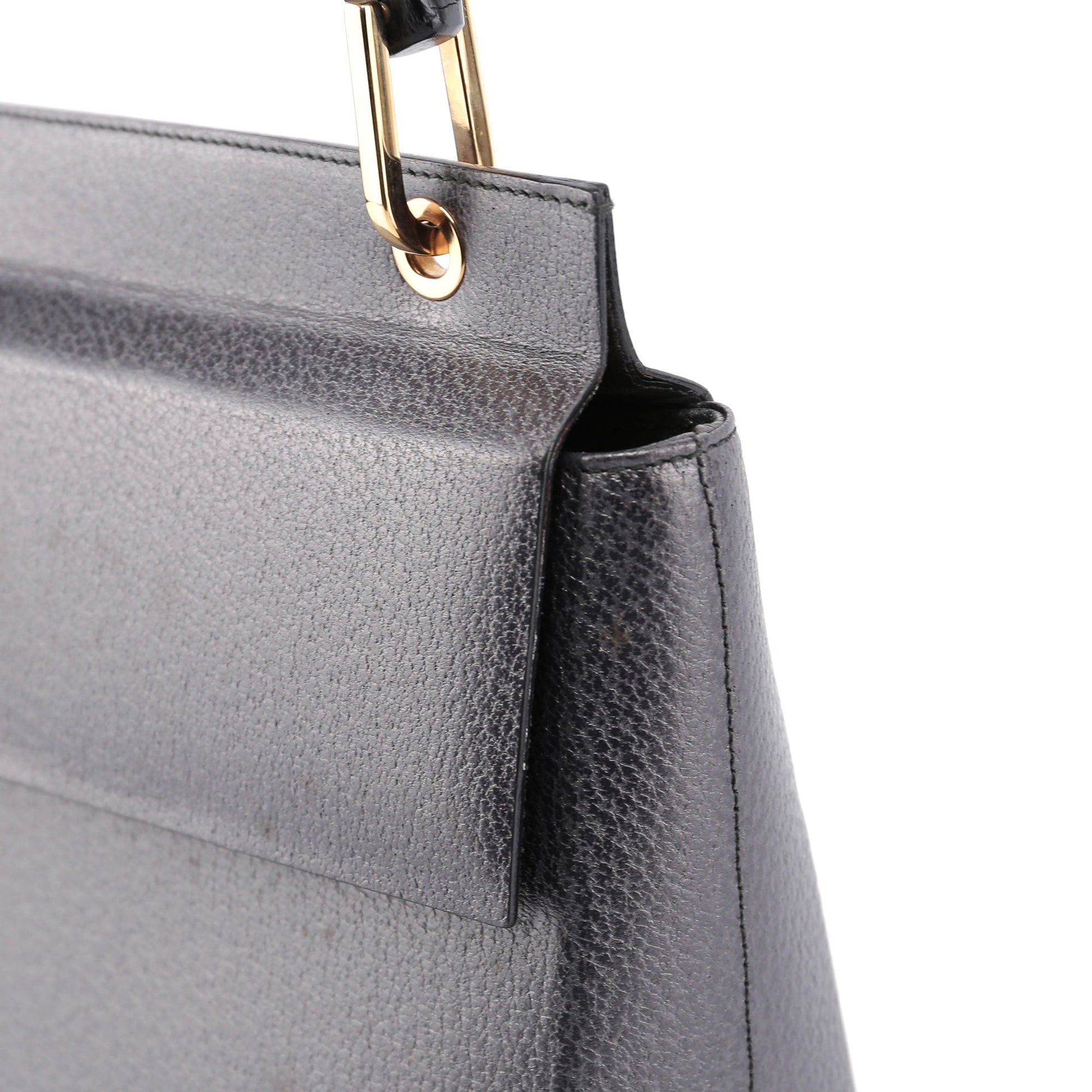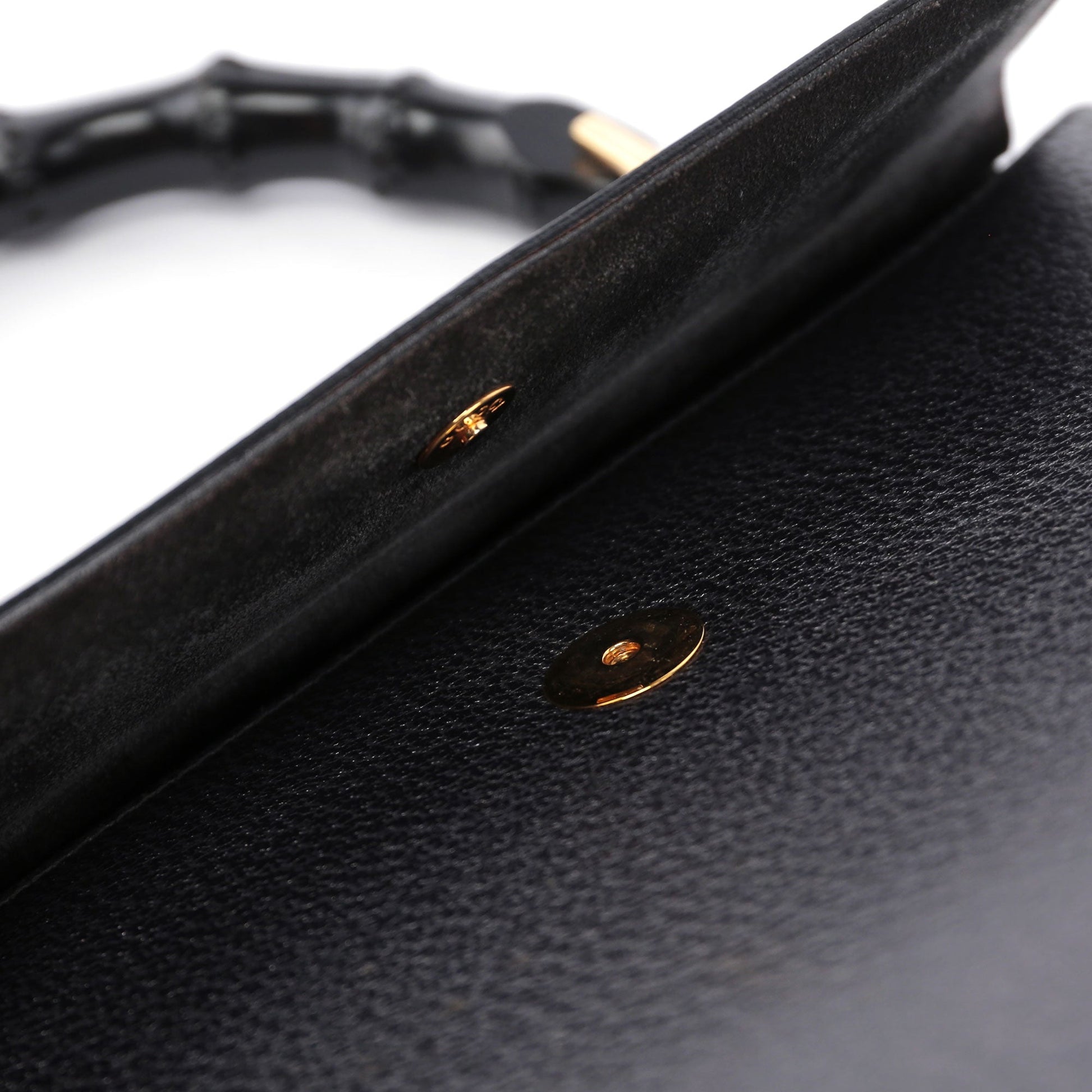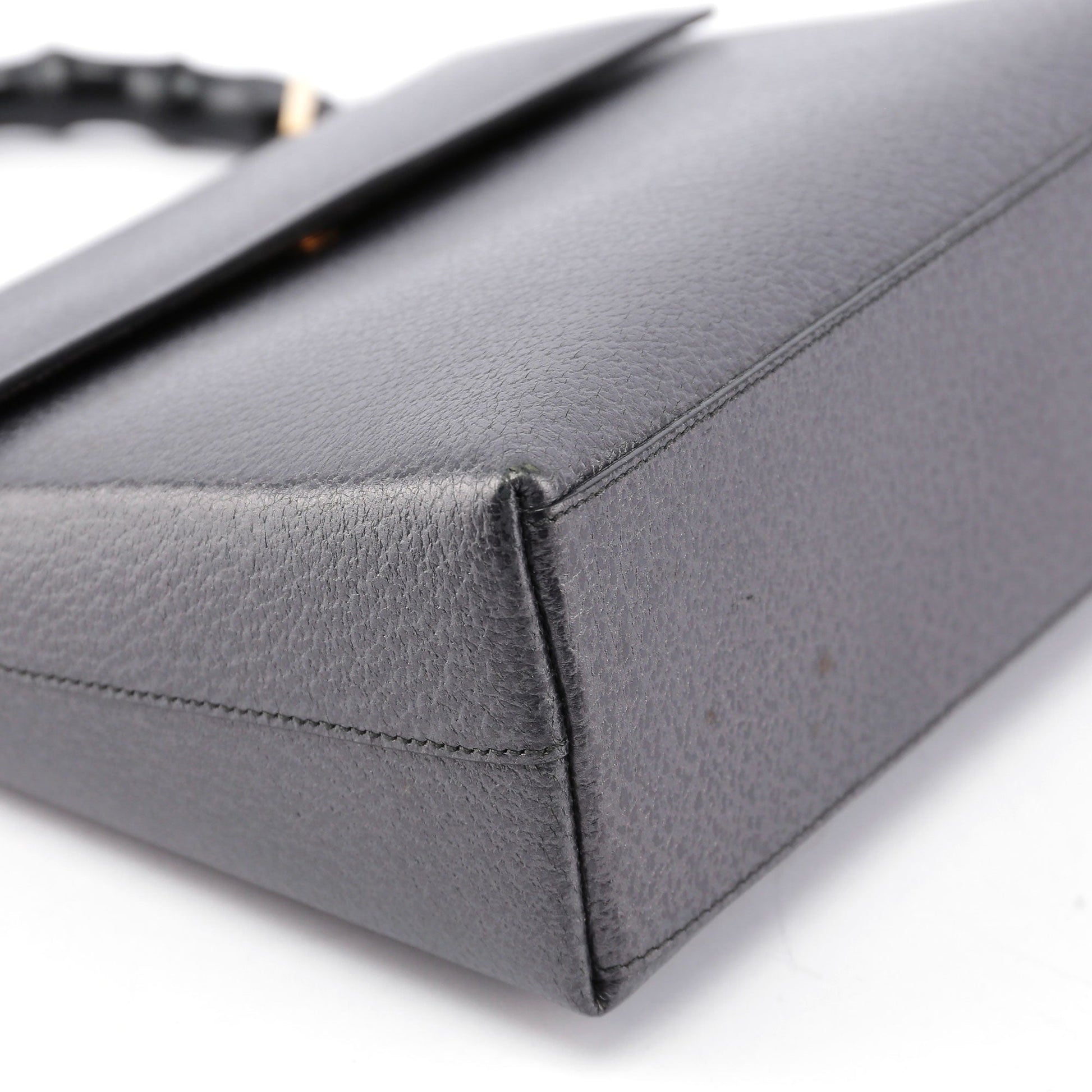 Designed by Tom Ford in the mid-'90s, this Gucci Bamboo top handle bag handcrafted in anthracite leather features gold-tone hardware and a gloss black bamboo handle. A flap with magnetic closure opens to a suede-lined interior with a zipper pocket, blending luxurious materials with iconic design.