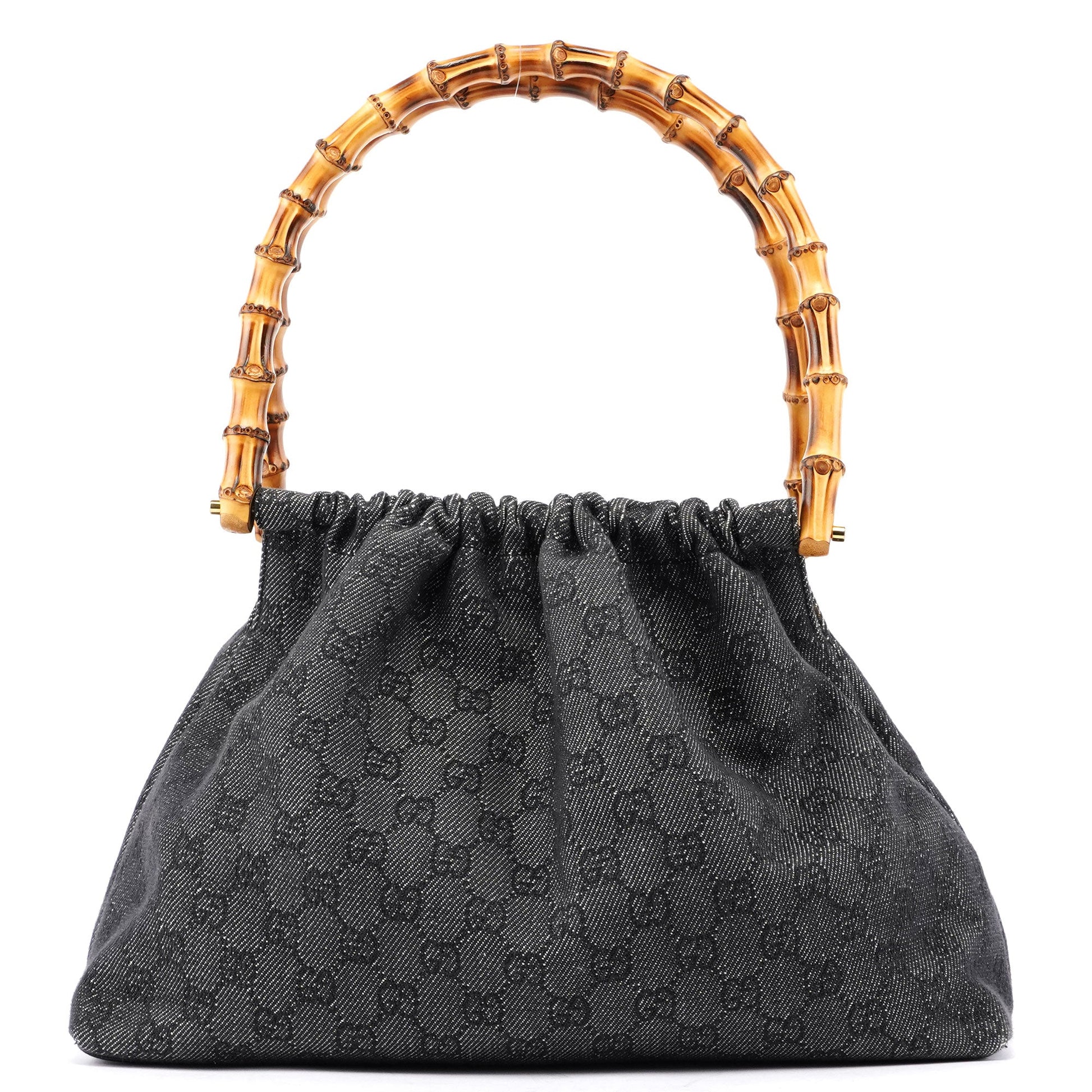 Designed by Tom Ford in the late 1990s, this Gucci Bamboo GG bag features two elegant bamboo handles and gold-tone hardware engraved with Gucci logo. Crafted with the iconic anthracite GG monogram denim, it offers an interior lined with satin, including an interior pocket for organised storage, blending luxurious design with practical functionality.